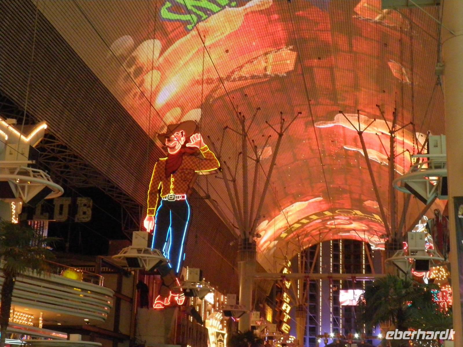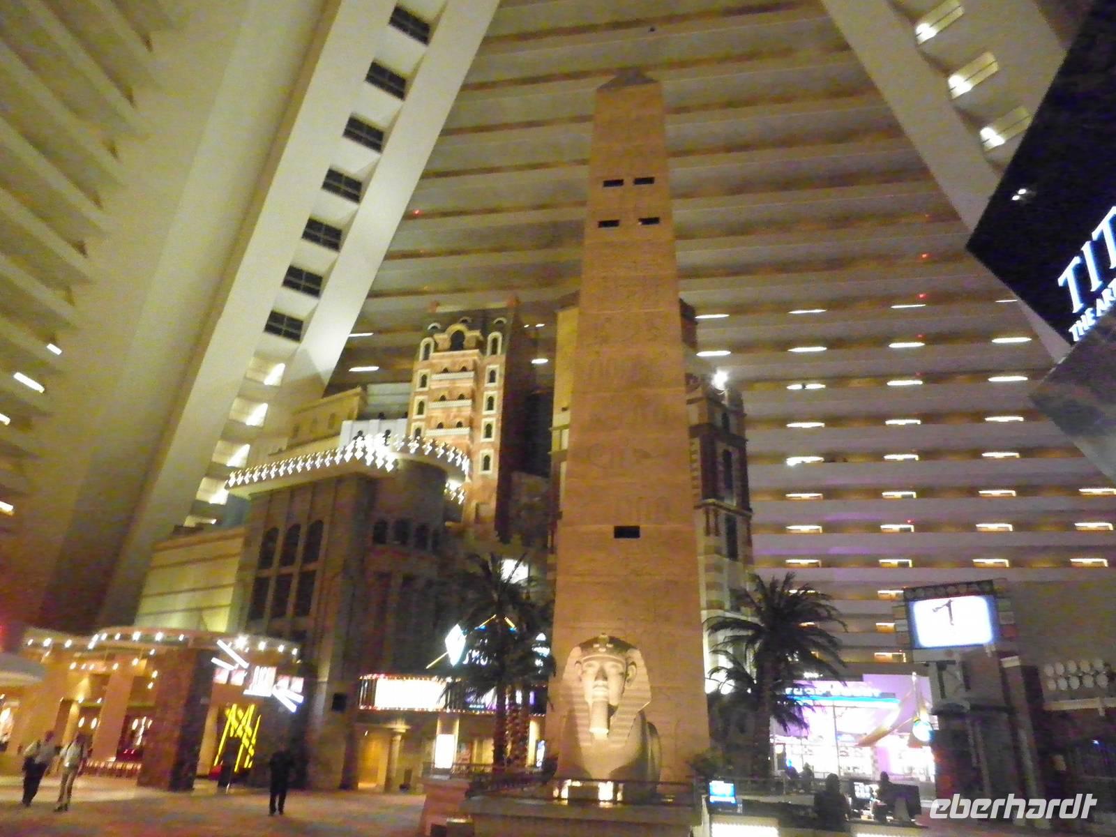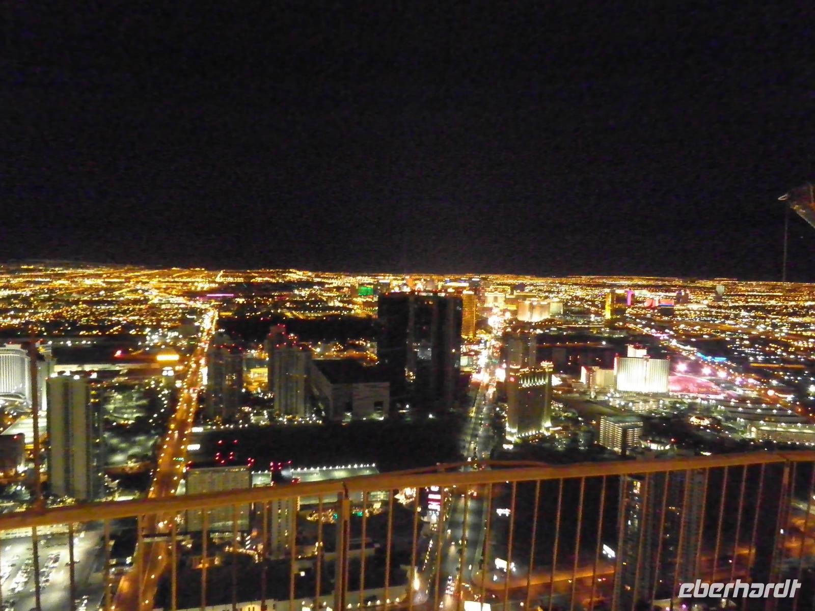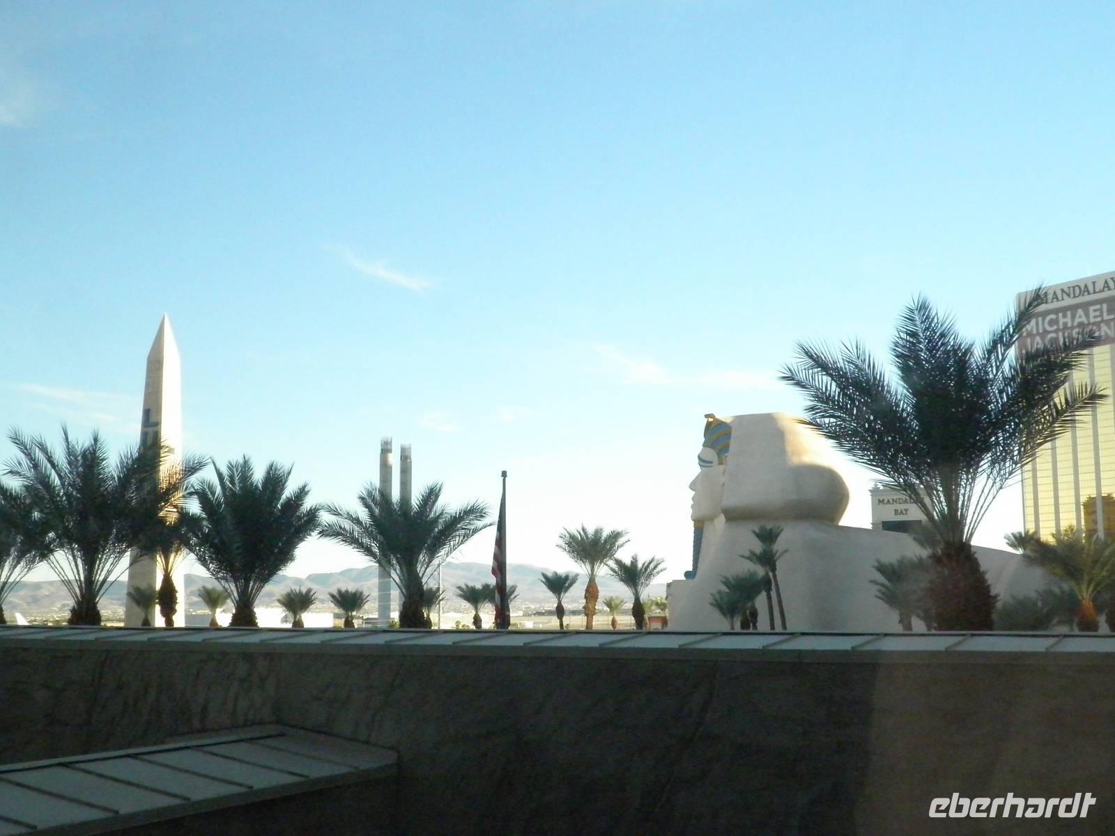 Aber zunächst mussten wir uns zurechtfinden in einem Labyrinth aus Gängen, Rolltreppen, Fahrstühlen und einer Unmengen an Spielautomaten. Aber wir schafften es, unsere Zimmer im East Tower zu finden, so dass wir uns bald wieder trafen, um im Buffetrestaurant ein reichhaltiges und leckeres Abendessen zu genießen. Gestärkt für den Abend trafen wir uns schließlich wieder mit unserer Reiseleiterin Janny, die uns Nevada nach Einbruch der Dunkelheit zeigen wollte. Zunächst erklärte sie uns an einem der zahlreichen Spielautomaten, wie so etwas funktioniert im Allgemeinen. Doch wir lernten auch, dass es viele unterschiedliche Automaten mit anderen Spielregeln gab. Einige Gäste probierten während unseres Aufenthalts im Spielerparadies auch mal ihr Glück, aber keiner hat den Jackpot geknackt. Während unserer Abendführung zeigte uns Janny das bunte Leben auf dem Las Vegas Boulevard, die Wasserspiele vorm Bellagio, den nachgebauten Eiffelturm und einen künstlichen Vulkanausbruch. Dieses Schauspiel bewunderten wir vom Venedig in Las Vegas aus. Dort singen Gondoliere italienische Weisen und staken mit Gästen an Bord ihre Gondeln durch eine künstliche Lagune. Den Abschluss unserer Abendführung bildete ein Besuch in Downtown Las Vegas. Wir erlebten die größte Lichtshow der Vereinigten Staaten. Nachdem wir diese vielen Eindrücke in uns aufgenommen hatten, waren die meisten müde und führen mit dem Bus ins Hotel. Einige aber hatten noch nicht genug und frühen mit dem Lift hinauf in den 109. Stock des Stratospehre Tower, der schon von Weitem die Silhouette von Las Vegas beherrscht. In einer Höhe von weit über 300 Metern hatten wir eine grandiosen Blick über die Stadt in der Wüste. Wir konnten zwar unser Hotel Luxor nicht sehen, aber den mächtigen Lichtstrahl, der von der Spitze der schwarzen Pyramide unseres Hotels über viele Kilometer in den nächtlichen Himmel strahlt.