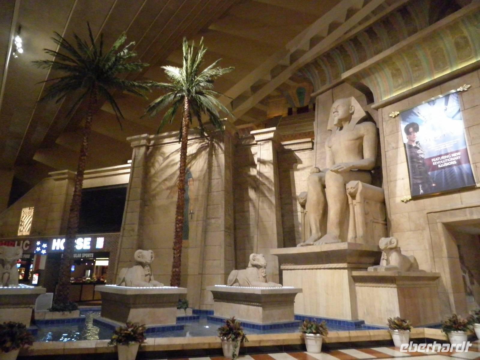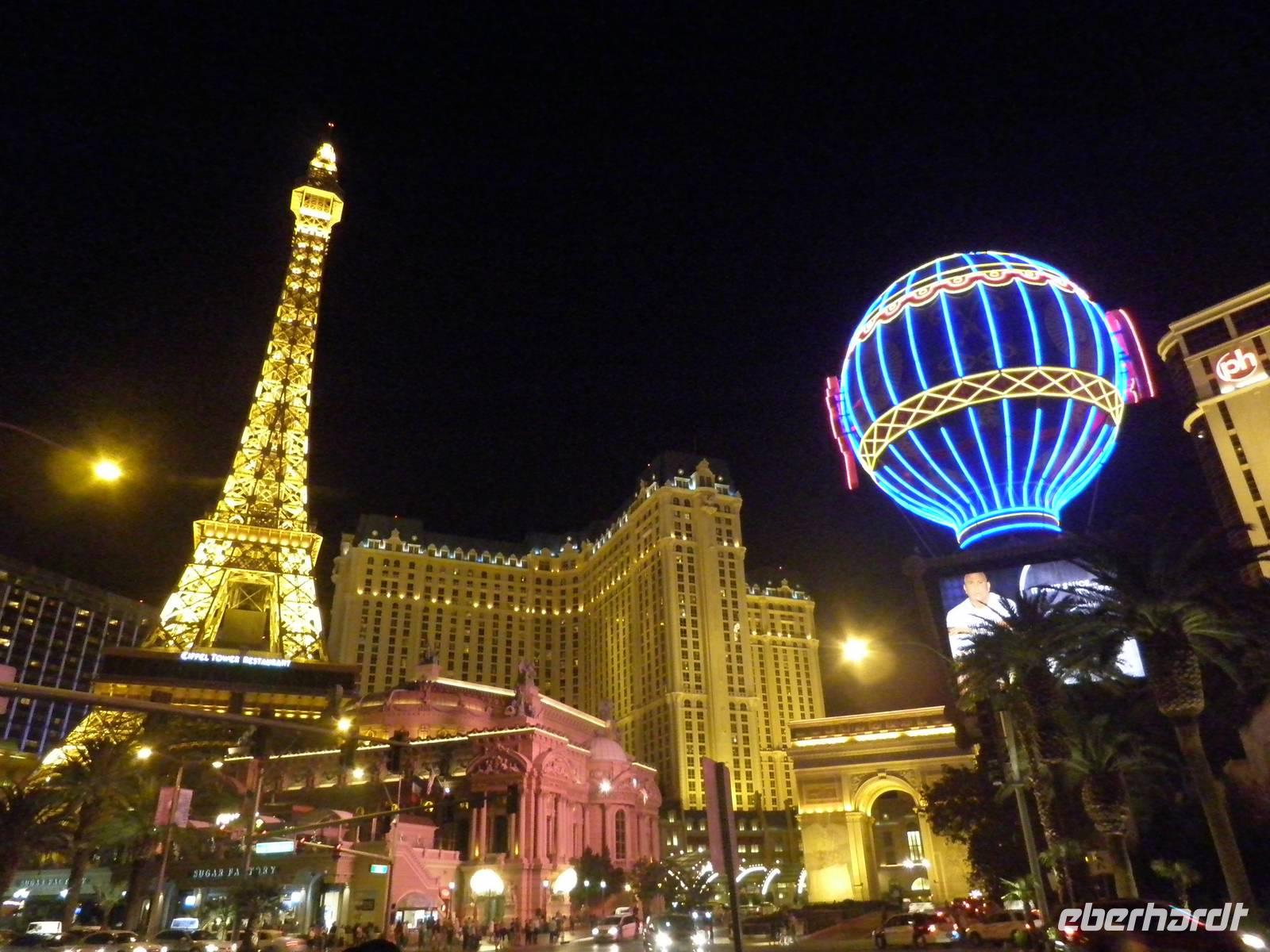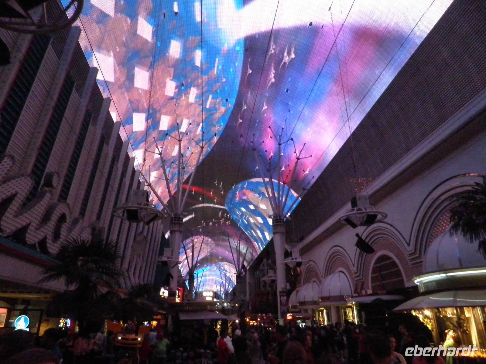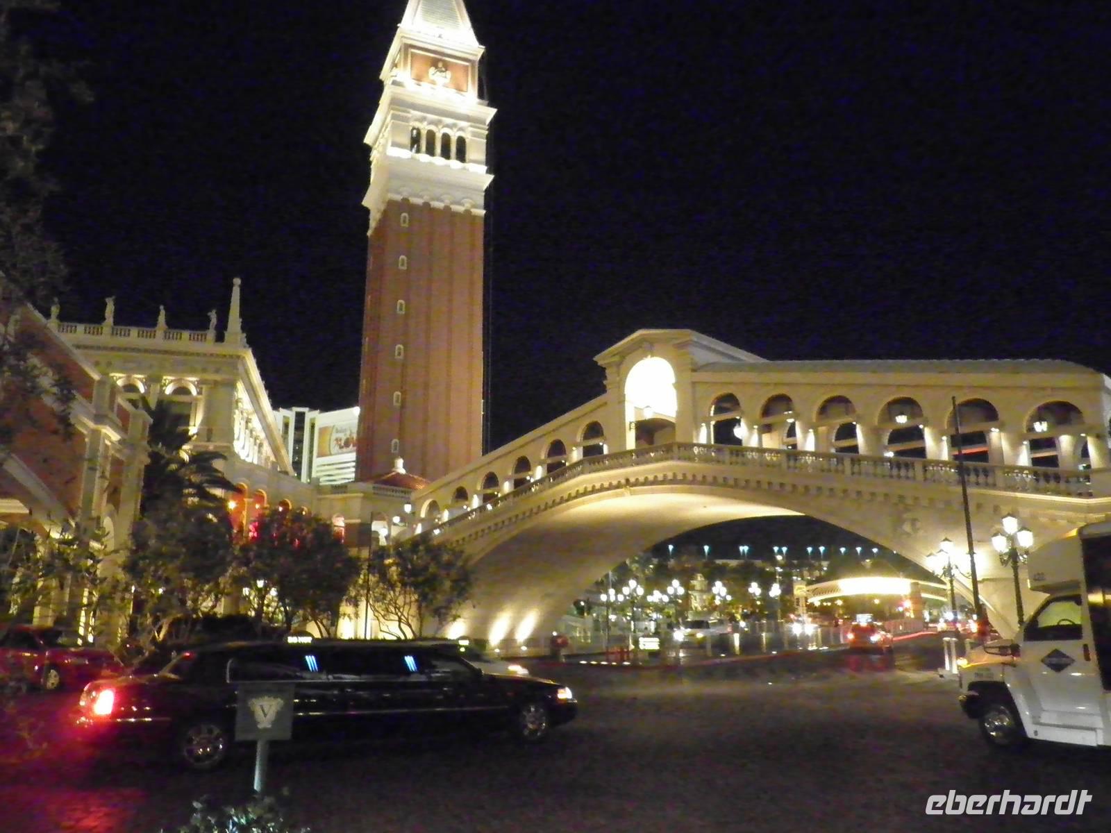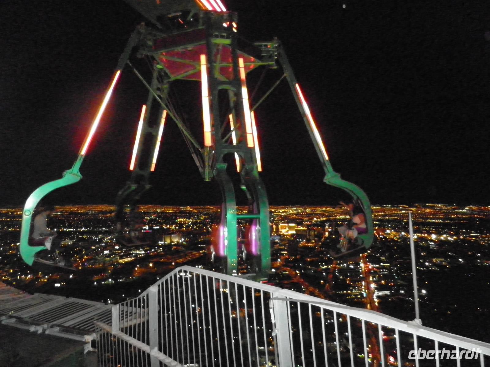 Aber zunächst mussten wir uns zurechtfinden in einem Labyrinth aus Gängen, Rolltreppen, Fahrstühlen und einer Unmengen an Spielautomaten. Aber wir schafften es, unsere Zimmer im East Tower zu finden, so dass wir uns bald wieder trafen, um im Buffetrestaurant ein reichhaltiges und leckeres Abendessen zu genießen. Gestärkt für den Abend trafen wir uns schließlich wieder mit unserer Reiseleiterin Janny, die uns Nevada nach Einbruch der Dunkelheit zeigen wollte. Zunächst erklärte sie uns an einem der zahlreichen Spielautomaten, wie so etwas funktioniert im Allgemeinen. Doch wir lernten auch, dass es viele unterschiedliche Automaten mit anderen Spielregeln gab. Einige Gäste probierten während unseres Aufenthalts im Spielerparadies auch mal ihr Glück, aber keiner hat den Jackpot geknackt. Während unserer Abendführung zeigte uns Janny das bunte Leben auf dem Las Vegas Boulevard, die Wasserspiele vorm Bellagio, den nachgebauten Eiffelturm und einen künstlichen Vulkanausbruch. Dieses Schauspiel bewunderten wir vom Venedig in Las Vegas aus. Dort singen Gondoliere italienische Weisen und staken mit Gästen an Bord ihre Gondeln durch eine künstliche Lagune. Den Abschluss unserer Abendführung bildete ein Besuch in Downtown Las Vegas. Wir erlebten die größte Lichtshow der Vereinigten Staaten. Nachdem wir diese vielen Eindrücke in uns aufgenommen hatten, waren die meisten müde und führen mit dem Bus ins Hotel. Einige aber hatten noch nicht genug und frühen mit dem Lift hinauf in den 109. Stock des Stratospehre Tower, der schon von Weitem die Silhouette von Las Vegas beherrscht. In einer Höhe von weit über 300 Metern hatten wir eine grandiosen Blick über die Stadt in der Wüste. Wir konnten zwar unser Hotel Luxor nicht sehen, aber den mächtigen Lichtstrahl, der von der Spitze der schwarzen Pyramide unseres Hotels über viele Kilometer in den nächtlichen Himmel strahlt.