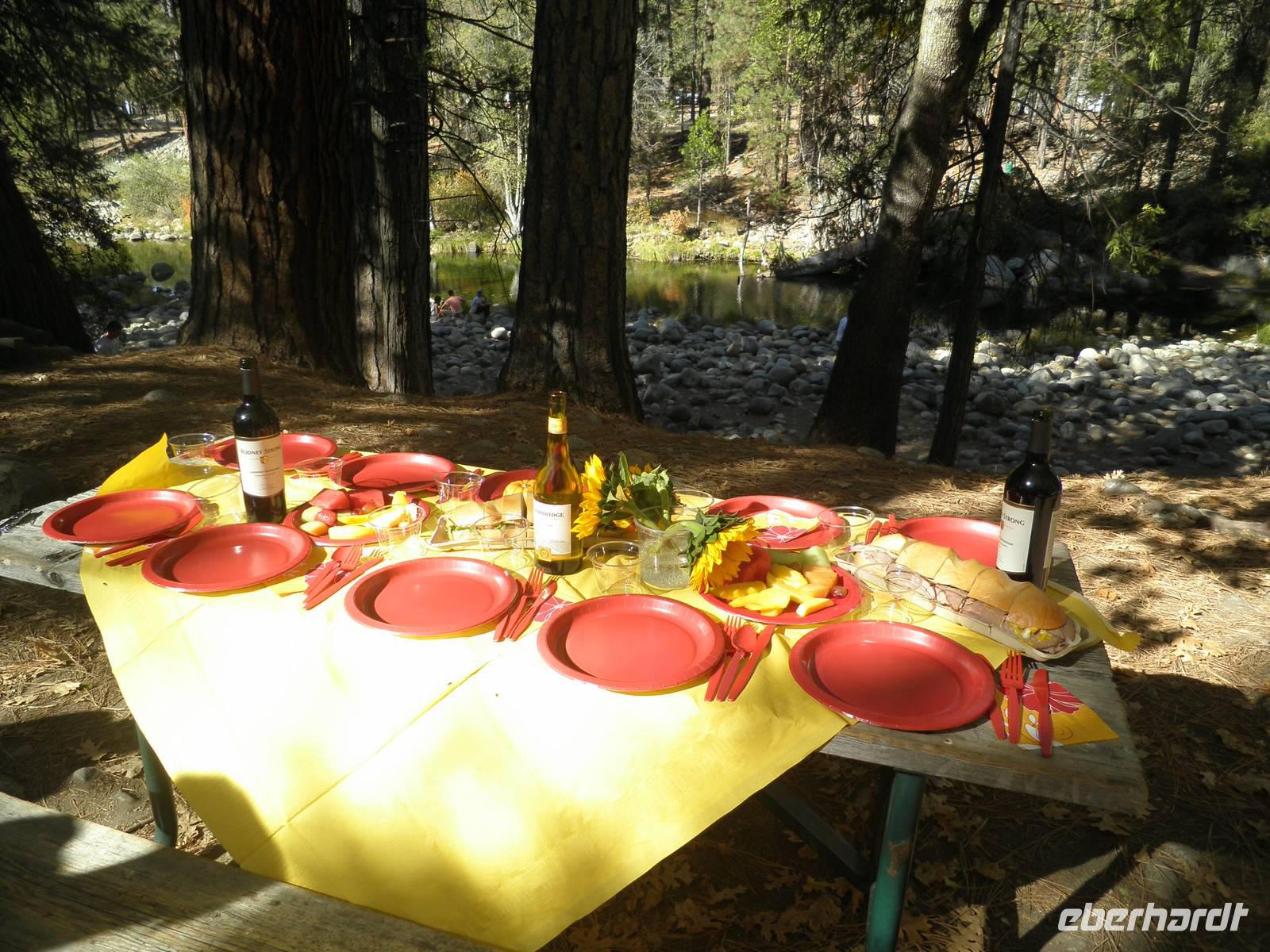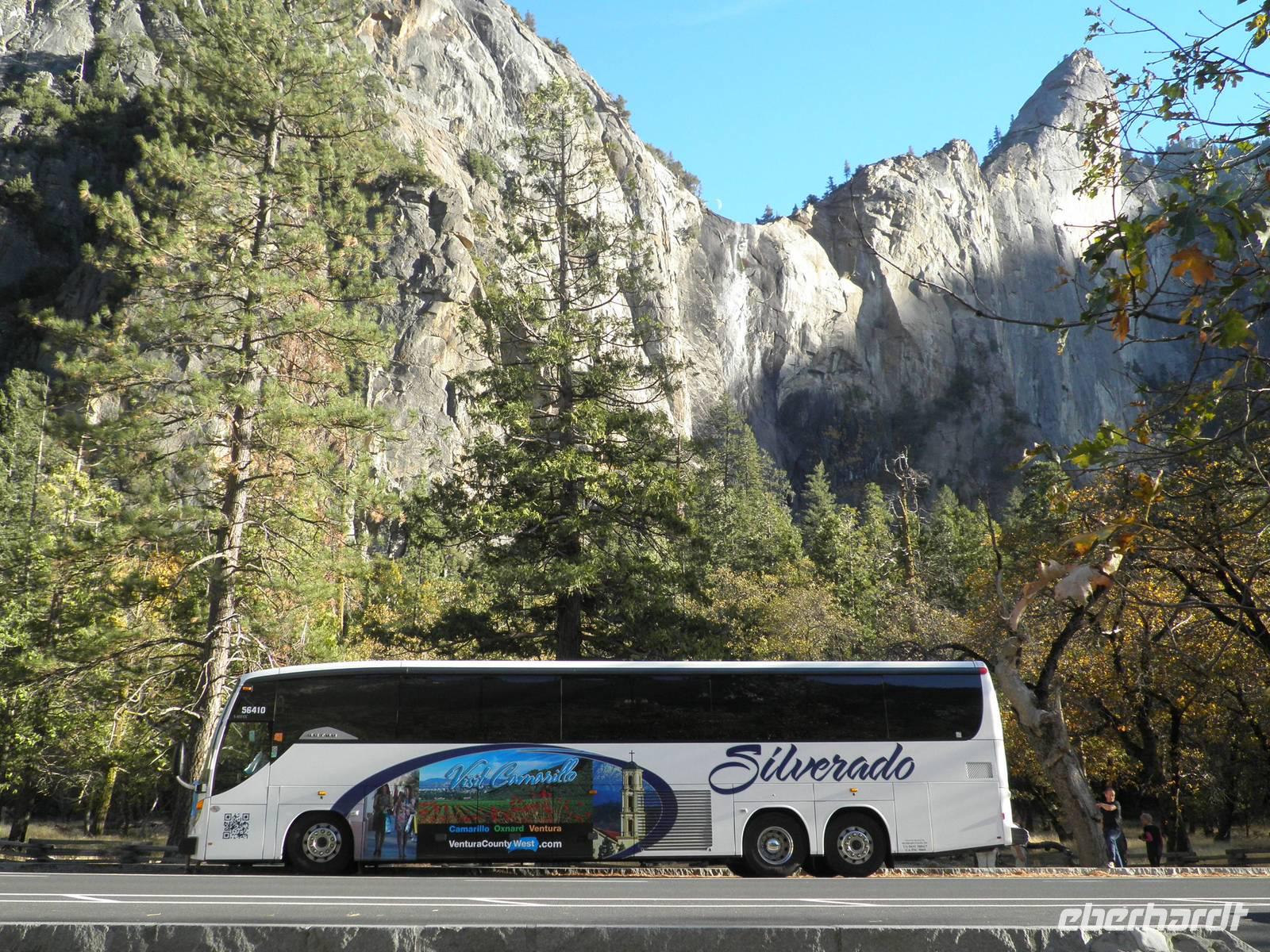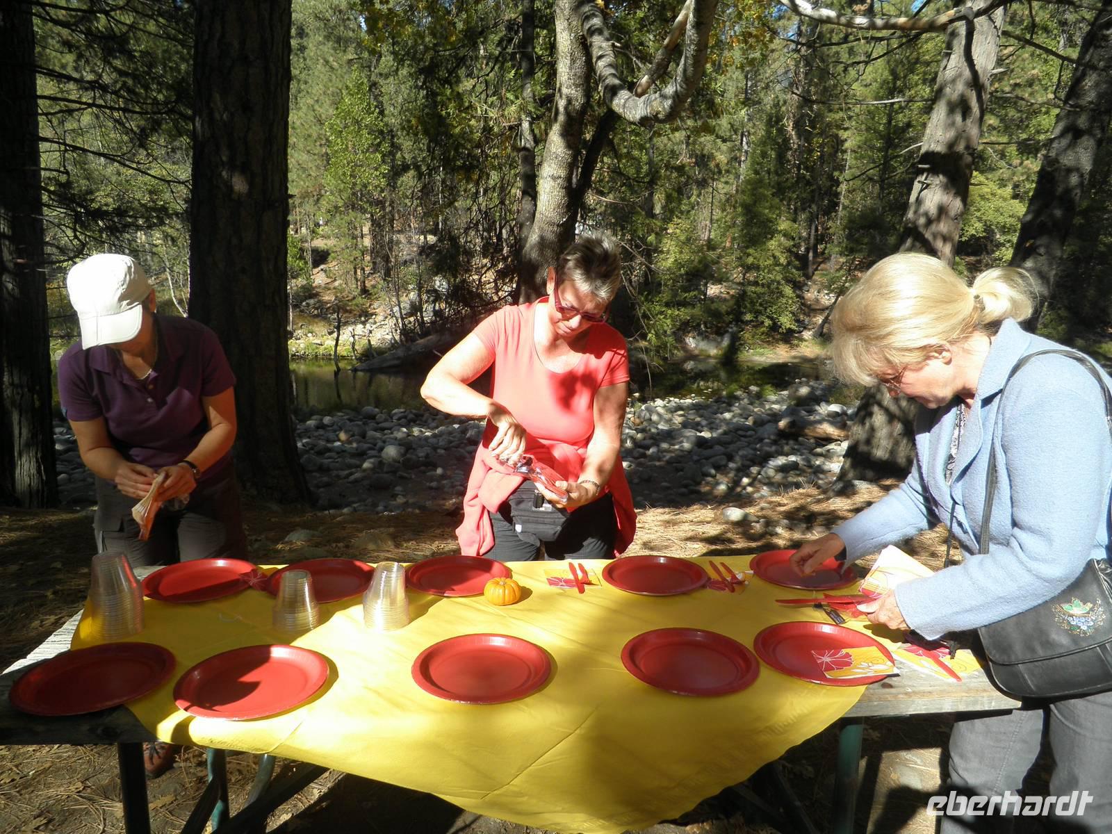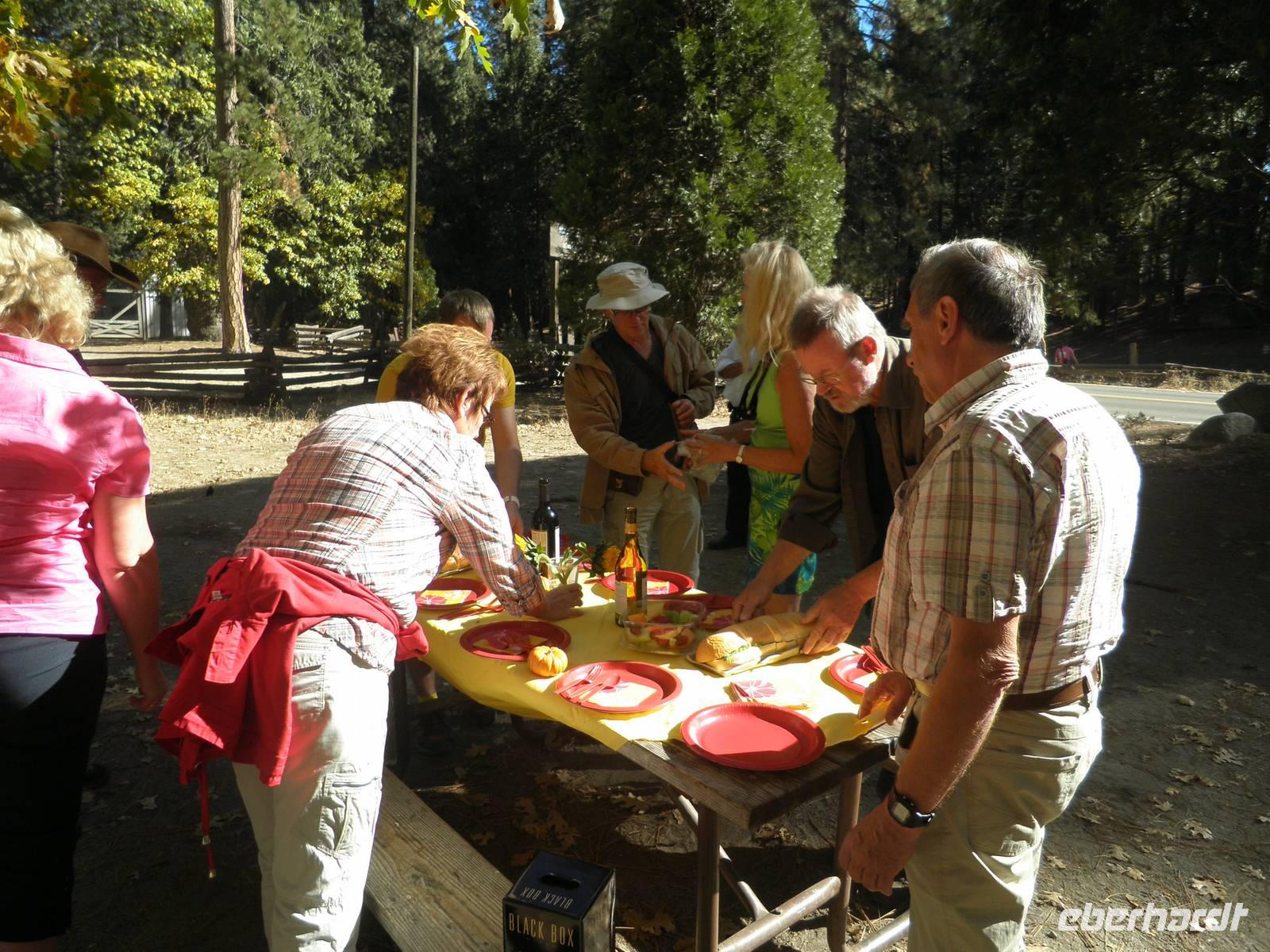 An diesem Tag frühstückten wir einmal nicht im Hotel, sondern fuhren mit unserem Bus in Danny's Diner, wo wir uns Kaffee, Orangensaft, Rühreier und Speck schmecken ließen. Nach dieser Stärkung brachen wir auf in Richtung Yosemite Nationalpark. Hier sind nicht nur die riesigen roten Sequoia-Bäume zu Hause, auch als Mammutbäume bekannt, sondern auch Grizzlybären Leben im Nationalpark. Janny zeigte uns einen Warnzettel, dass man sehr sorgsam mit Lebensmitteln im Park umgehen muss, denn für die vom Menschen mitgebrachten Leckereien interessieren sich auch dir Bären. Um heranzukommen brechen sie sogar in Autos ein oder zerstören Zelte und Wohnwagen. Wir sahen keine der Bären, dafür bestaunten wir die riesigen Mammutbäume im Park. Auf einer Fahrt durch den Yosemite Park hielten wir einige Male an, um die atemberaubende Natur zu bestaunen und zu fotografieren. So sahen wir den Brautschleierwasserfall und den riesigen Felsen El Capitan. Bei den Yosemite Falls machten wir eine etwas längere Pause. Leider gab es gerade nicht genug Wasser, so dass der eigentliche Wasserfall gar nicht da war. Aber anhand der dunkleren Verfärbung des Gesteins konnten wir uns den Wasserfall mit Wasser ganz gut vorstellen. Trotz des wasserlosen Wasserfalls gab es noch andere Dinge zu besichtigen. Einige Gäste genossen dir Ruhe und den grandiosen Anblick des Flusses, andere spazierten zum Half Dome, einem markanten Felsen in der Nähe, und sahen zwei Malerinnen dabei zu, wie sie die Schönheit dieser Landschaft auf ihren Staffeleien einfangen wollten.