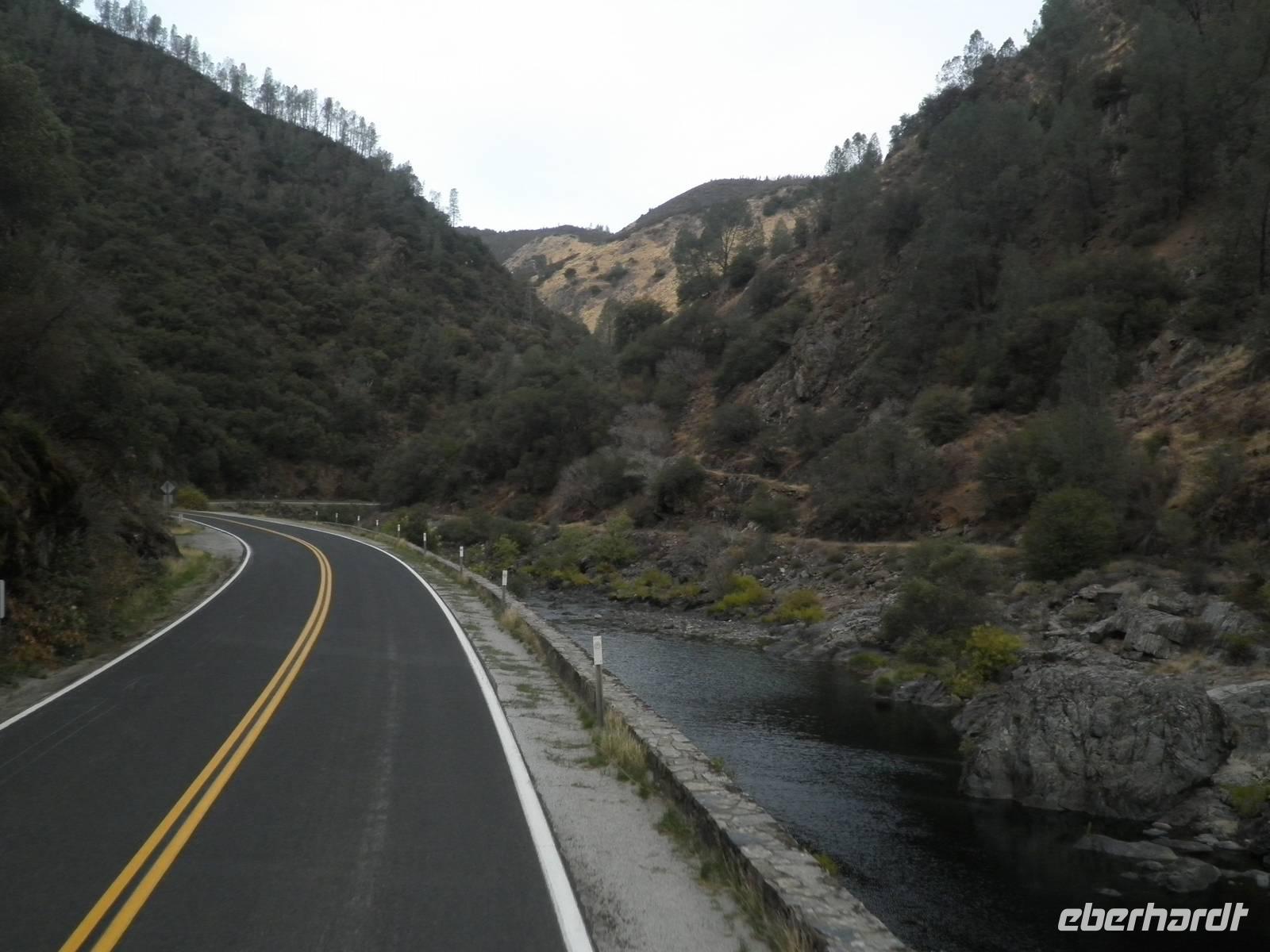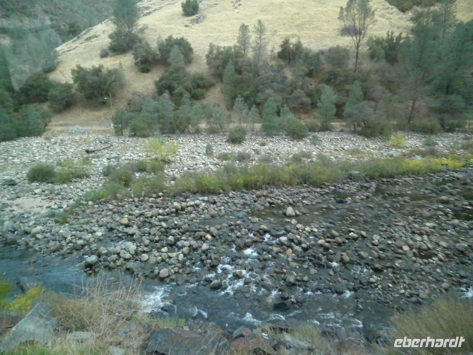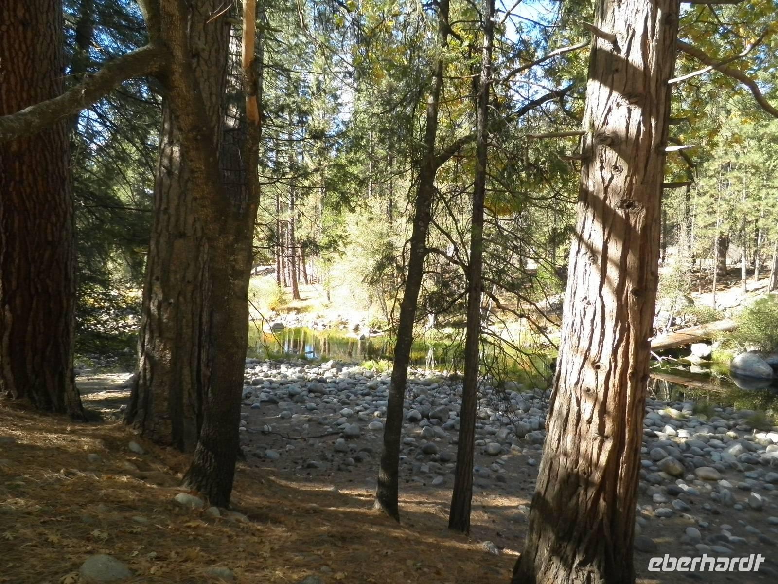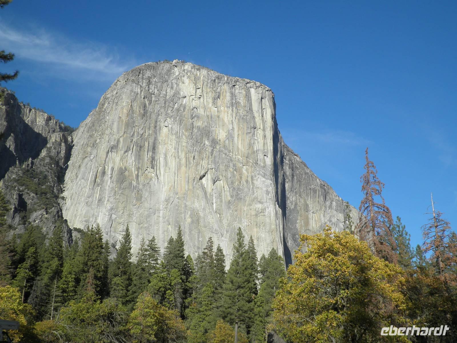 An diesem Tag frühstückten wir einmal nicht im Hotel, sondern fuhren mit unserem Bus in Danny's Diner, wo wir uns Kaffee, Orangensaft, Rühreier und Speck schmecken ließen. Nach dieser Stärkung brachen wir auf in Richtung Yosemite Nationalpark. Hier sind nicht nur die riesigen roten Sequoia-Bäume zu Hause, auch als Mammutbäume bekannt, sondern auch Grizzlybären Leben im Nationalpark. Janny zeigte uns einen Warnzettel, dass man sehr sorgsam mit Lebensmitteln im Park umgehen muss, denn für die vom Menschen mitgebrachten Leckereien interessieren sich auch dir Bären. Um heranzukommen brechen sie sogar in Autos ein oder zerstören Zelte und Wohnwagen. Wir sahen keine der Bären, dafür bestaunten wir die riesigen Mammutbäume im Park. Auf einer Fahrt durch den Yosemite Park hielten wir einige Male an, um die atemberaubende Natur zu bestaunen und zu fotografieren. So sahen wir den Brautschleierwasserfall und den riesigen Felsen El Capitan. Bei den Yosemite Falls machten wir eine etwas längere Pause. Leider gab es gerade nicht genug Wasser, so dass der eigentliche Wasserfall gar nicht da war. Aber anhand der dunkleren Verfärbung des Gesteins konnten wir uns den Wasserfall mit Wasser ganz gut vorstellen. Trotz des wasserlosen Wasserfalls gab es noch andere Dinge zu besichtigen. Einige Gäste genossen dir Ruhe und den grandiosen Anblick des Flusses, andere spazierten zum Half Dome, einem markanten Felsen in der Nähe, und sahen zwei Malerinnen dabei zu, wie sie die Schönheit dieser Landschaft auf ihren Staffeleien einfangen wollten.