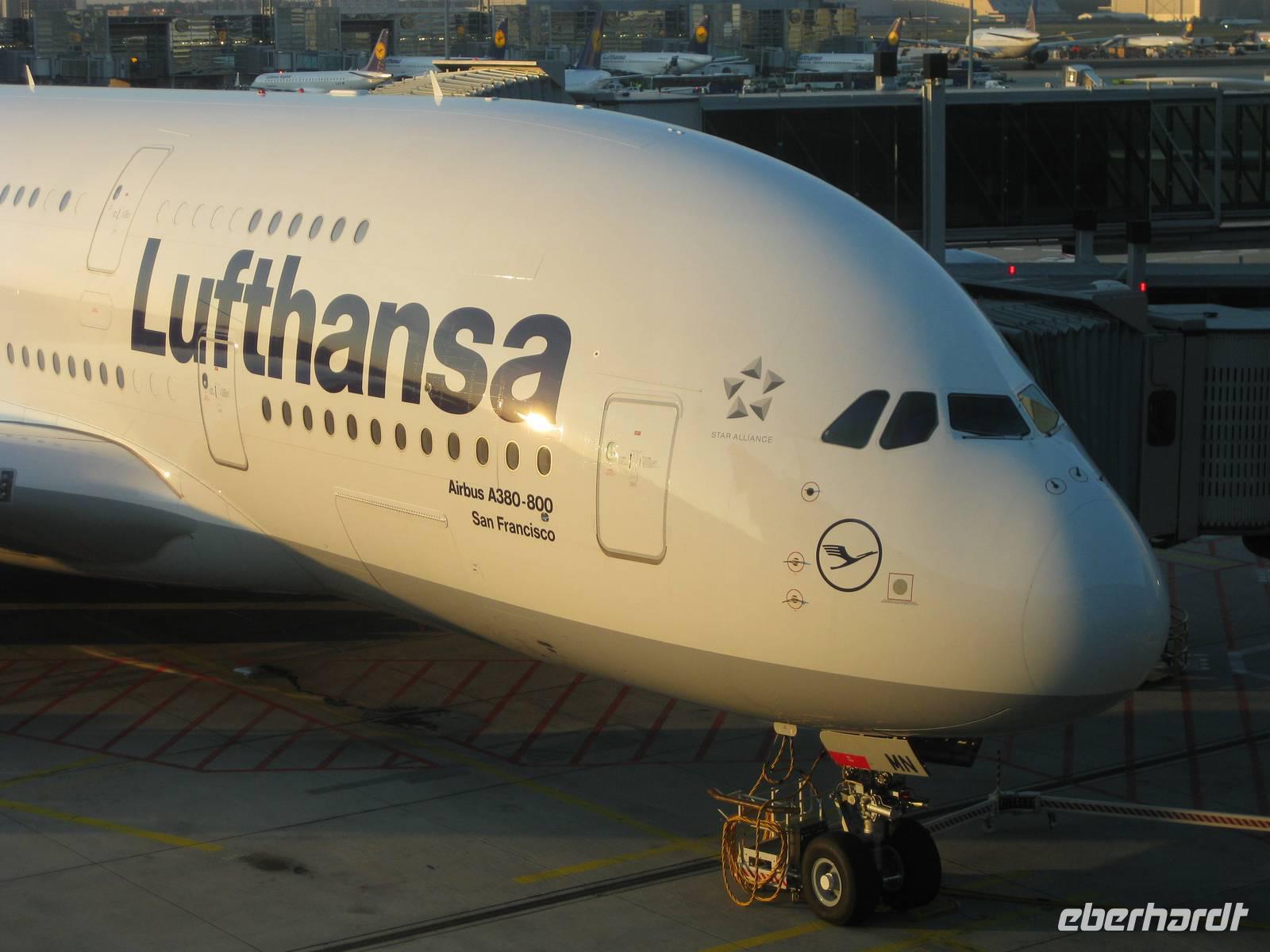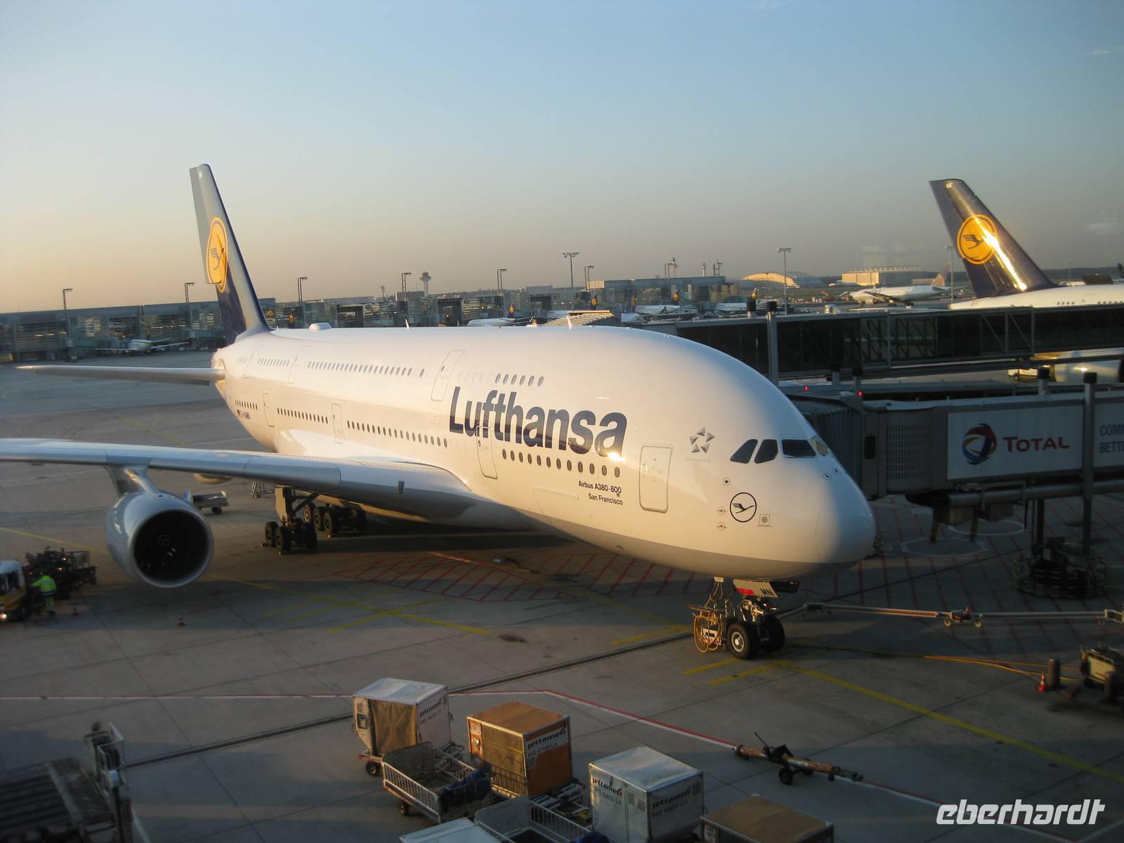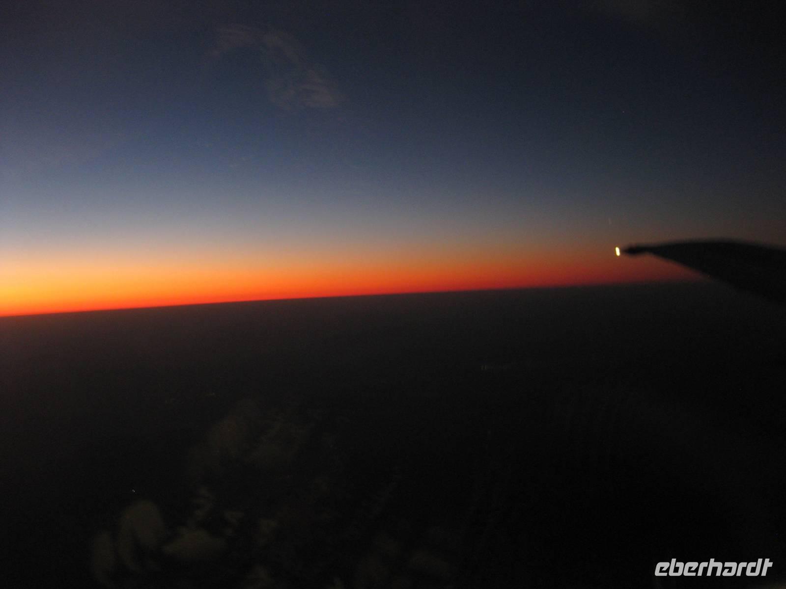 Pünktlich um 4.45 Uhr treffen wir uns auf dem Flughafen in Dresden - 16 Gäste und ich als Reisebegleitung. Eingecheckt sind wir schon. Das habe ich gestern schon erledigt, so dass wir nur noch das Gepäck aufgeben müssen. Dann geht es durch die Sicherheitskontrolle. Im Bistro Cassis erwartet uns ein kleiner Frühstücksimbiss. 6.15 Uhr startet unsere Maschine in Richtung Frankfurt. Unterwegs erleben wir einen tollen Sonnenaufgang. In Frankfurt gelandet, begeben wir uns zum Gate für unseren Weiterflug nach Los Angeles. Wir haben noch etwas Zeit. Inzwischen treffen auch unsere anderen Gäste, die von Leipzig, Berlin und Zürich angereist sind, ein. Nun sind wir komplett - 22 Gäste und die Eberhardt-Reisebegleitung.