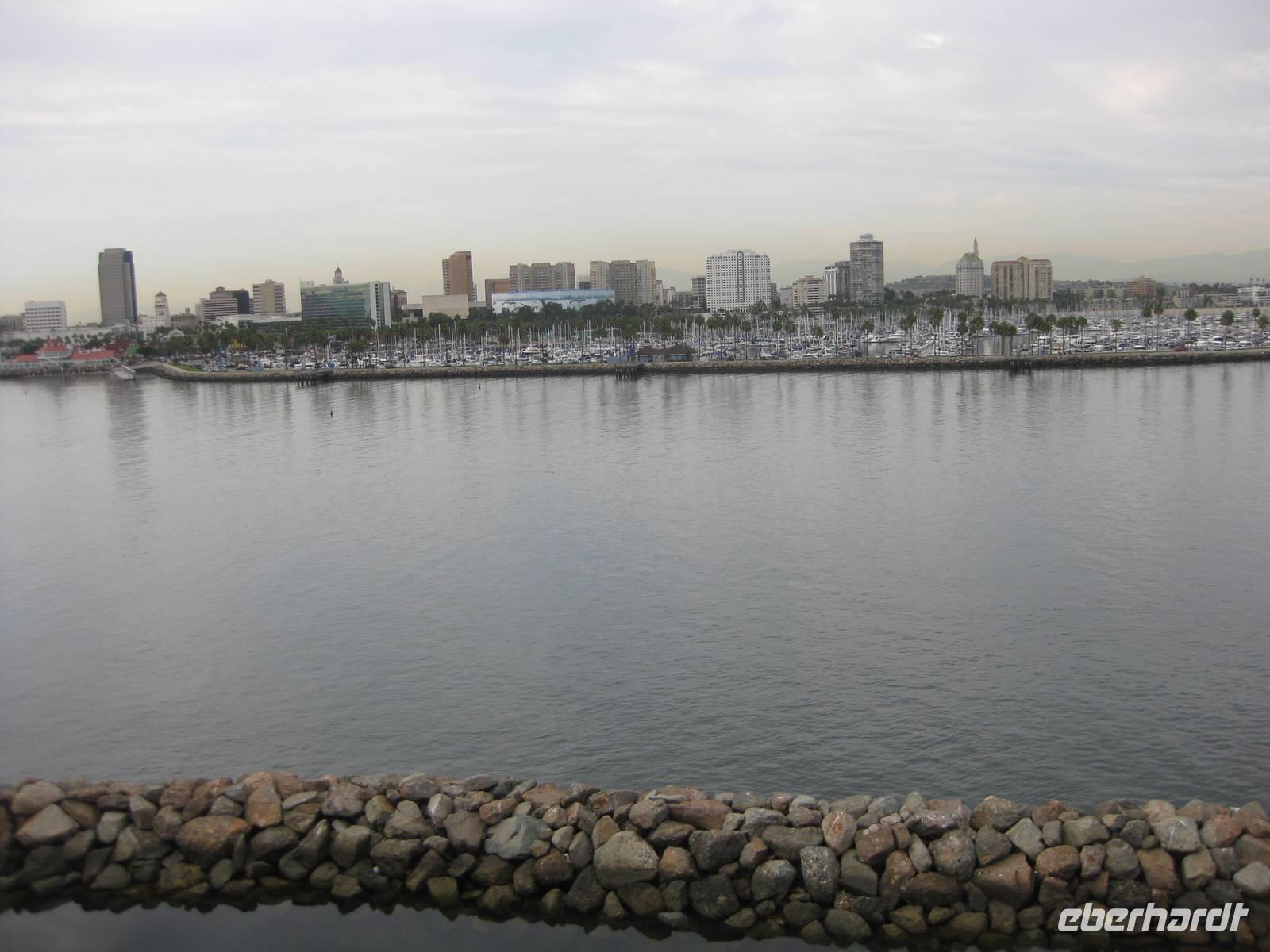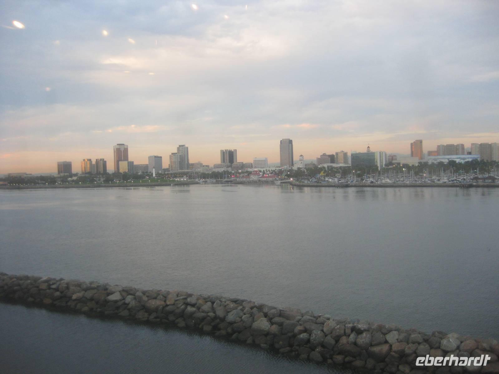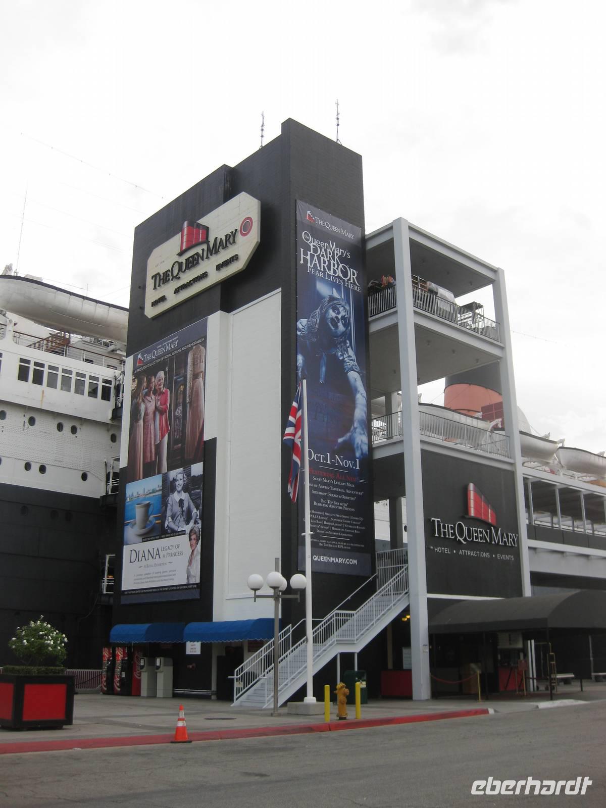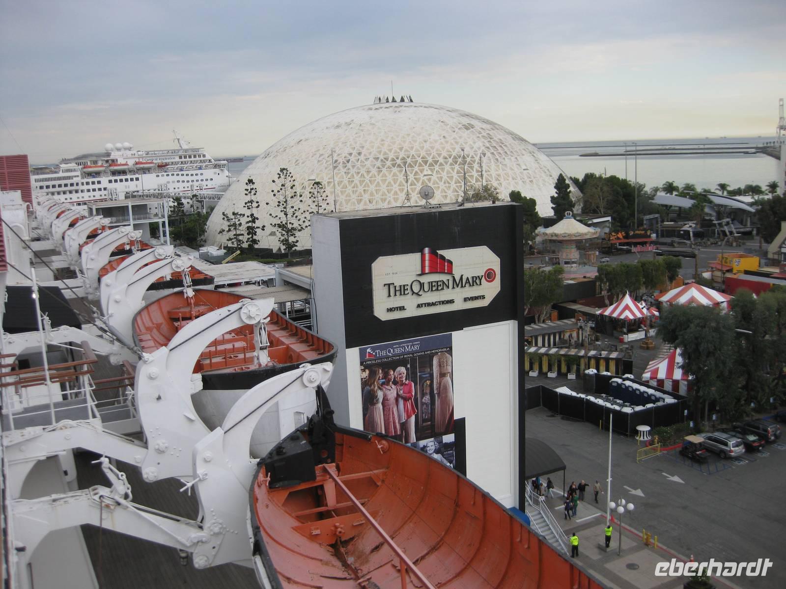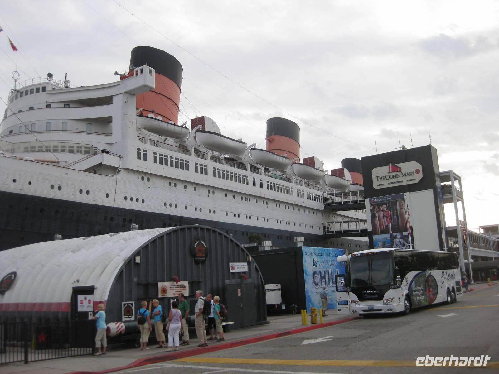Mit einem Transferbus fahren wir zum Hotelschiff „Queen Mary", das im Stadtteil Long Beach am Kai liegt. Wir checken ein und beziehen unsere „Zimmer". Dann treffen wir uns mit Janny zu einer Schiffsbesichtigung. Die „Queen Mary" wurde 193. in Dienst gestellt und war zu damaliger Zeit ein echter Luxusdampfer. Das alles wurde weitestgehend erhalten, auch in den Kabinen - sehr interessant, heute nicht mehr so luxeriös. 18.00 Uhr treffen wir uns im Restaurant zu unserem ersten gemeinsamen Abendessen. Es gibt ein Drei-Gang-Menü mit einem echt amerikanischen Steak, sehr lecker. Und dann begeben wir uns in unsere Kabinen. Wir sind alle ganz schön müde, war es doch ein viel längerer Tag als sonst.