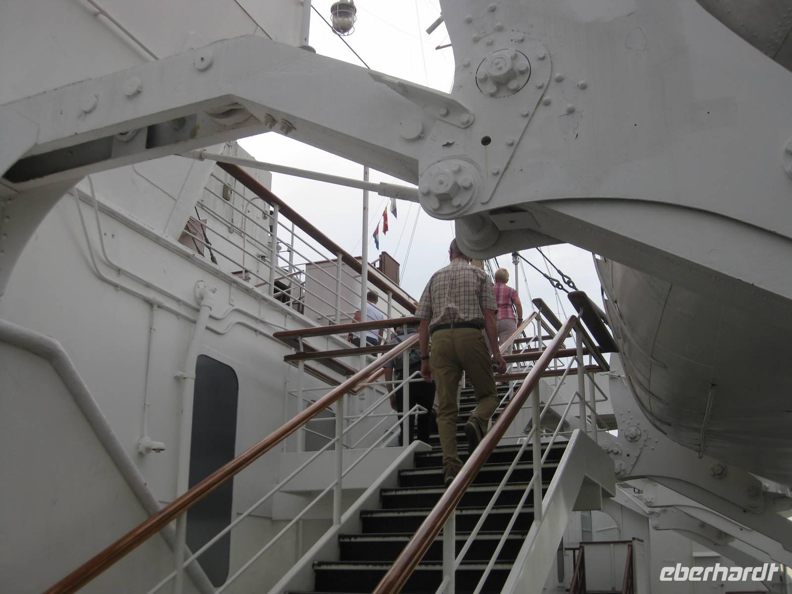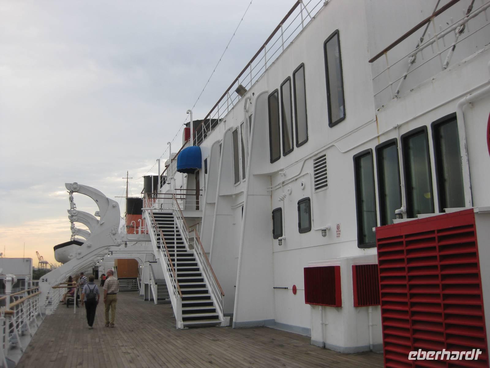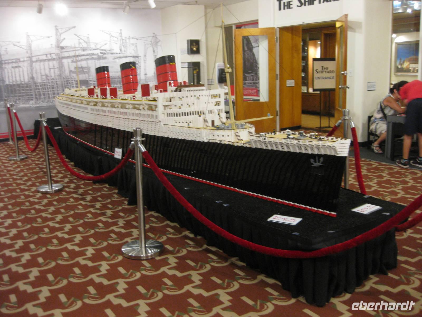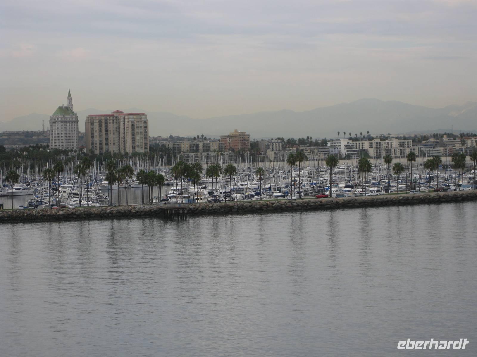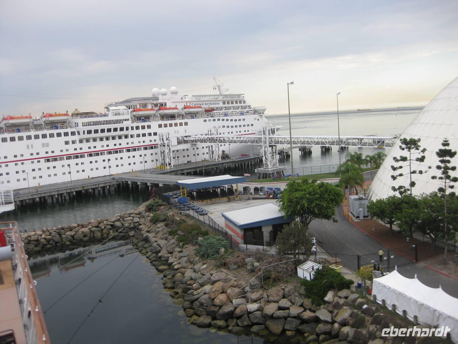 Mit einem Transferbus fahren wir zum Hotelschiff „Queen Mary", das im Stadtteil Long Beach am Kai liegt. Wir checken ein und beziehen unsere „Zimmer". Dann treffen wir uns mit Janny zu einer Schiffsbesichtigung. Die „Queen Mary" wurde 193. in Dienst gestellt und war zu damaliger Zeit ein echter Luxusdampfer. Das alles wurde weitestgehend erhalten, auch in den Kabinen - sehr interessant, heute nicht mehr so luxeriös. 18.00 Uhr treffen wir uns im Restaurant zu unserem ersten gemeinsamen Abendessen. Es gibt ein Drei-Gang-Menü mit einem echt amerikanischen Steak, sehr lecker. Und dann begeben wir uns in unsere Kabinen. Wir sind alle ganz schön müde, war es doch ein viel längerer Tag als sonst.
