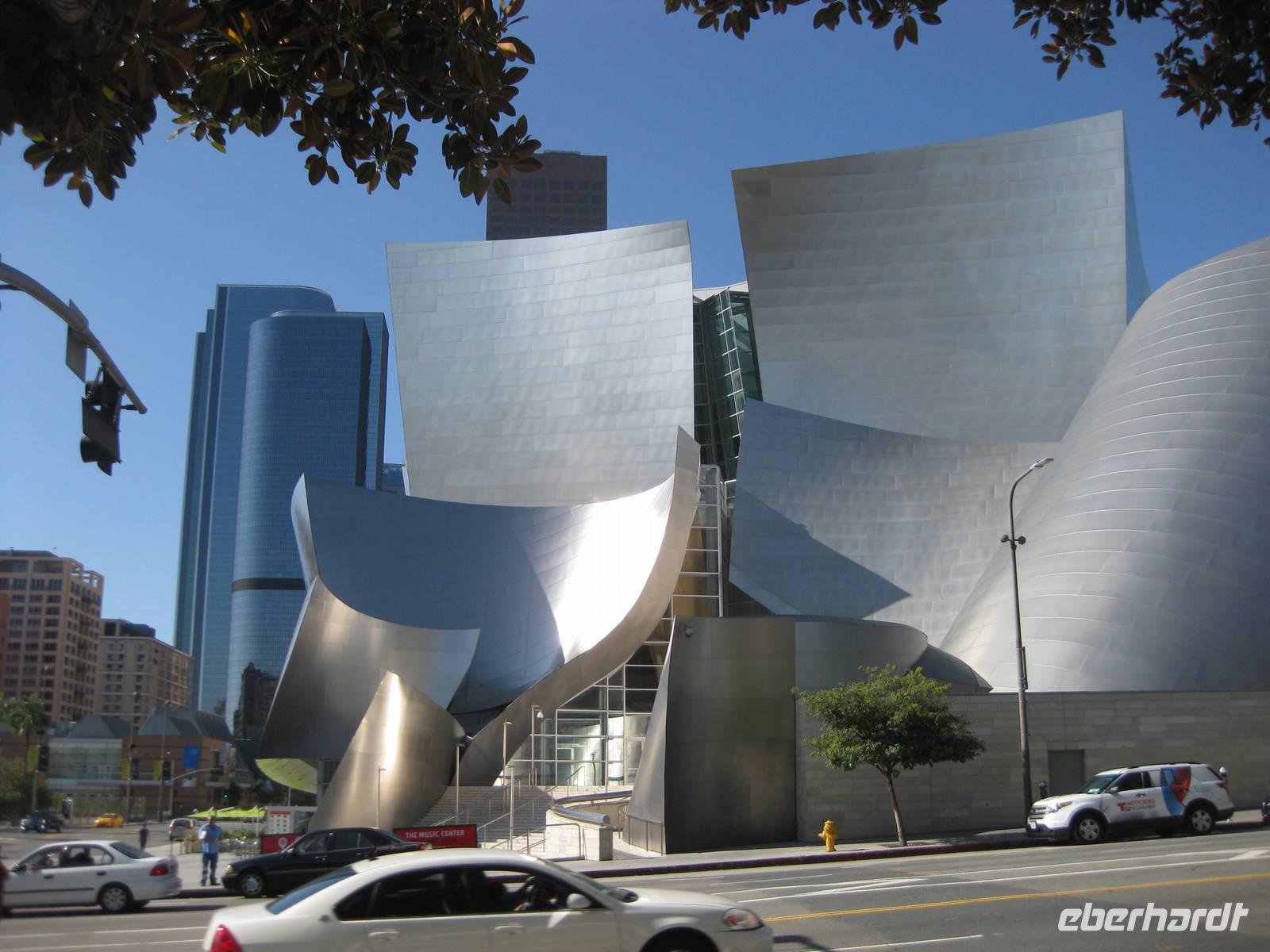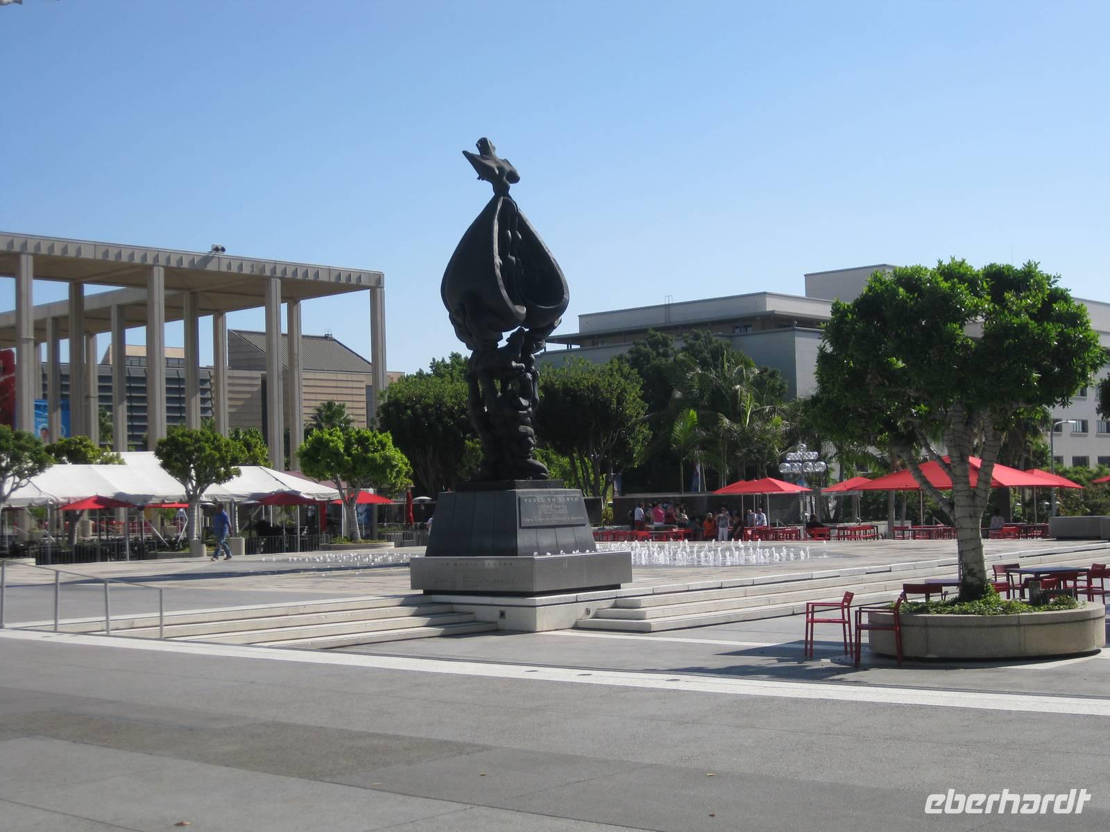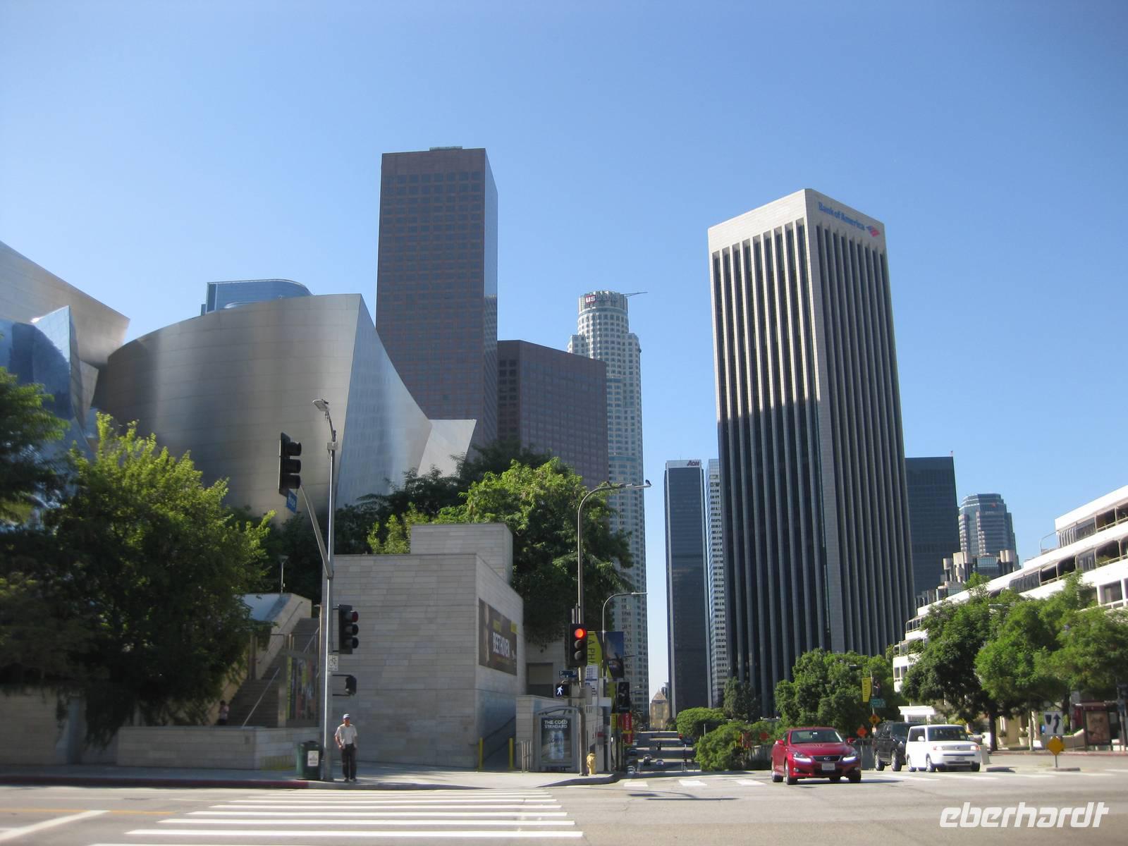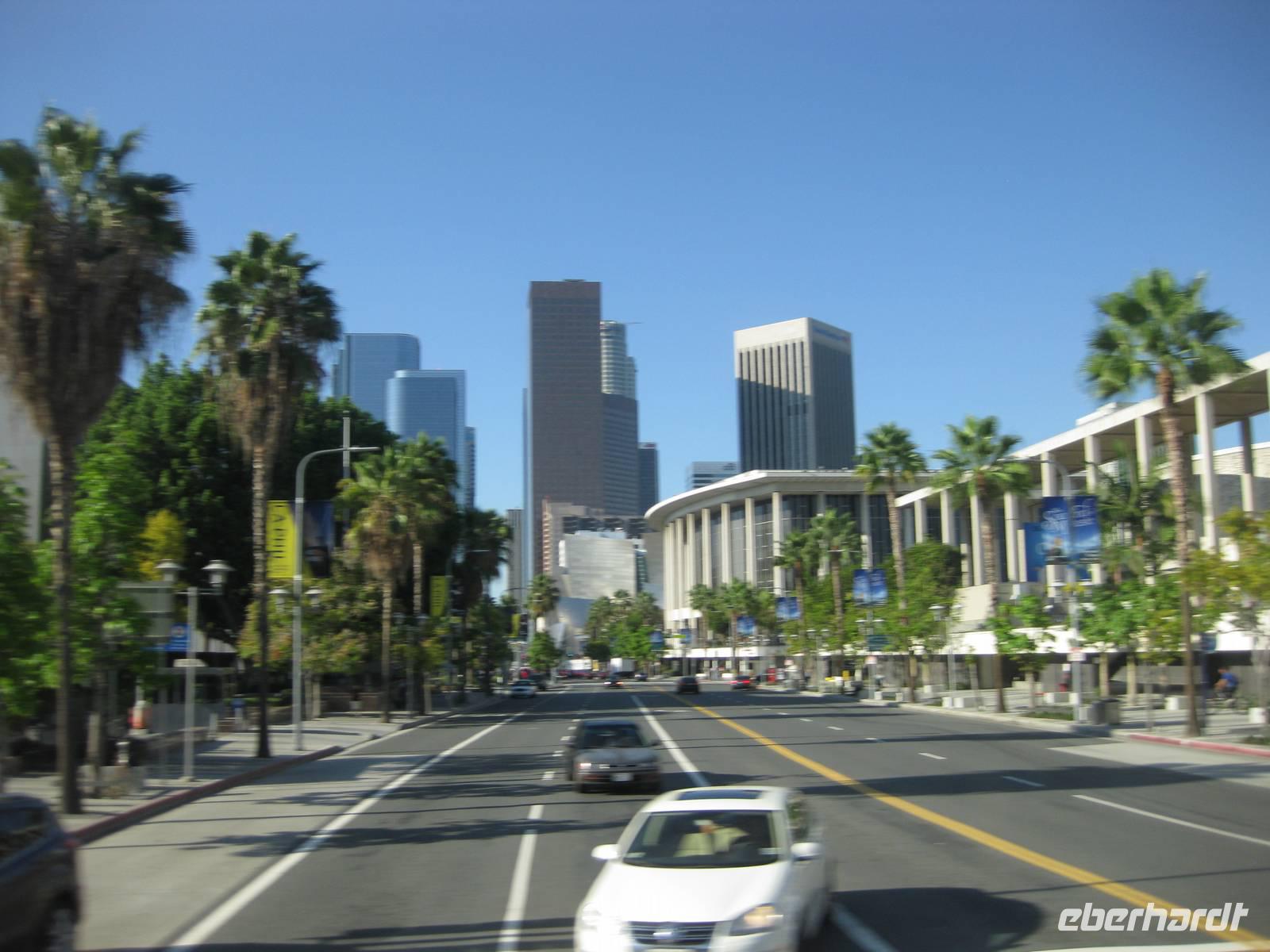 Nach einem amerikanischen Frühstück starten wir zu unserer Stadtrundfahrt in Los Angeles. Derrick, unser Fahrer für die nächsten zwei Wochen, erwartet uns mit dem Bus. Es ist ein großer schicker Reisebus. Wir haben ausreichend Platz und können uns bequem verteilen. Auf der Fahrt in die Stadt erzählt uns Janny über den Bundesstaat Kalifornien, auch Goldstaat oder Sonnenstaat genannt, und auch über Los Angeles. In Downtown, an der Olvera Street, der ältesten Straße von Los Angeles, machen wir einen Stopp und können etwas bummeln, die ersten Souvenire kaufen und fotografieren. Dann fahren wir zum Music Center der Stadt, wo wir auch noch mal stoppen. Hier befinden sich ein Theater, der Dorothy Chandler Pavillon und die Walt Disney Music Hall. Alles ziemlich spektakuläre Gebäude, besonders die Walt Disney Music Hall.