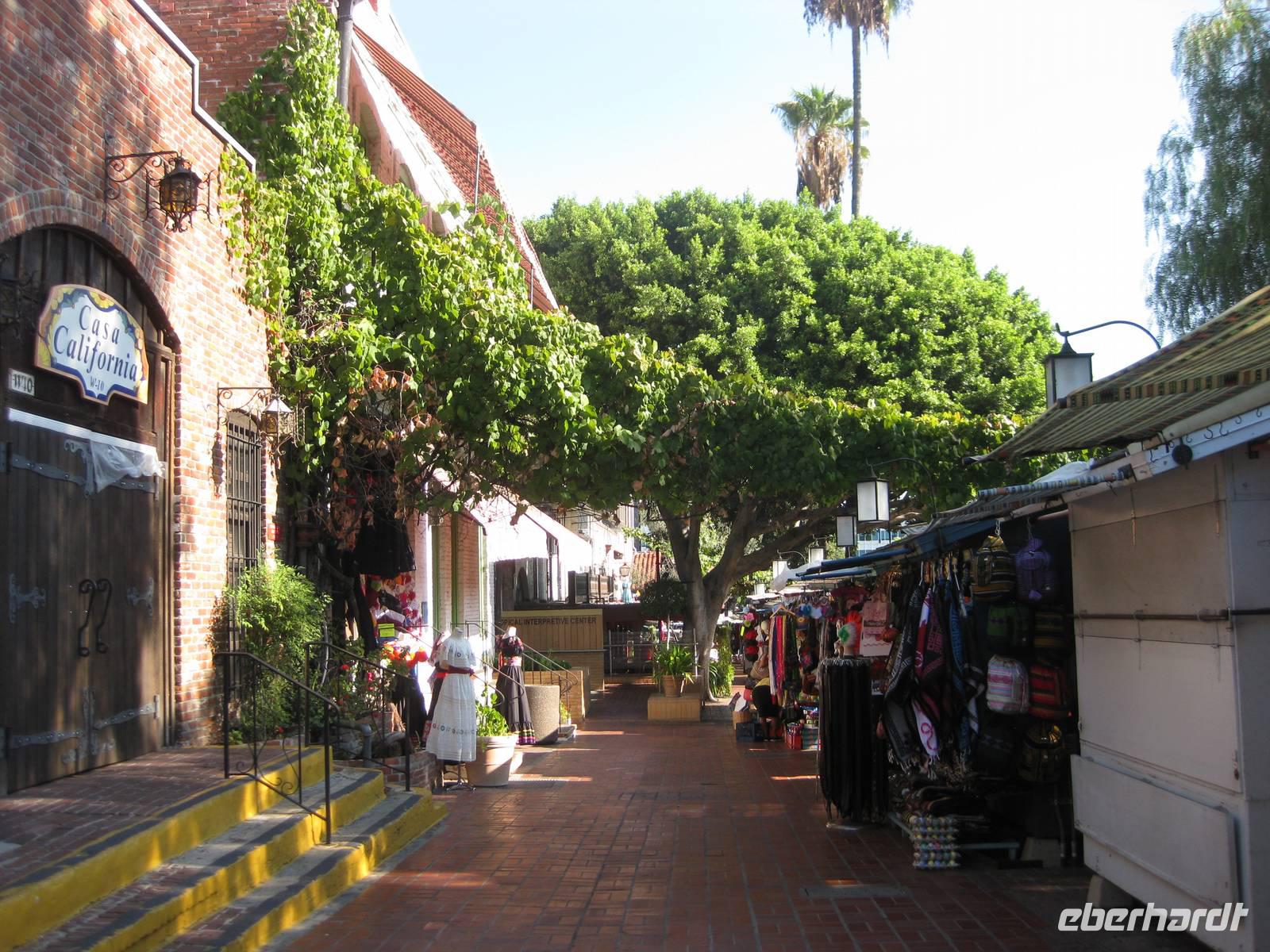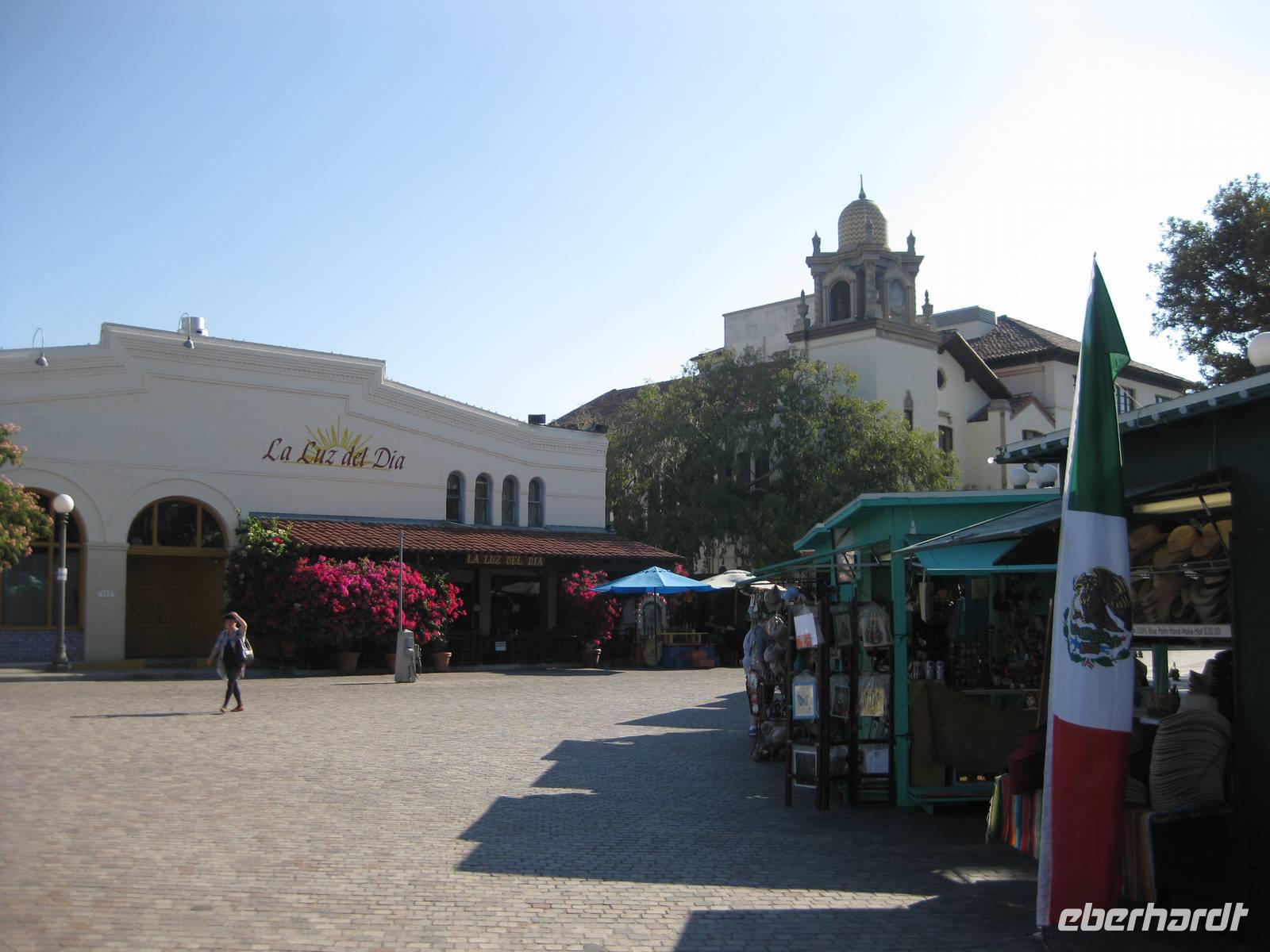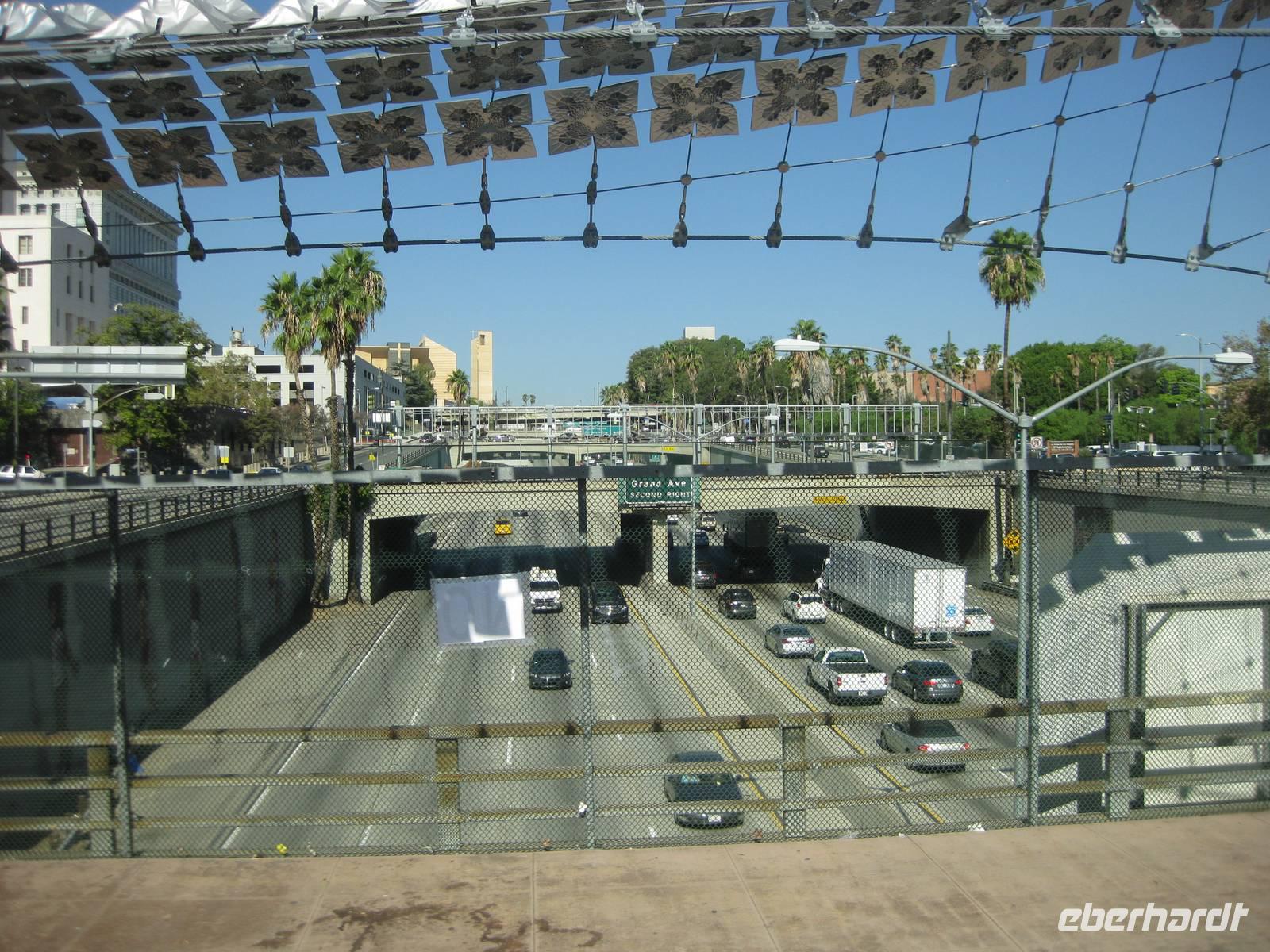 Nach einem amerikanischen Frühstück starten wir zu unserer Stadtrundfahrt in Los Angeles. Derrick, unser Fahrer für die nächsten zwei Wochen, erwartet uns mit dem Bus. Es ist ein großer schicker Reisebus. Wir haben ausreichend Platz und können uns bequem verteilen. Auf der Fahrt in die Stadt erzählt uns Janny über den Bundesstaat Kalifornien, auch Goldstaat oder Sonnenstaat genannt, und auch über Los Angeles. In Downtown, an der Olvera Street, der ältesten Straße von Los Angeles, machen wir einen Stopp und können etwas bummeln, die ersten Souvenire kaufen und fotografieren. Dann fahren wir zum Music Center der Stadt, wo wir auch noch mal stoppen. Hier befinden sich ein Theater, der Dorothy Chandler Pavillon und die Walt Disney Music Hall. Alles ziemlich spektakuläre Gebäude, besonders die Walt Disney Music Hall.