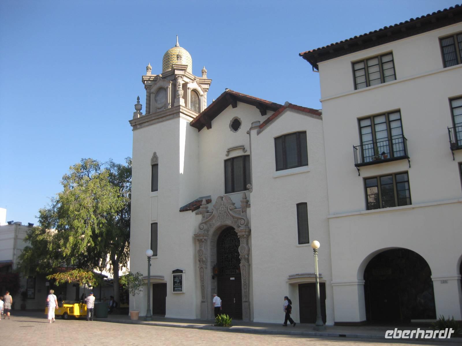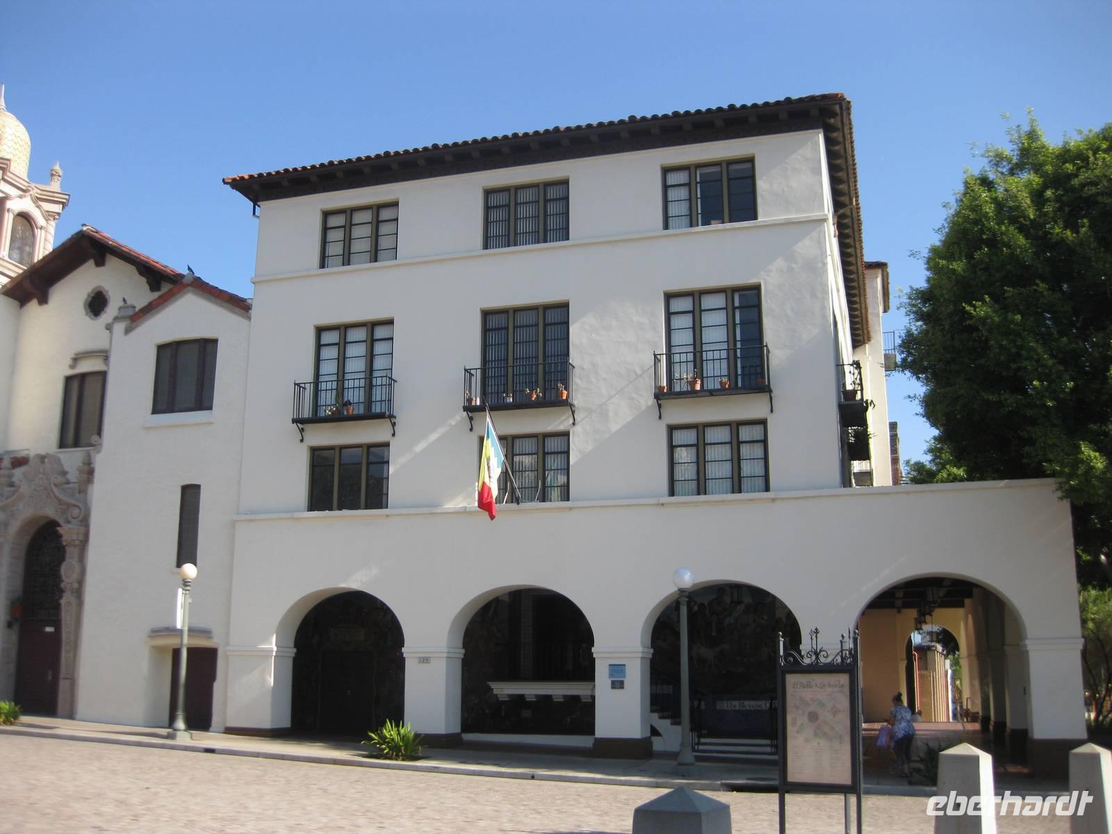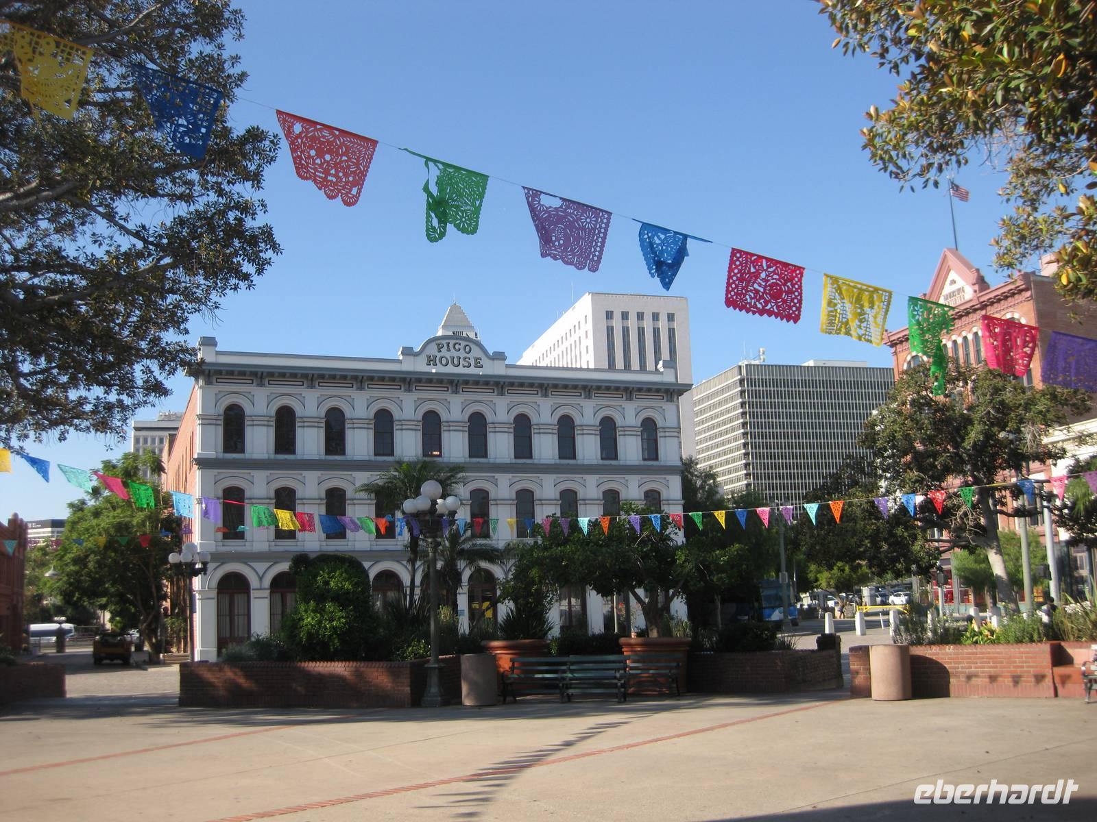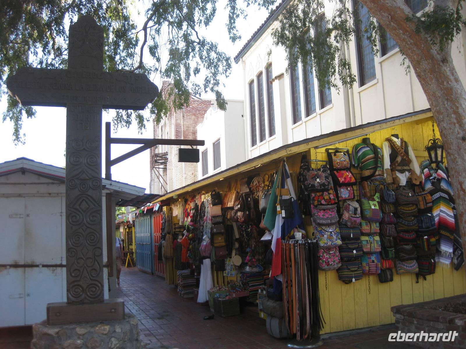 Nach einem amerikanischen Frühstück starten wir zu unserer Stadtrundfahrt in Los Angeles. Derrick, unser Fahrer für die nächsten zwei Wochen, erwartet uns mit dem Bus. Es ist ein großer schicker Reisebus. Wir haben ausreichend Platz und können uns bequem verteilen. Auf der Fahrt in die Stadt erzählt uns Janny über den Bundesstaat Kalifornien, auch Goldstaat oder Sonnenstaat genannt, und auch über Los Angeles. In Downtown, an der Olvera Street, der ältesten Straße von Los Angeles, machen wir einen Stopp und können etwas bummeln, die ersten Souvenire kaufen und fotografieren. Dann fahren wir zum Music Center der Stadt, wo wir auch noch mal stoppen. Hier befinden sich ein Theater, der Dorothy Chandler Pavillon und die Walt Disney Music Hall. Alles ziemlich spektakuläre Gebäude, besonders die Walt Disney Music Hall.
