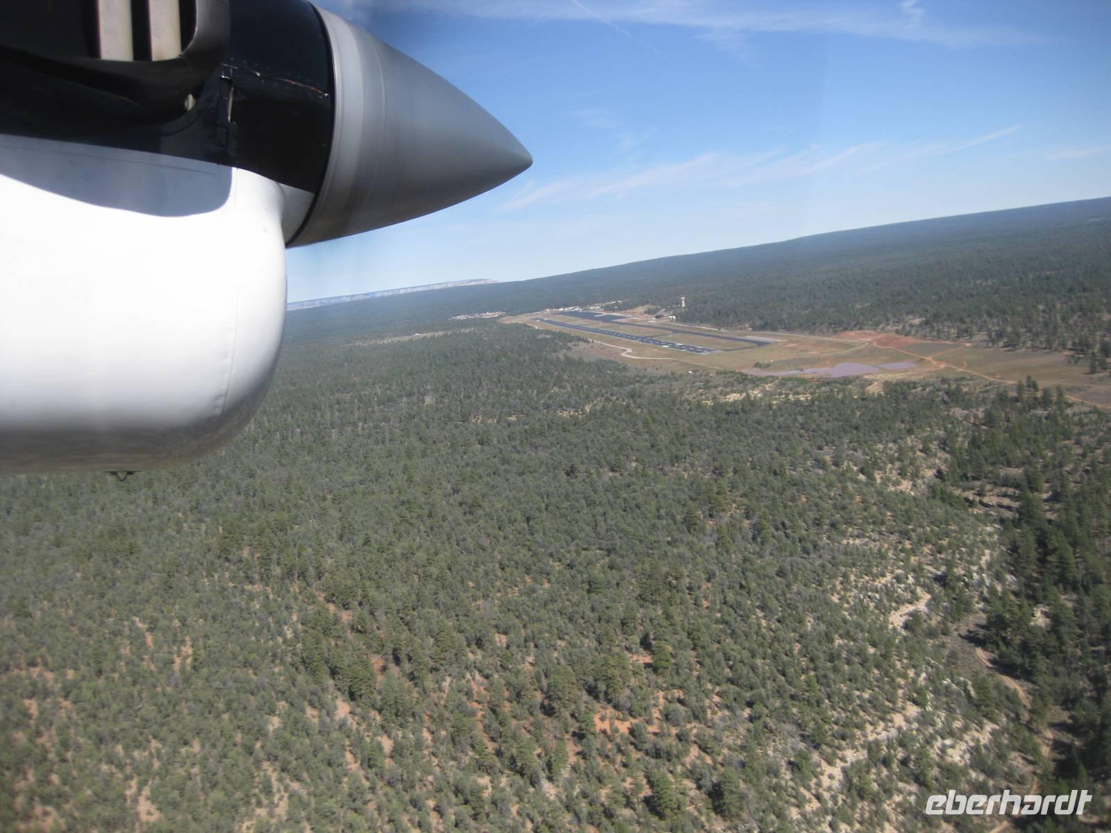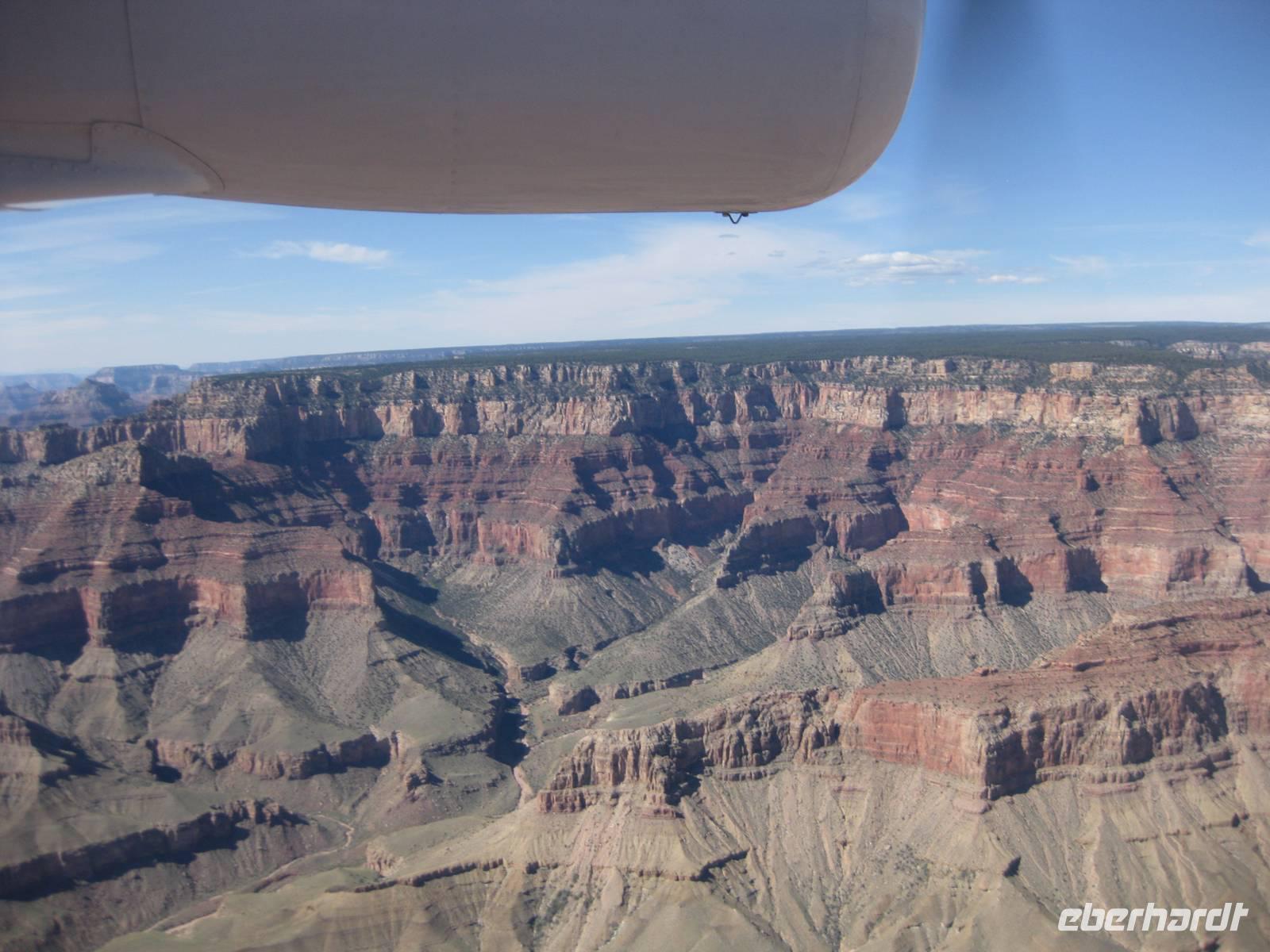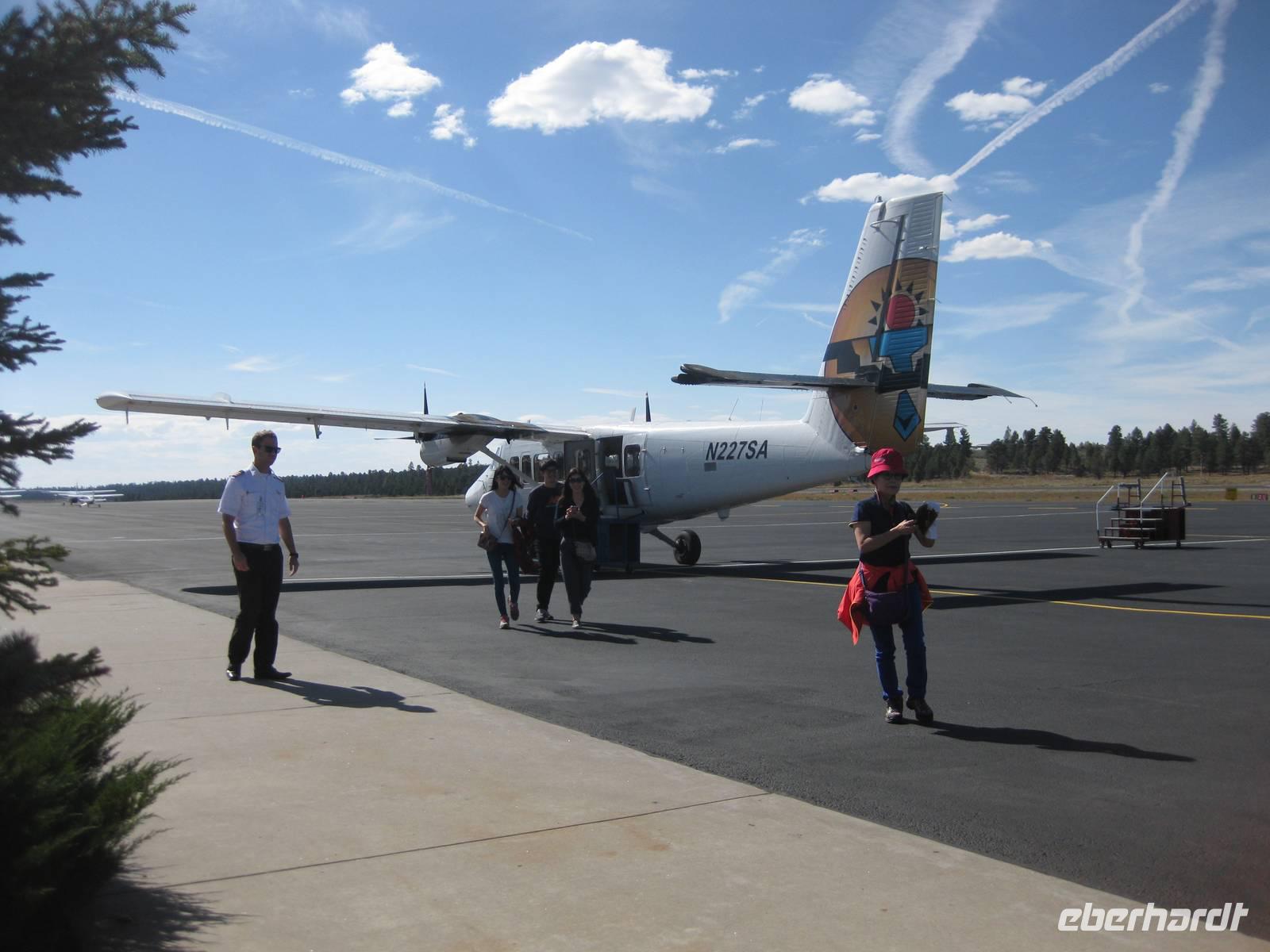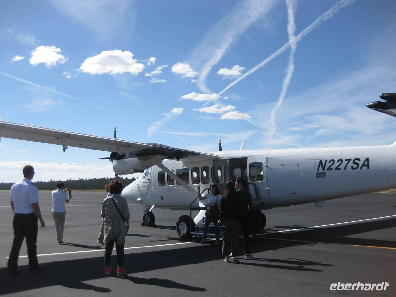 Wir anderen fahren zum Grand Canyon Airport, wo unser Rundflug bei bestem Flugwetter startet. Wir fliegen mit einem Kleinflugzeug der Grand Canyon Airlines, das extra für diese Rundflüge entwickelt und gebaut wurde. Es fliegt relativ langsam und in geringer Höhe und es hat besonders große Panoramafenster, damit alle Gäste gut sehen können. Wir sind ein wenig aufgeregt und gespannt. Dann geht es los und wir erheben uns in die Lüfte zum Flug über den Grand Canyon. Es ist ein ruhiger Flug trotz der geringen Höhe in der wir fliegen. Es ist faszinierend. Wir können tief in den Canyon hinein schauen und wir bekommen eine leise Ahnung von der Größe des Canyon - 450 Kilometer lang, 60 Kilometer breit und 1,5 Kilometer tief. Über Kopfhörer bekommen wir Informationen. Nach 40 Minuten landen wir wieder auf dem Flugplatz. Alle sind begeistert.