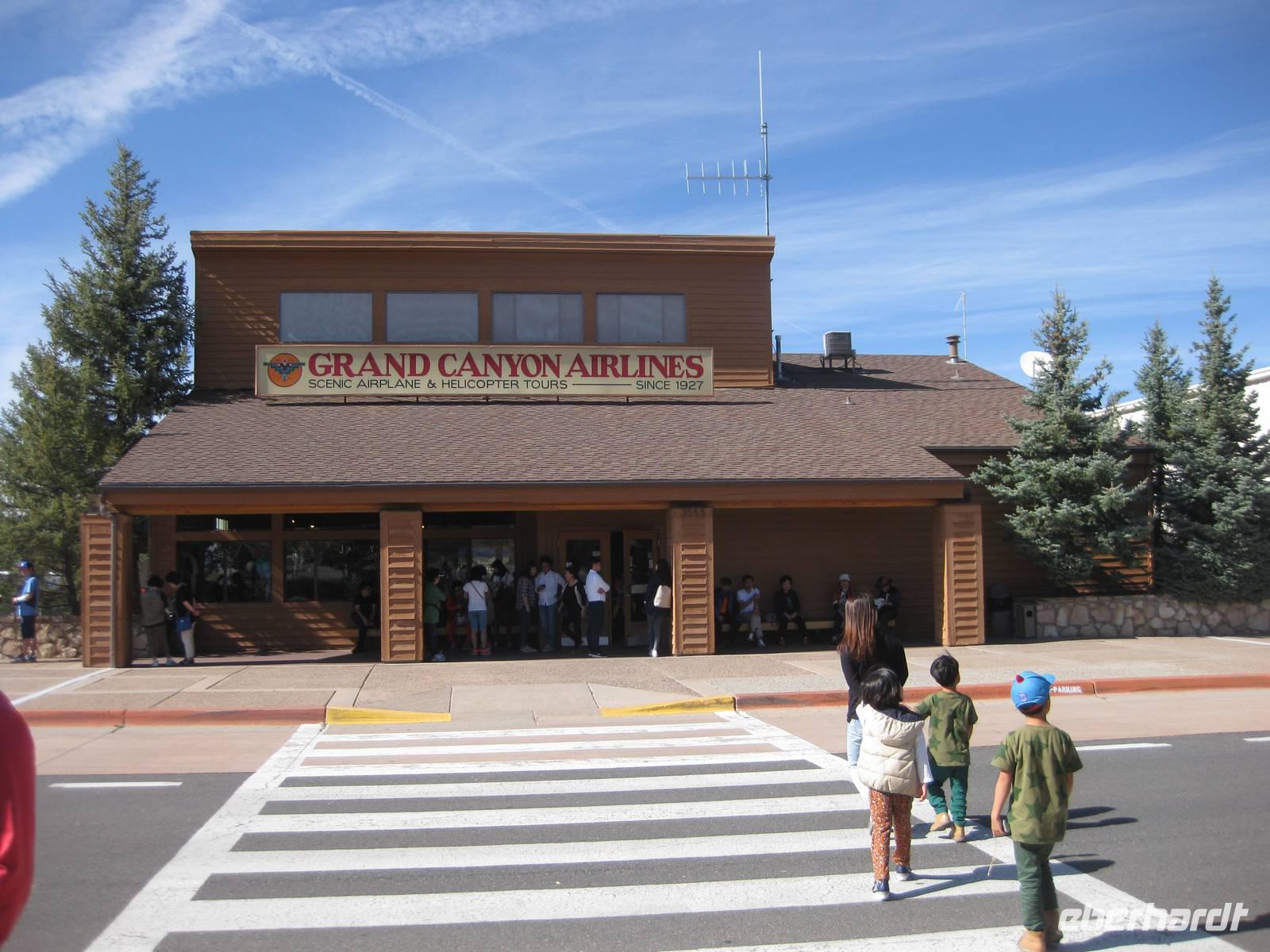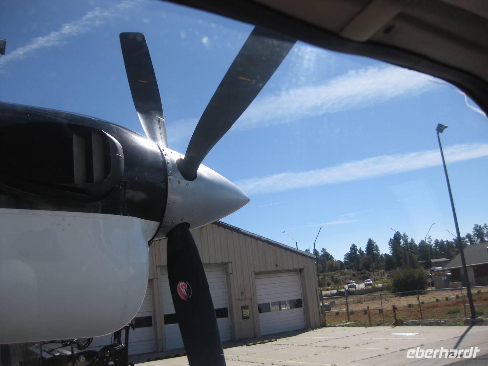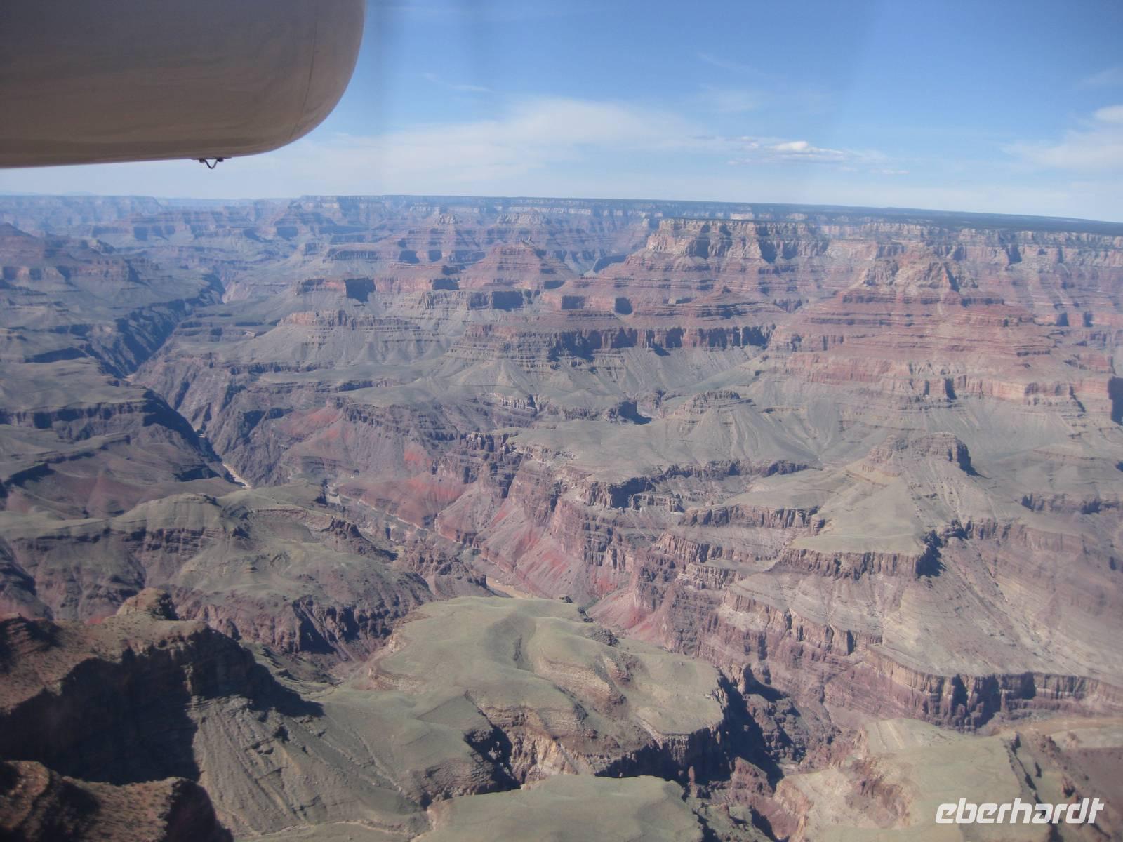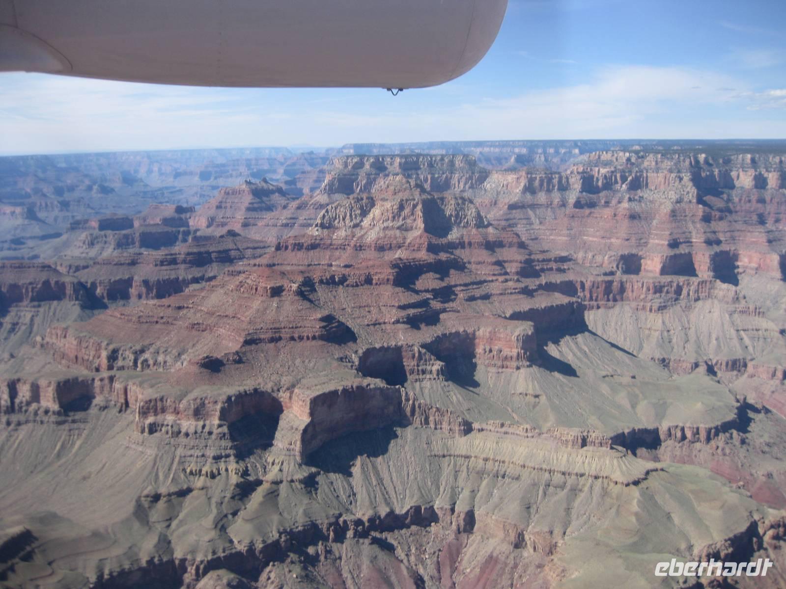 Wir anderen fahren zum Grand Canyon Airport, wo unser Rundflug bei bestem Flugwetter startet. Wir fliegen mit einem Kleinflugzeug der Grand Canyon Airlines, das extra für diese Rundflüge entwickelt und gebaut wurde. Es fliegt relativ langsam und in geringer Höhe und es hat besonders große Panoramafenster, damit alle Gäste gut sehen können. Wir sind ein wenig aufgeregt und gespannt. Dann geht es los und wir erheben uns in die Lüfte zum Flug über den Grand Canyon. Es ist ein ruhiger Flug trotz der geringen Höhe in der wir fliegen. Es ist faszinierend. Wir können tief in den Canyon hinein schauen und wir bekommen eine leise Ahnung von der Größe des Canyon - 450 Kilometer lang, 60 Kilometer breit und 1,5 Kilometer tief. Über Kopfhörer bekommen wir Informationen. Nach 40 Minuten landen wir wieder auf dem Flugplatz. Alle sind begeistert.