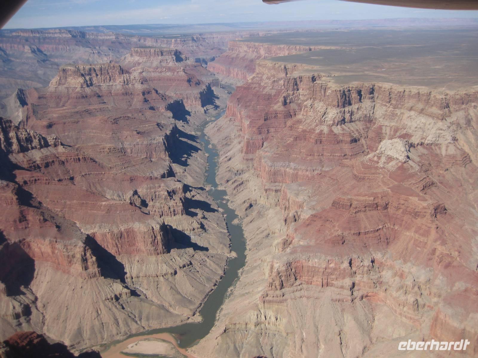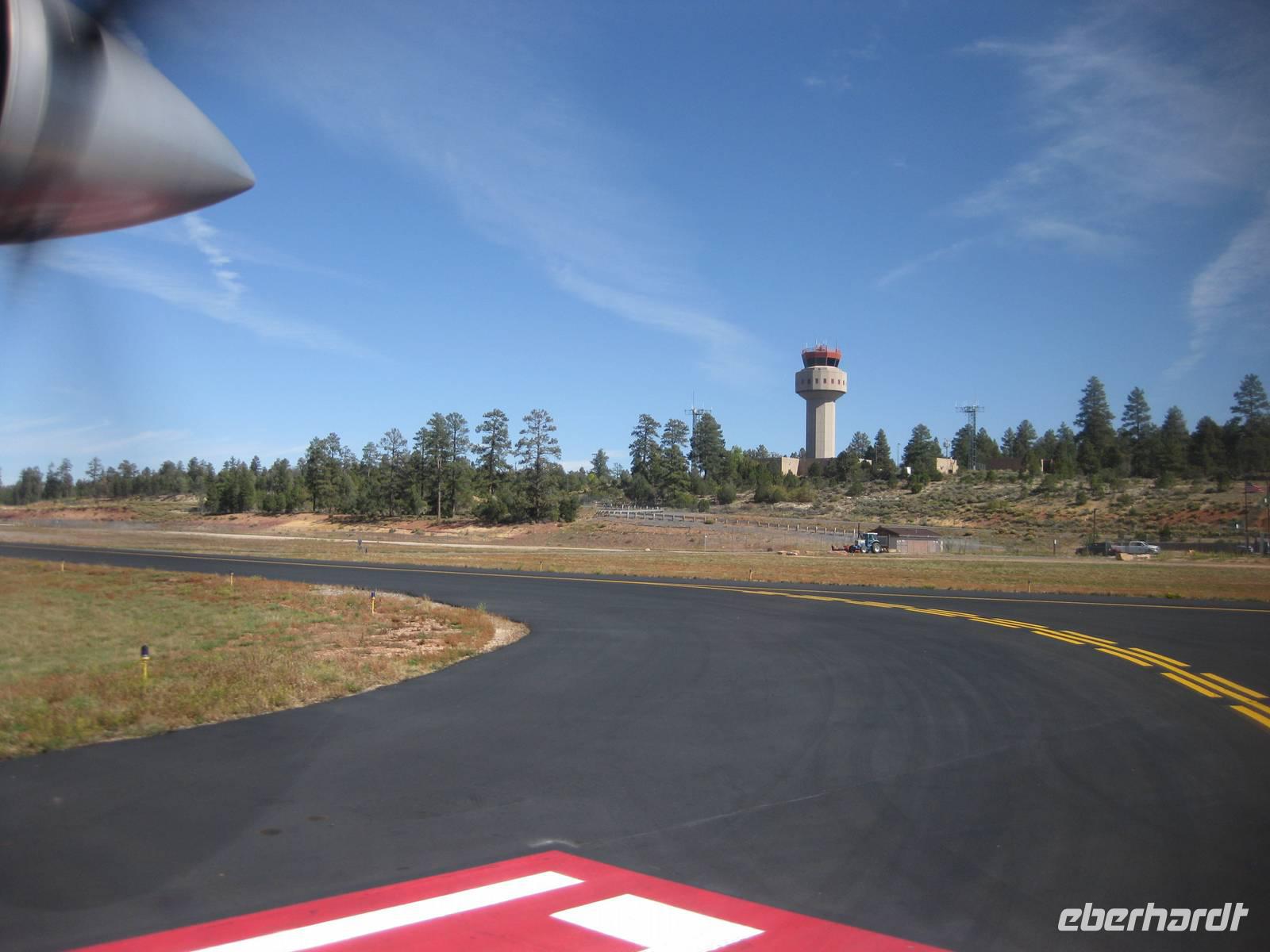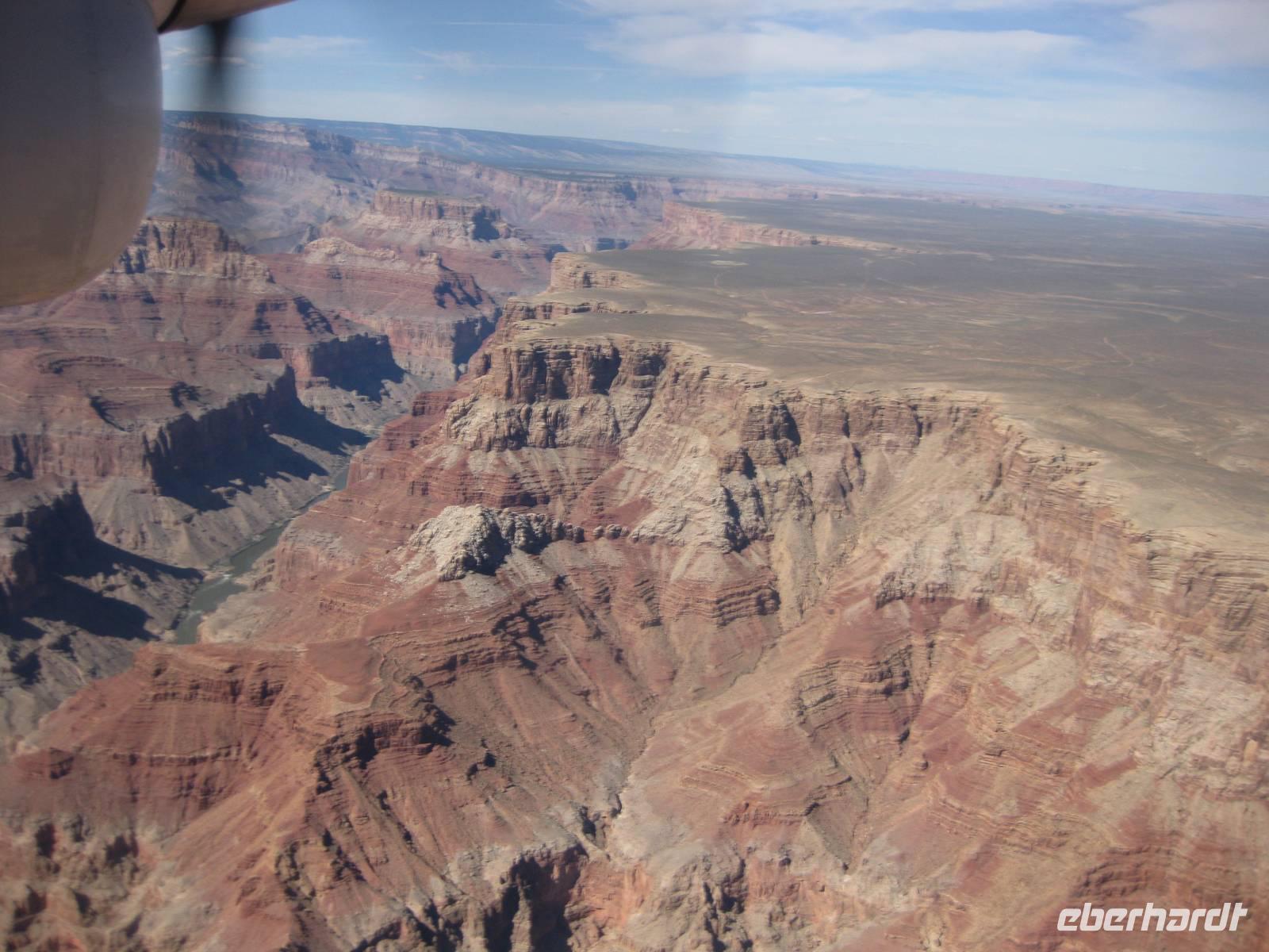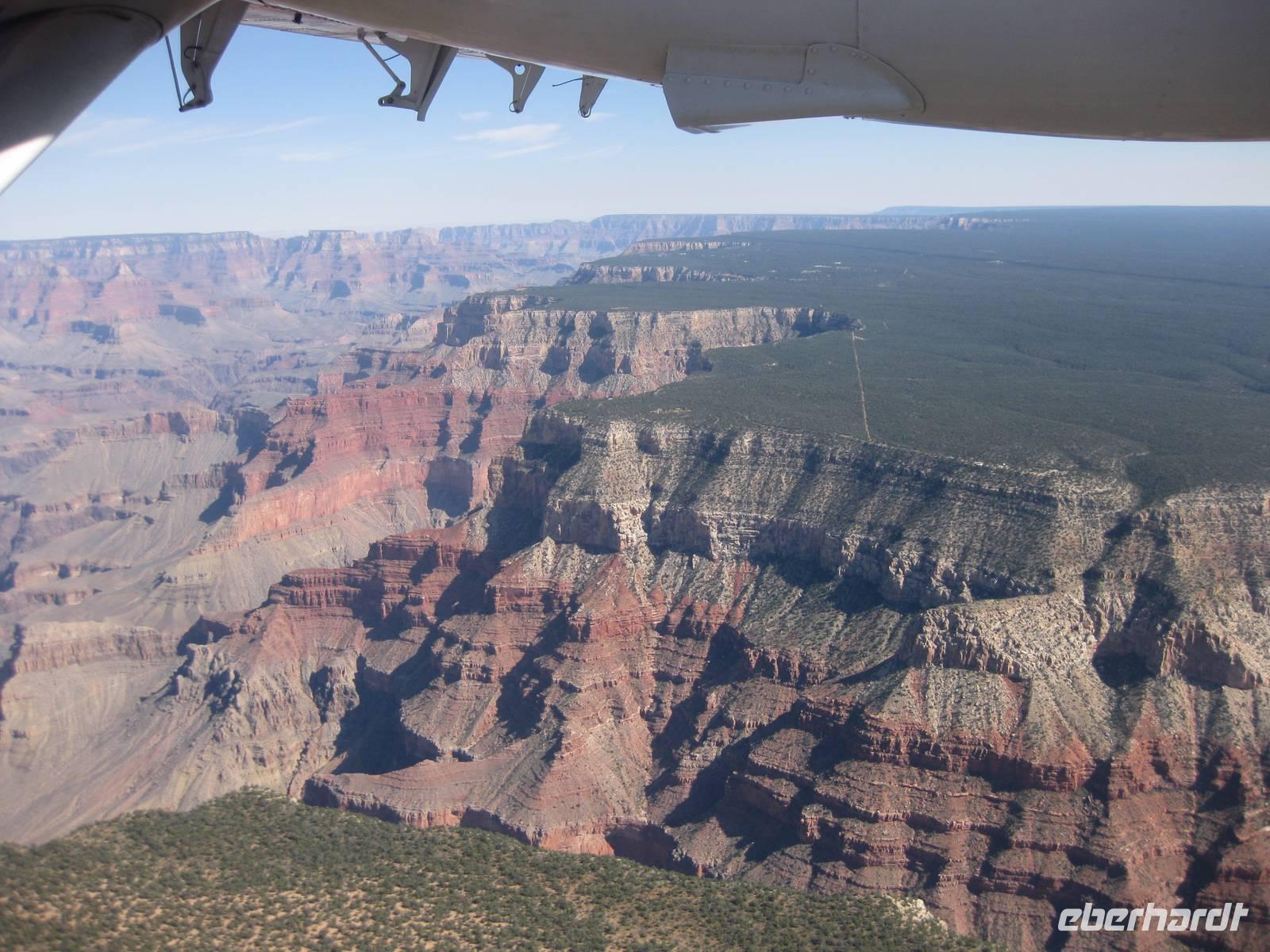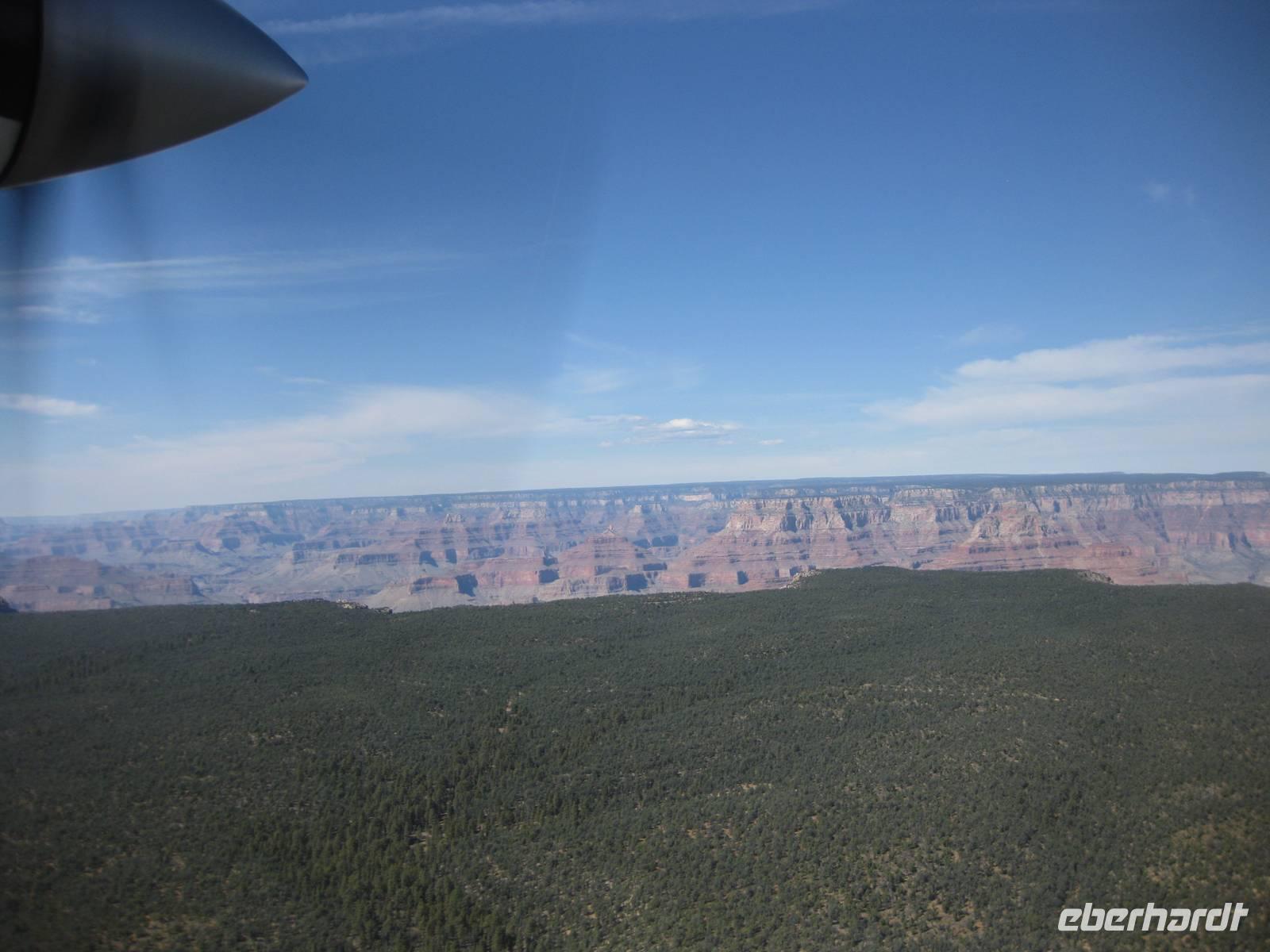 Wir anderen fahren zum Grand Canyon Airport, wo unser Rundflug bei bestem Flugwetter startet. Wir fliegen mit einem Kleinflugzeug der Grand Canyon Airlines, das extra für diese Rundflüge entwickelt und gebaut wurde. Es fliegt relativ langsam und in geringer Höhe und es hat besonders große Panoramafenster, damit alle Gäste gut sehen können. Wir sind ein wenig aufgeregt und gespannt. Dann geht es los und wir erheben uns in die Lüfte zum Flug über den Grand Canyon. Es ist ein ruhiger Flug trotz der geringen Höhe in der wir fliegen. Es ist faszinierend. Wir können tief in den Canyon hinein schauen und wir bekommen eine leise Ahnung von der Größe des Canyon - 450 Kilometer lang, 60 Kilometer breit und 1,5 Kilometer tief. Über Kopfhörer bekommen wir Informationen. Nach 40 Minuten landen wir wieder auf dem Flugplatz. Alle sind begeistert.