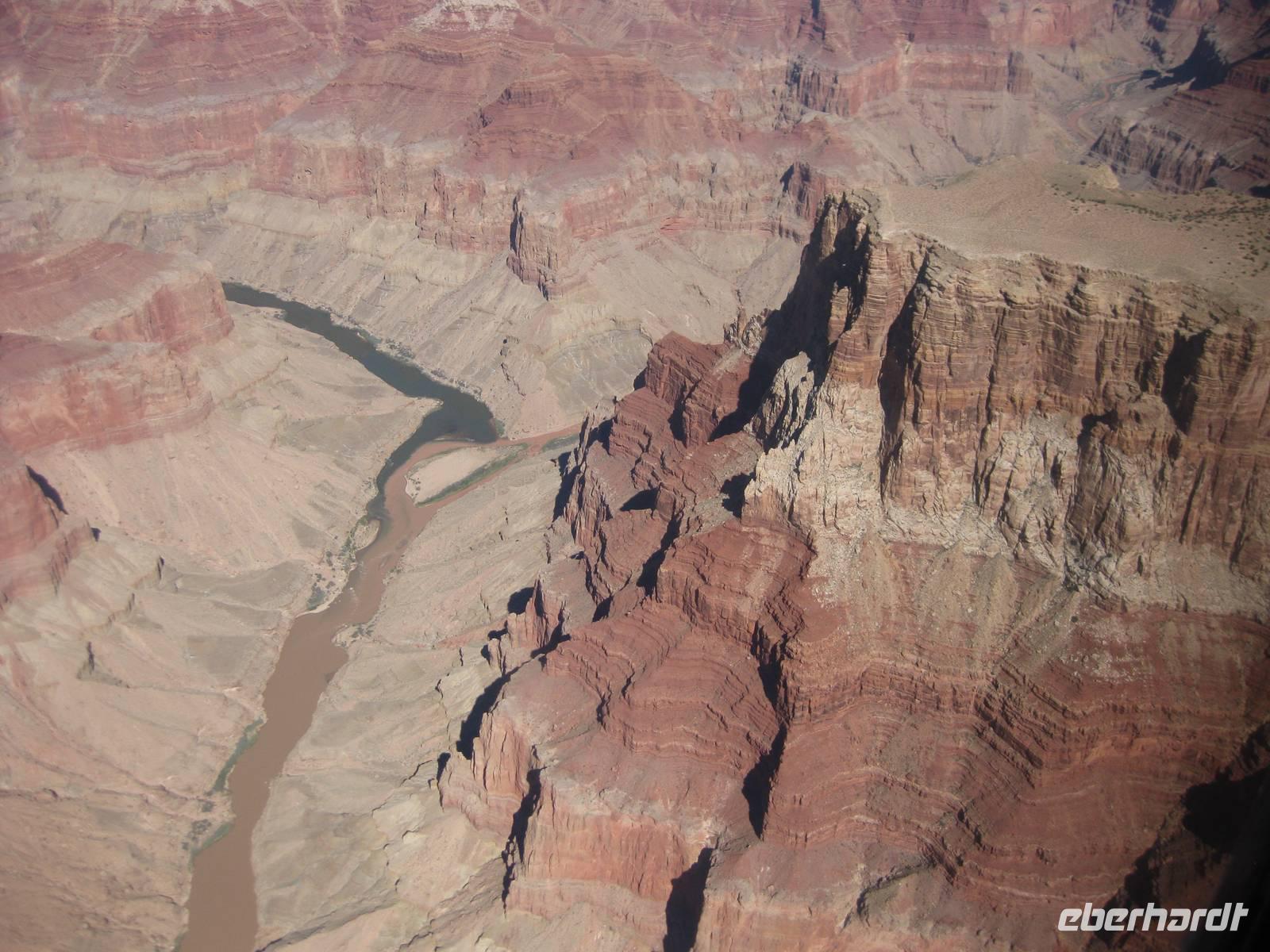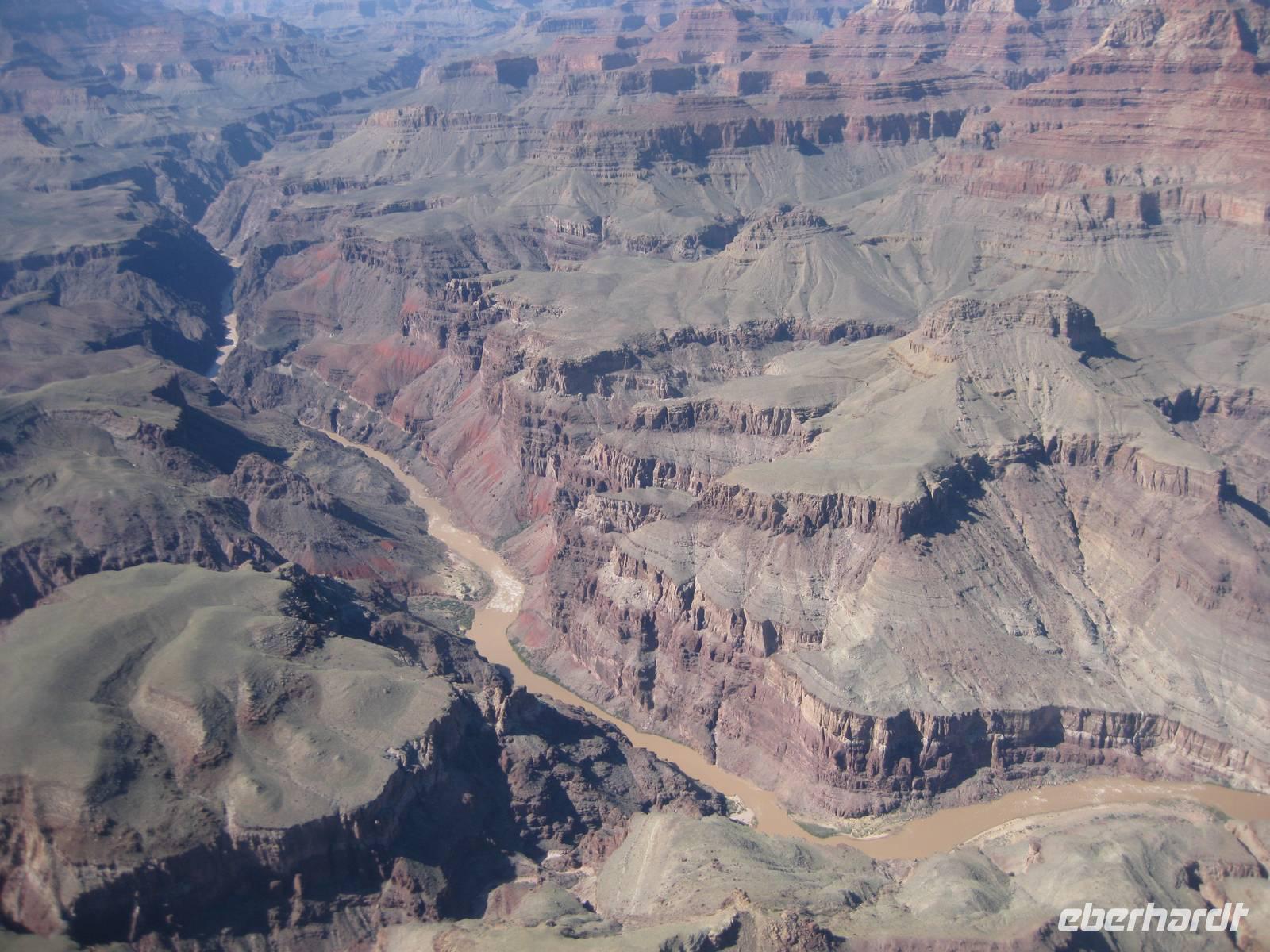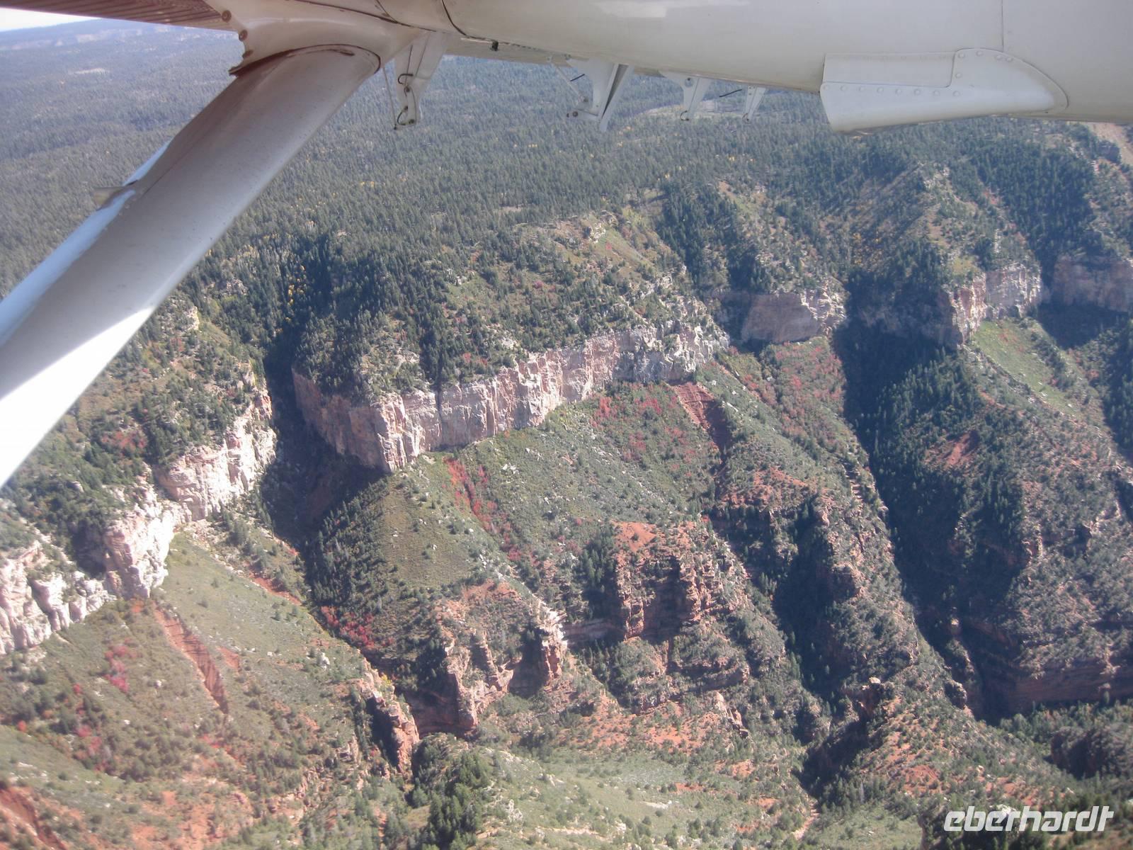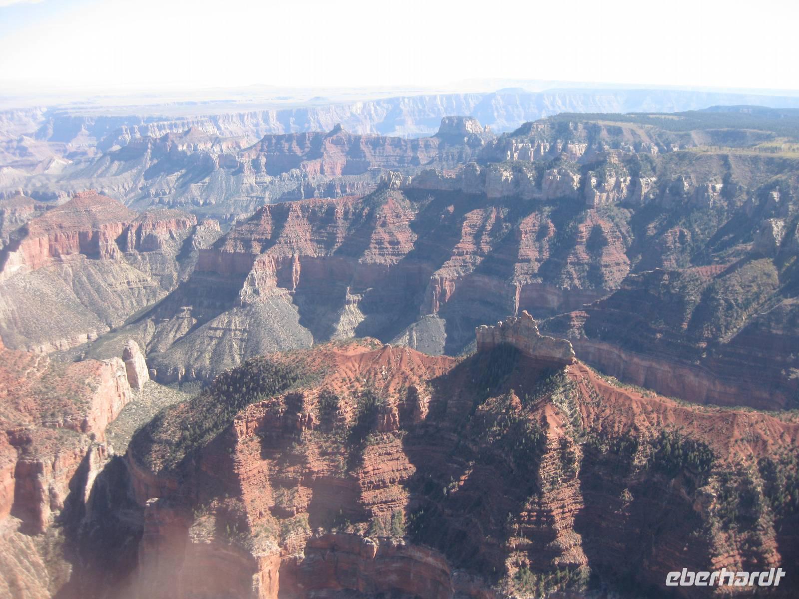 Wir anderen fahren zum Grand Canyon Airport, wo unser Rundflug bei bestem Flugwetter startet. Wir fliegen mit einem Kleinflugzeug der Grand Canyon Airlines, das extra für diese Rundflüge entwickelt und gebaut wurde. Es fliegt relativ langsam und in geringer Höhe und es hat besonders große Panoramafenster, damit alle Gäste gut sehen können. Wir sind ein wenig aufgeregt und gespannt. Dann geht es los und wir erheben uns in die Lüfte zum Flug über den Grand Canyon. Es ist ein ruhiger Flug trotz der geringen Höhe in der wir fliegen. Es ist faszinierend. Wir können tief in den Canyon hinein schauen und wir bekommen eine leise Ahnung von der Größe des Canyon - 450 Kilometer lang, 60 Kilometer breit und 1,5 Kilometer tief. Über Kopfhörer bekommen wir Informationen. Nach 40 Minuten landen wir wieder auf dem Flugplatz. Alle sind begeistert.