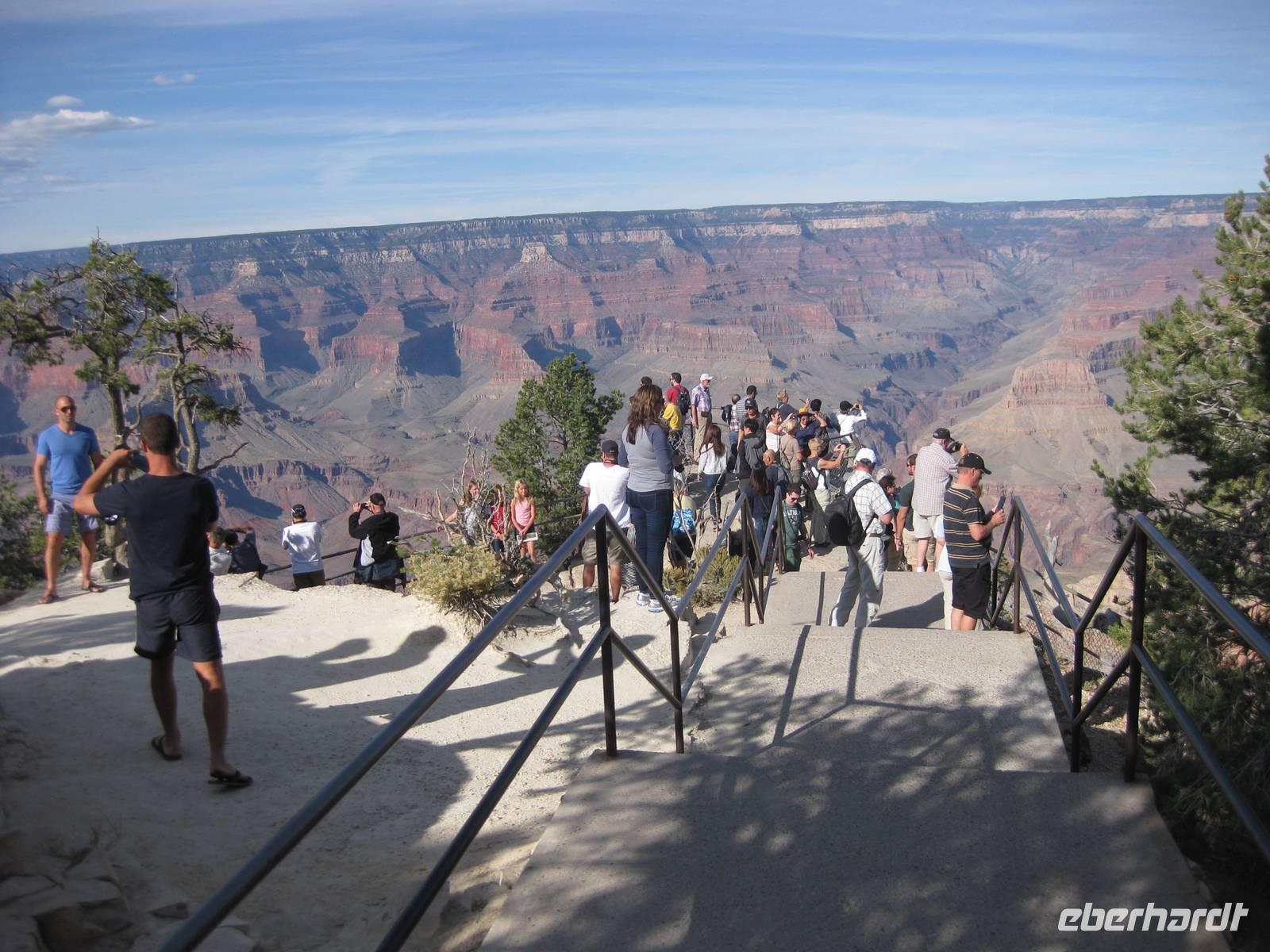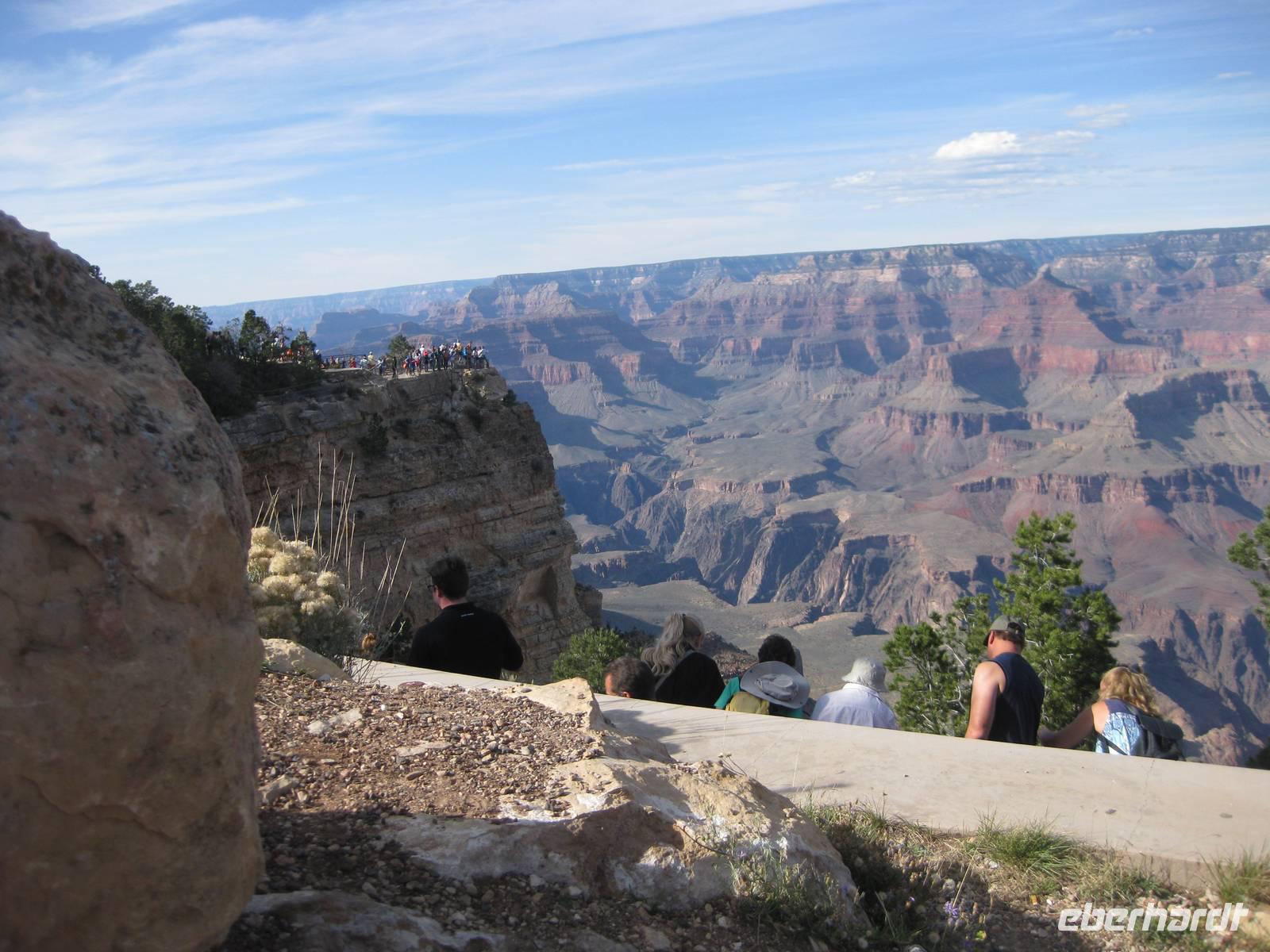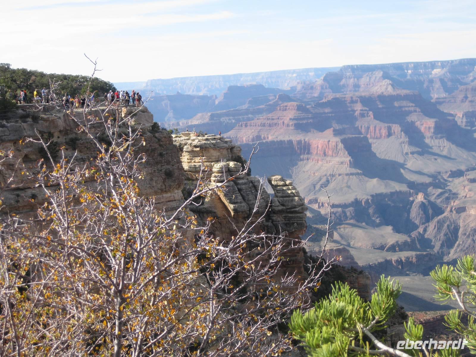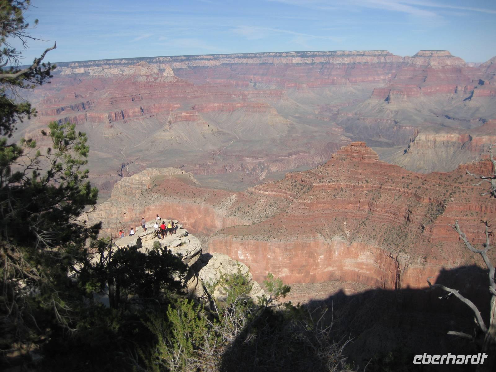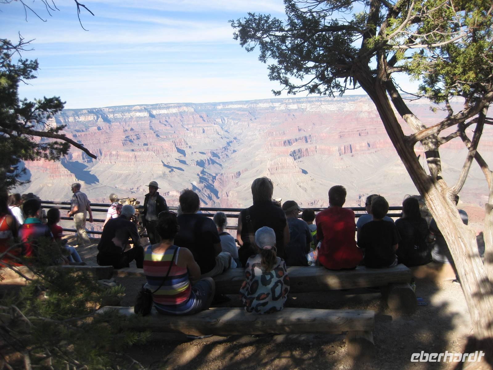 Nun treffen wir die anderen Gäste wieder und wir fahren zum Mather Point, wo wir zu einem Spaziergang an der Südkante des Grand Canyon entlang starten. Bevor wir starten müssen wir diesen Augenblick mit einem Gruppenfoto festhalten. Der Weg bietet viele spektakuläre Ausblicke, ist sehr bequem und super lehrreich gestaltet. Wir haben den Nachmittag dafür Zeit und können den Spaziergang so richtig genießen. An der Bright Angel Lodge treffen wir uns wieder und fahren zum Hotel Grand Canyon Plaza Resort, unweit vom Eingang zum Nationalpark. Zum gemeinsamen Abendessen treffen wir uns im Restaurant des Hotels und lassen dann diesen eindrucksvollen Tag ausklingen. Wir können es noch gar nicht ganz glauben, dass wir wirklich am Grand Canyon gestanden haben - und das auch noch bei herrlichstem Wetter.
