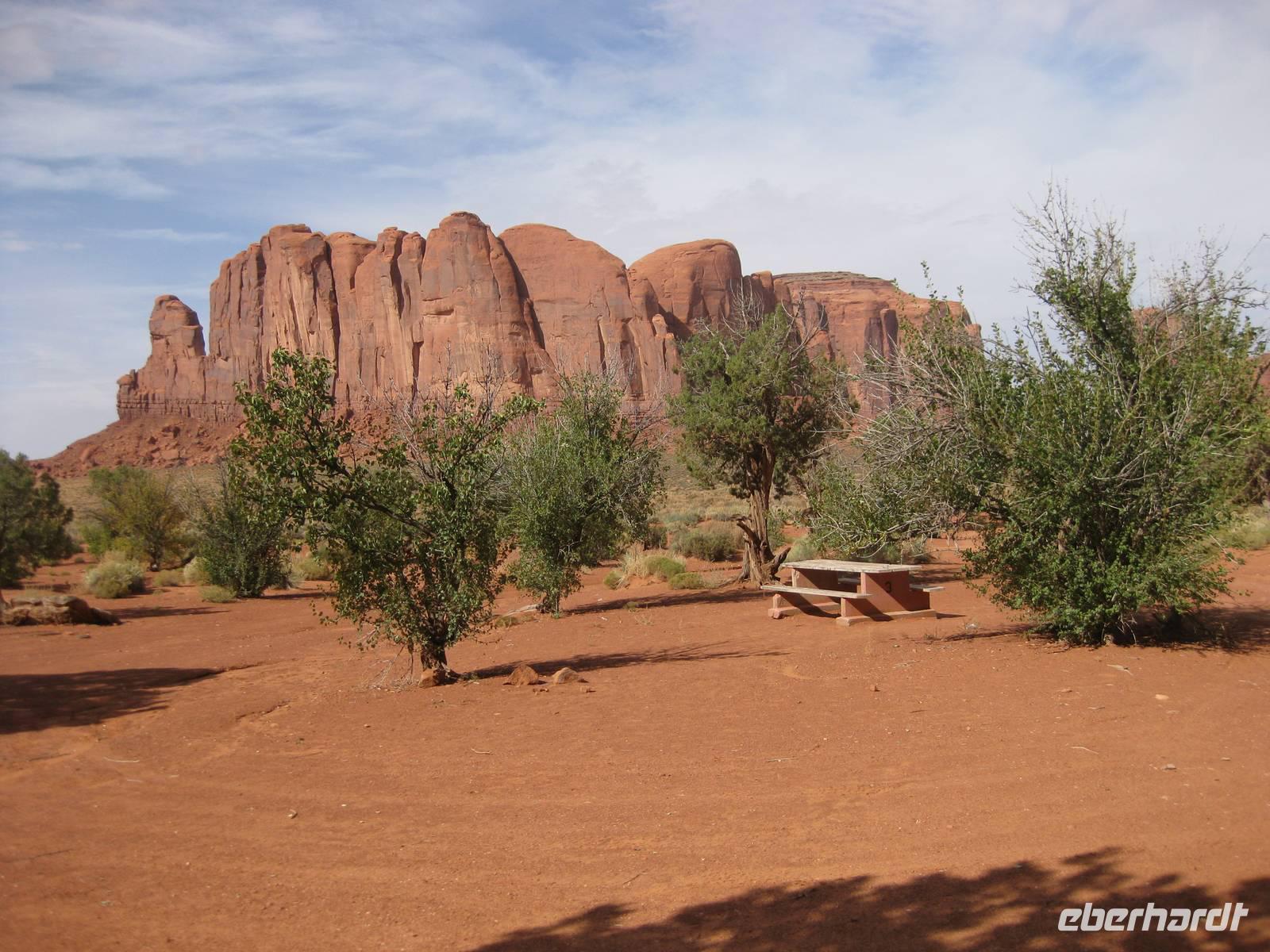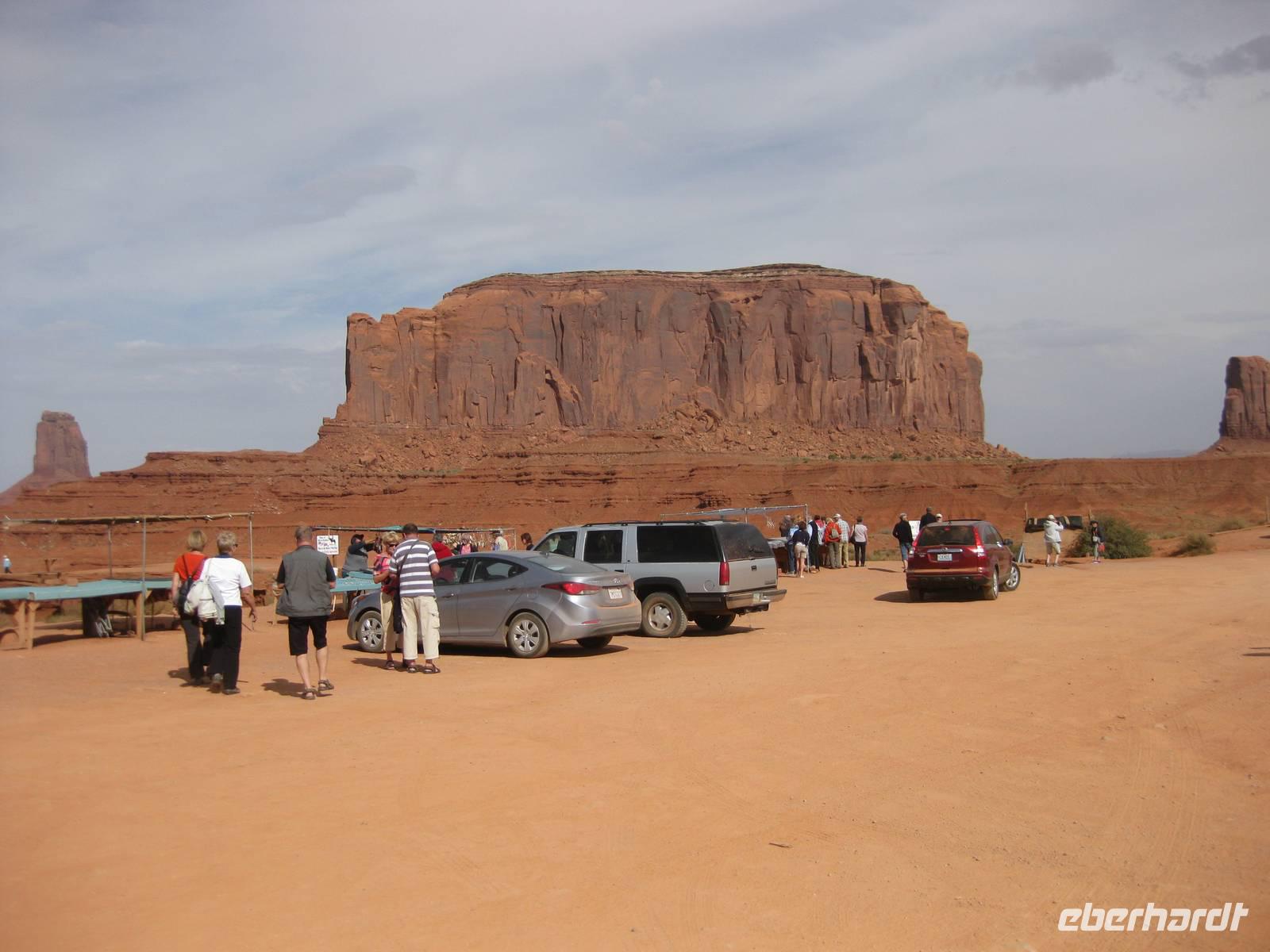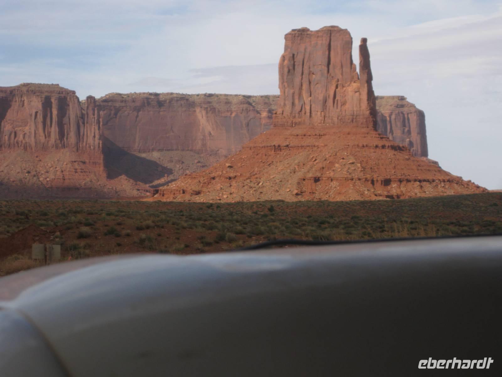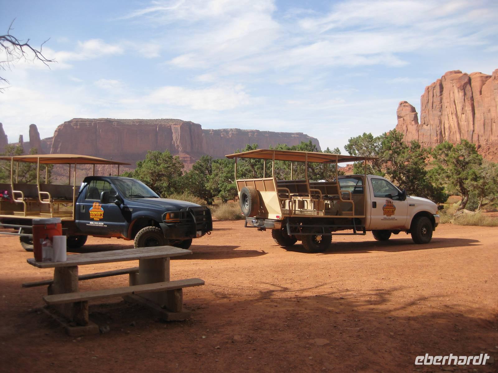 Gegen Mittag erreichen wir Monument Valley. Vom Visitor Center aus können wir schon einen ersten Blick auf die Felsen werfen. Wir besichtigen ein Holgan, Wohnhaus der Navajo-Indianer und dann steigen wir auf die allradgetriebenen Jeeps und machen eine Tour mit indianischer Führung durch das Monument Valley. Wir haben Glück, es ist nicht windig und auch nicht ganz soviel los, so dass es auch nicht so staubig ist. Im Tal am Fuß eines großen Felsens überraschen wir unsere Gäste mit einem indianischen Picknick. Dann setzen wir unsere Erkundungsfahrt durch das Monument Valley fort und bestaunen die Felsgebilde. Der Fantasie sind keine Grenzen gesetzt.
