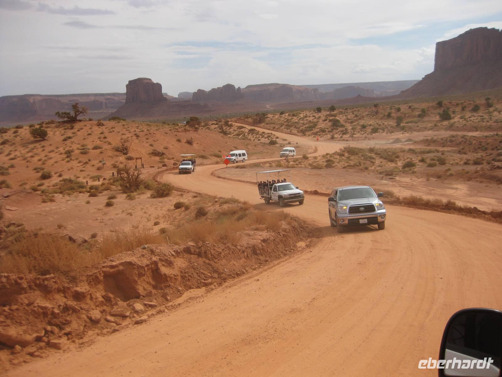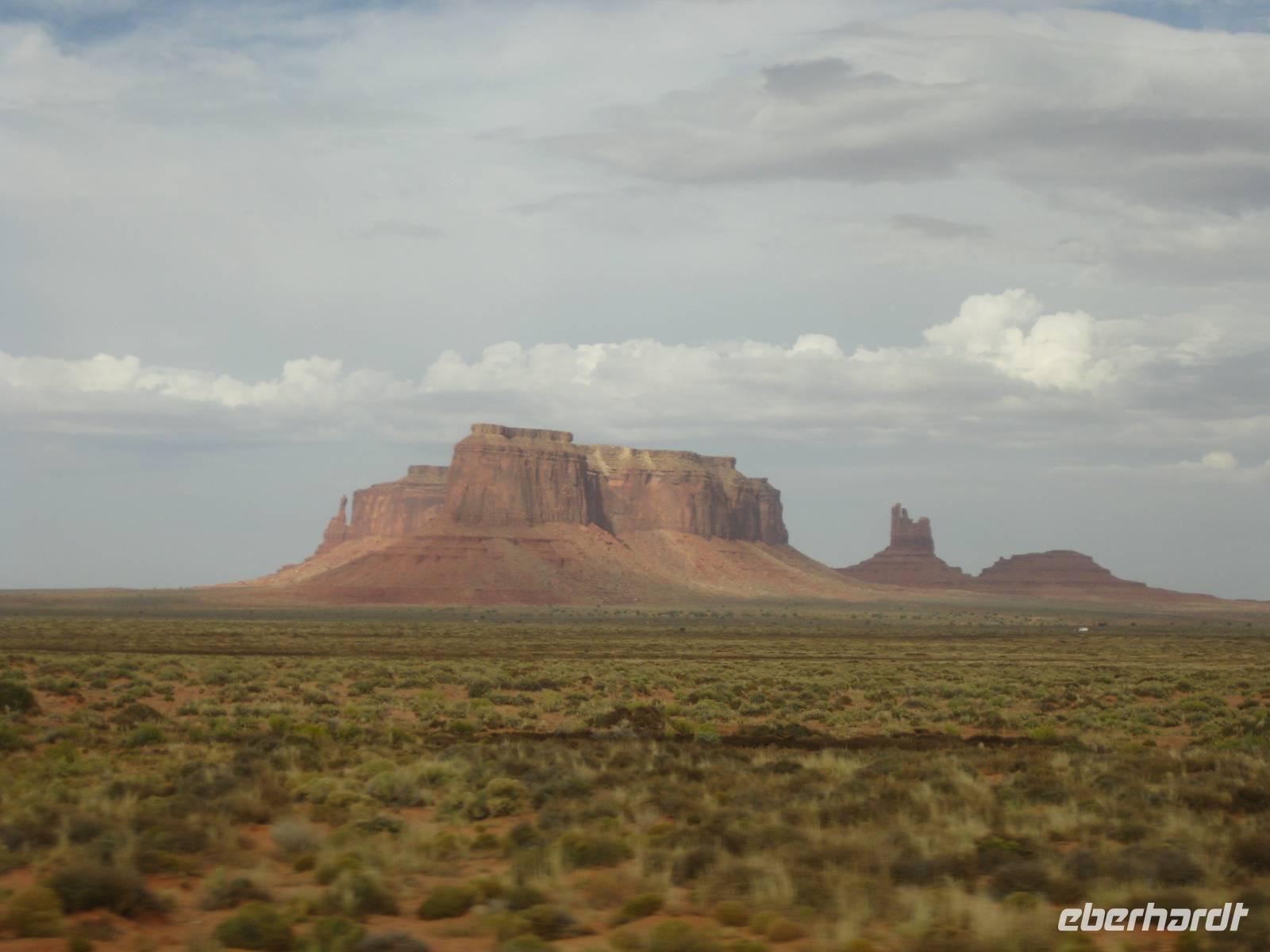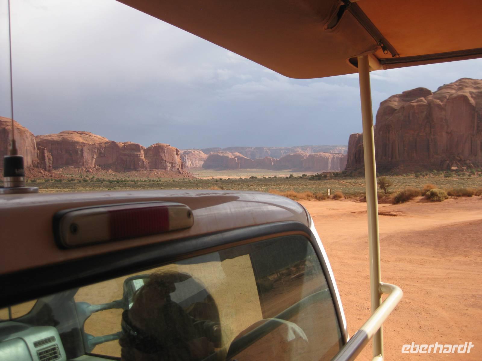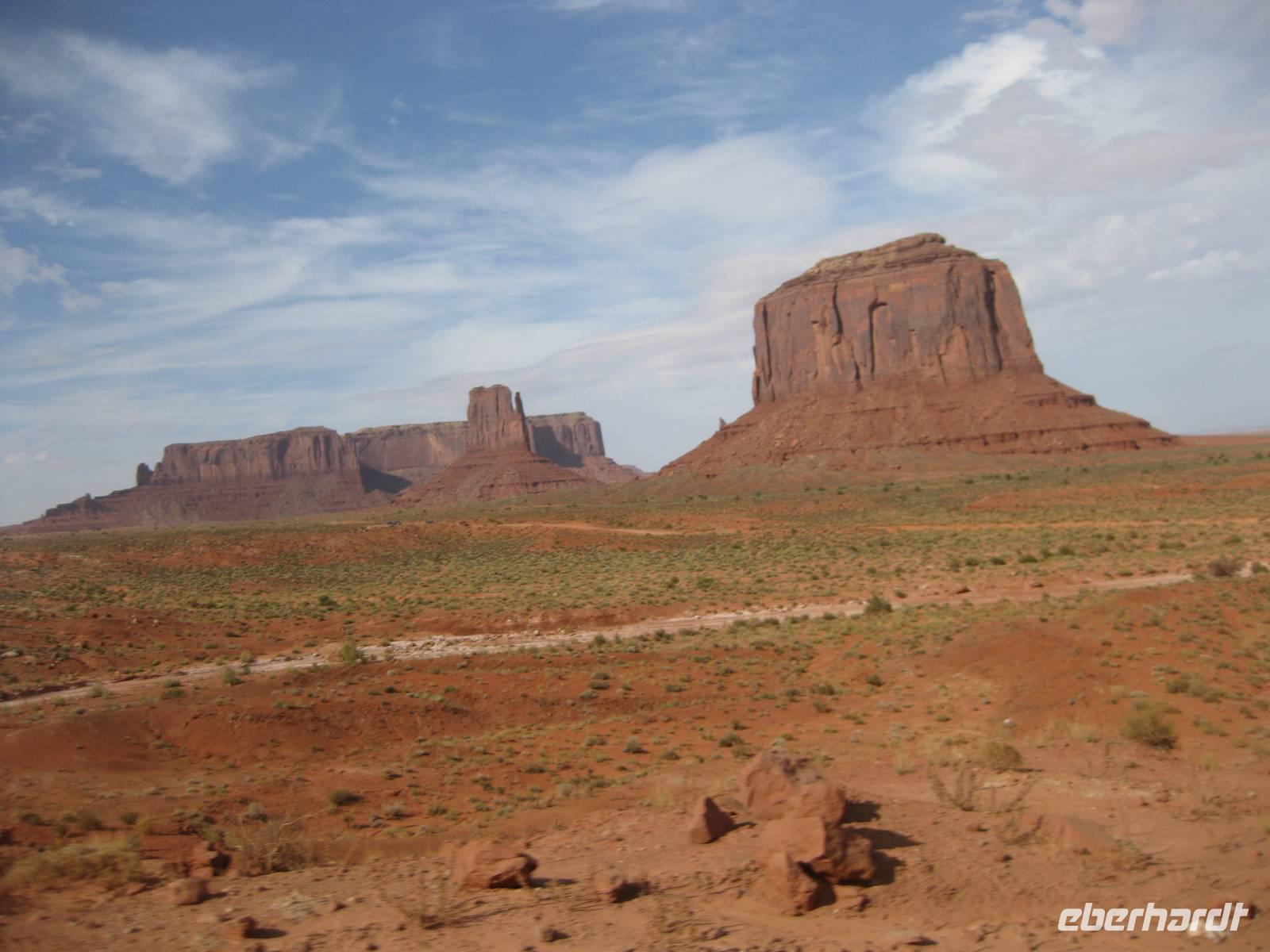 Gegen Mittag erreichen wir Monument Valley. Vom Visitor Center aus können wir schon einen ersten Blick auf die Felsen werfen. Wir besichtigen ein Holgan, Wohnhaus der Navajo-Indianer und dann steigen wir auf die allradgetriebenen Jeeps und machen eine Tour mit indianischer Führung durch das Monument Valley. Wir haben Glück, es ist nicht windig und auch nicht ganz soviel los, so dass es auch nicht so staubig ist. Im Tal am Fuß eines großen Felsens überraschen wir unsere Gäste mit einem indianischen Picknick. Dann setzen wir unsere Erkundungsfahrt durch das Monument Valley fort und bestaunen die Felsgebilde. Der Fantasie sind keine Grenzen gesetzt.