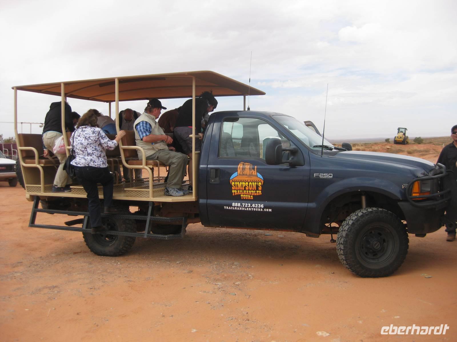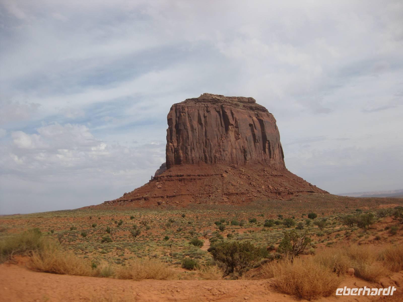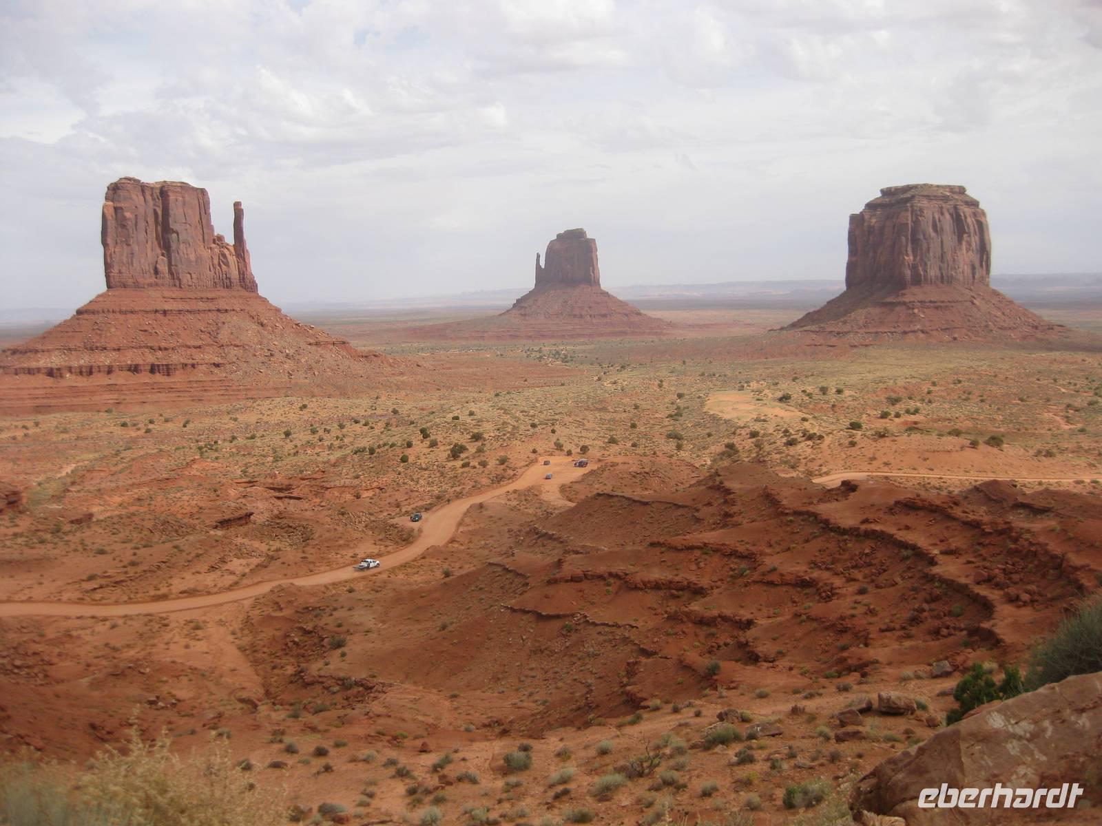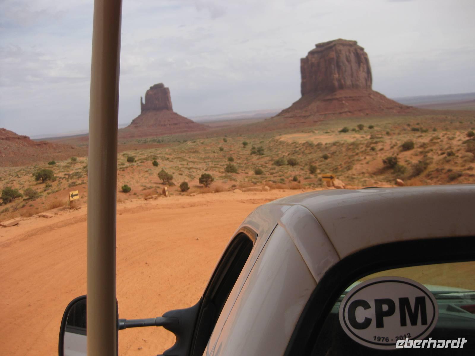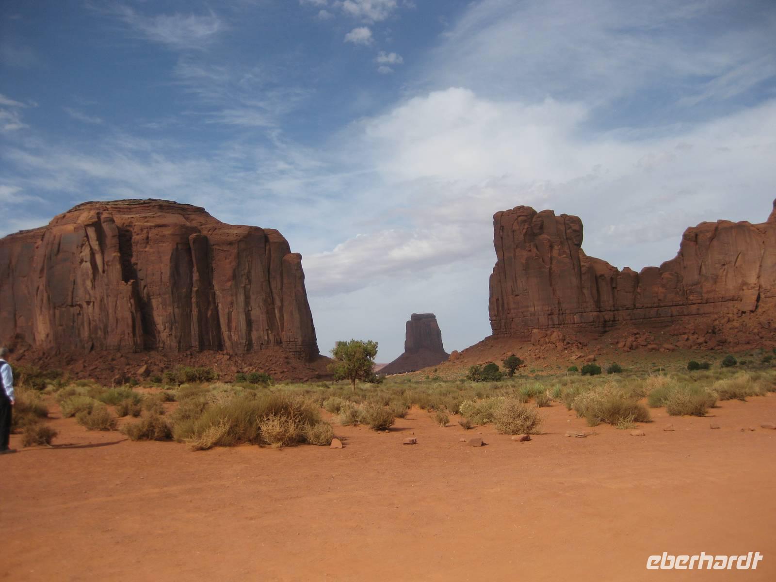 Gegen Mittag erreichen wir Monument Valley. Vom Visitor Center aus können wir schon einen ersten Blick auf die Felsen werfen. Wir besichtigen ein Holgan, Wohnhaus der Navajo-Indianer und dann steigen wir auf die allradgetriebenen Jeeps und machen eine Tour mit indianischer Führung durch das Monument Valley. Wir haben Glück, es ist nicht windig und auch nicht ganz soviel los, so dass es auch nicht so staubig ist. Im Tal am Fuß eines großen Felsens überraschen wir unsere Gäste mit einem indianischen Picknick. Dann setzen wir unsere Erkundungsfahrt durch das Monument Valley fort und bestaunen die Felsgebilde. Der Fantasie sind keine Grenzen gesetzt.