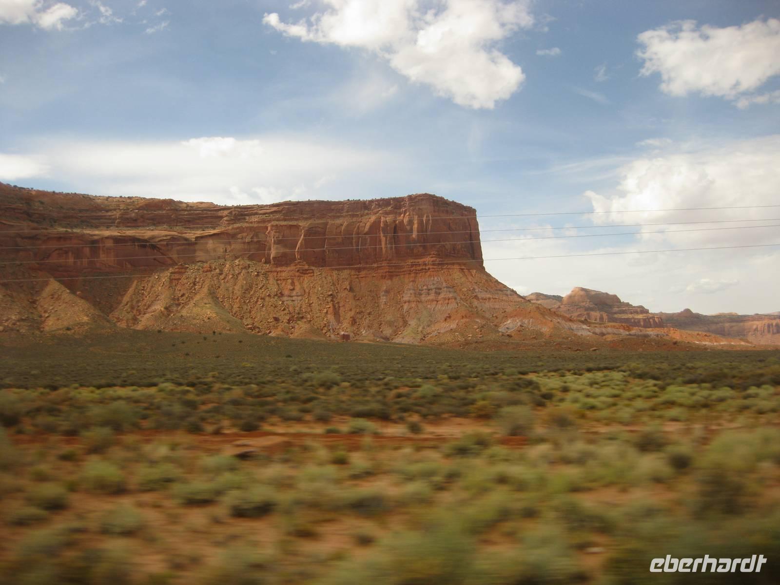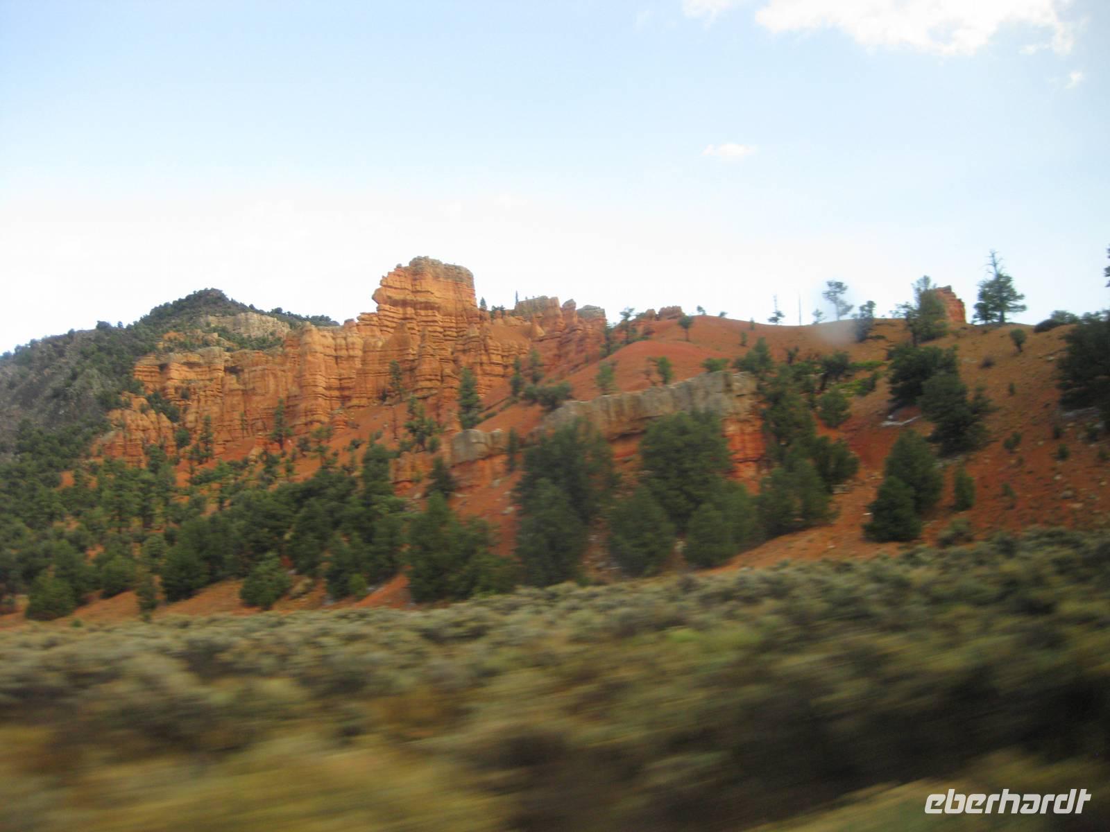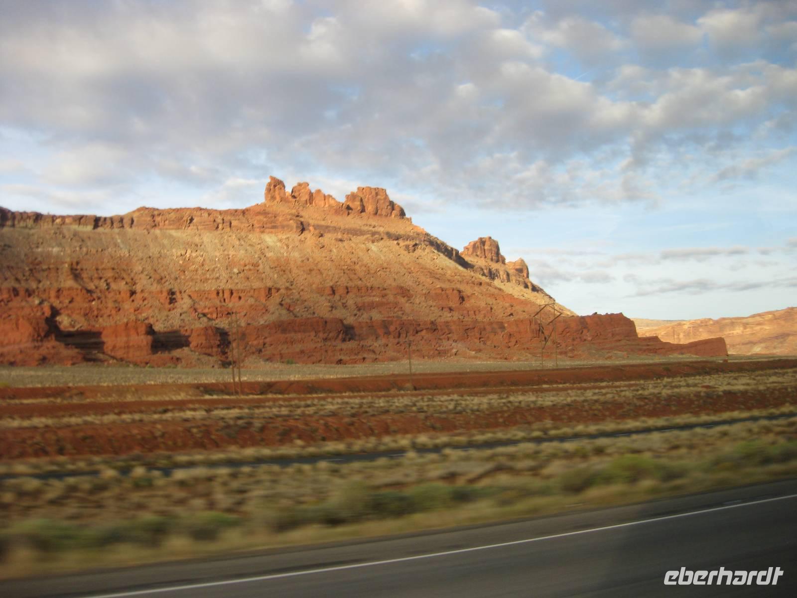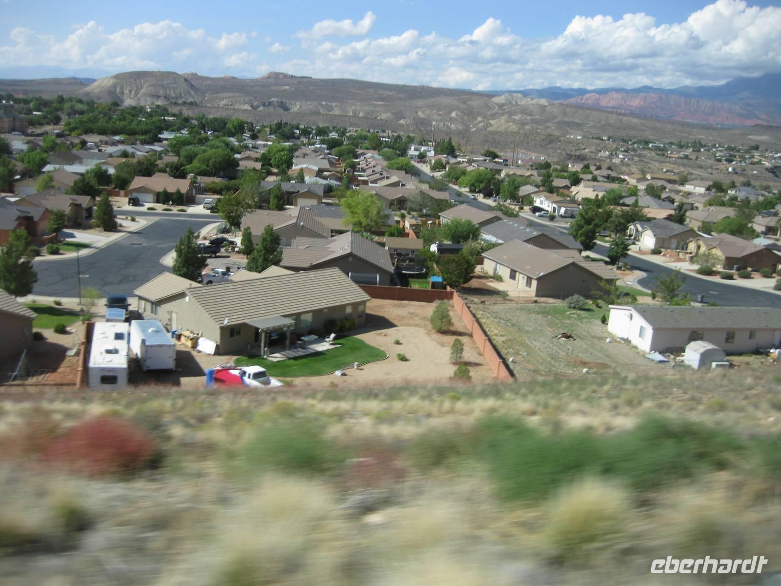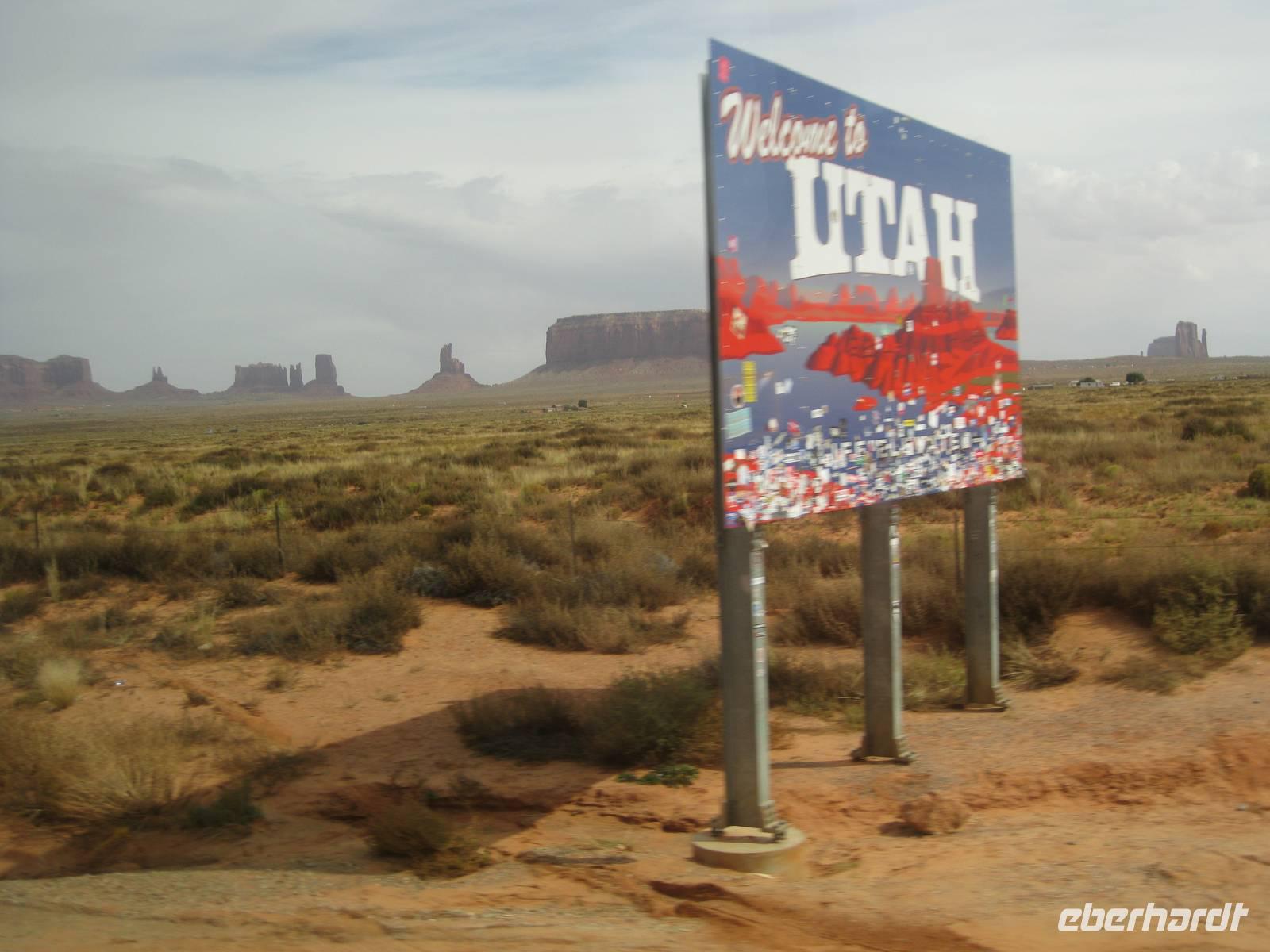 Auf der Fahrt sehen wir schon einzelne Felsgebilde aus rotem Navajo-Sandstein, ähnlich wie die im Monument Valley. Und dann sind wir auch schon im Bundesstaat Utah. Hier leben sehr viele Mormonen.