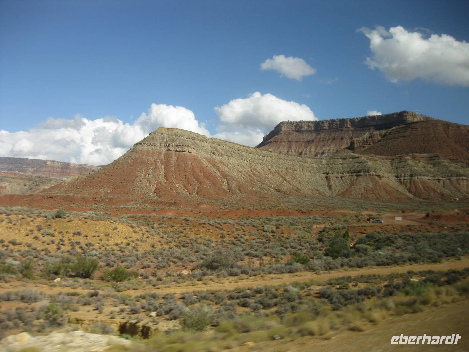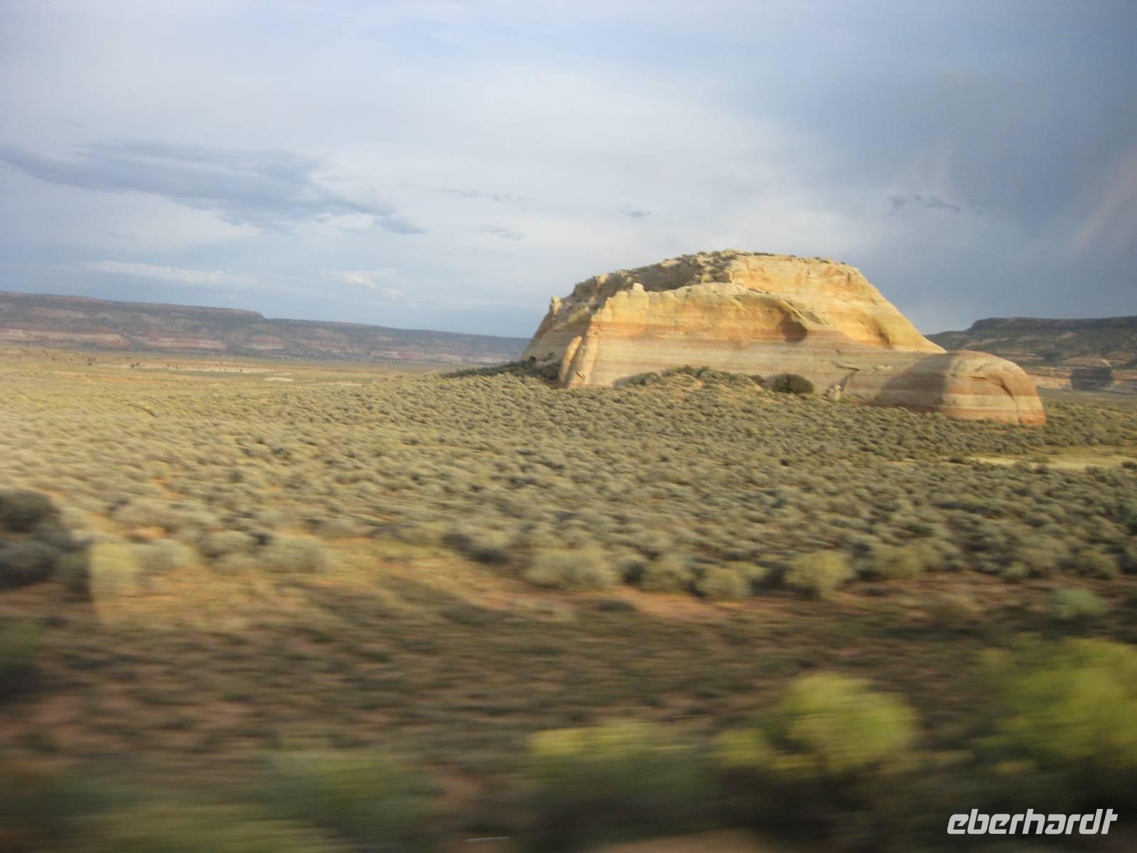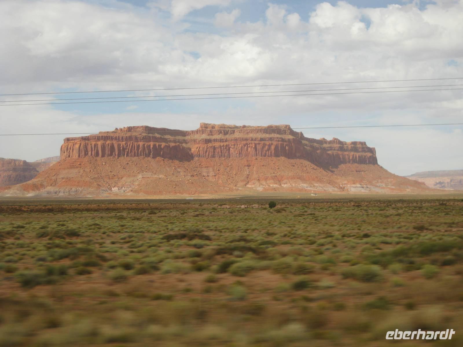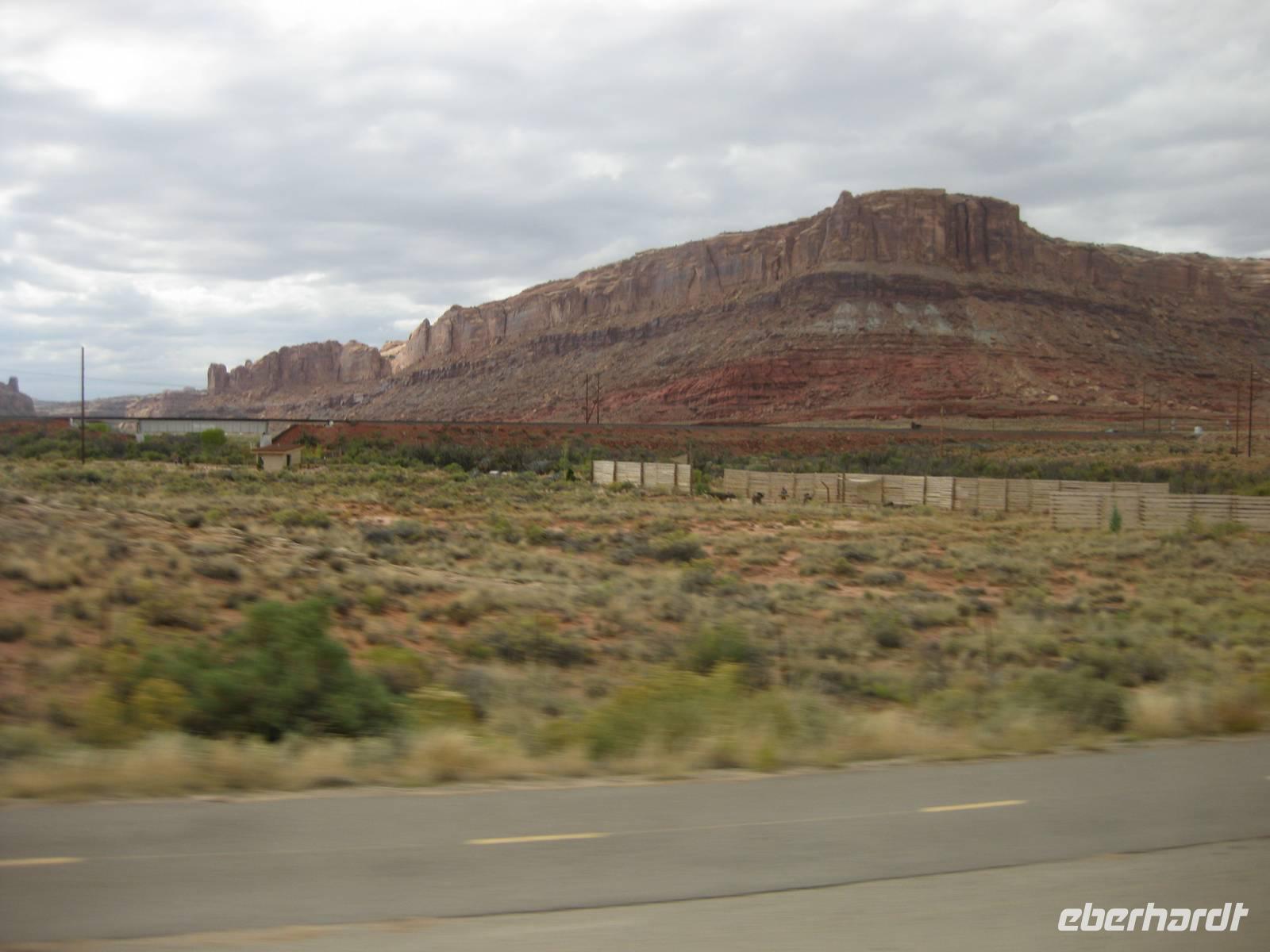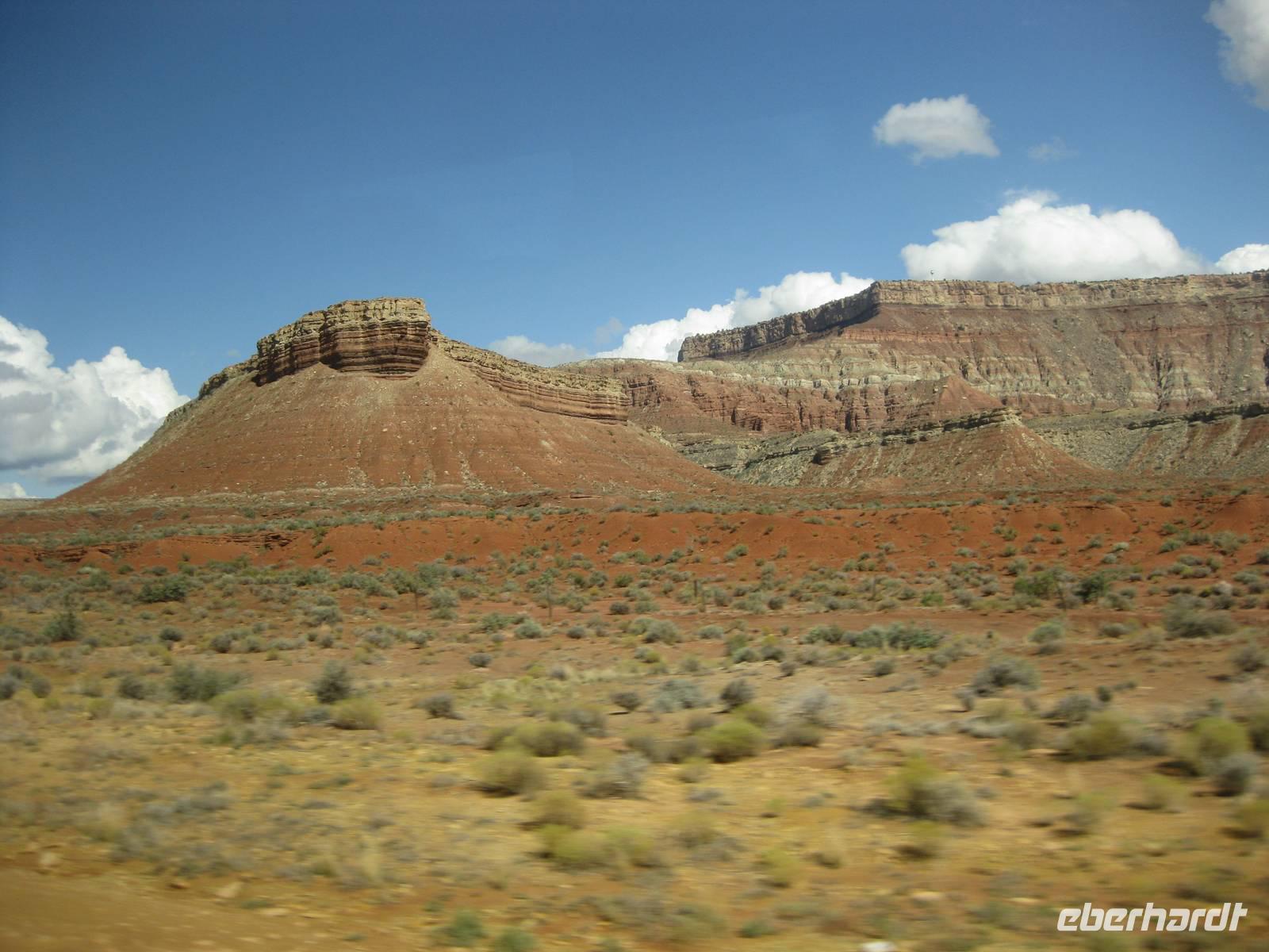 Auf der Fahrt sehen wir schon einzelne Felsgebilde aus rotem Navajo-Sandstein, ähnlich wie die im Monument Valley. Und dann sind wir auch schon im Bundesstaat Utah. Hier leben sehr viele Mormonen.