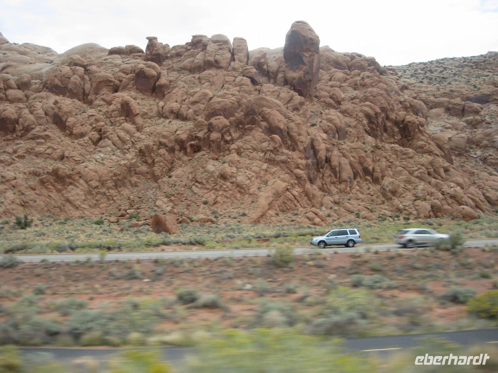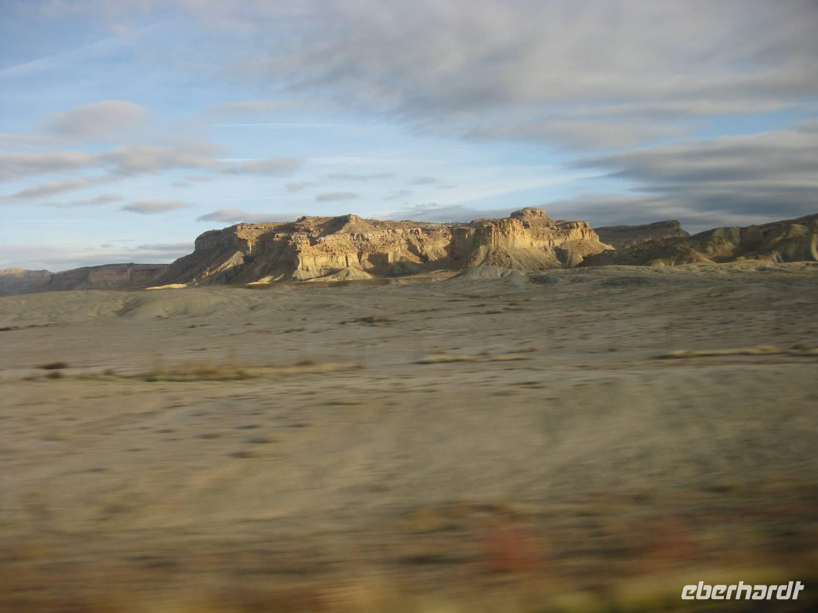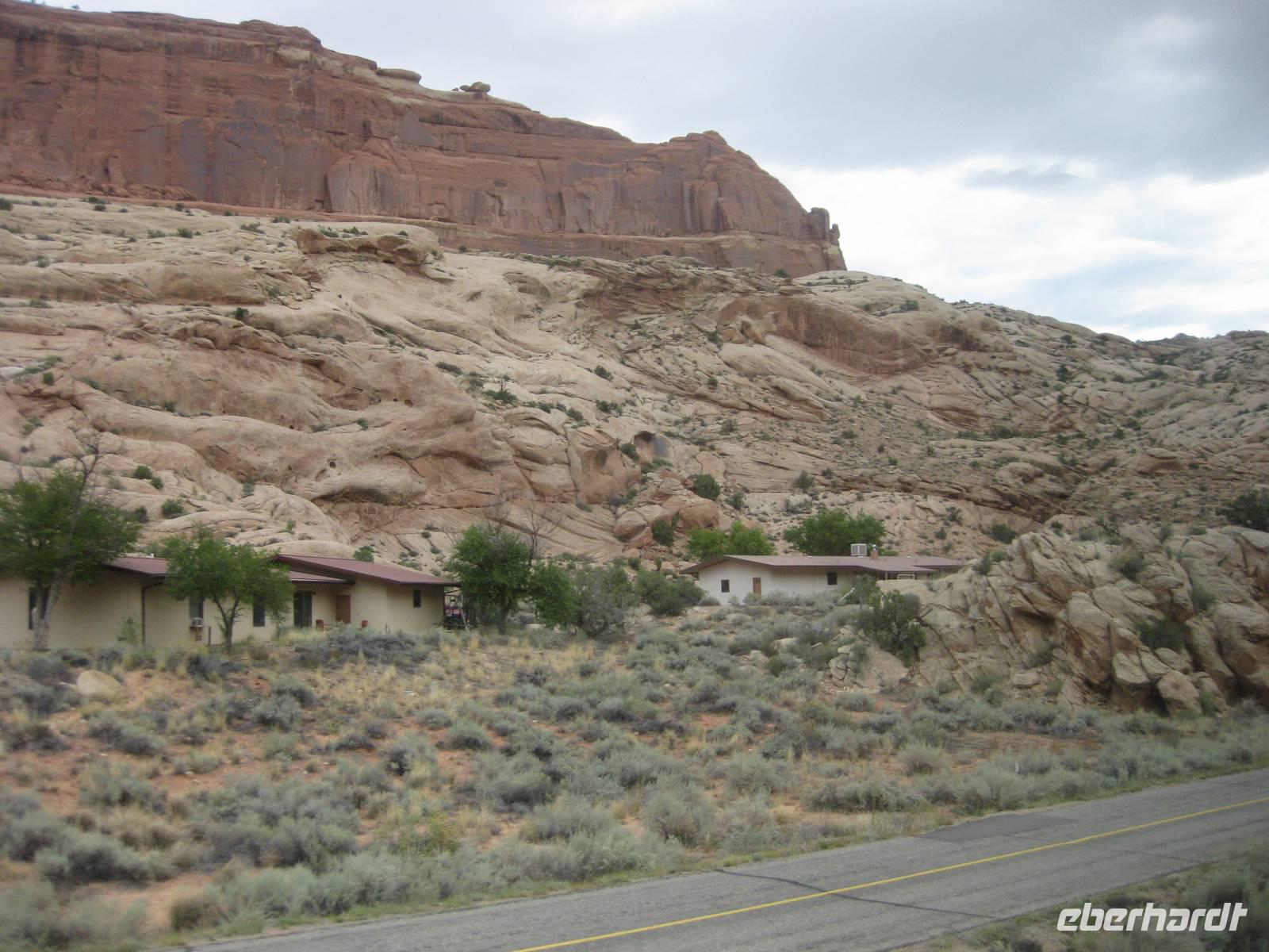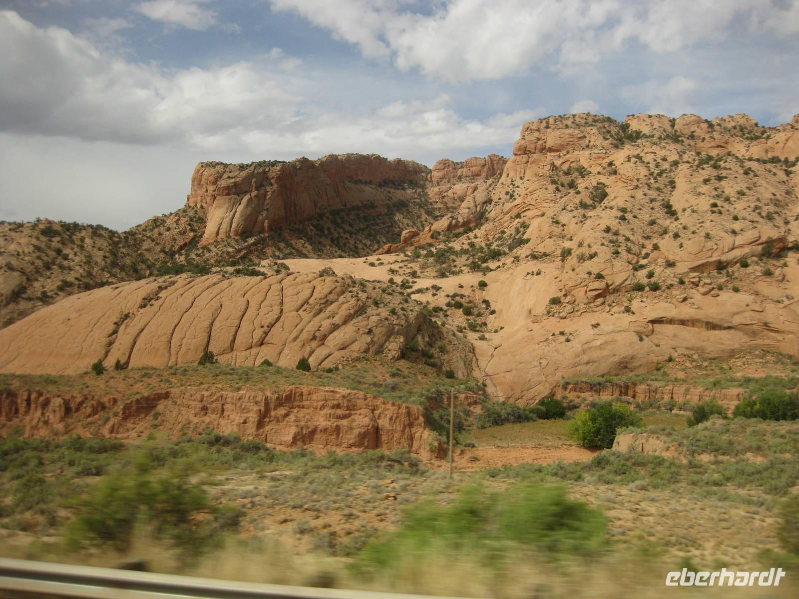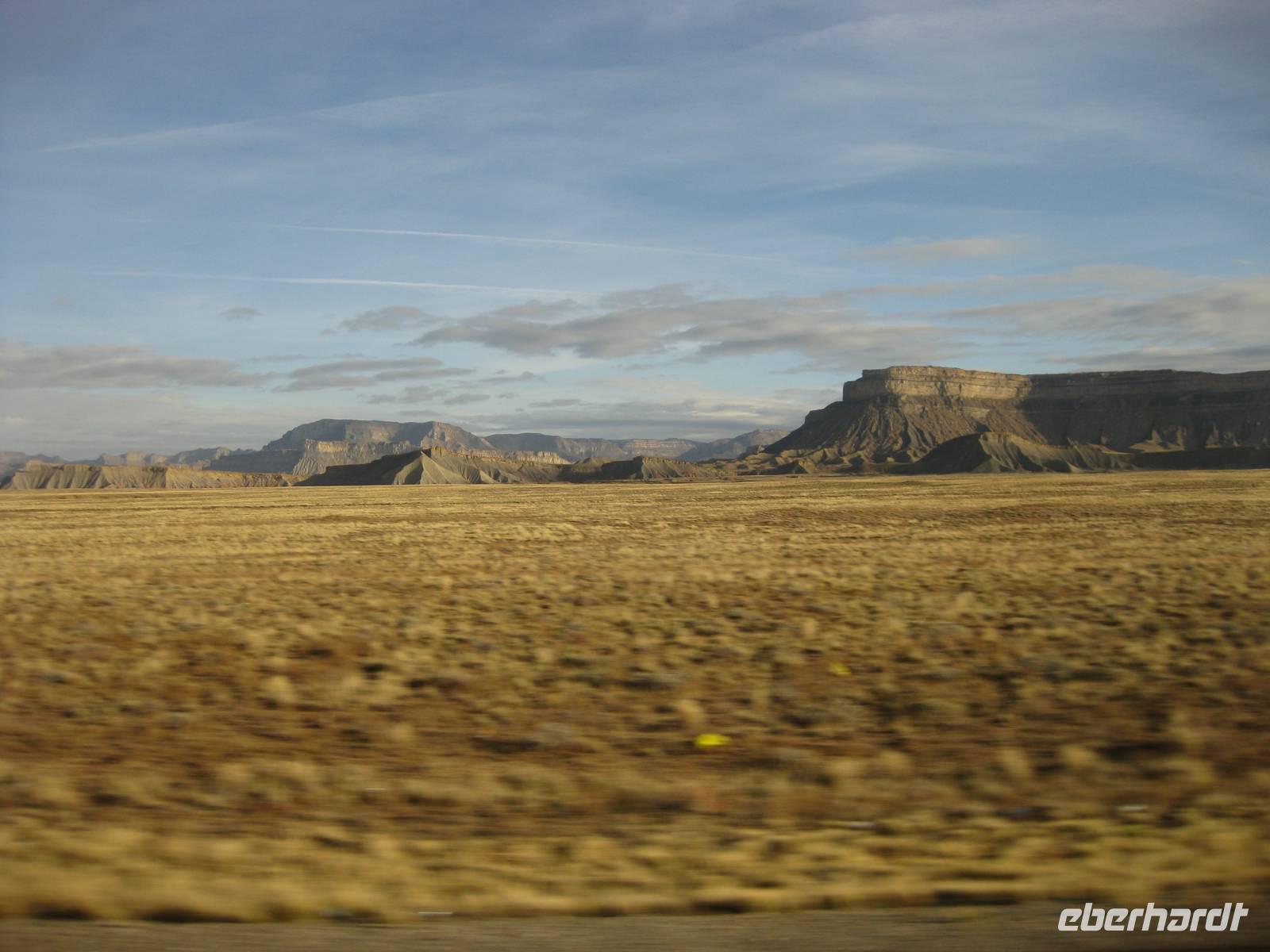 Auf der Fahrt sehen wir schon einzelne Felsgebilde aus rotem Navajo-Sandstein, ähnlich wie die im Monument Valley. Und dann sind wir auch schon im Bundesstaat Utah. Hier leben sehr viele Mormonen.