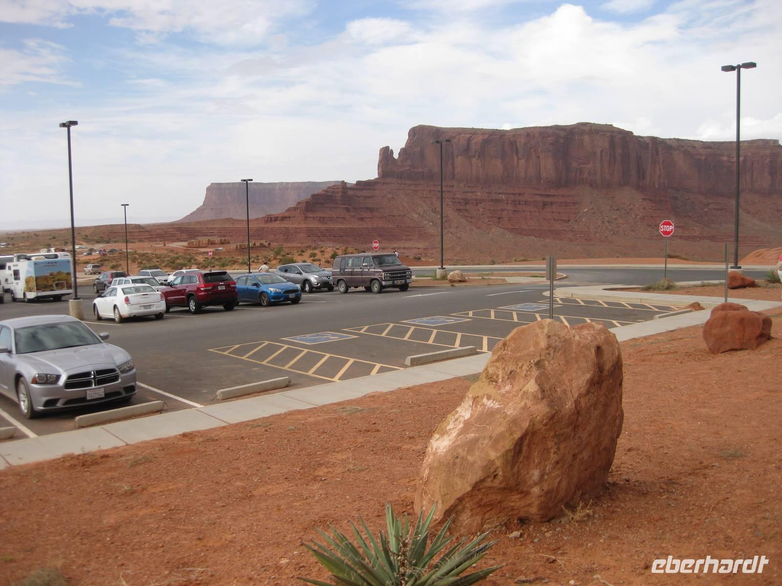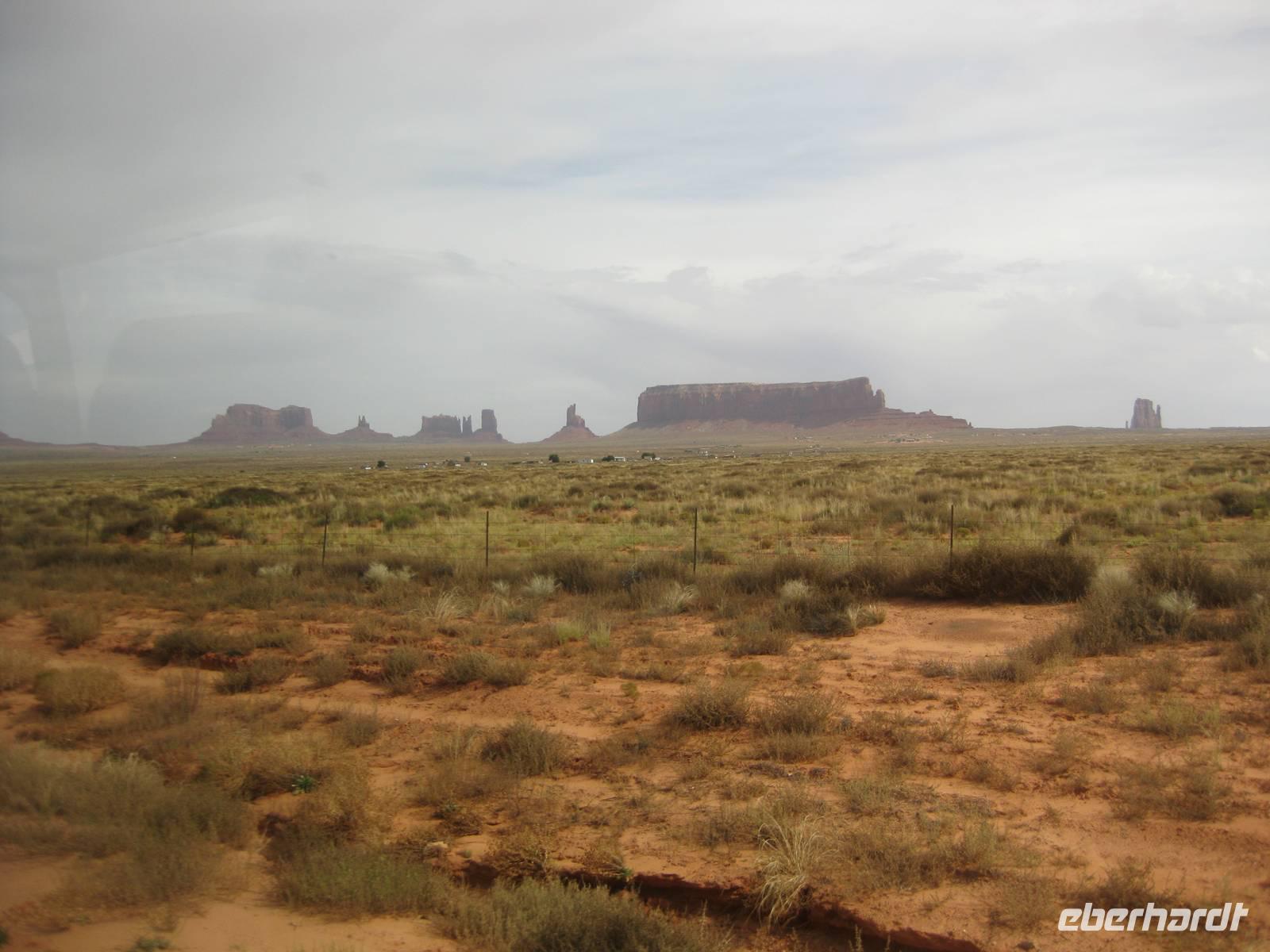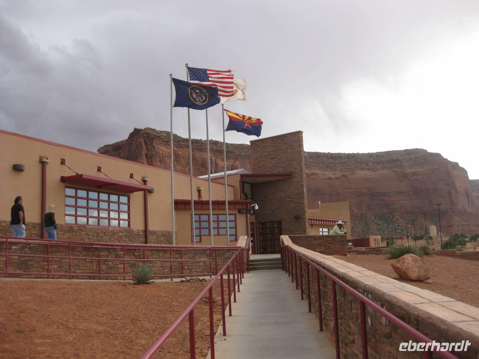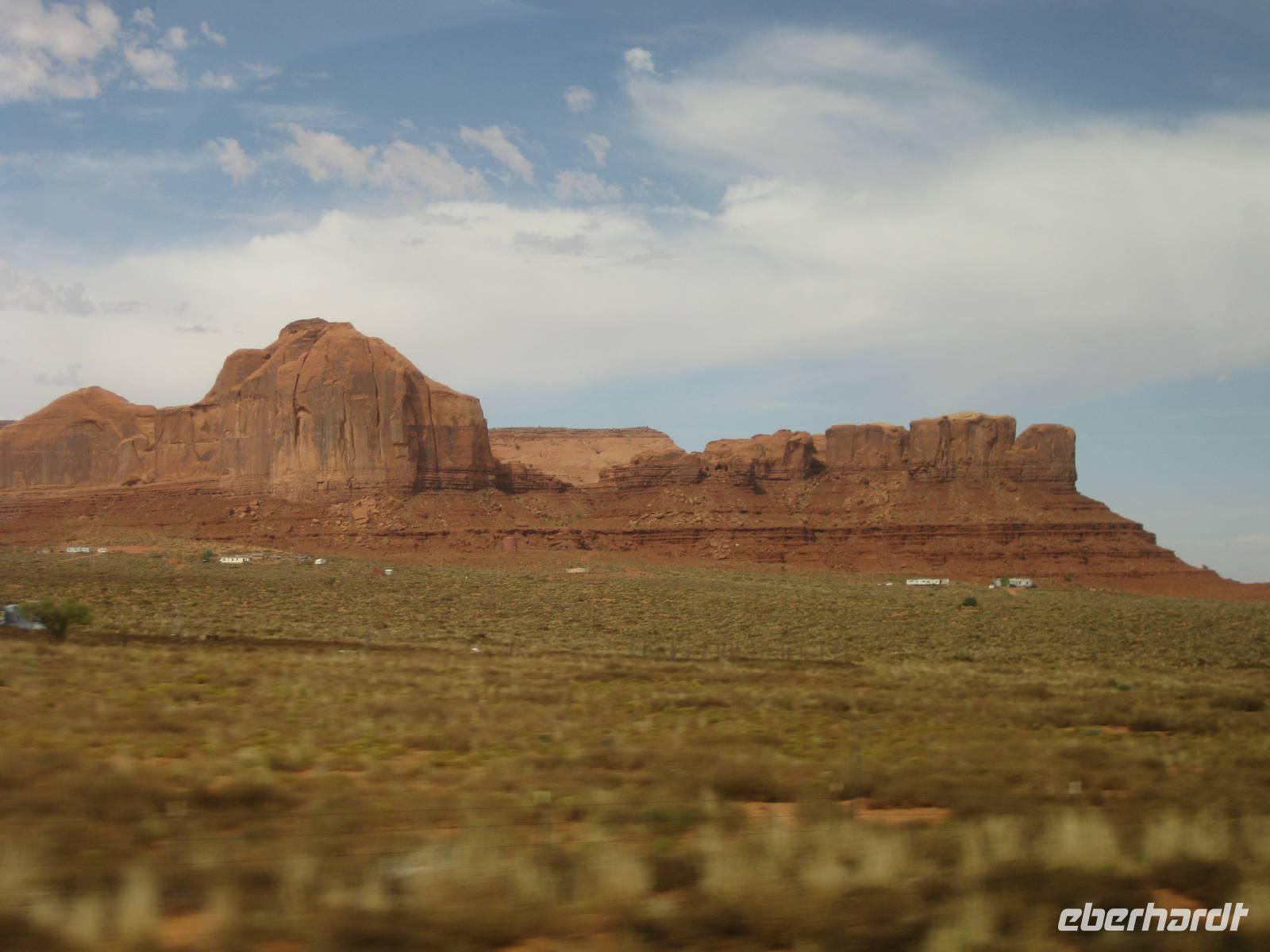 Unser nächstes Ziel ist heute das Monument Valley. Die Fahrt dorthin führt uns durch Indianerland. Hier leben die Navajo-Indianer in großen Reservaten. Wir kommen an dem modernen Inianerdorf Kayenta vorbei und dann sind es nur noch 30 Minuten bis zum Monument Valley. Janny erzählt uns vom Leben der Indianer. Wir sehen eine Gruppe Indianer mit ihren Pferden.