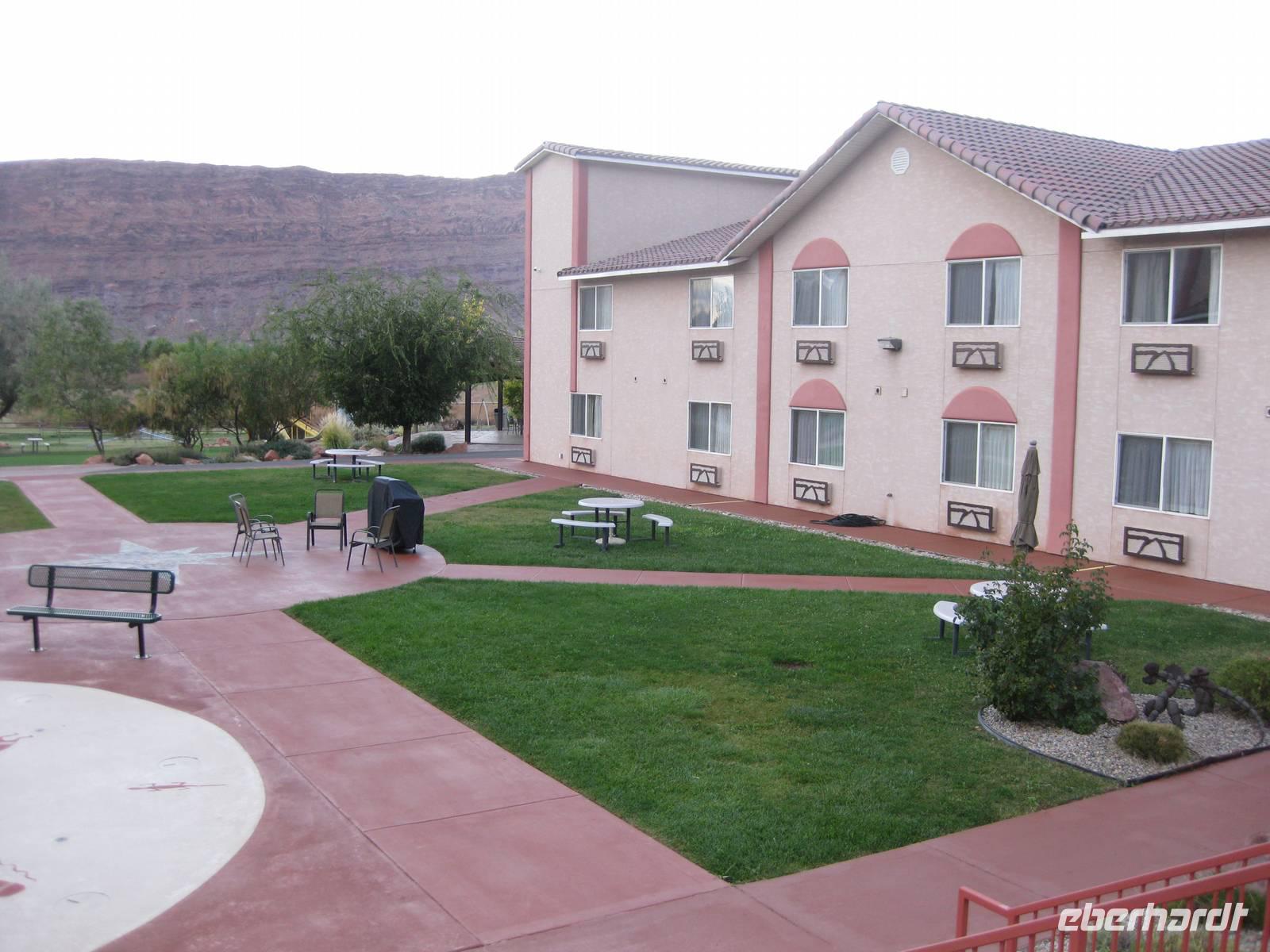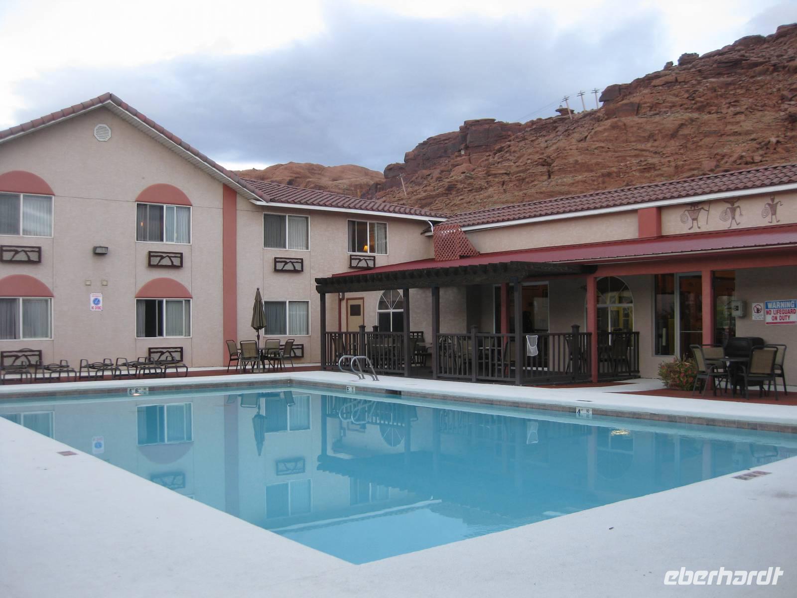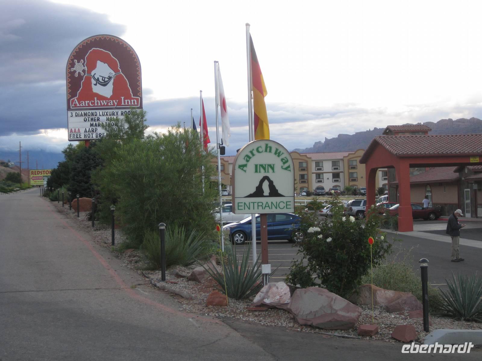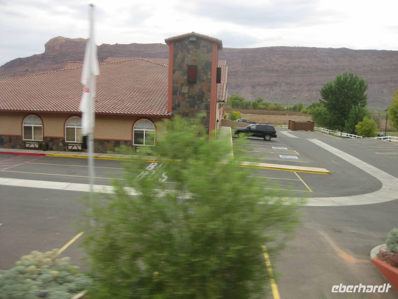 Am Nachmittag fahren wir weiter durch Wüstenlandschaft bis nach Moab. Wir fahren jetzt durch den Mormonenstaat Utah und Janny erzählt uns über die Mormonen. Das ist wichtig, um einige Besonderheiten in Utah zu verstehen. Und wir sind ein paar Tage in Utah. Moab ist ein kleines sehr lebendiges Städtchen. Es hat sich zu einem neuen Zentrum sportlicher Aktivitäten wie Mountainbiking, Wandern und Klettern entwickelt. Am Abend erreichen wir unser Hotel Aarchway Inn am Stadtrand. Zum Abendessen fahren wir noch mal in die Stadt in das Restaurant der Brauerei Moab. Es gibt ein zünftiges Westernessen und natürlich müssen wir dort auch das einheimische Bier kosten.
