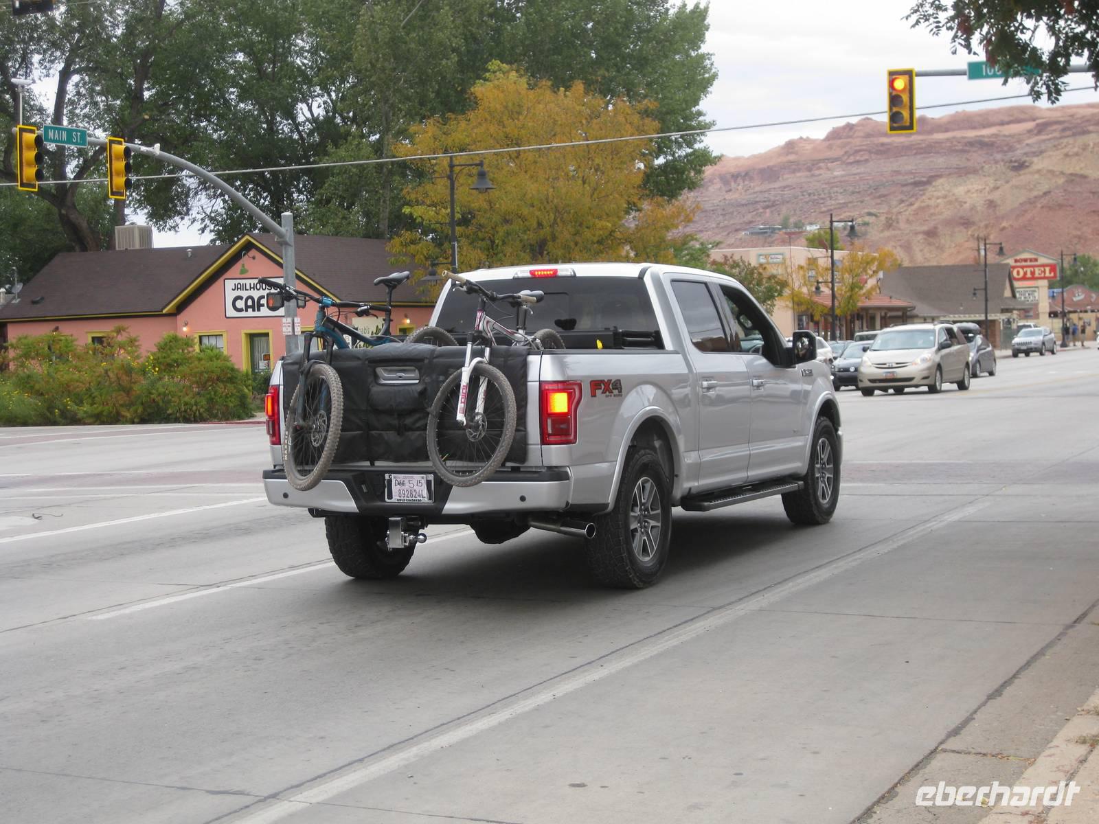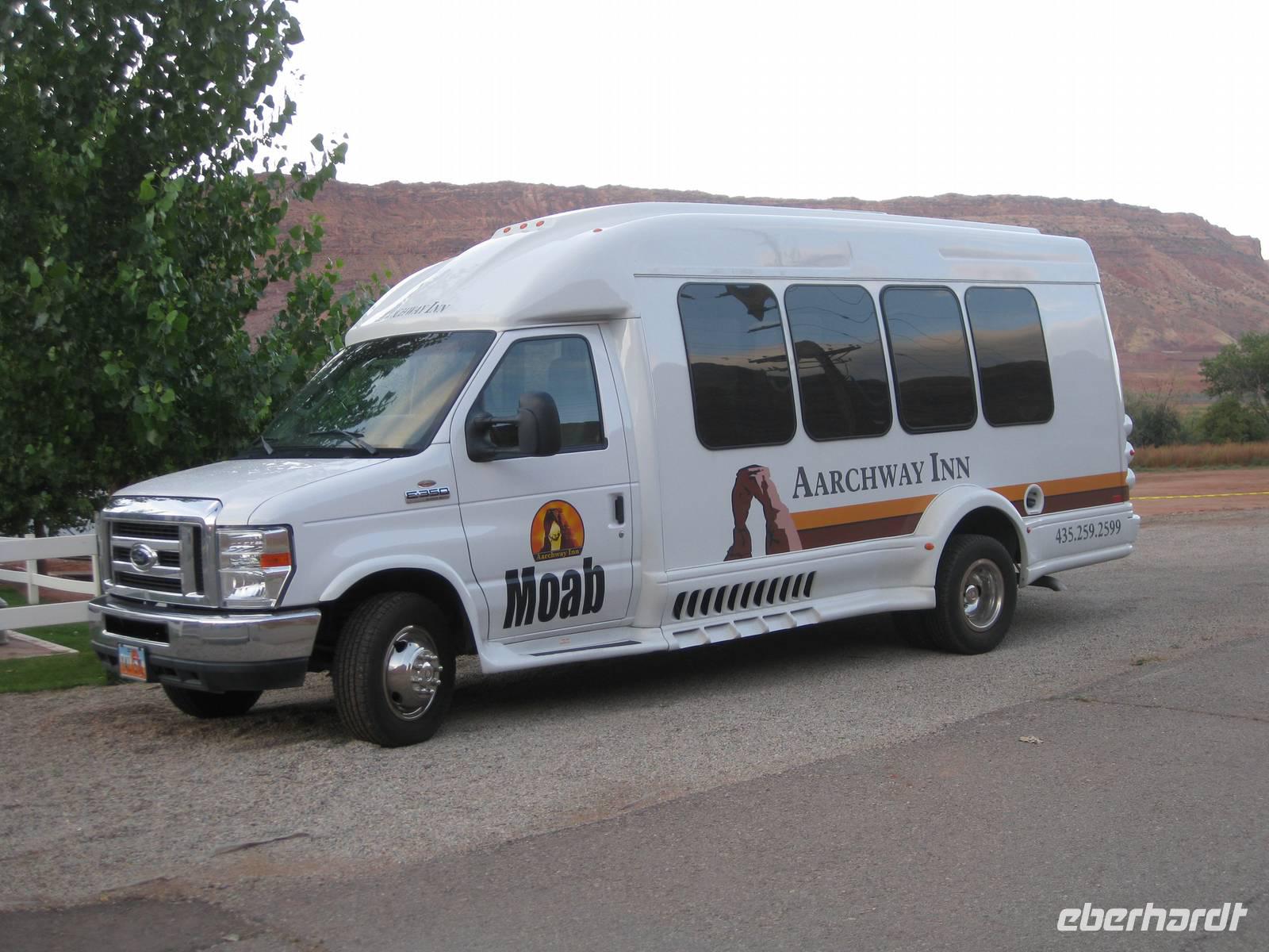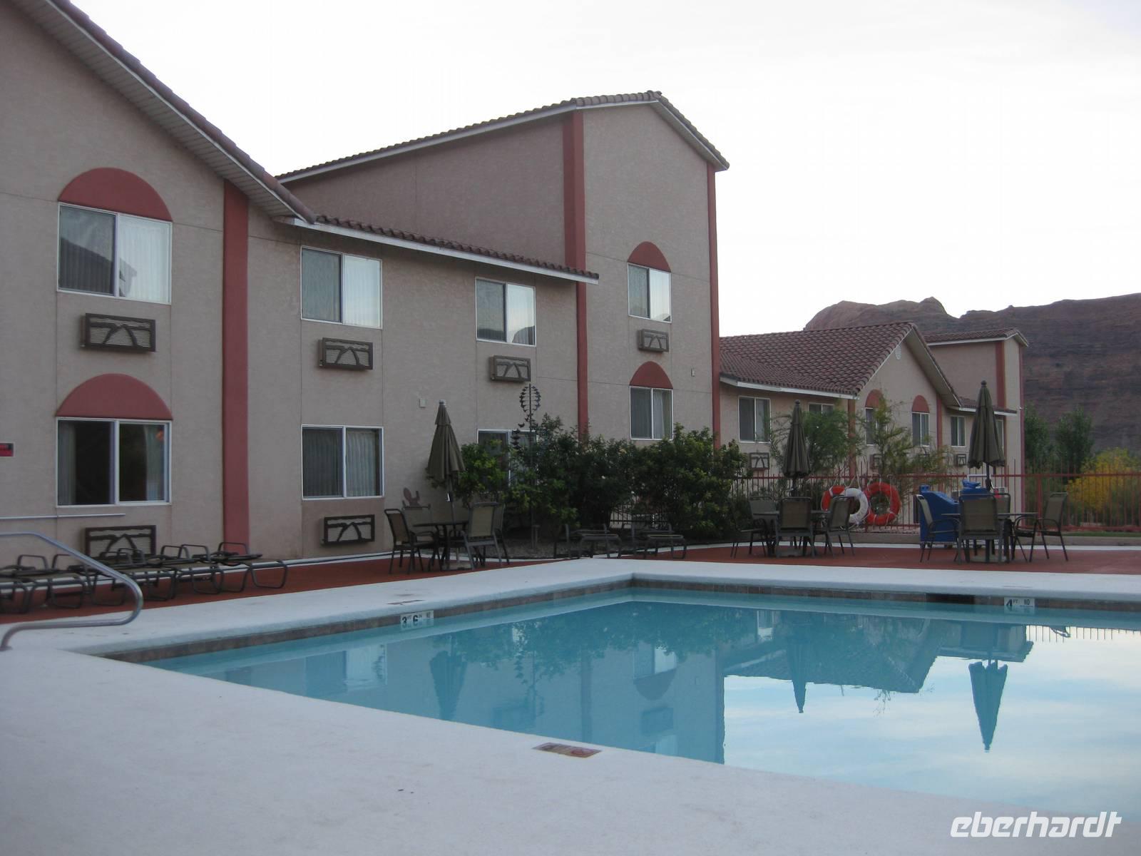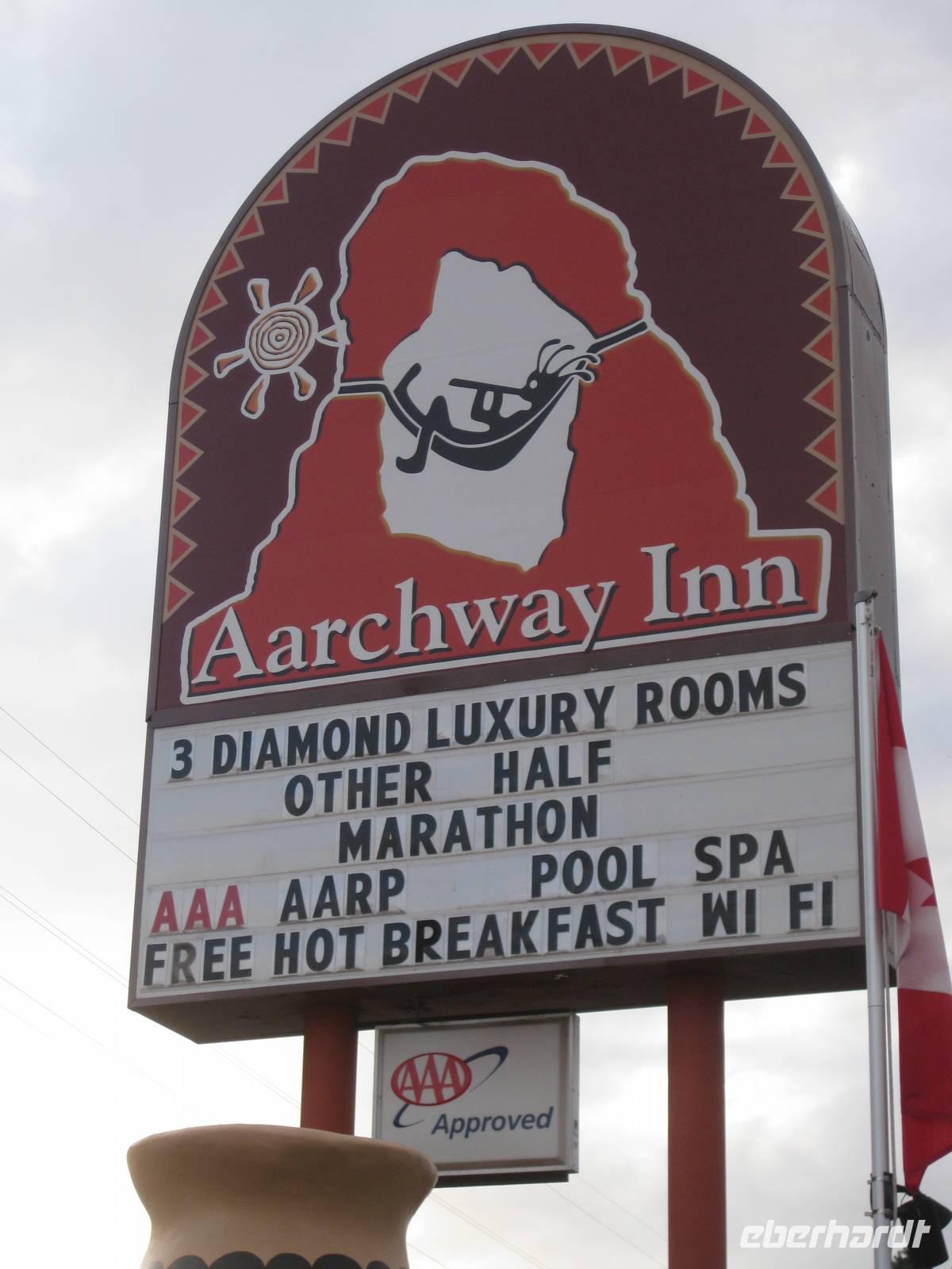 Am Nachmittag fahren wir weiter durch Wüstenlandschaft bis nach Moab. Wir fahren jetzt durch den Mormonenstaat Utah und Janny erzählt uns über die Mormonen. Das ist wichtig, um einige Besonderheiten in Utah zu verstehen. Und wir sind ein paar Tage in Utah. Moab ist ein kleines sehr lebendiges Städtchen. Es hat sich zu einem neuen Zentrum sportlicher Aktivitäten wie Mountainbiking, Wandern und Klettern entwickelt. Am Abend erreichen wir unser Hotel Aarchway Inn am Stadtrand. Zum Abendessen fahren wir noch mal in die Stadt in das Restaurant der Brauerei Moab. Es gibt ein zünftiges Westernessen und natürlich müssen wir dort auch das einheimische Bier kosten.