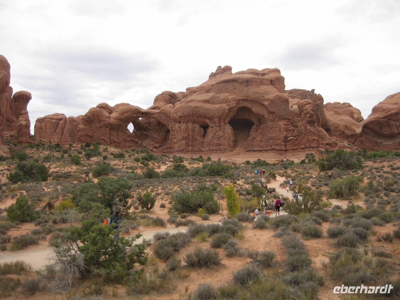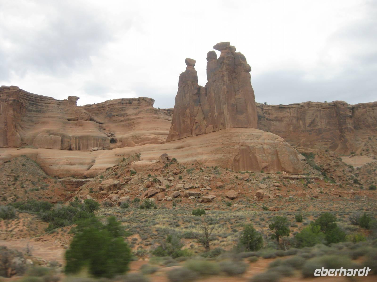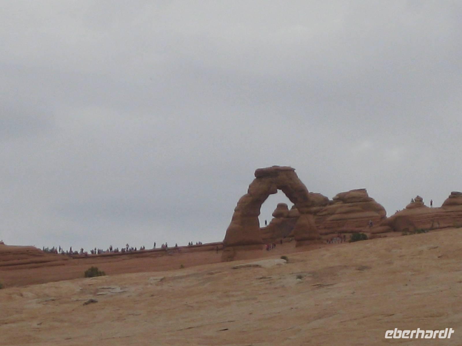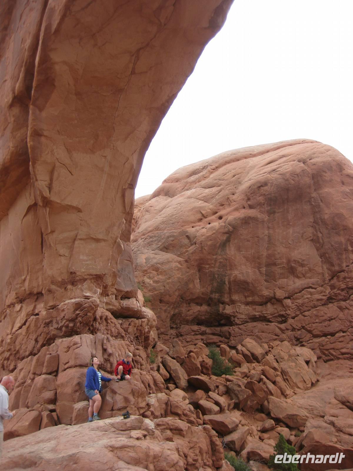 Heute besuchen wir zuerst den Arches Nationalpark mit seinen Navajo-Sandstein-Felsen. Wir müssen gar nicht weit fahren. Der Nationalpark befindet sich sozusagen gleich um die Ecke. Wir überqueren nur den Colorado und dann haben wir schon das Visitor Center erreicht. Moab liegt in einer Höhe von 1280 Metern, Arches noch ein ganzes Stück höher. Das müssen wir aber nicht laufen, unser Bus bringt auf einer Serpentinenstraße nach oben. Die Felsformation "Die drei Klatschtanten" grüßt uns vom Wegesrand und wir machen Stopp bei der Windows Section. Hier können wir kleine gemütliche Wanderungen zu den Felsformationen Nord- und Südfenster und zum Doppelbogen machen und diese aus der Nähe betrachten. Dann geht es weiter durch den Nationalpark bis zum Unteren Delicate Arch Aussichtspunkt. Von hier aus können wir das Wahrzeichen des Arches Nationalparks, den Delicate Arch sehen. Dann müssen wir leider weiter.