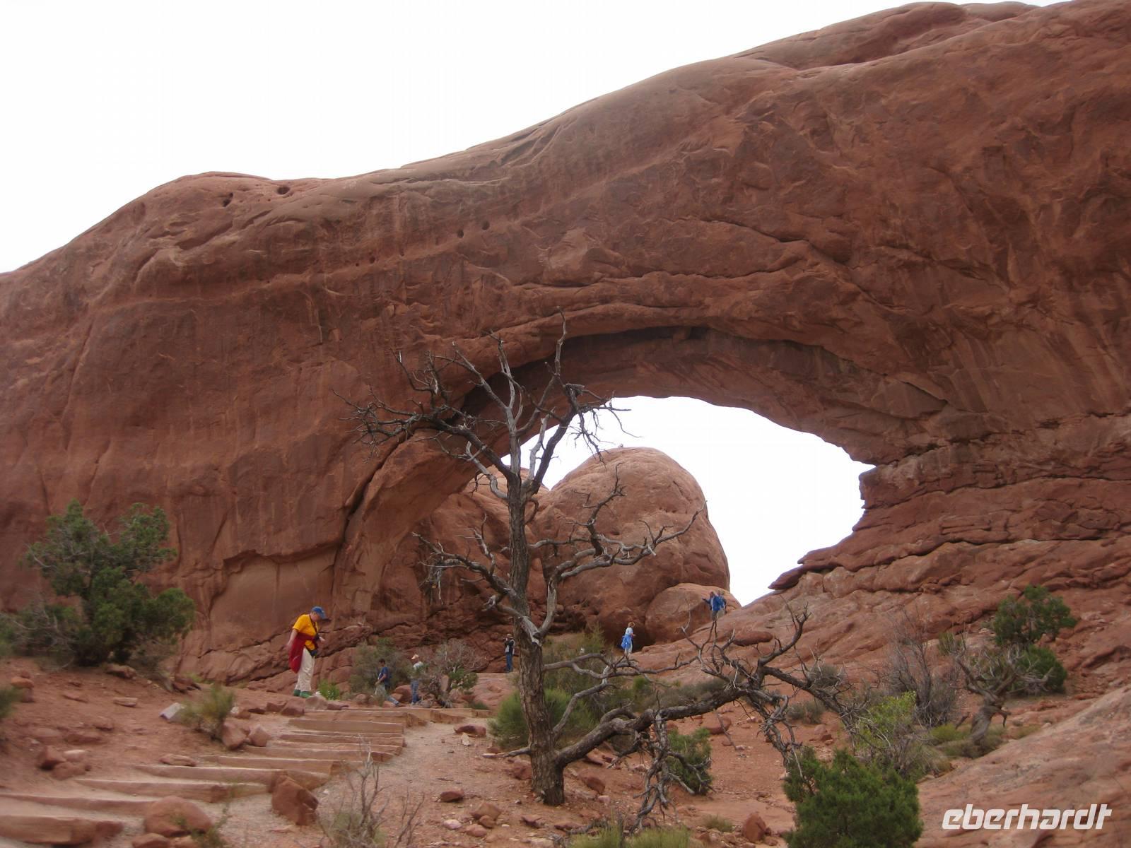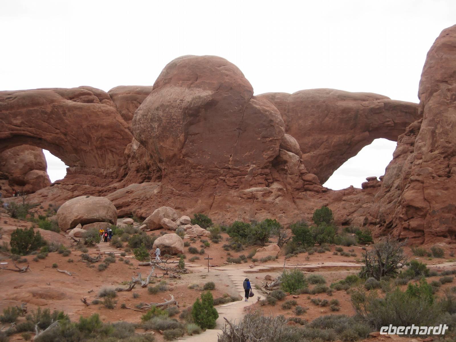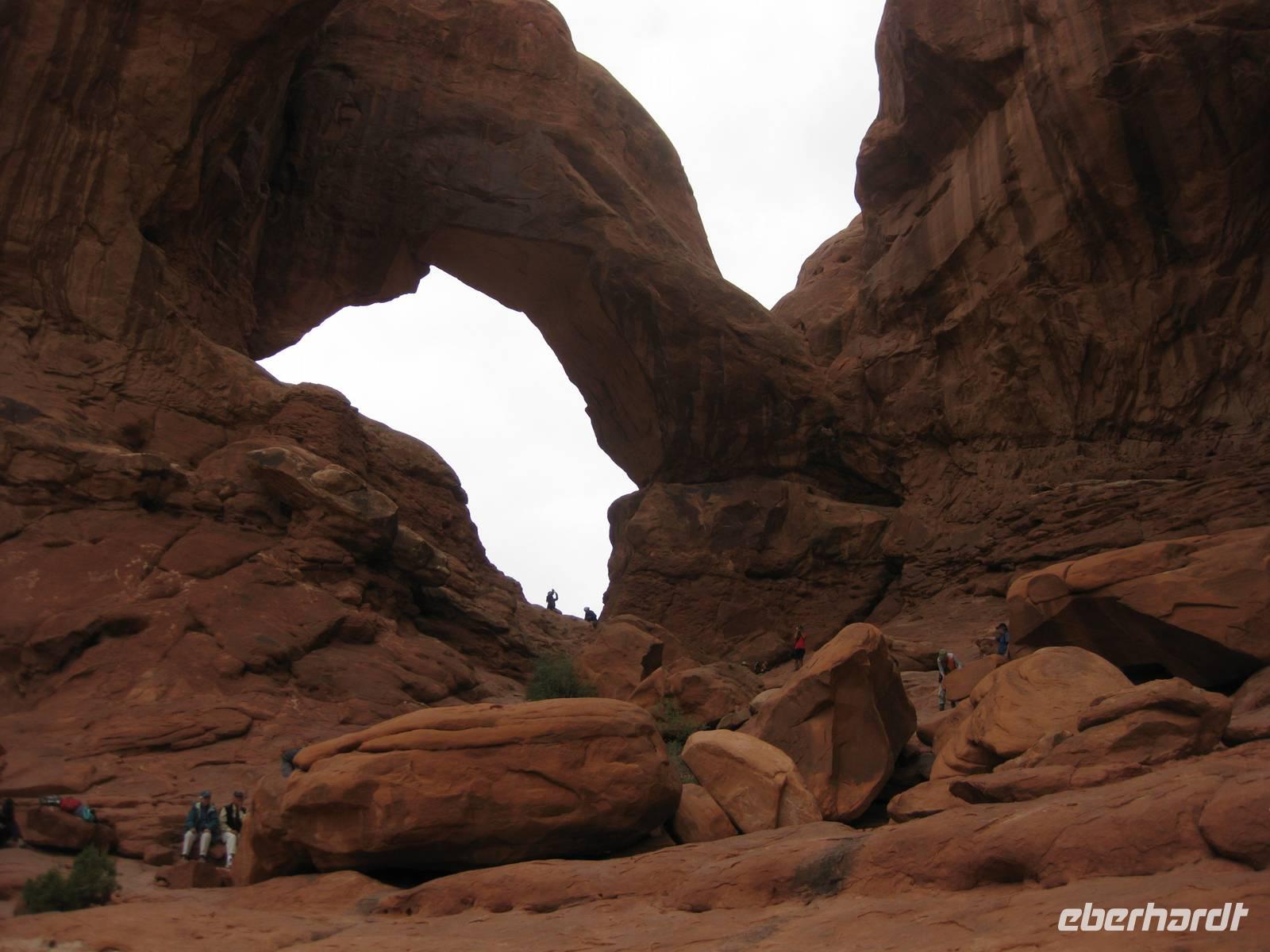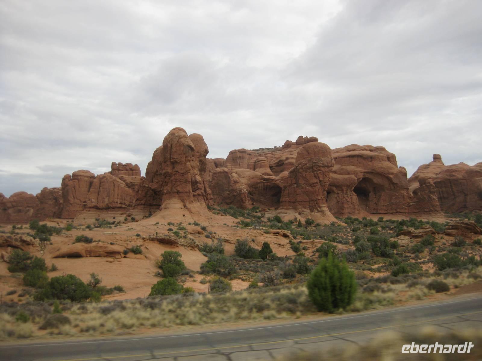 Heute besuchen wir zuerst den Arches Nationalpark mit seinen Navajo-Sandstein-Felsen. Wir müssen gar nicht weit fahren. Der Nationalpark befindet sich sozusagen gleich um die Ecke. Wir überqueren nur den Colorado und dann haben wir schon das Visitor Center erreicht. Moab liegt in einer Höhe von 1280 Metern, Arches noch ein ganzes Stück höher. Das müssen wir aber nicht laufen, unser Bus bringt auf einer Serpentinenstraße nach oben. Die Felsformation "Die drei Klatschtanten" grüßt uns vom Wegesrand und wir machen Stopp bei der Windows Section. Hier können wir kleine gemütliche Wanderungen zu den Felsformationen Nord- und Südfenster und zum Doppelbogen machen und diese aus der Nähe betrachten. Dann geht es weiter durch den Nationalpark bis zum Unteren Delicate Arch Aussichtspunkt. Von hier aus können wir das Wahrzeichen des Arches Nationalparks, den Delicate Arch sehen. Dann müssen wir leider weiter.
