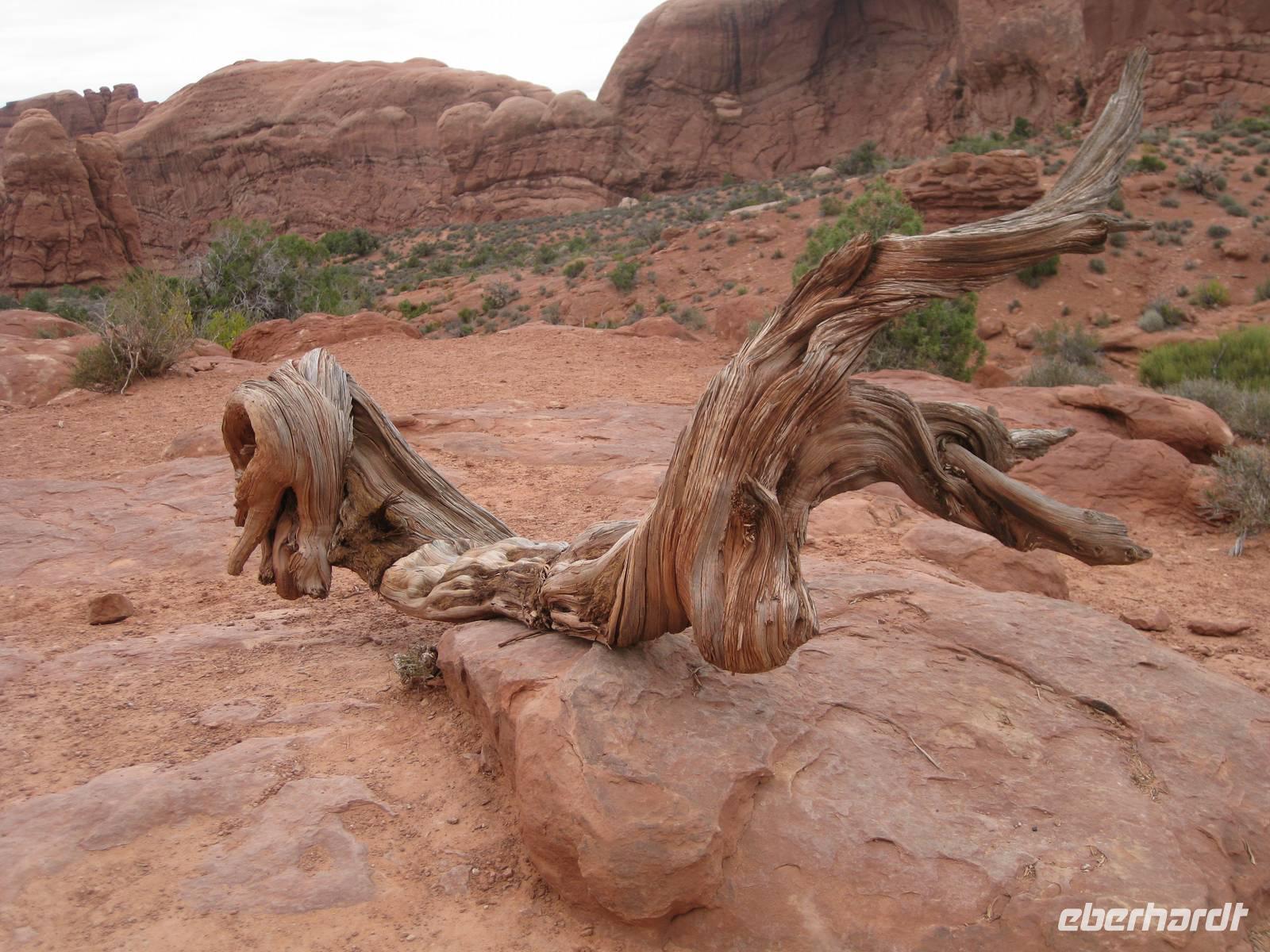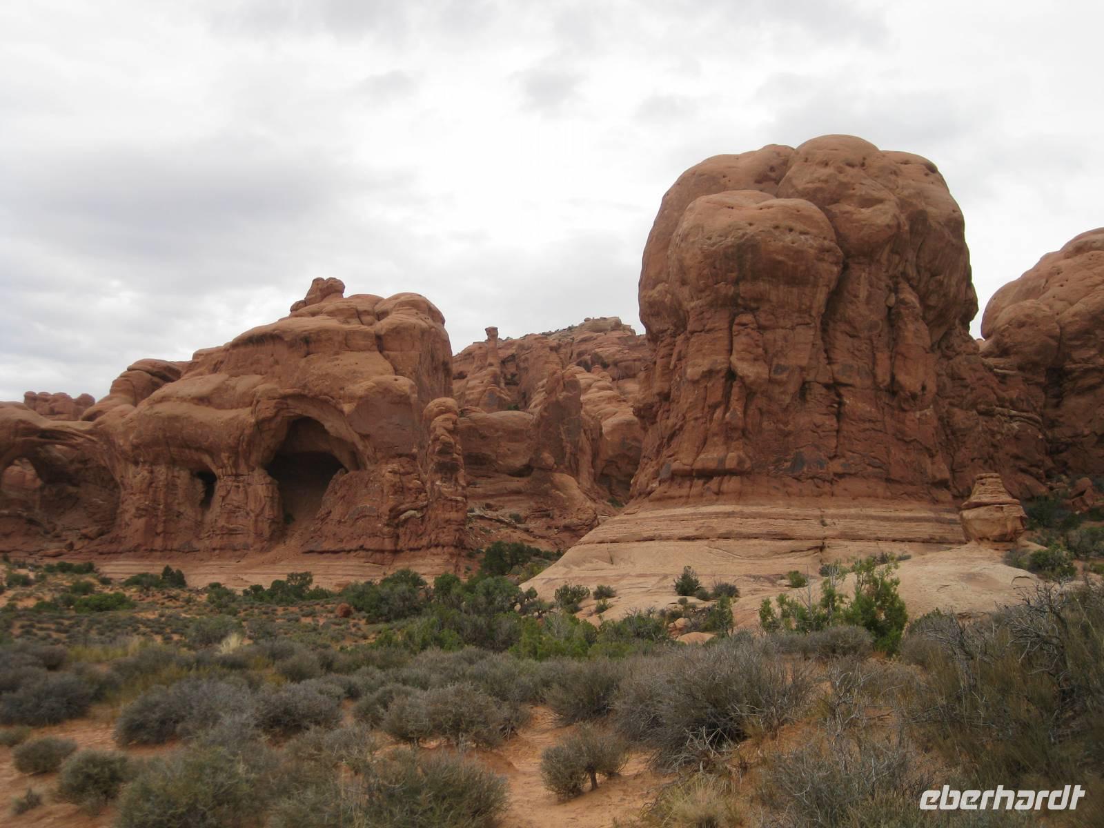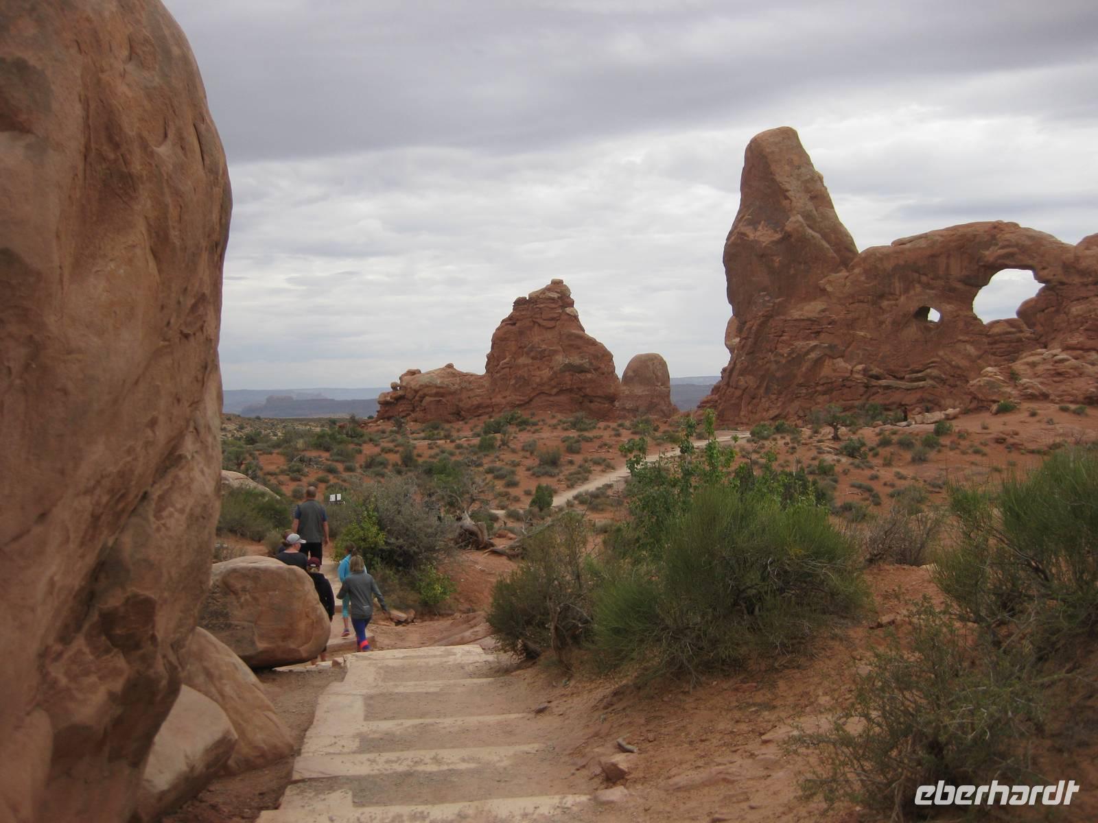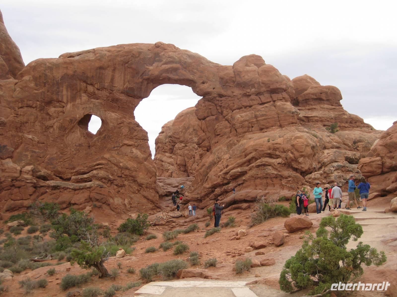 Heute besuchen wir zuerst den Arches Nationalpark mit seinen Navajo-Sandstein-Felsen. Wir müssen gar nicht weit fahren. Der Nationalpark befindet sich sozusagen gleich um die Ecke. Wir überqueren nur den Colorado und dann haben wir schon das Visitor Center erreicht. Moab liegt in einer Höhe von 1280 Metern, Arches noch ein ganzes Stück höher. Das müssen wir aber nicht laufen, unser Bus bringt auf einer Serpentinenstraße nach oben. Die Felsformation "Die drei Klatschtanten" grüßt uns vom Wegesrand und wir machen Stopp bei der Windows Section. Hier können wir kleine gemütliche Wanderungen zu den Felsformationen Nord- und Südfenster und zum Doppelbogen machen und diese aus der Nähe betrachten. Dann geht es weiter durch den Nationalpark bis zum Unteren Delicate Arch Aussichtspunkt. Von hier aus können wir das Wahrzeichen des Arches Nationalparks, den Delicate Arch sehen. Dann müssen wir leider weiter.