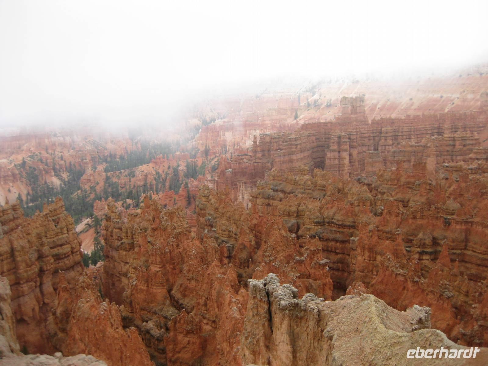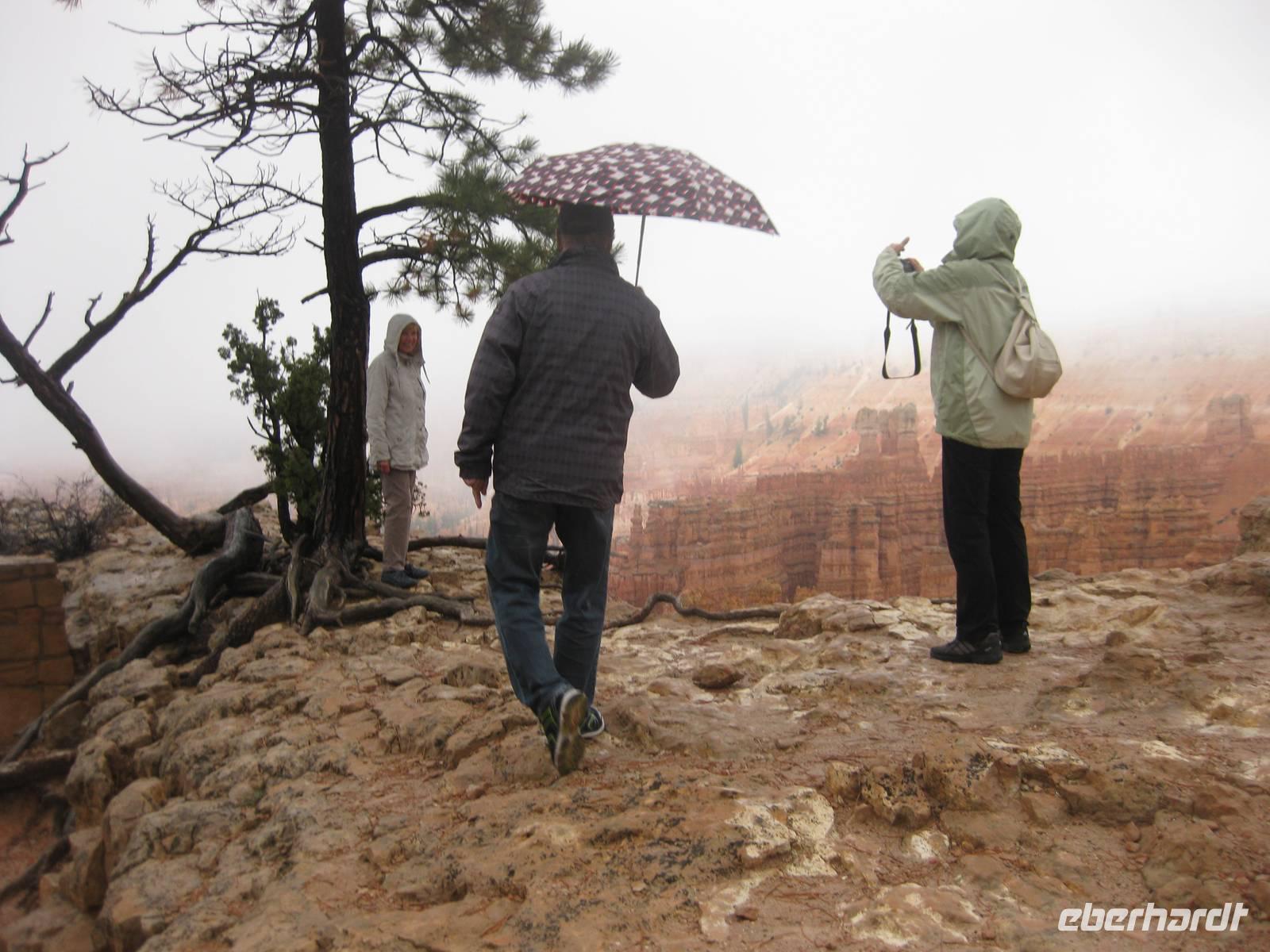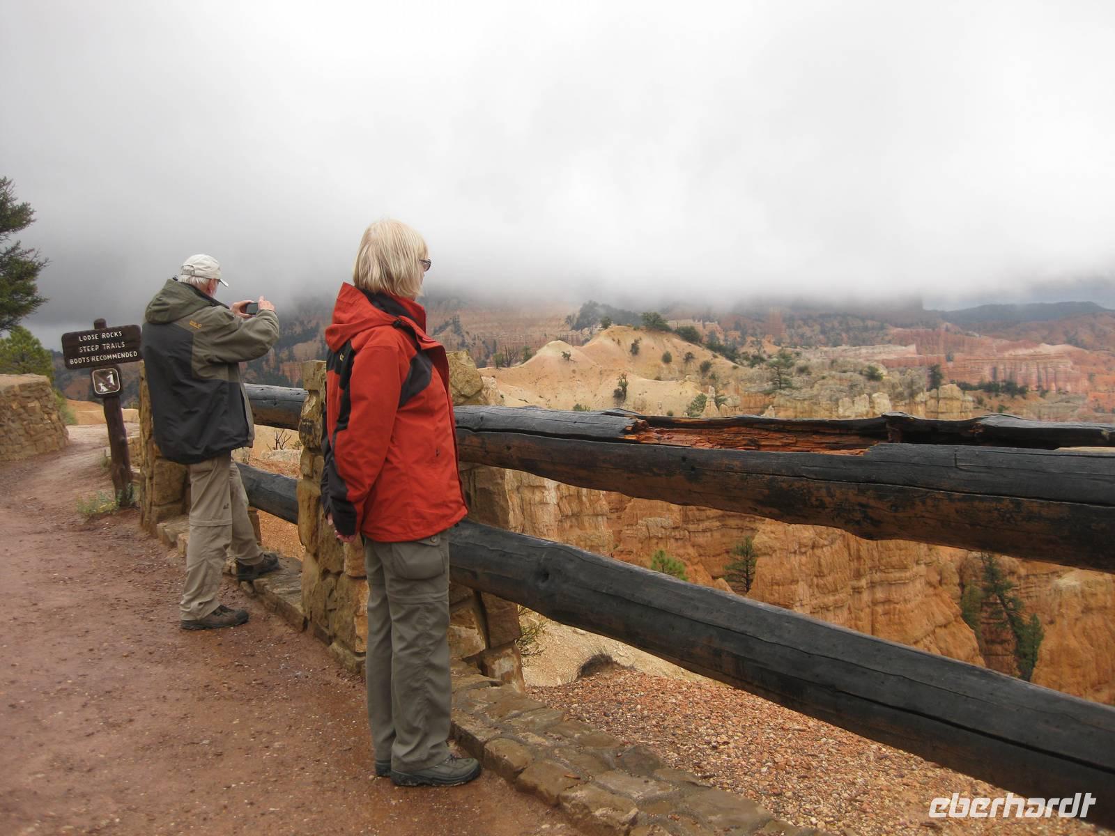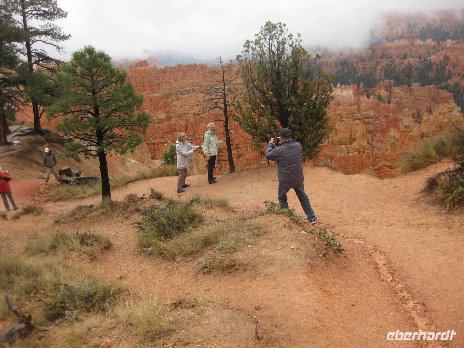 Und dann fahren wir in den Nationalpark Bryce Canyon hinein. Es hat zwar mit regnen aufgehört, aber es ist sehr neblig. Am Bryce Point stehen wir im Nebel und können leider gar nichts sehen. Es ist der höchste Punkt. Wir fahren weiter zum nächsten Aussichtspunkt, dem Inspiration Point und als wir an der Kante stehen - reißt der Vorhang auf und wir sehen den Bryce Canyon in seiner vollen Pracht! Wir laufen an der Kante entlang und ständig bieten sich neue Ausblicke. Wir können uns gar nicht satt sehen. Auch der Bryce Canyon ist faszinierend! Am Ende dieses Pfades erwartet uns Derrick mit dem Bus. Dann machen wir noch am Fairyland Point halt und blicken von dort noch mal auf den Bryce Canyon - wieder eine andere Perspektive. Und dann fahren wir zum Hotel zurück.