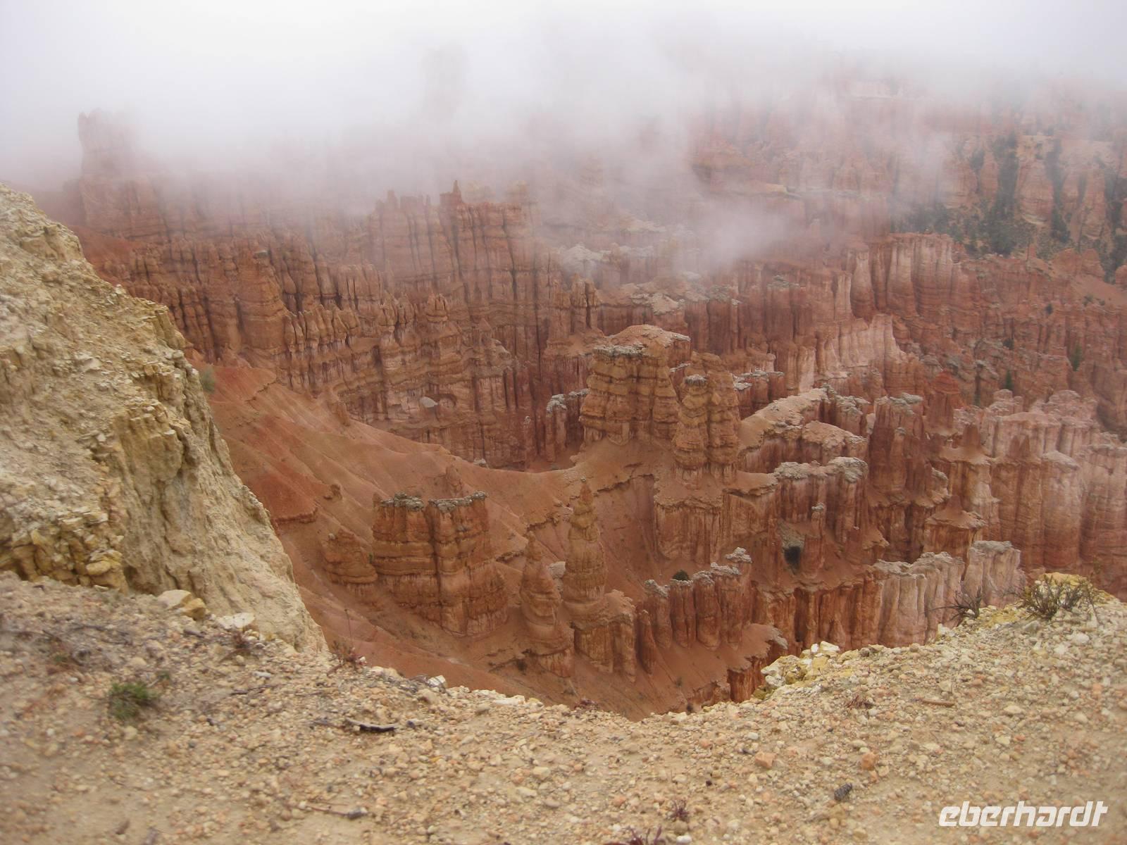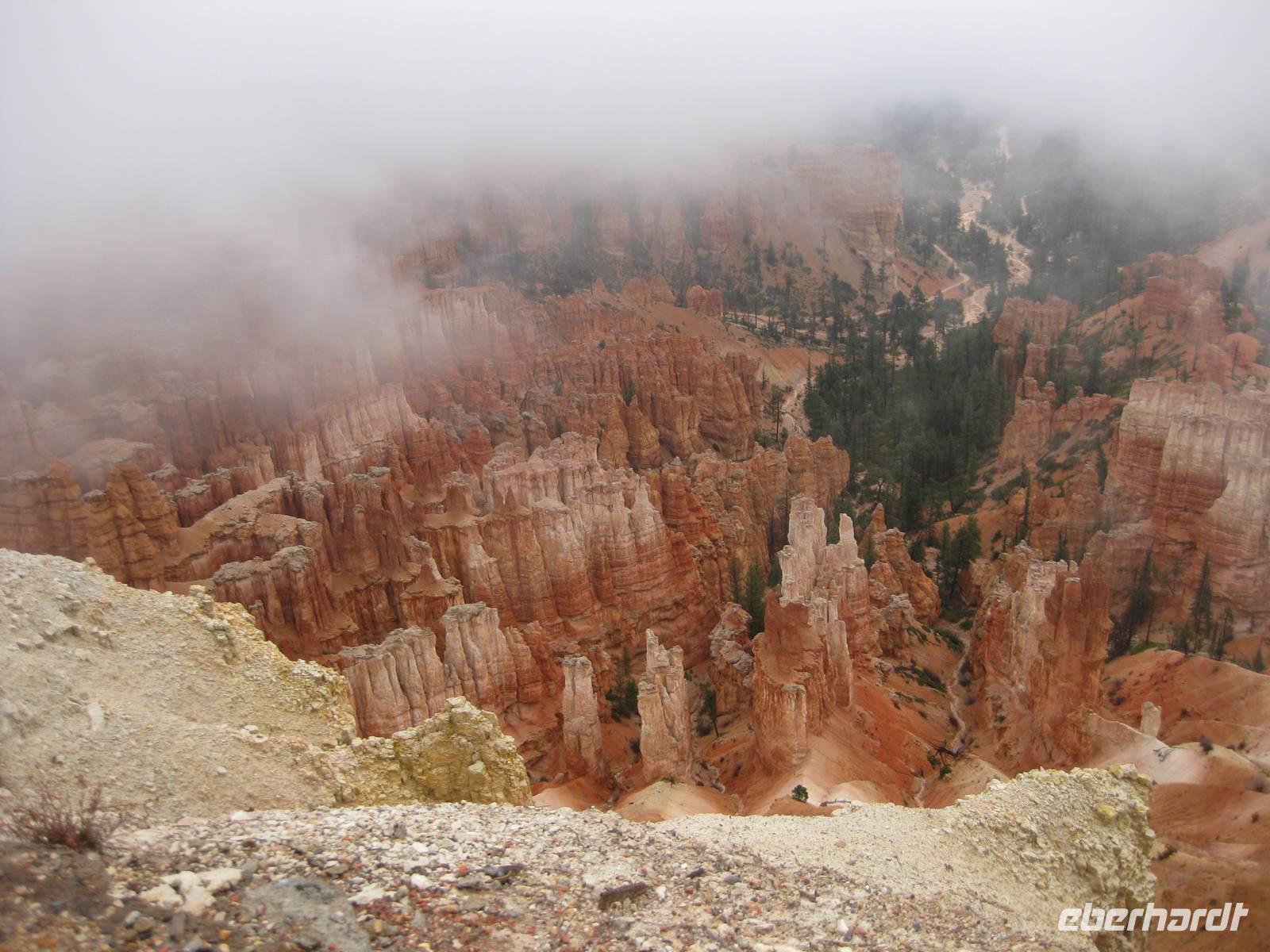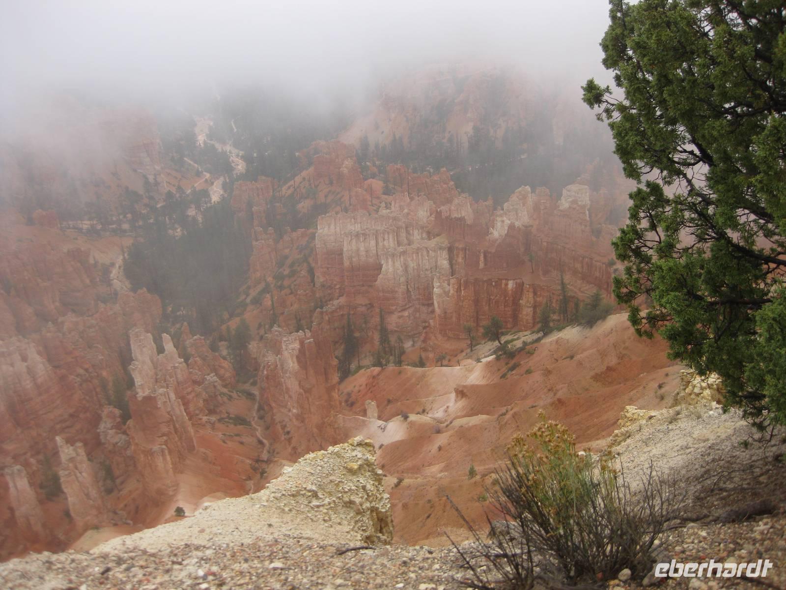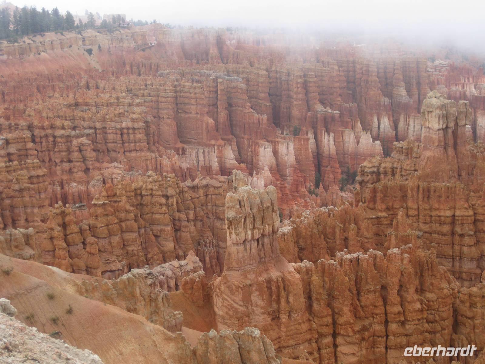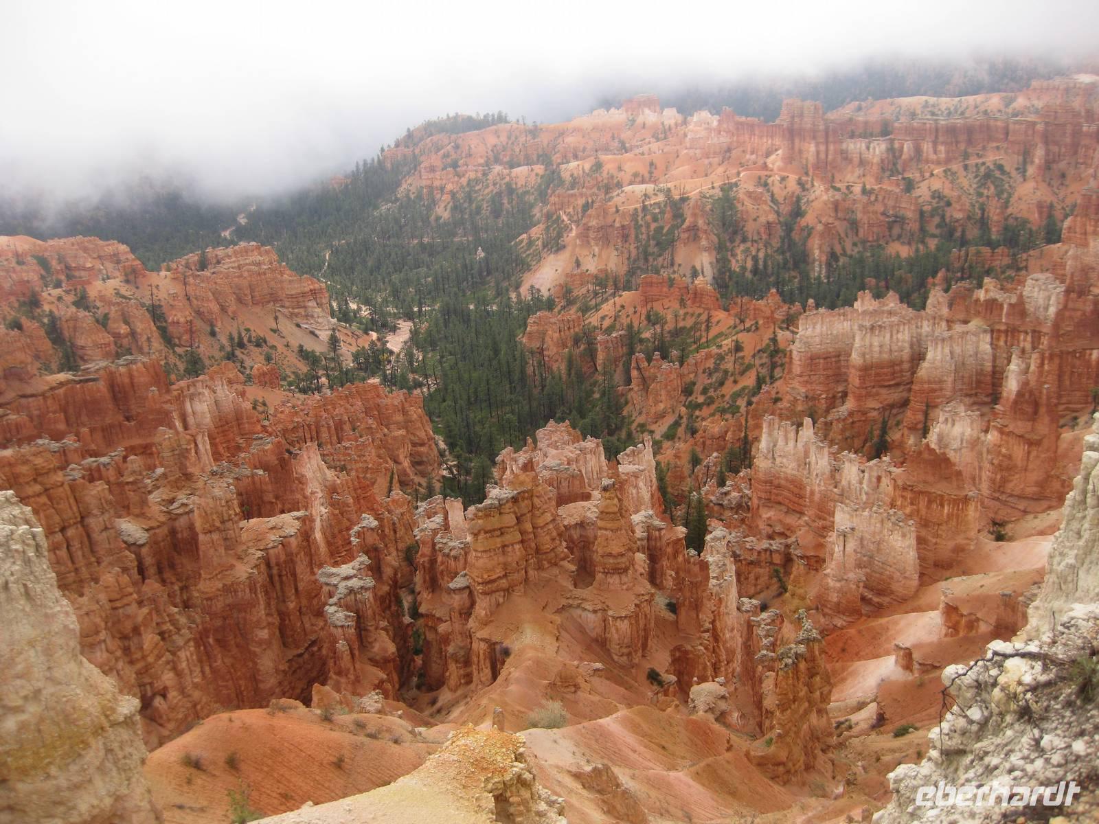 Und dann fahren wir in den Nationalpark Bryce Canyon hinein. Es hat zwar mit regnen aufgehört, aber es ist sehr neblig. Am Bryce Point stehen wir im Nebel und können leider gar nichts sehen. Es ist der höchste Punkt. Wir fahren weiter zum nächsten Aussichtspunkt, dem Inspiration Point und als wir an der Kante stehen - reißt der Vorhang auf und wir sehen den Bryce Canyon in seiner vollen Pracht! Wir laufen an der Kante entlang und ständig bieten sich neue Ausblicke. Wir können uns gar nicht satt sehen. Auch der Bryce Canyon ist faszinierend! Am Ende dieses Pfades erwartet uns Derrick mit dem Bus. Dann machen wir noch am Fairyland Point halt und blicken von dort noch mal auf den Bryce Canyon - wieder eine andere Perspektive. Und dann fahren wir zum Hotel zurück.