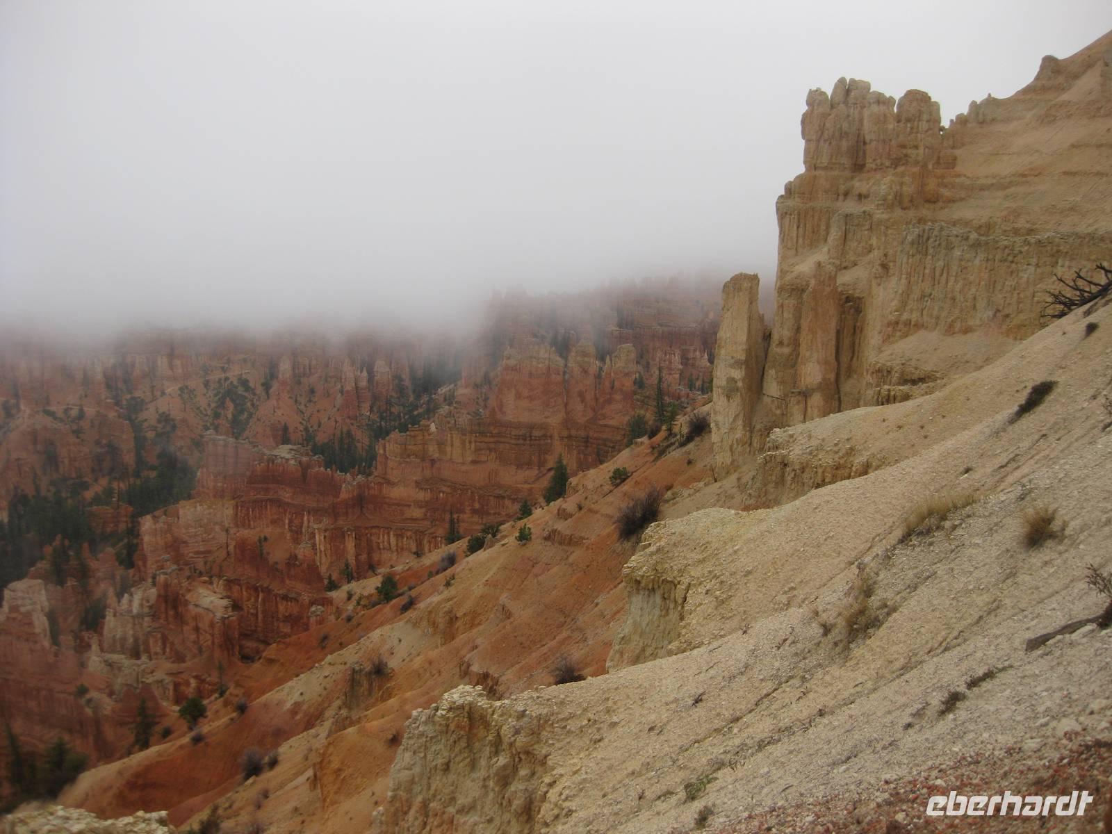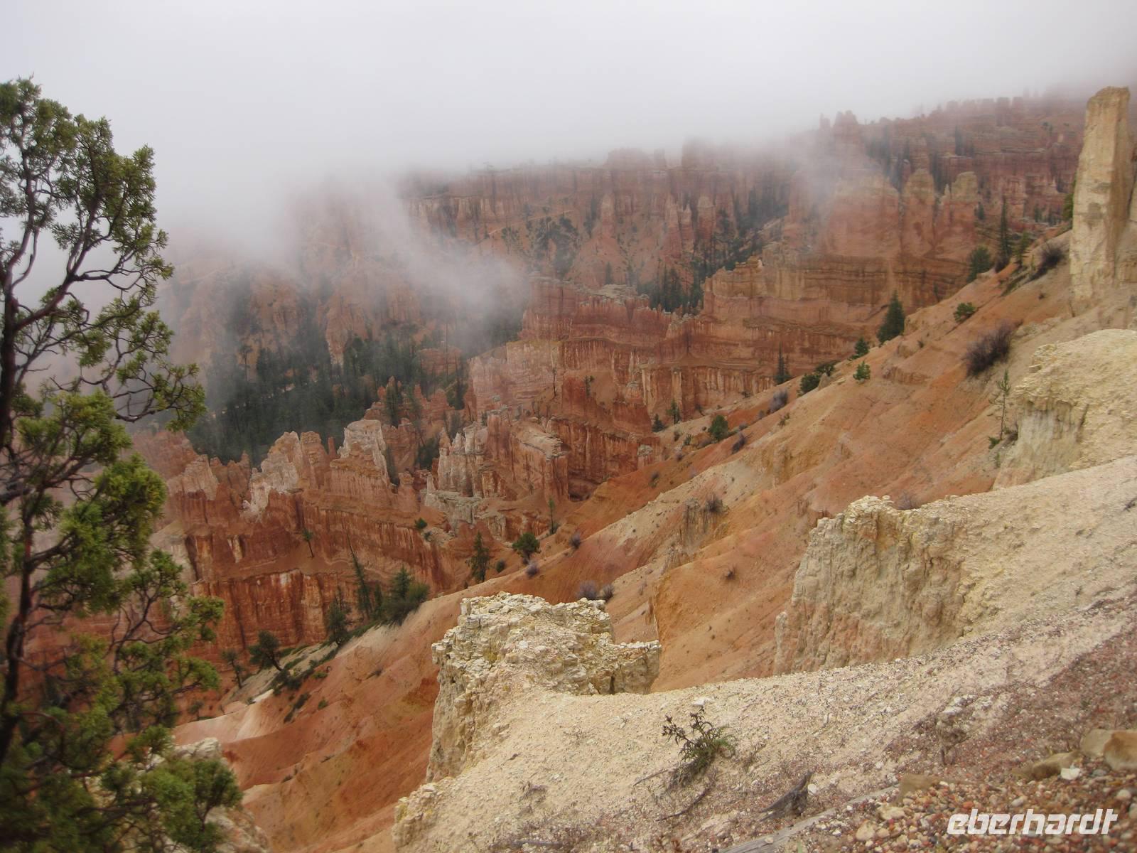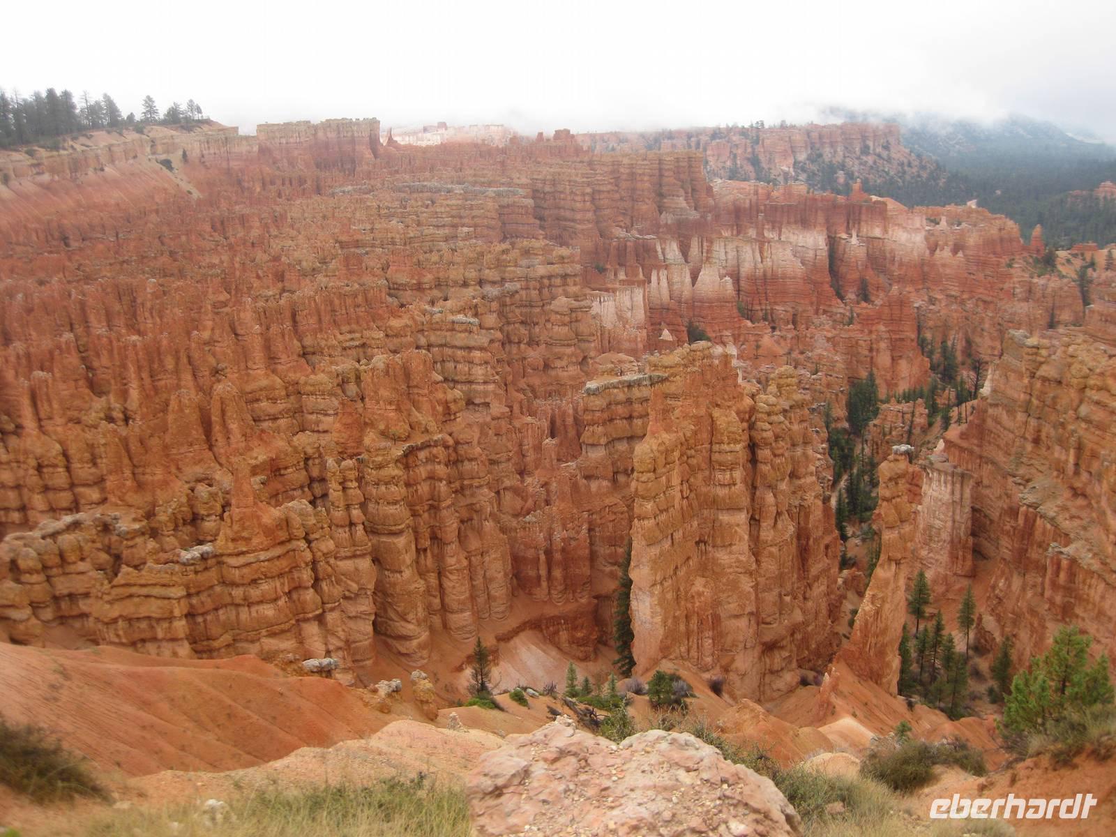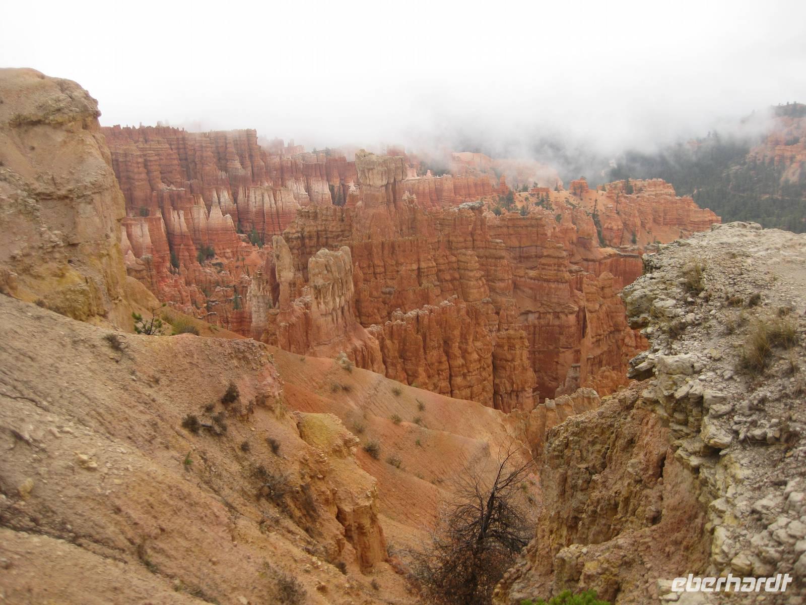 Und dann fahren wir in den Nationalpark Bryce Canyon hinein. Es hat zwar mit regnen aufgehört, aber es ist sehr neblig. Am Bryce Point stehen wir im Nebel und können leider gar nichts sehen. Es ist der höchste Punkt. Wir fahren weiter zum nächsten Aussichtspunkt, dem Inspiration Point und als wir an der Kante stehen - reißt der Vorhang auf und wir sehen den Bryce Canyon in seiner vollen Pracht! Wir laufen an der Kante entlang und ständig bieten sich neue Ausblicke. Wir können uns gar nicht satt sehen. Auch der Bryce Canyon ist faszinierend! Am Ende dieses Pfades erwartet uns Derrick mit dem Bus. Dann machen wir noch am Fairyland Point halt und blicken von dort noch mal auf den Bryce Canyon - wieder eine andere Perspektive. Und dann fahren wir zum Hotel zurück.