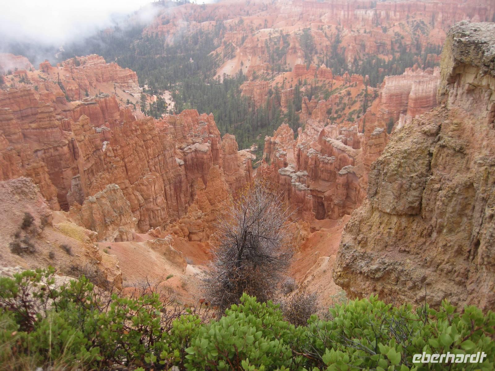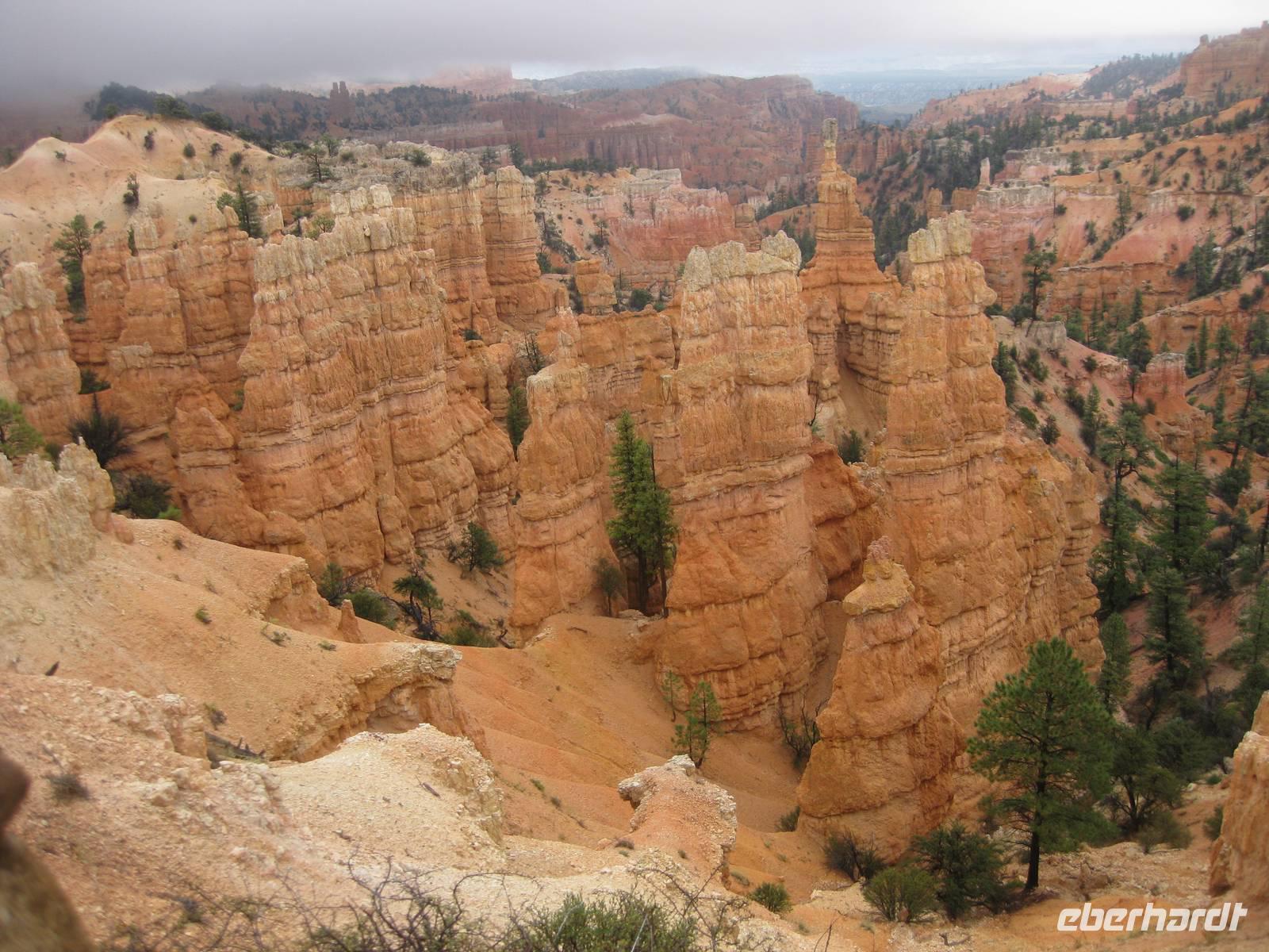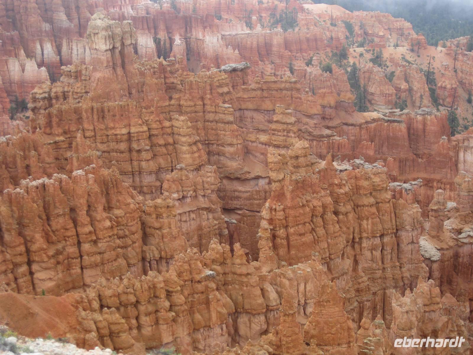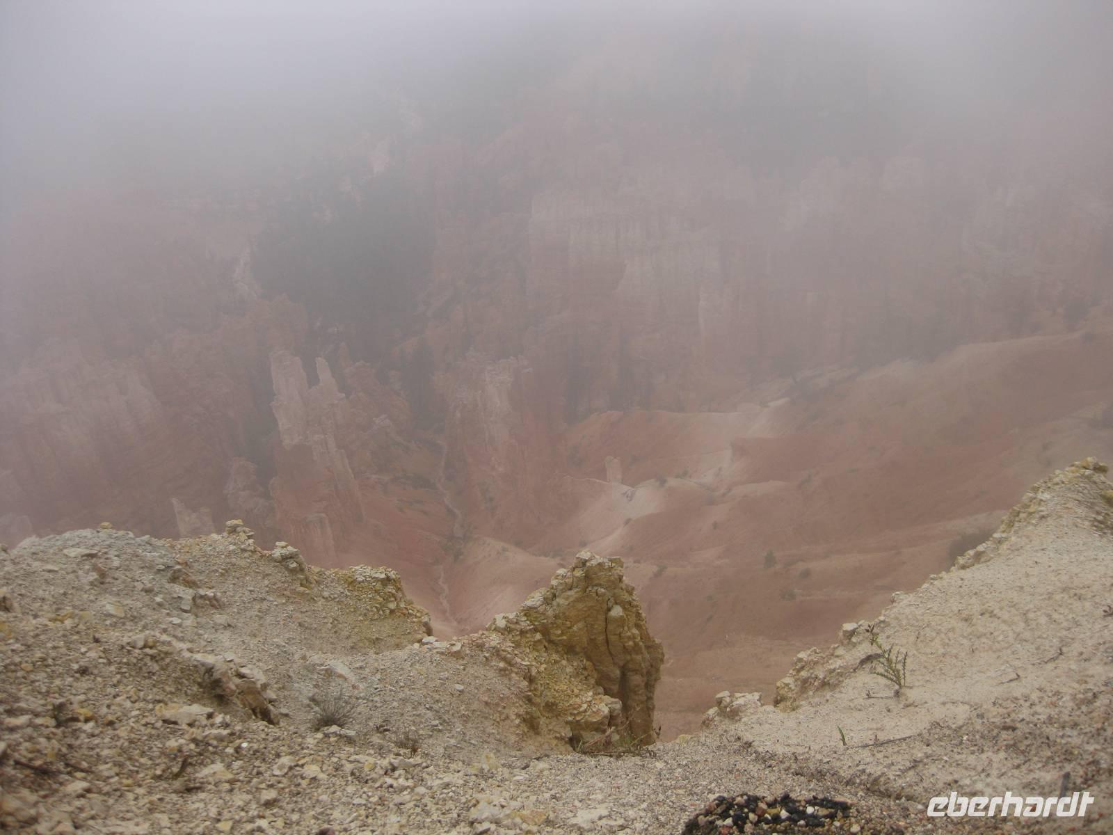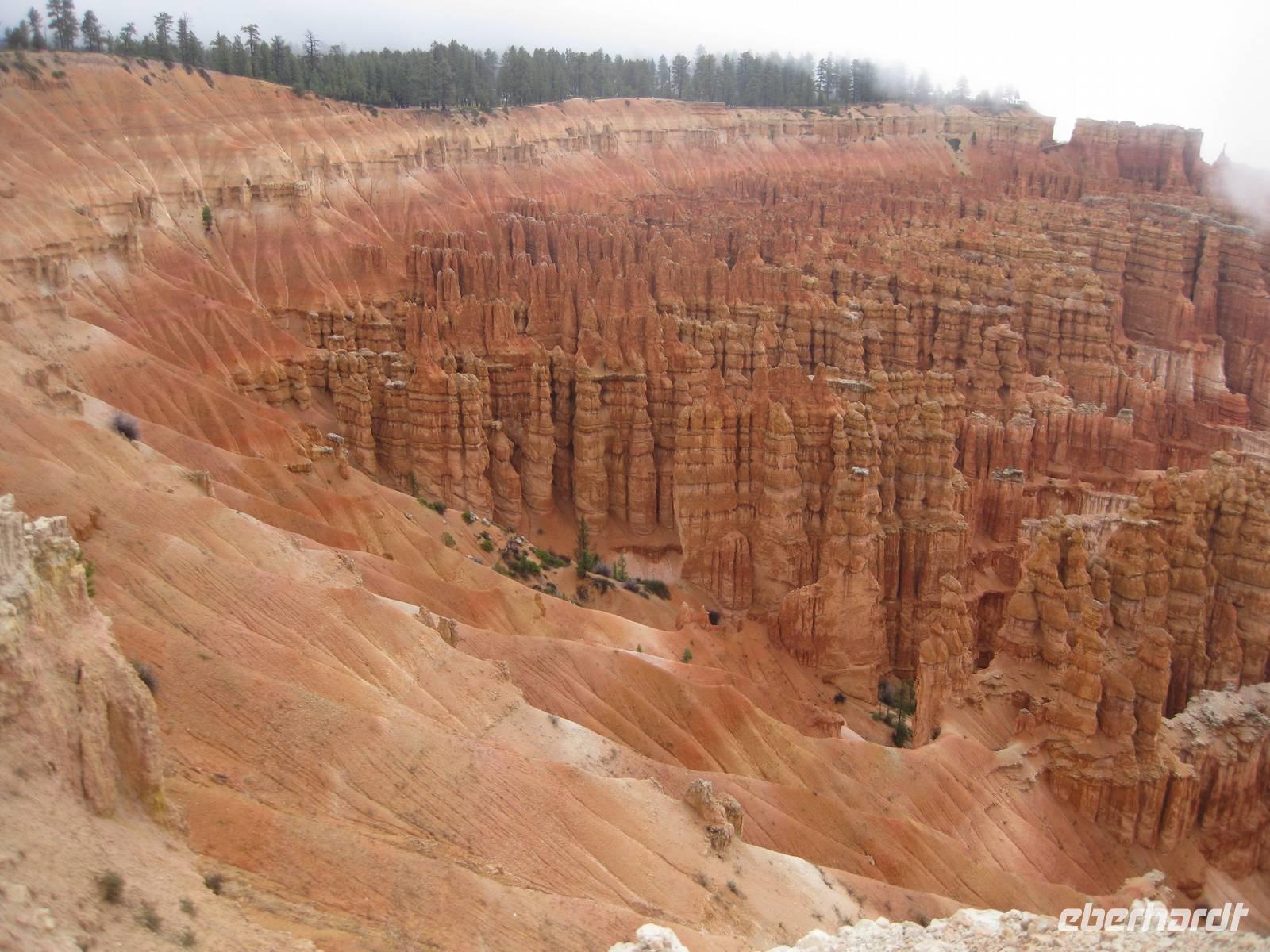 Und dann fahren wir in den Nationalpark Bryce Canyon hinein. Es hat zwar mit regnen aufgehört, aber es ist sehr neblig. Am Bryce Point stehen wir im Nebel und können leider gar nichts sehen. Es ist der höchste Punkt. Wir fahren weiter zum nächsten Aussichtspunkt, dem Inspiration Point und als wir an der Kante stehen - reißt der Vorhang auf und wir sehen den Bryce Canyon in seiner vollen Pracht! Wir laufen an der Kante entlang und ständig bieten sich neue Ausblicke. Wir können uns gar nicht satt sehen. Auch der Bryce Canyon ist faszinierend! Am Ende dieses Pfades erwartet uns Derrick mit dem Bus. Dann machen wir noch am Fairyland Point halt und blicken von dort noch mal auf den Bryce Canyon - wieder eine andere Perspektive. Und dann fahren wir zum Hotel zurück.