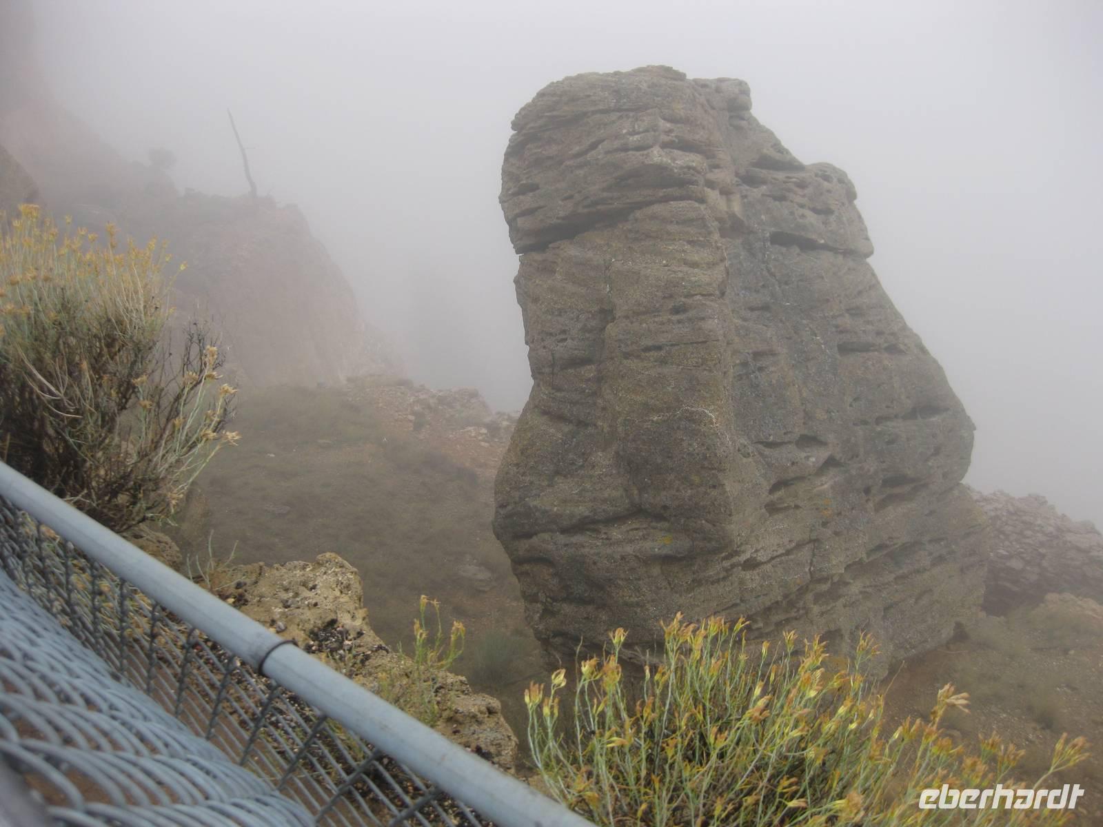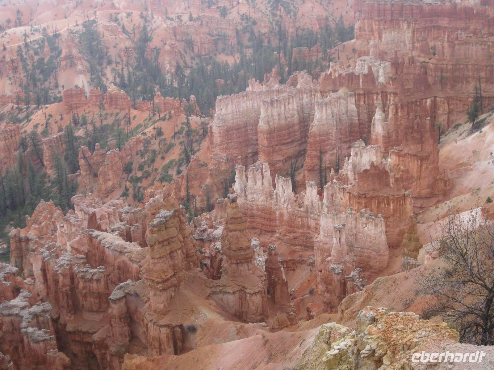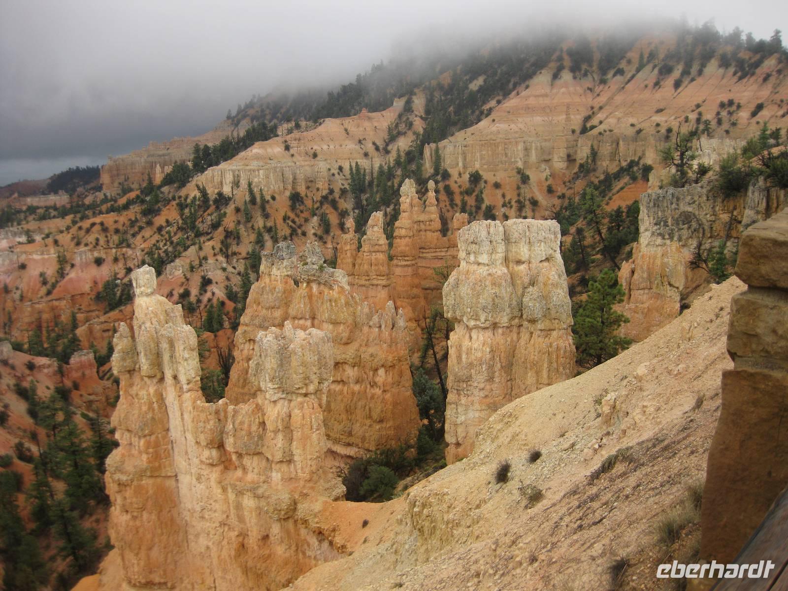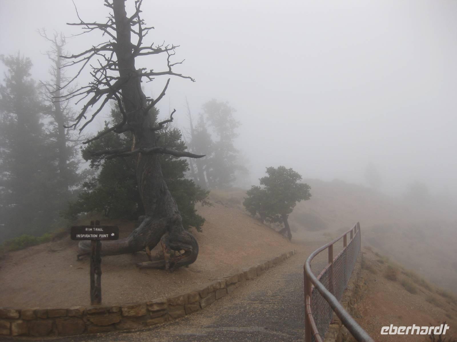 Und dann fahren wir in den Nationalpark Bryce Canyon hinein. Es hat zwar mit regnen aufgehört, aber es ist sehr neblig. Am Bryce Point stehen wir im Nebel und können leider gar nichts sehen. Es ist der höchste Punkt. Wir fahren weiter zum nächsten Aussichtspunkt, dem Inspiration Point und als wir an der Kante stehen - reißt der Vorhang auf und wir sehen den Bryce Canyon in seiner vollen Pracht! Wir laufen an der Kante entlang und ständig bieten sich neue Ausblicke. Wir können uns gar nicht satt sehen. Auch der Bryce Canyon ist faszinierend! Am Ende dieses Pfades erwartet uns Derrick mit dem Bus. Dann machen wir noch am Fairyland Point halt und blicken von dort noch mal auf den Bryce Canyon - wieder eine andere Perspektive. Und dann fahren wir zum Hotel zurück.