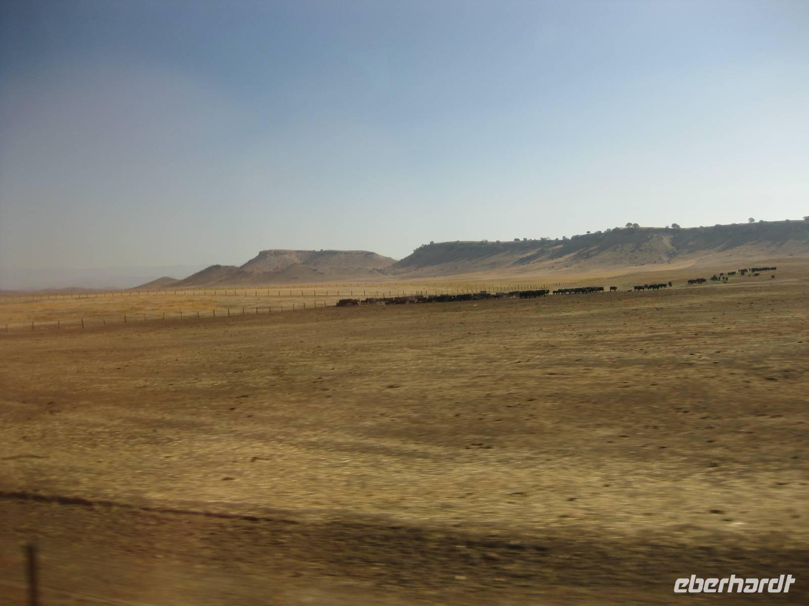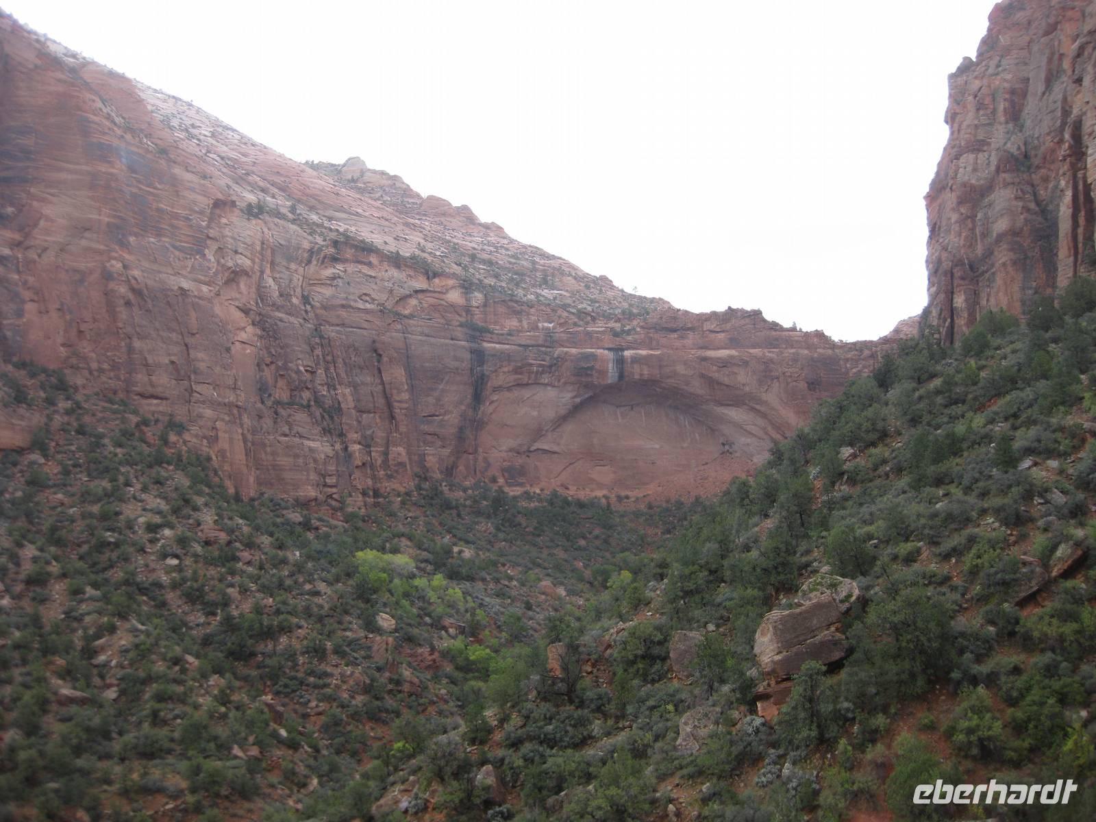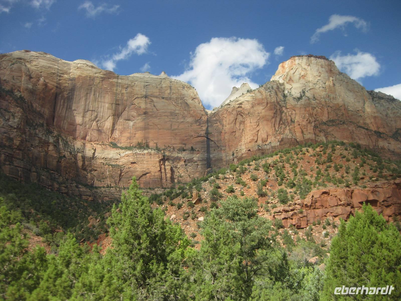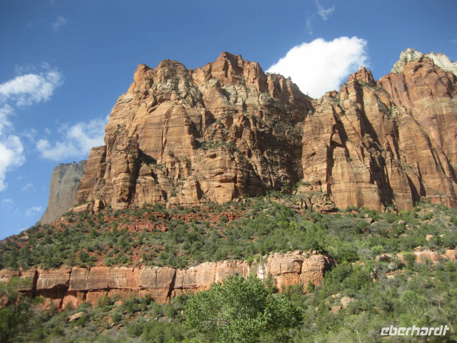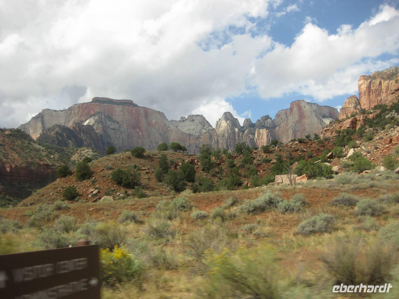 Am Morgen ist dann alles wieder vorbei, so als wenn nichts gewesen wäre. Wir verlassen Bryce Canyon, fahren wieder an den Roten Felsen vorbei und dann durch Ranchland. Durch den Virgin River ist hier viel Grünes, ideal für die Viehzucht. Kurz vor dem Zion Nationalpark kommen wir an einer Büffel-Ranch vorbei.