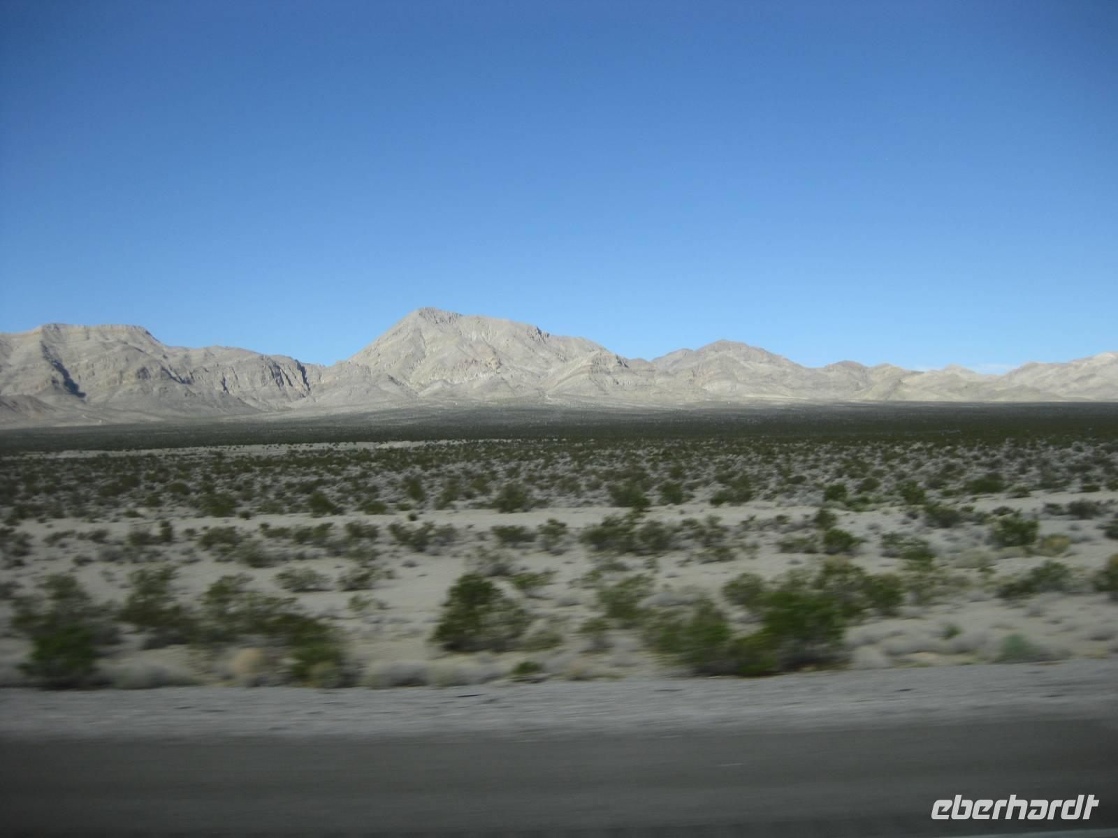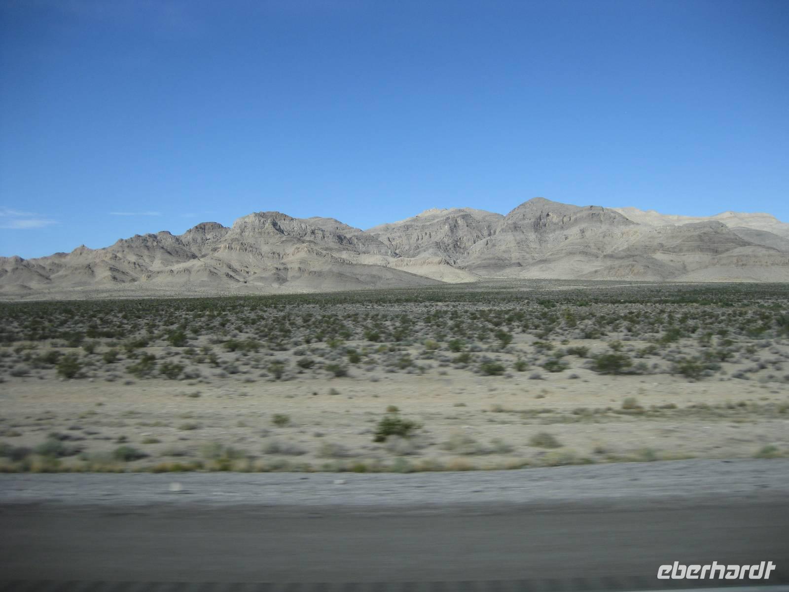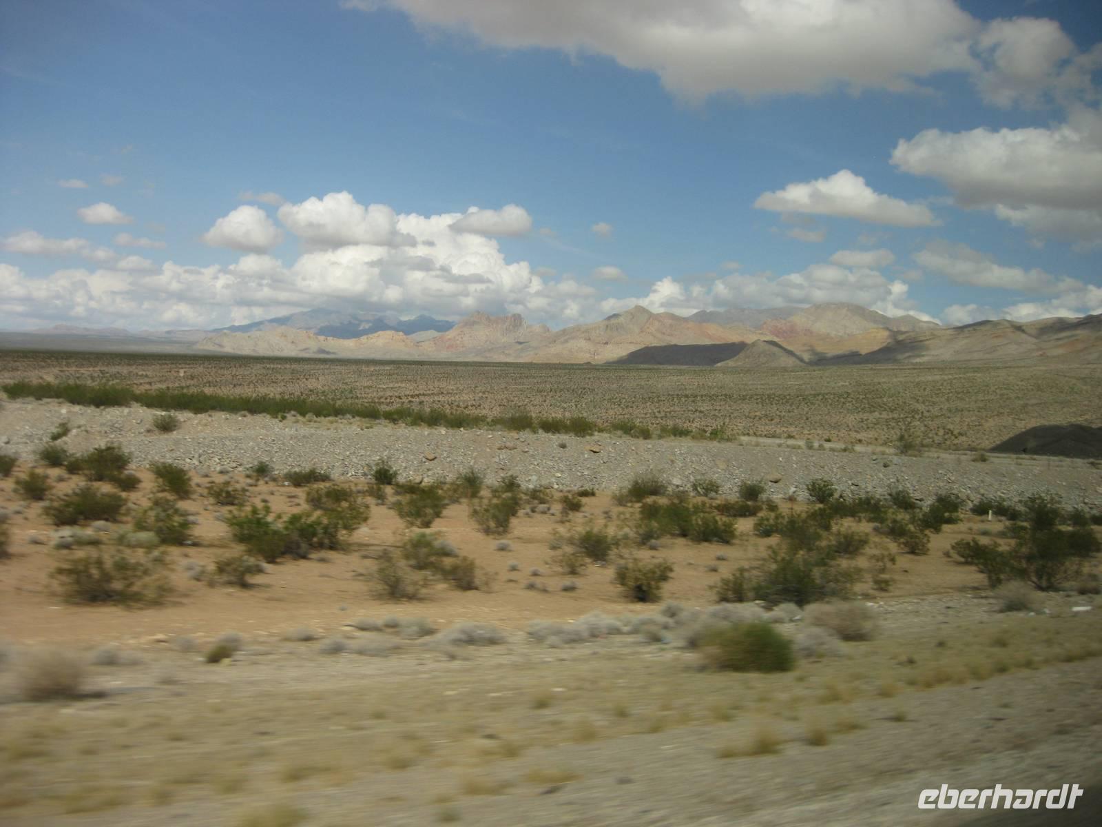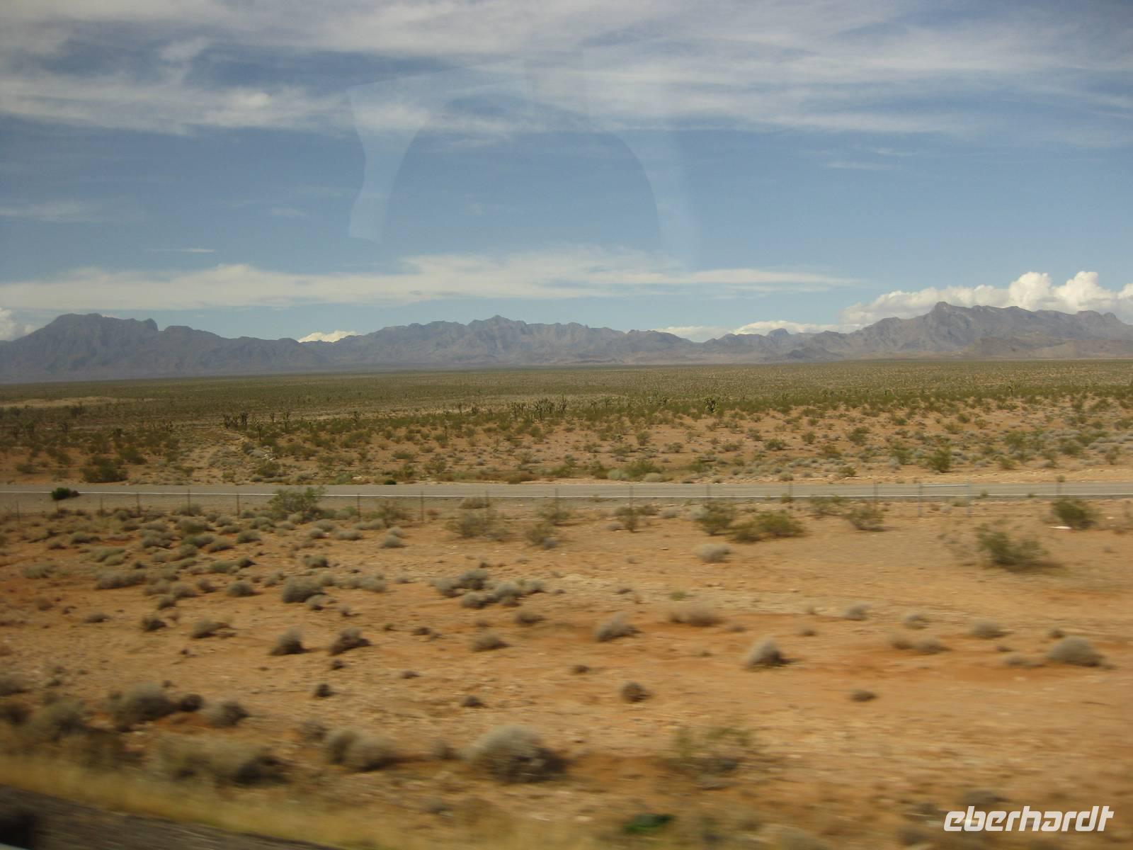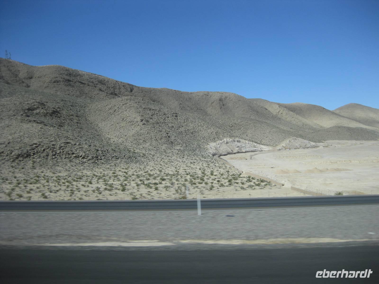 Unser erster Stopp auf dem Weg nach Las Vegas ist der Zion Nationalpark. Gleich an der Einfahrt in den Nationalpark begrüßt uns ein unübersehbarer Felsen, die Checkerboard Mesa (Schachbrettberg). Der Felsen entstand aus Sanddünen, die versteinerten und jetzt ein Schachbrettmuster aufweisen. Dann fahren wir durch einen Tunnel. Die Röhre wurde 1930 gebaut. Sie wurde auf der einen Seite mehrfach unterbrochen, so dass die gegenüberliegende Canyonwand wie ein kurzer Film erscheint. Ganz unten im Tal an einem Arm des Virgin River liegt die Zion Lodge. Hier machen wir eine längere Pause, die die meisten von uns für eine kleine Wanderung und die Mittagspause nutzen. Dann setzen wir unsere Fahrt in Richtung Las Vegas fort. Es geht wieder große Strecken durch die Wüste Nevada, denn Las Vegas liegt ja mitten in der Wüste.