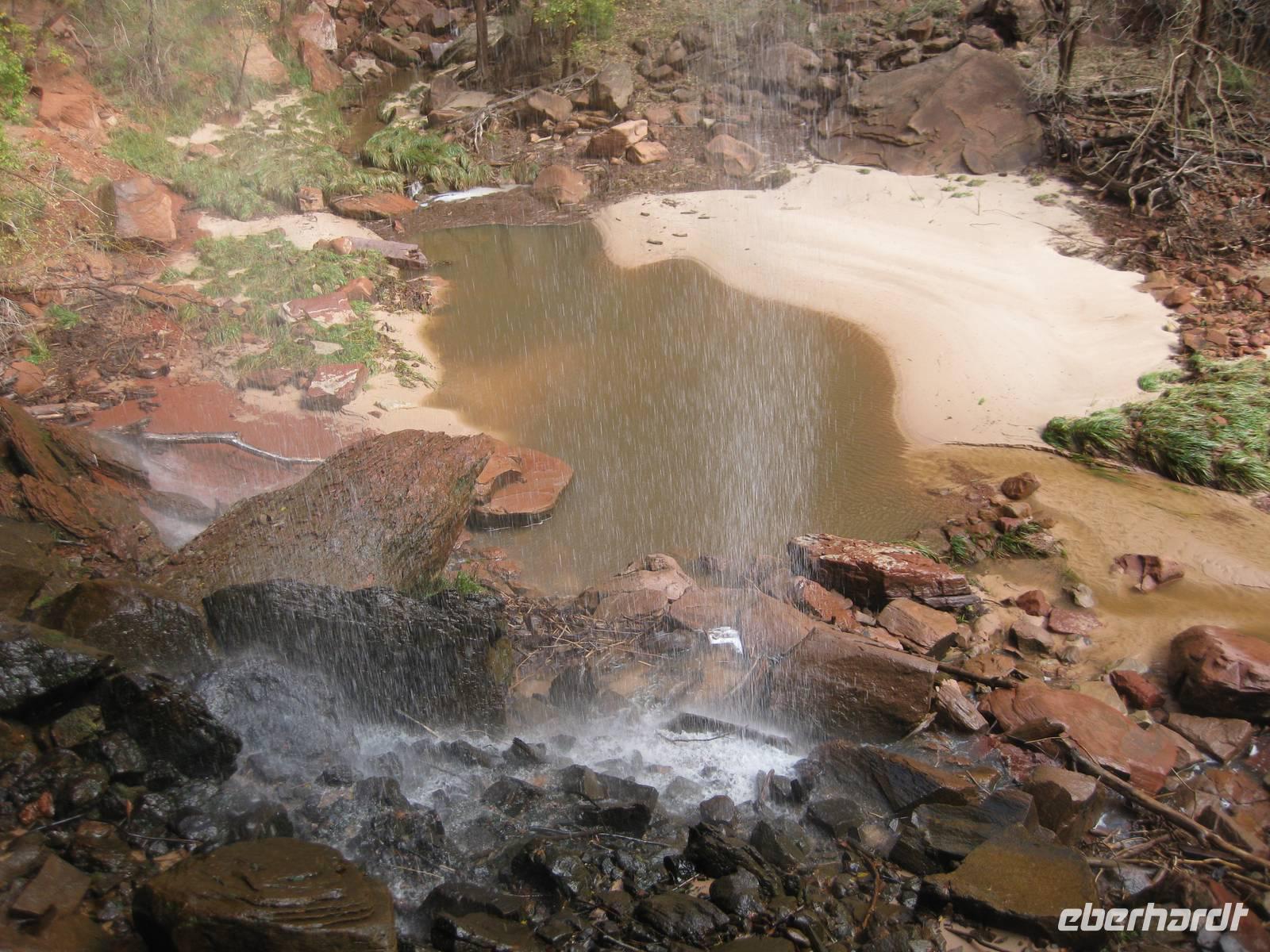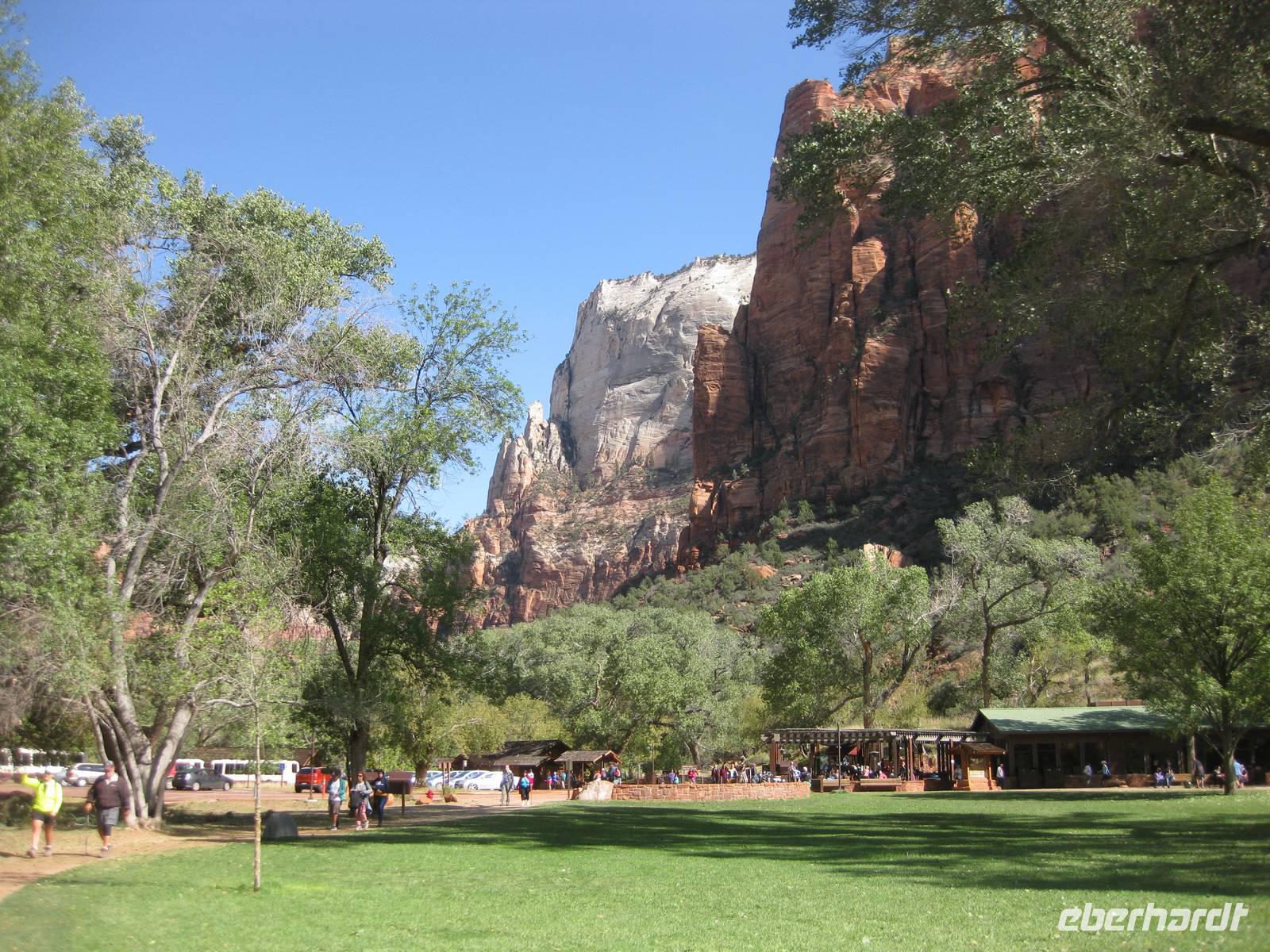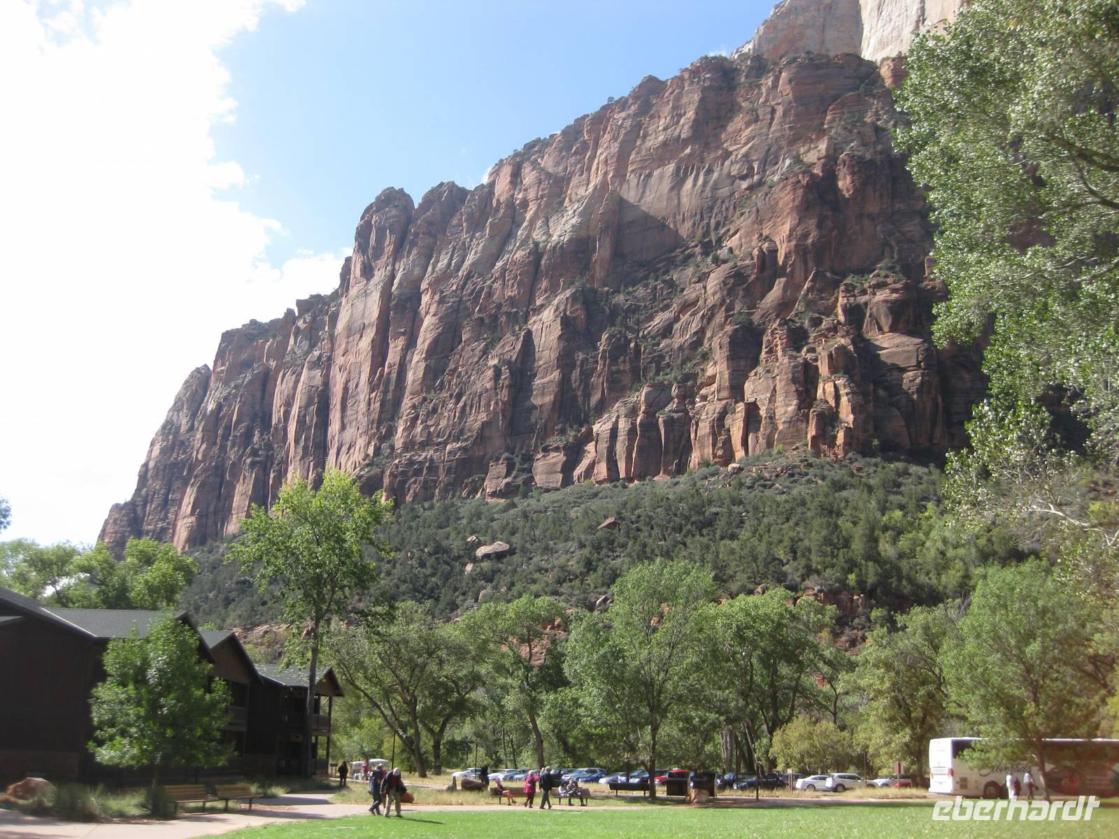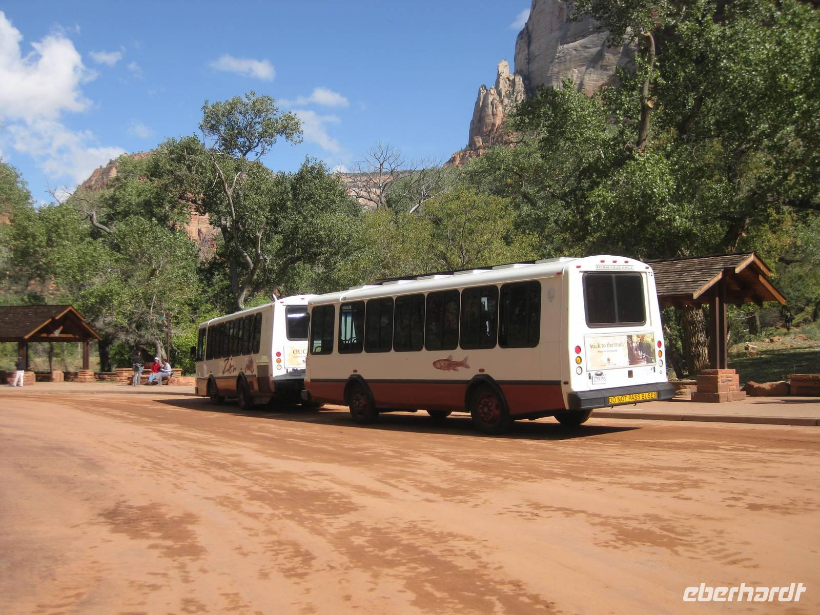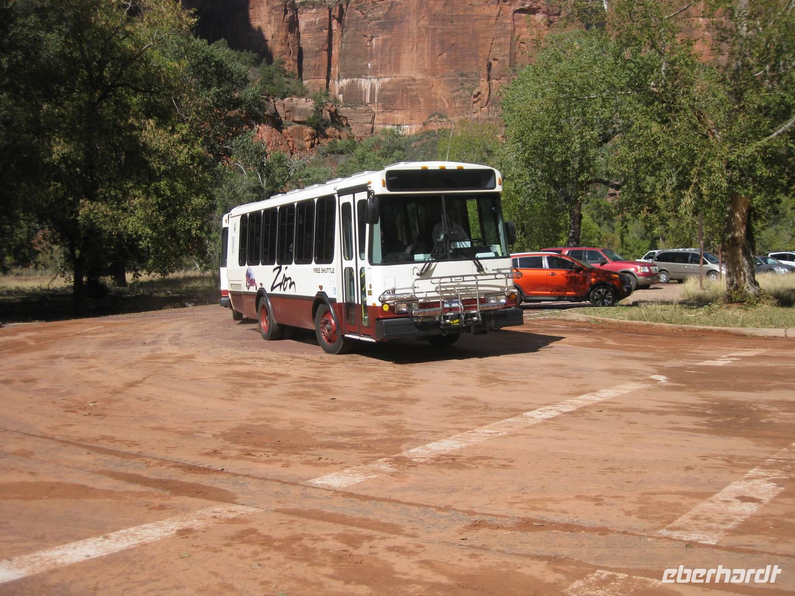 Unser erster Stopp auf dem Weg nach Las Vegas ist der Zion Nationalpark. Gleich an der Einfahrt in den Nationalpark begrüßt uns ein unübersehbarer Felsen, die Checkerboard Mesa (Schachbrettberg). Der Felsen entstand aus Sanddünen, die versteinerten und jetzt ein Schachbrettmuster aufweisen. Dann fahren wir durch einen Tunnel. Die Röhre wurde 1930 gebaut. Sie wurde auf der einen Seite mehrfach unterbrochen, so dass die gegenüberliegende Canyonwand wie ein kurzer Film erscheint. Ganz unten im Tal an einem Arm des Virgin River liegt die Zion Lodge. Hier machen wir eine längere Pause, die die meisten von uns für eine kleine Wanderung und die Mittagspause nutzen. Dann setzen wir unsere Fahrt in Richtung Las Vegas fort. Es geht wieder große Strecken durch die Wüste Nevada, denn Las Vegas liegt ja mitten in der Wüste.