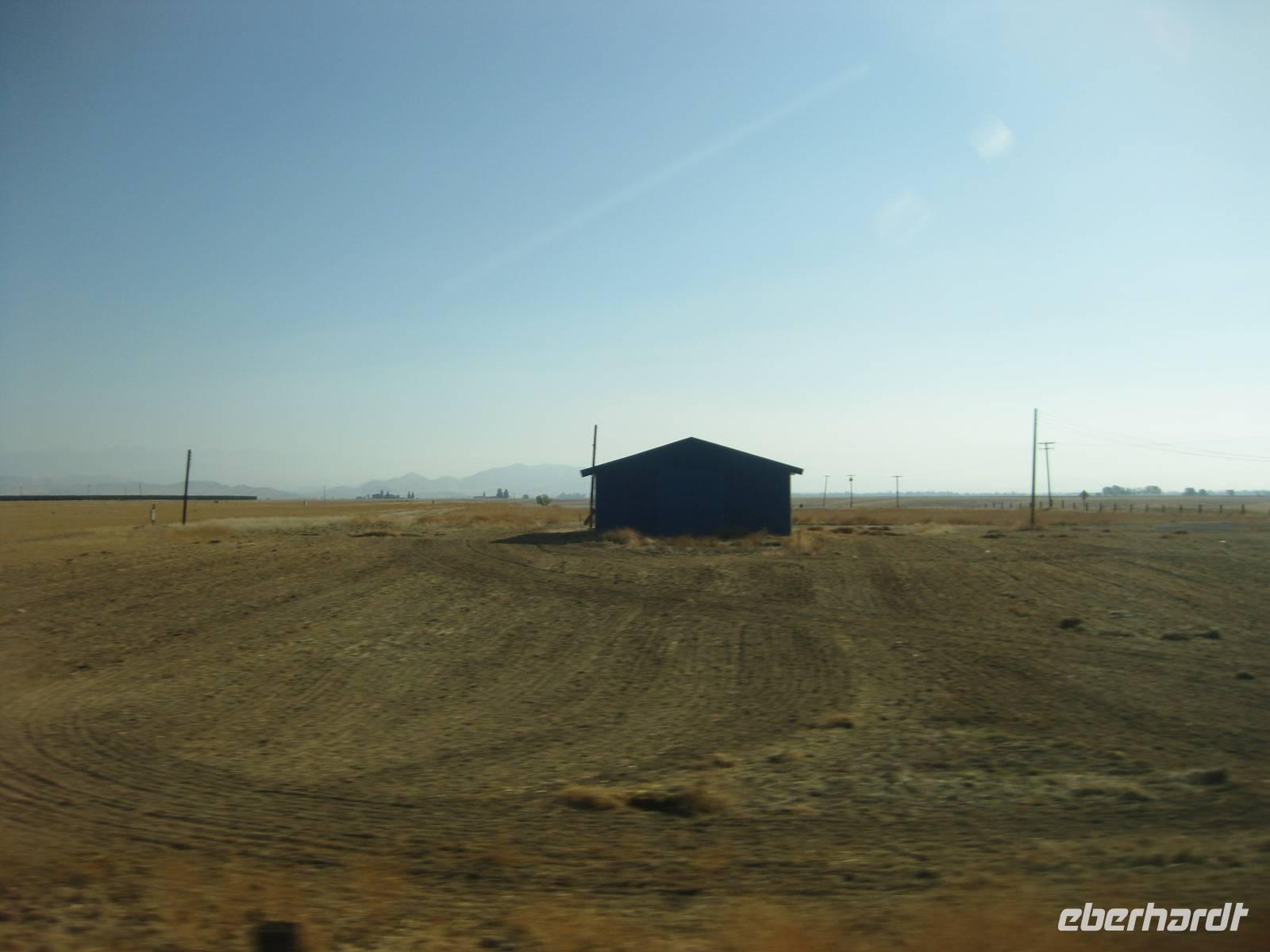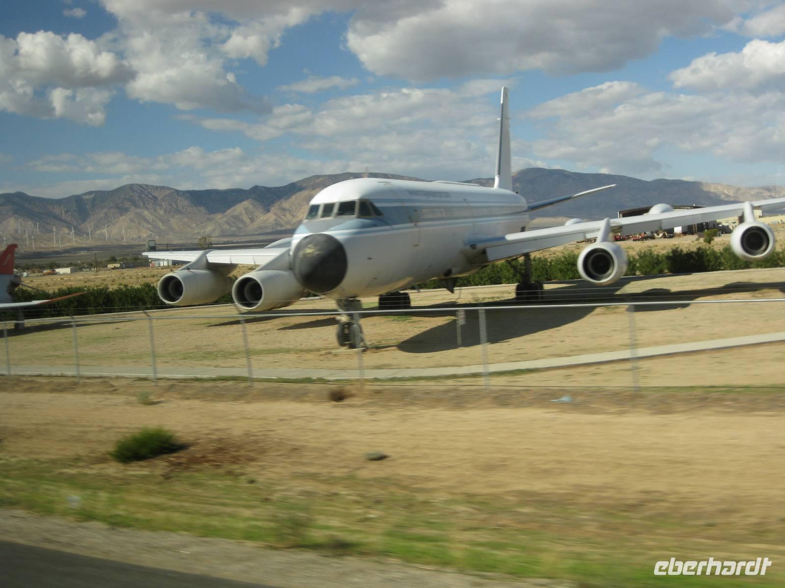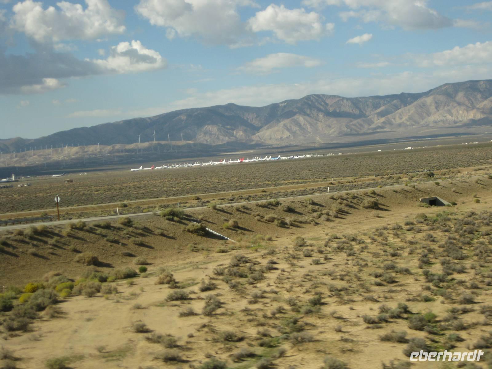 Dann geht es weiter durch die Kalifornische Wüste Mojava in Richtung Bakersfield. Wir kommen an der Edmonds Air Force Base vorbei. Hier befinden sich die Hangars für die Boing 747 und die Space Shuttles der NASA. Auf der anderen Seite des Highways befindet sich der Gebrauchtflugzeugmarkt Aerospace Valley, wo Fluggesellschaften aus aller Welt ihre gebrauchten und nicht mehr benötigten Flugzeuge zum Verkauf anbieten. Warum gerade hier? Weil hier Wüste ist - trockene und heiße Luft und die Flugzeuge rosten nicht. An der Strecke hier gibt es auch große Windparks und Solarfelder.