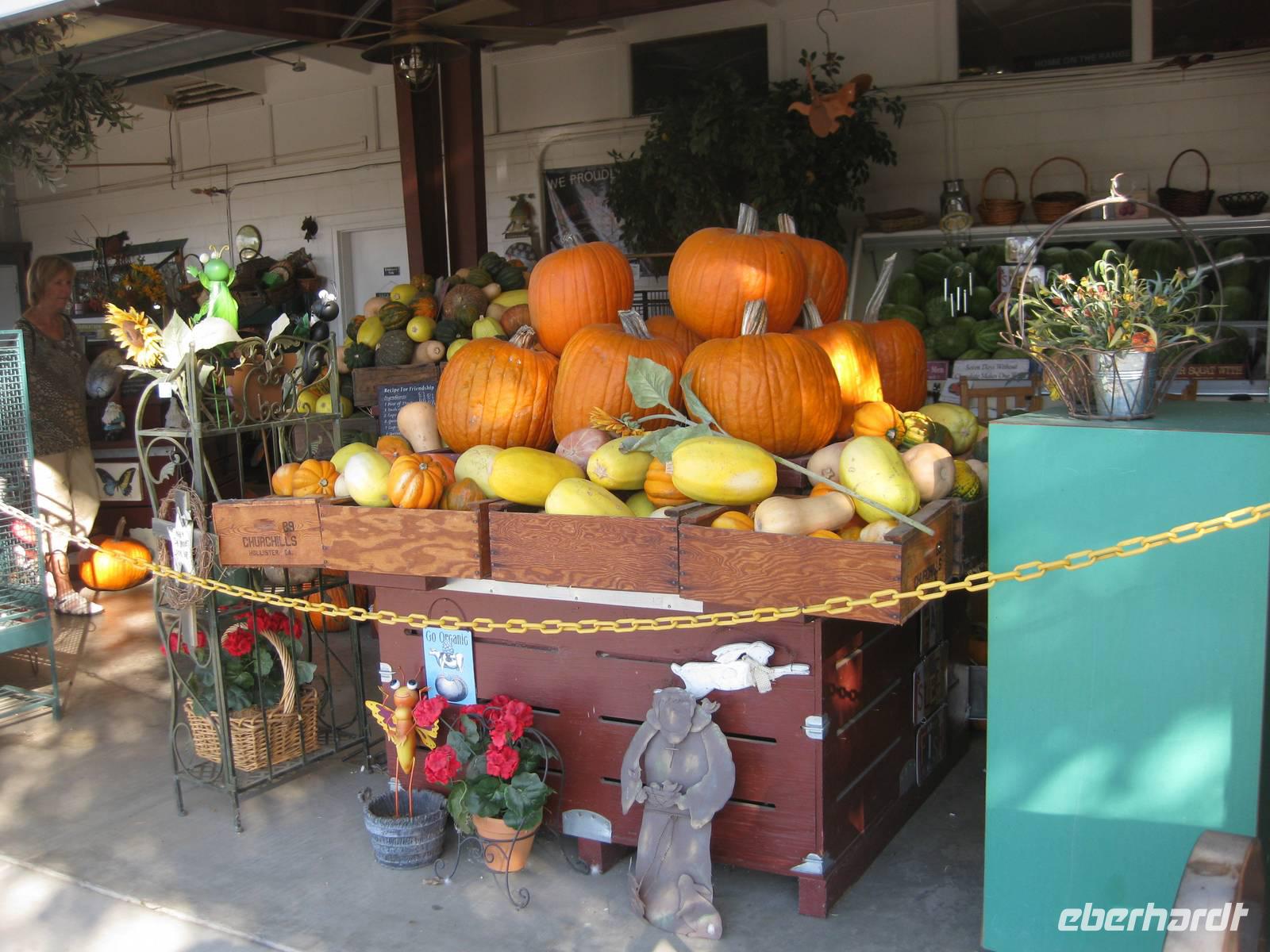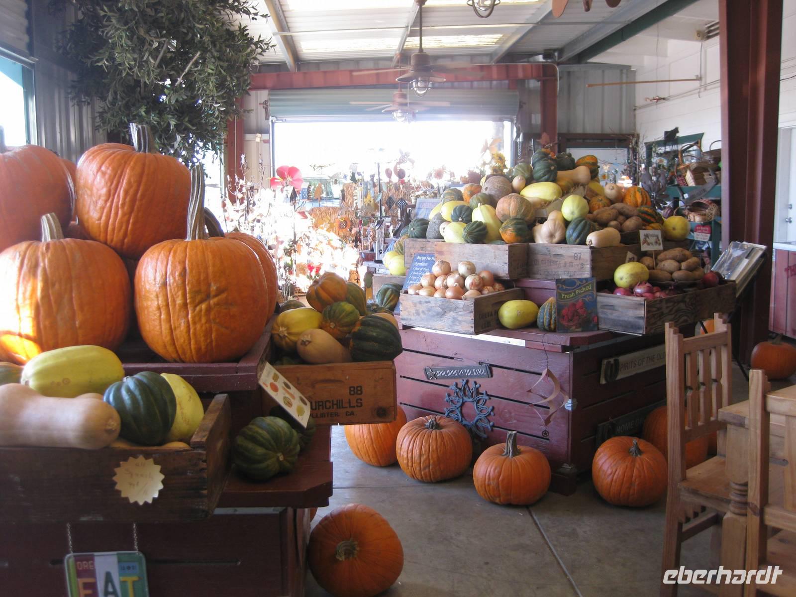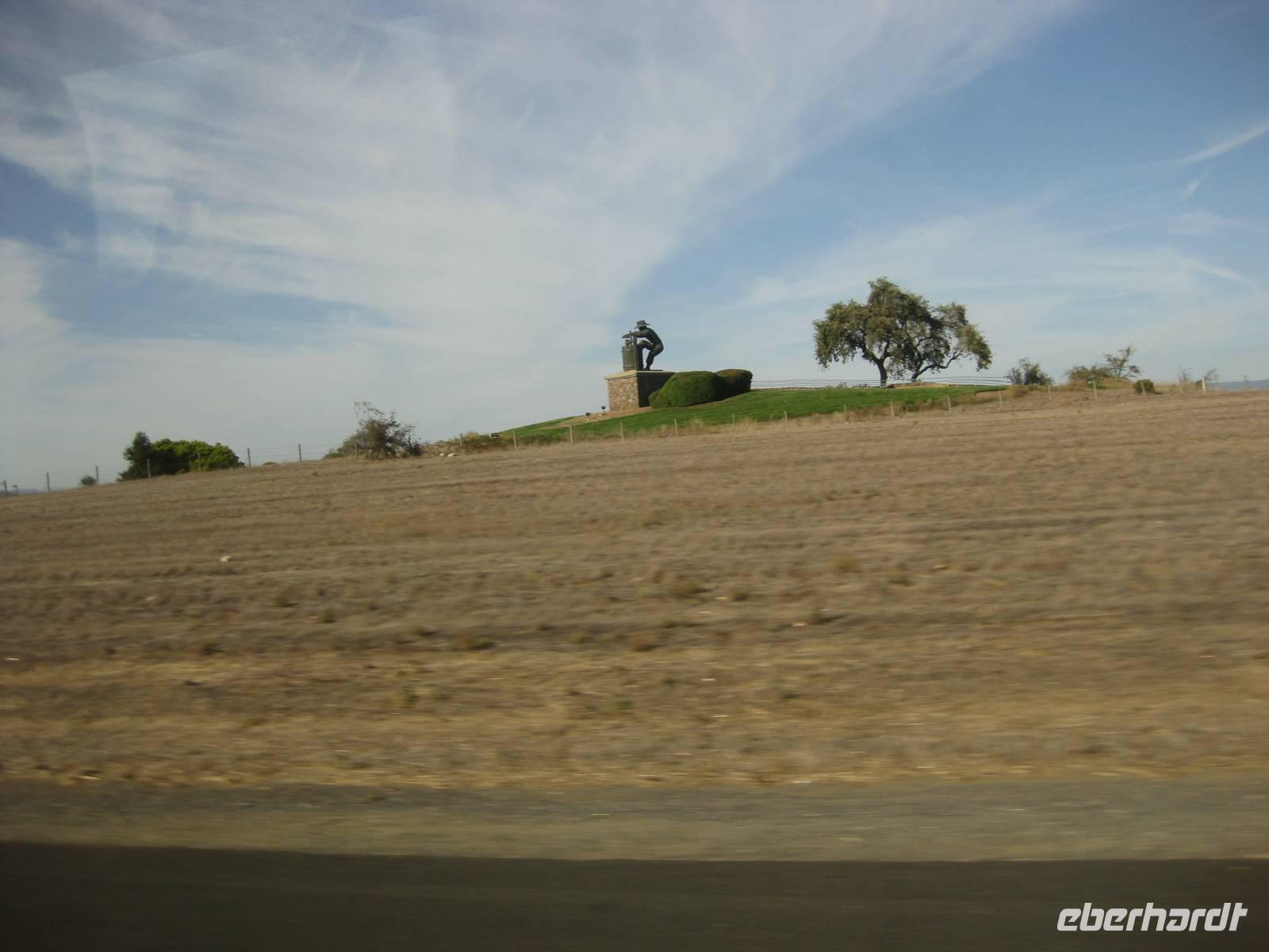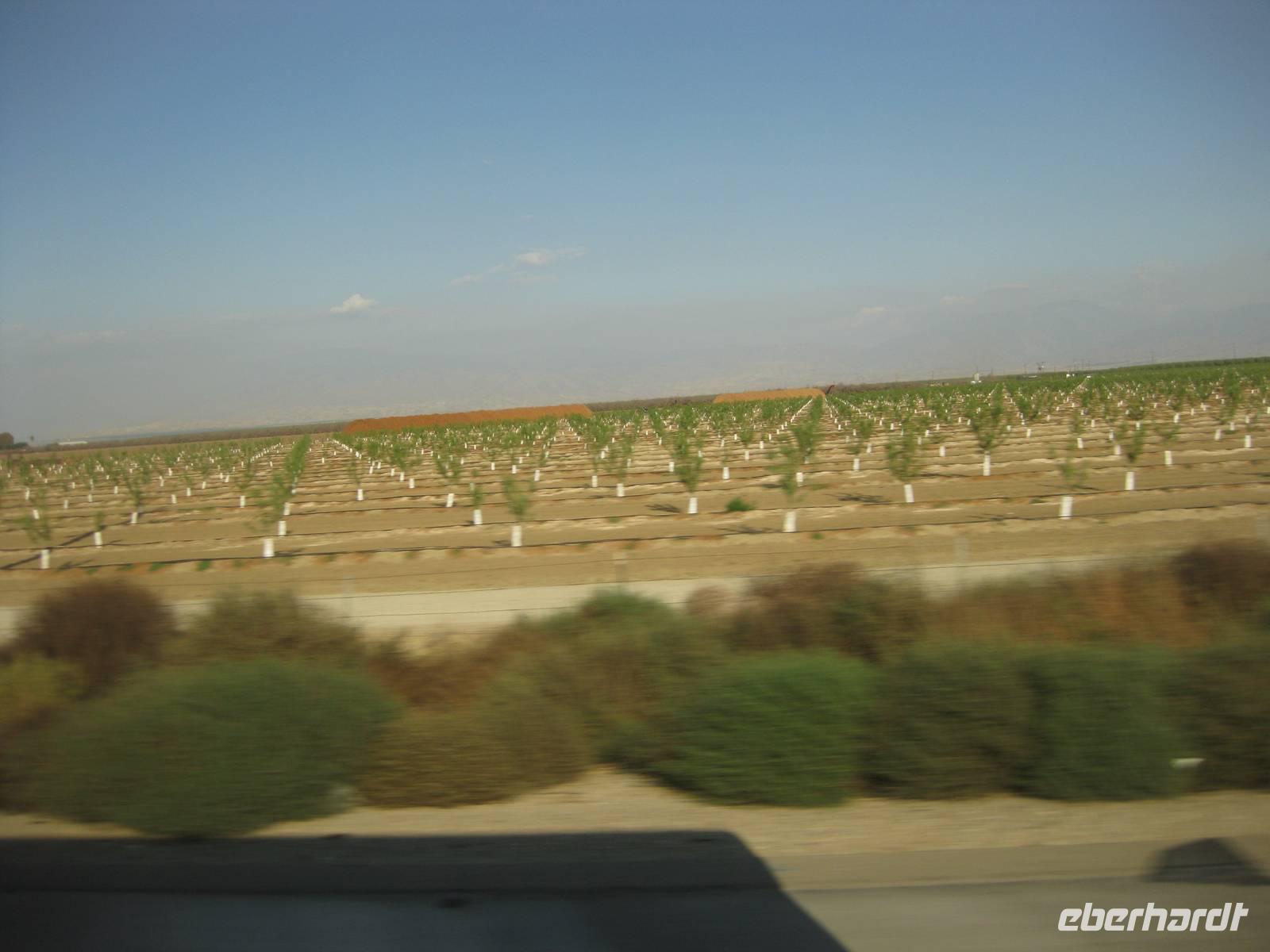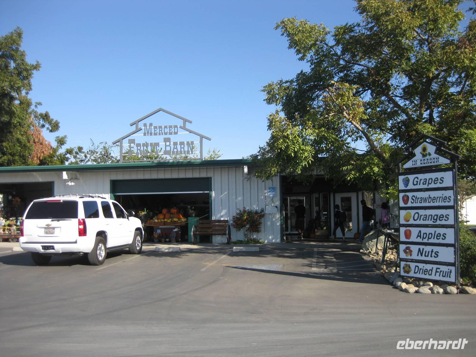 Zuerst fahren wir noch eine ganze Strecke über das Sierra Gebirge und genießen die Ausblicke über das Land. Es ist vorwiegend Weideland für die Rinder. Dann fahren wir wieder durch das fruchtbare Central Valley. Da halten wir an einem Früchtemarkt. Wir können von hier eine Kostprobe von den kalifornischen Früchten und Nüssen für die Lieben zu Hause mitnehmen.