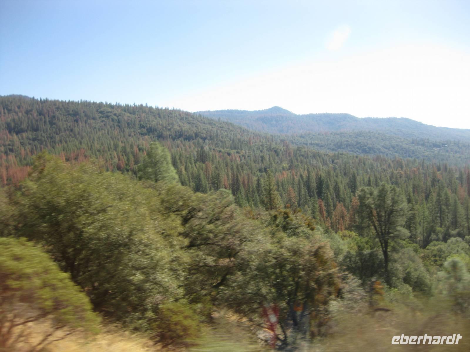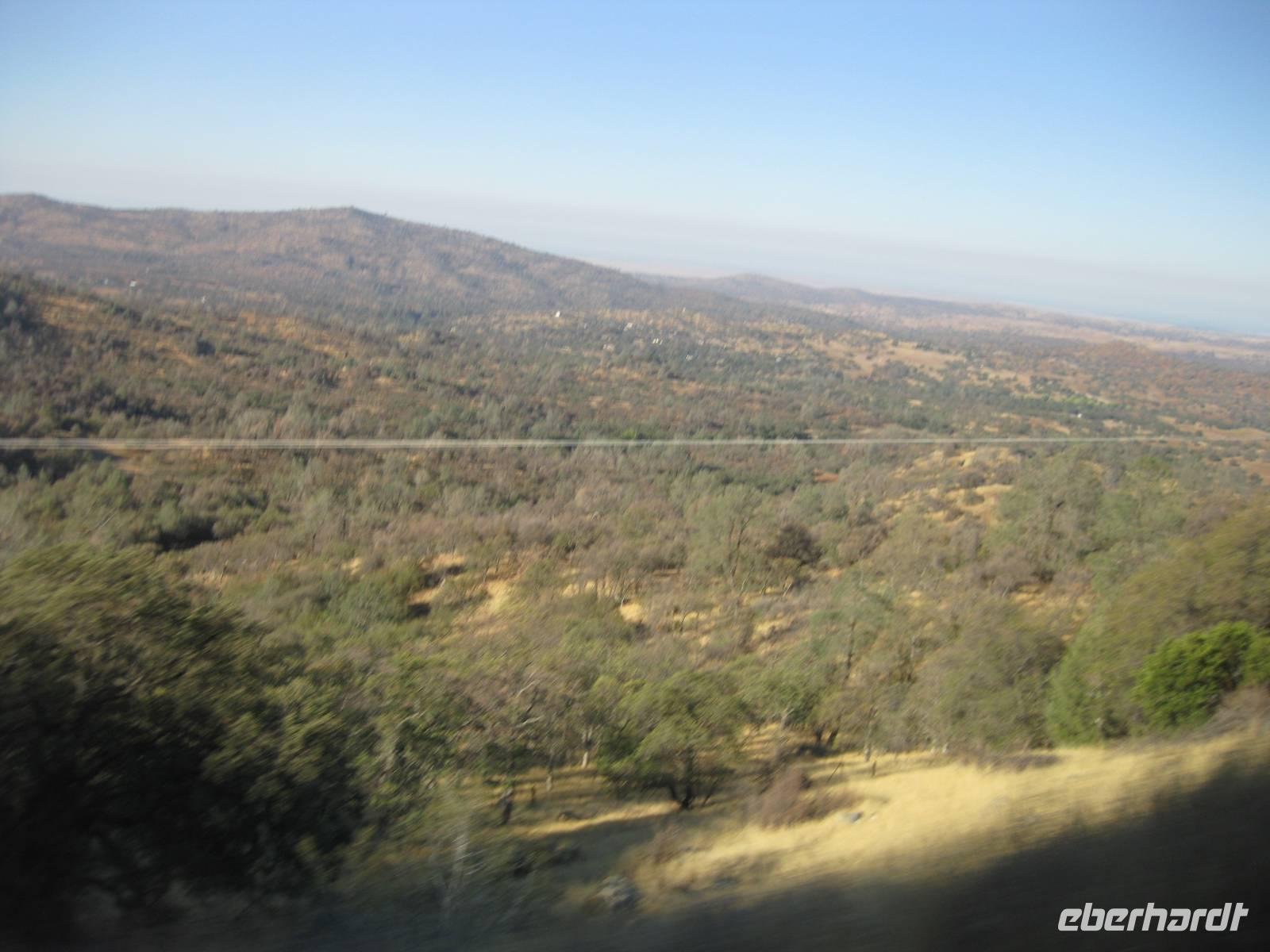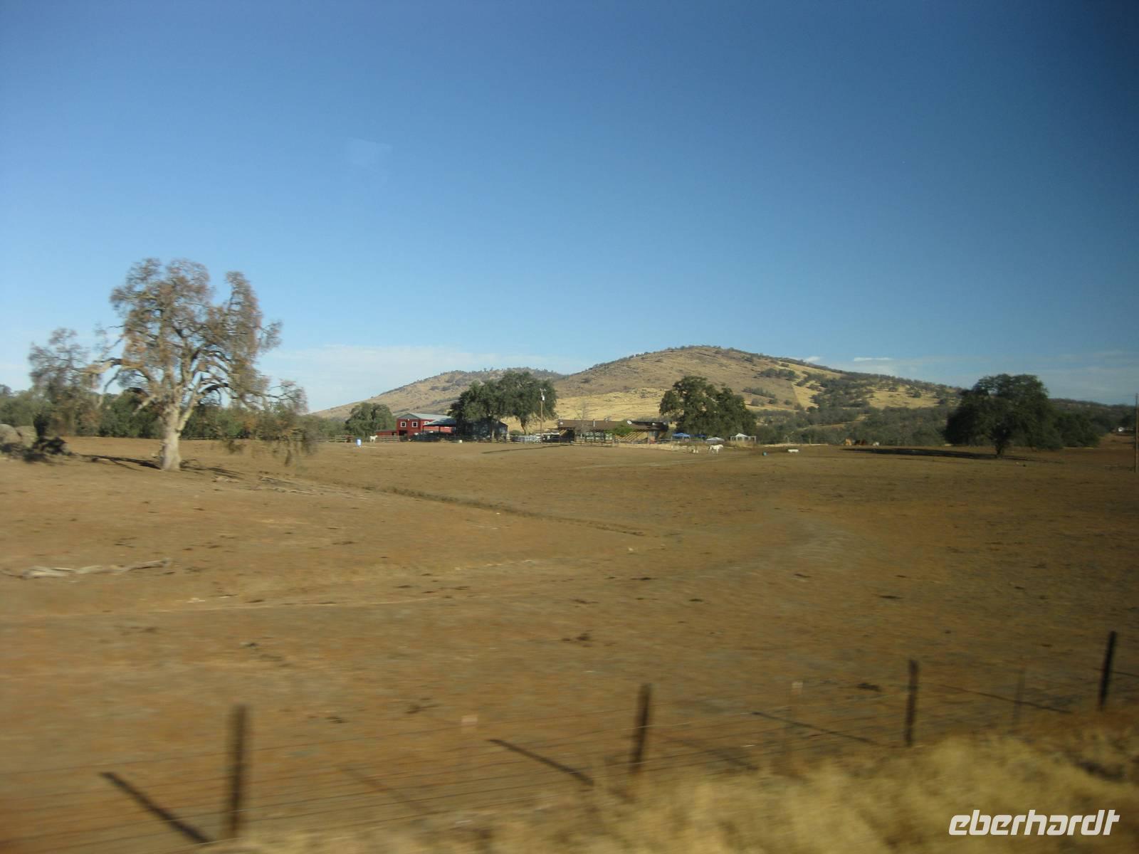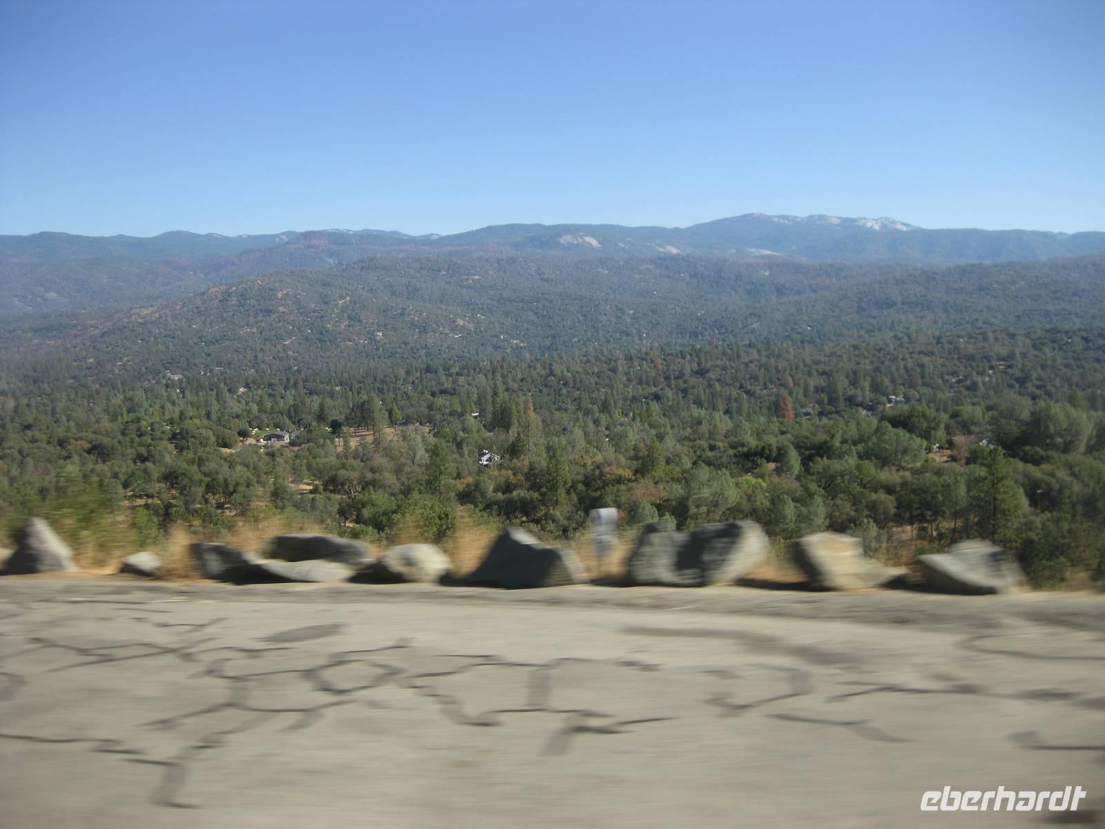 Heute fahren wir zum Yosemite-Nationalpark. Von Bakersfield aus fahren wir auf dem Interstate Highway Nr. 99 in Richtung Norden. Wir fahren durch endlose Obstplantagen, die künstlich bewässert werden. Hier gedeihen Wein, Oliven, Feigen und Nüsse. Sogar Rosinenplantagen gibt es. Kalifornien versorgt mit dem Obst die geamten USA. Nach Fresno endet das fruchtbare Central Valley. Wir biegen vom Highway Nr. 99 ab und fahren in Richtung Oakhurst. Die Fahrt geht durch dürres, felsiges Ranchland und dann durch kleine Goldgräberorte. Bald erreichen wir Oakhurst, wo wir unser heutiges Mittagspicknick im Supermarkt einkaufen.