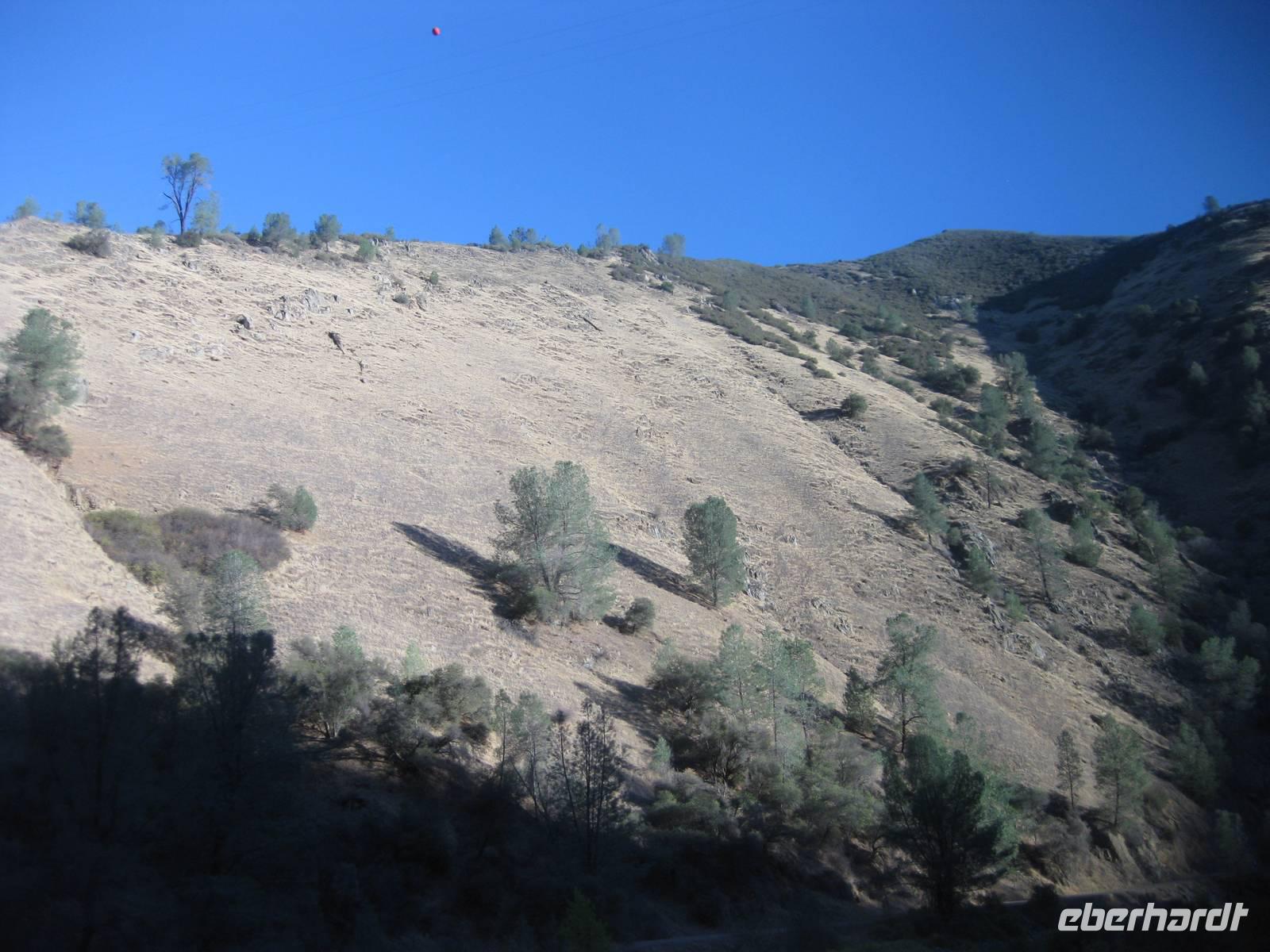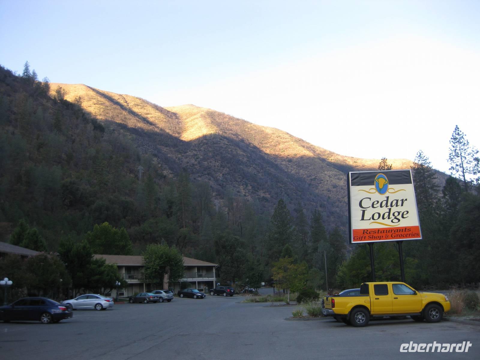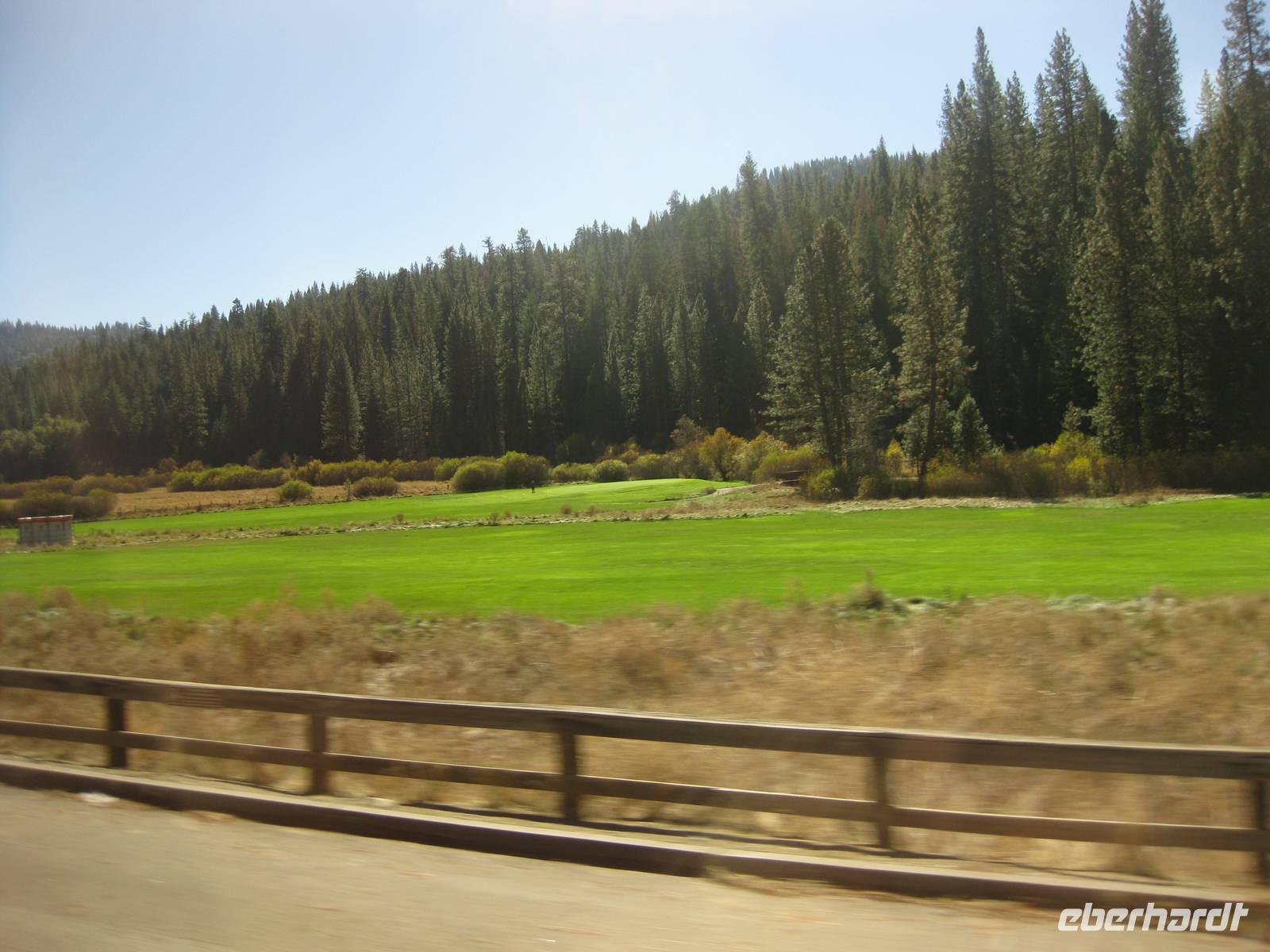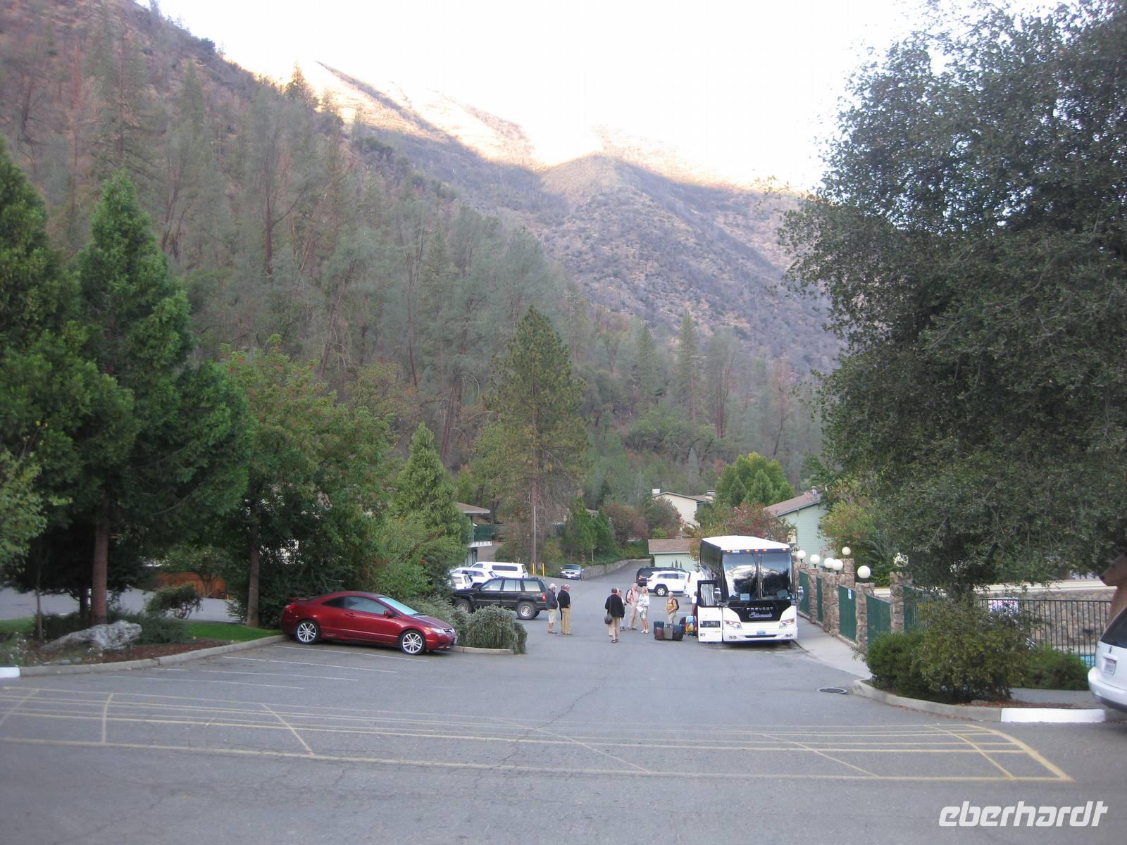 Heute fahren wir zum Yosemite-Nationalpark. Von Bakersfield aus fahren wir auf dem Interstate Highway Nr. 99 in Richtung Norden. Wir fahren durch endlose Obstplantagen, die künstlich bewässert werden. Hier gedeihen Wein, Oliven, Feigen und Nüsse. Sogar Rosinenplantagen gibt es. Kalifornien versorgt mit dem Obst die geamten USA. Nach Fresno endet das fruchtbare Central Valley. Wir biegen vom Highway Nr. 99 ab und fahren in Richtung Oakhurst. Die Fahrt geht durch dürres, felsiges Ranchland und dann durch kleine Goldgräberorte. Bald erreichen wir Oakhurst, wo wir unser heutiges Mittagspicknick im Supermarkt einkaufen.