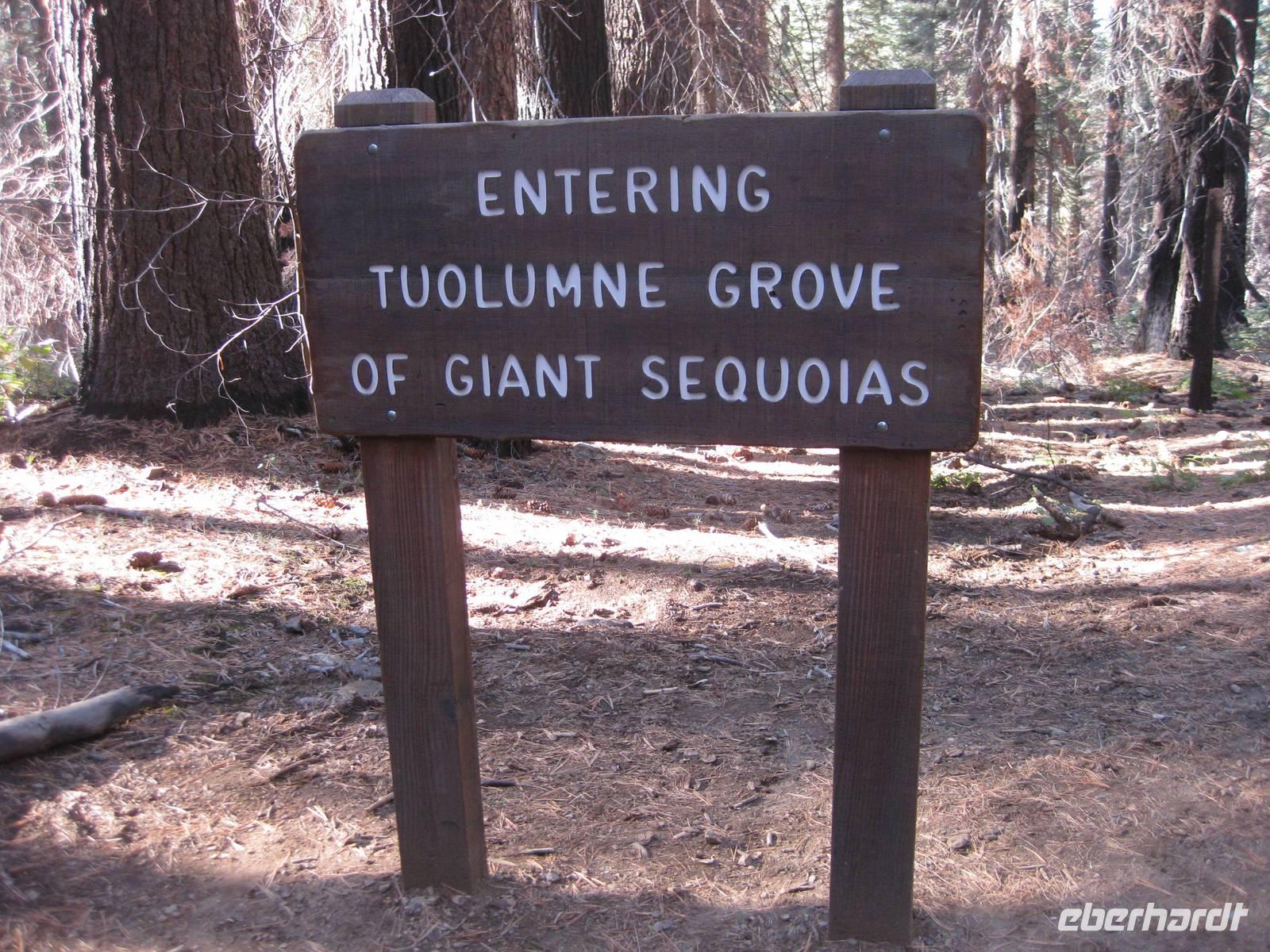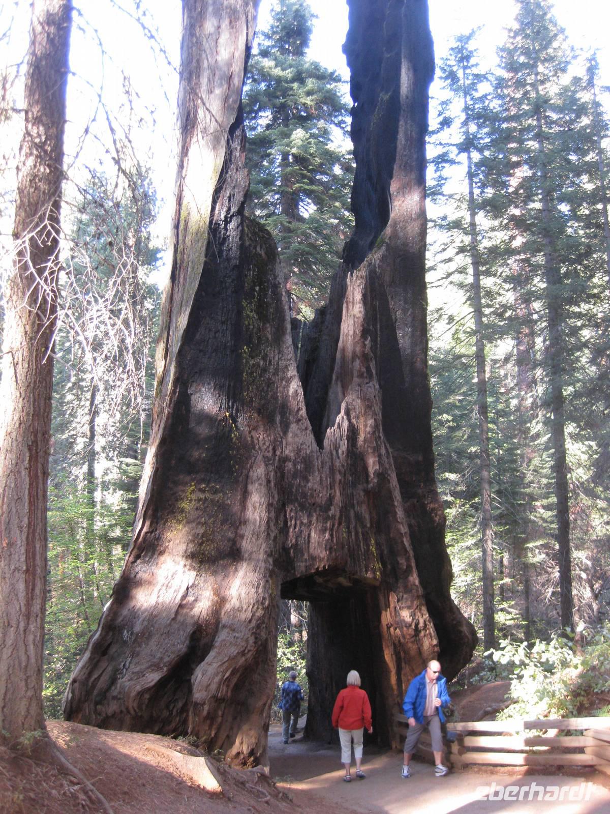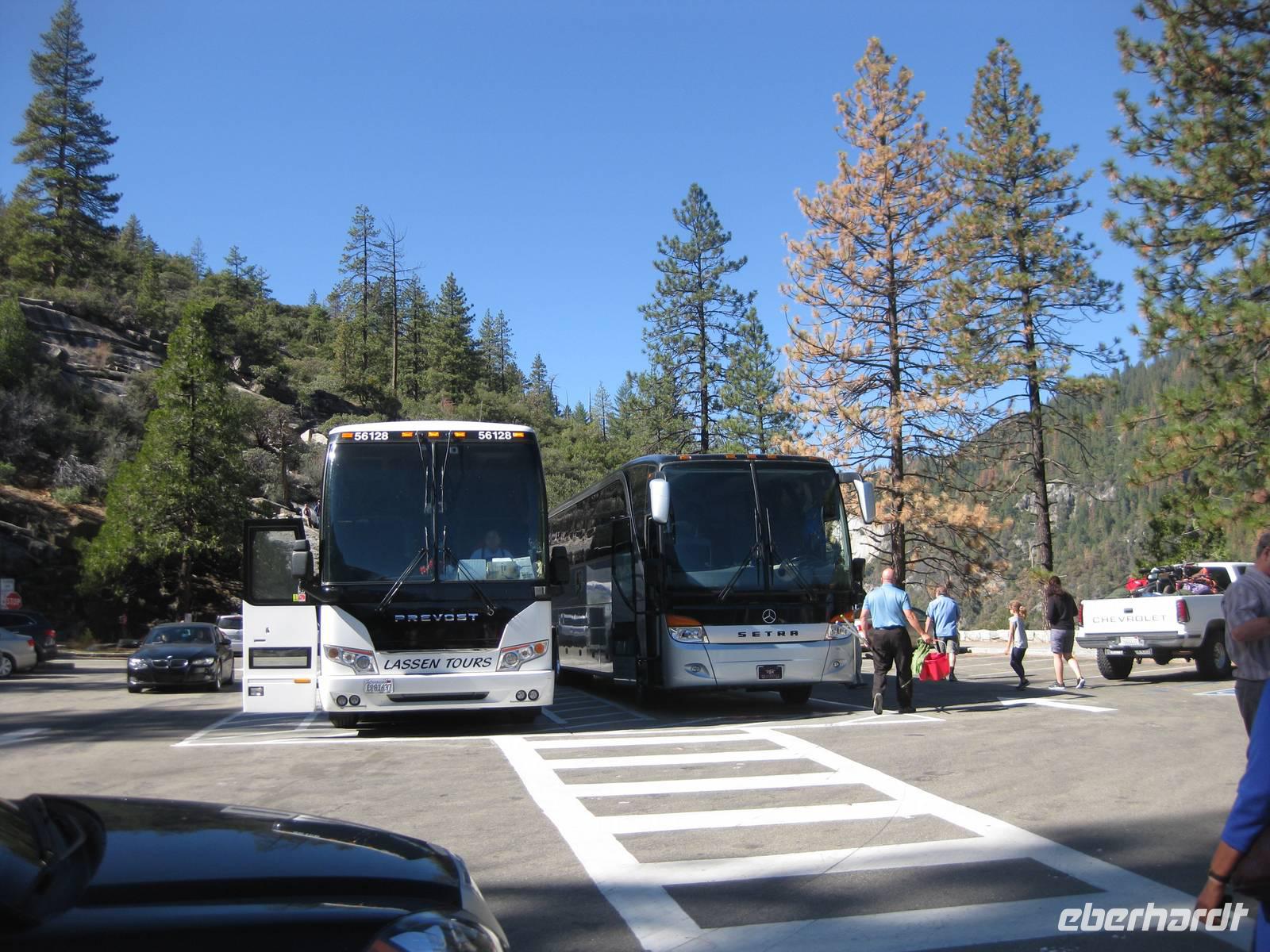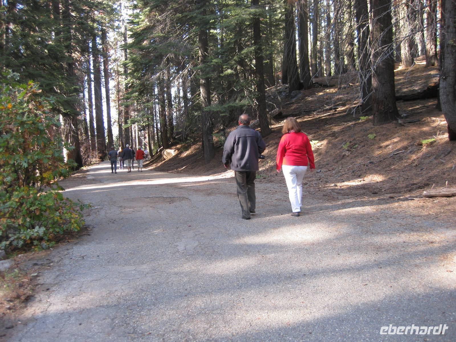 Dann geht es hinauf zum Yosemite Nationalpark. Wir fahren durch Wälder bis zu einem ersten tollen Aussichtspunkt. Es bietet sich ein fantastischer Blick auf die Berge, fast wie in den Alpen. Dann geht es hinunter in's Merced Tal. Die Granitwände der Berge stürzen senkrecht in das Tal hinab. Am Merced River suchen wir uns einen Platz unter Mammutbäumen und Kiefern für unser Picknick. Am Nachmittag fahren wir hinauf zum Tuolumne Grove Trail, wo es viele Mammutbäume (giant sequoia) gibt. Wir machen eine kleine Wanderung und bestaunen die Bäume.
