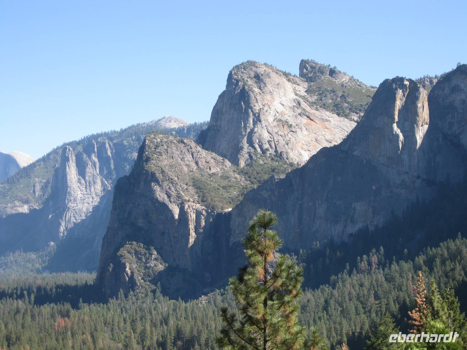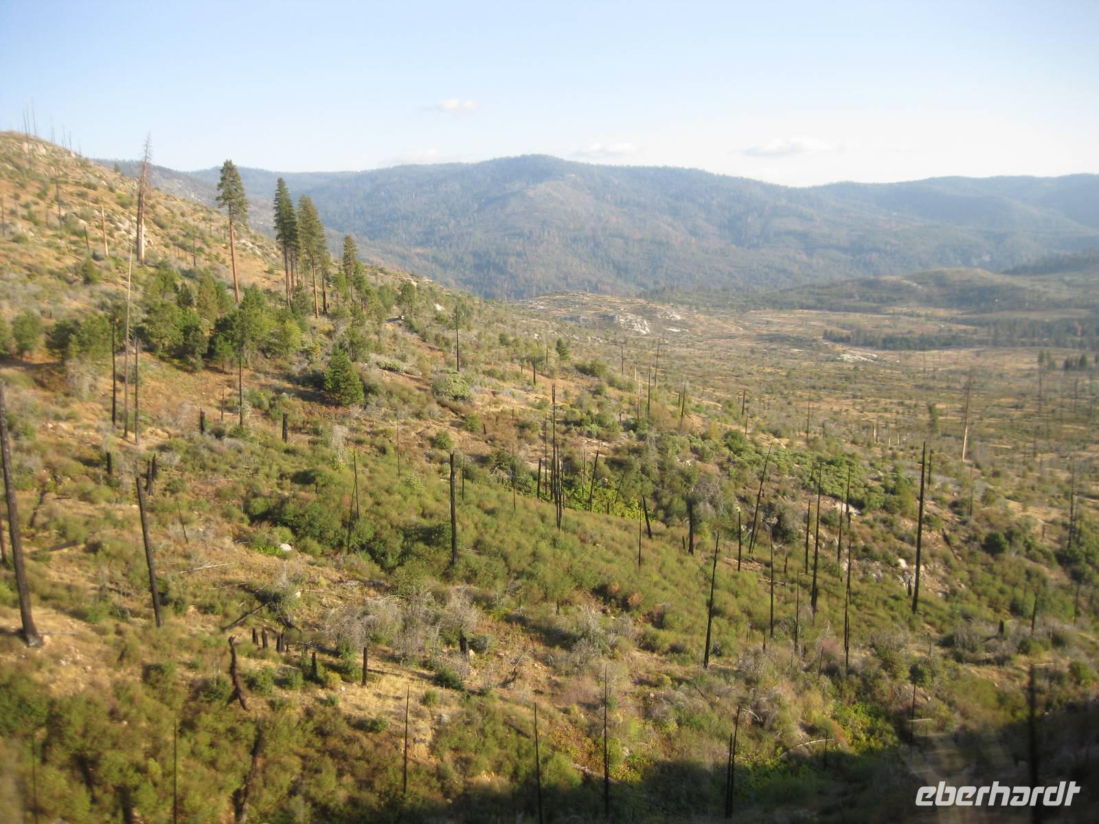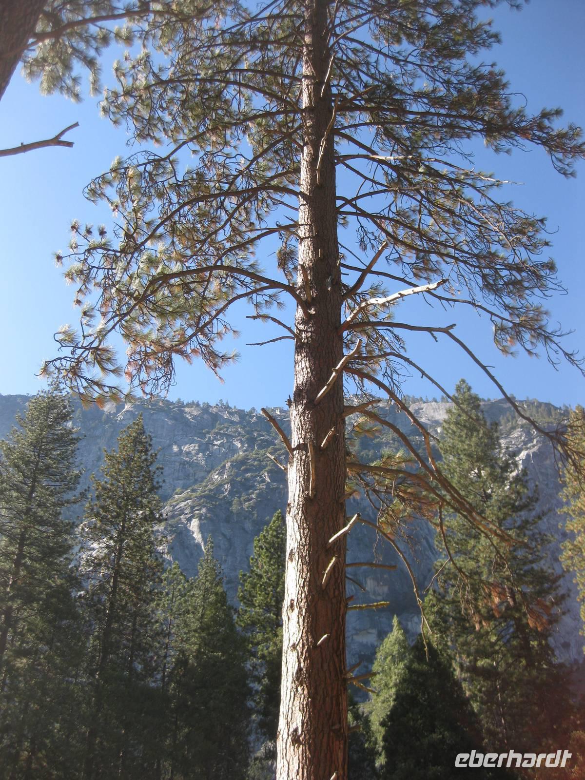 Dann geht es hinauf zum Yosemite Nationalpark. Wir fahren durch Wälder bis zu einem ersten tollen Aussichtspunkt. Es bietet sich ein fantastischer Blick auf die Berge, fast wie in den Alpen. Dann geht es hinunter in's Merced Tal. Die Granitwände der Berge stürzen senkrecht in das Tal hinab. Am Merced River suchen wir uns einen Platz unter Mammutbäumen und Kiefern für unser Picknick. Am Nachmittag fahren wir hinauf zum Tuolumne Grove Trail, wo es viele Mammutbäume (giant sequoia) gibt. Wir machen eine kleine Wanderung und bestaunen die Bäume.