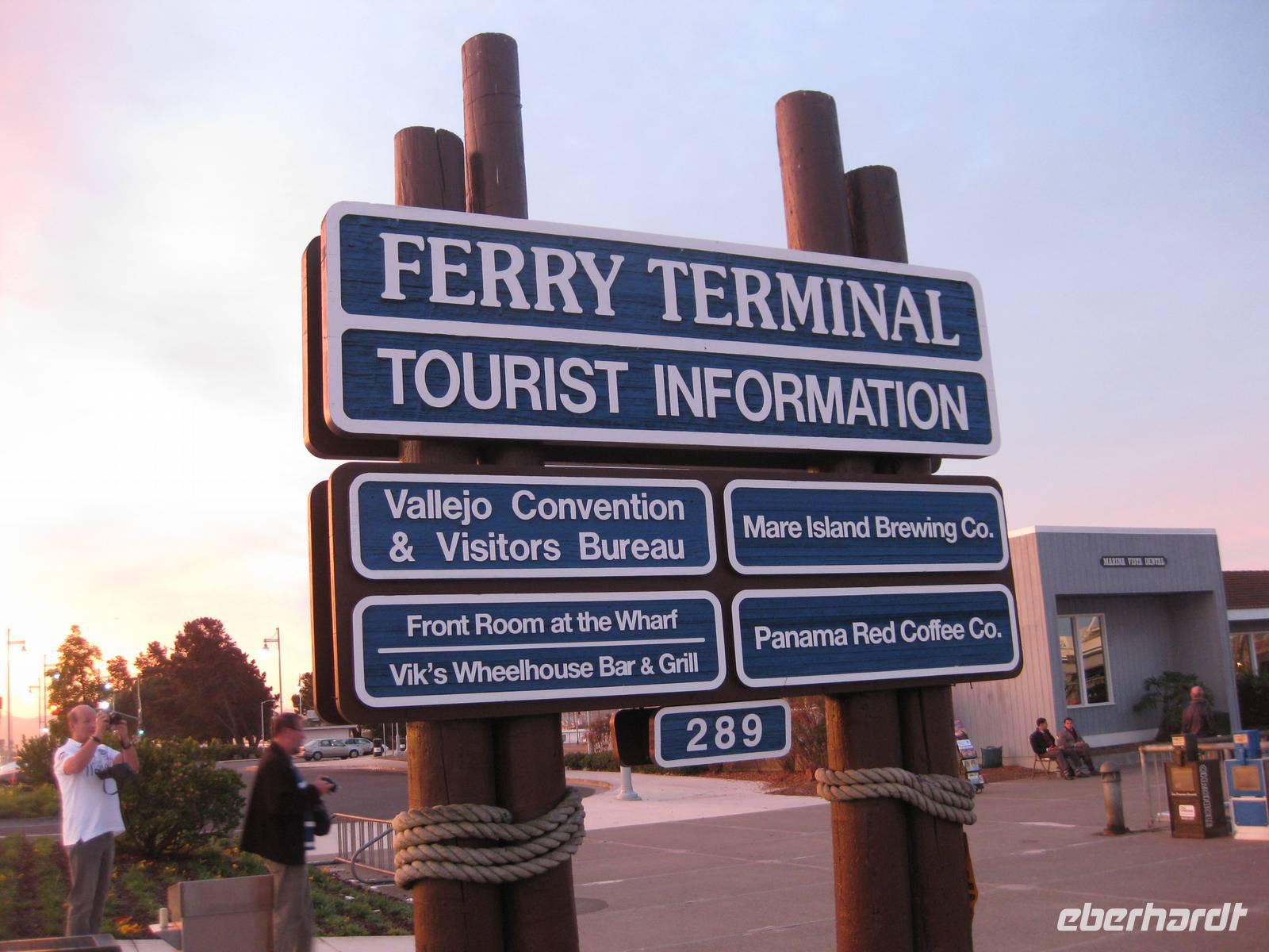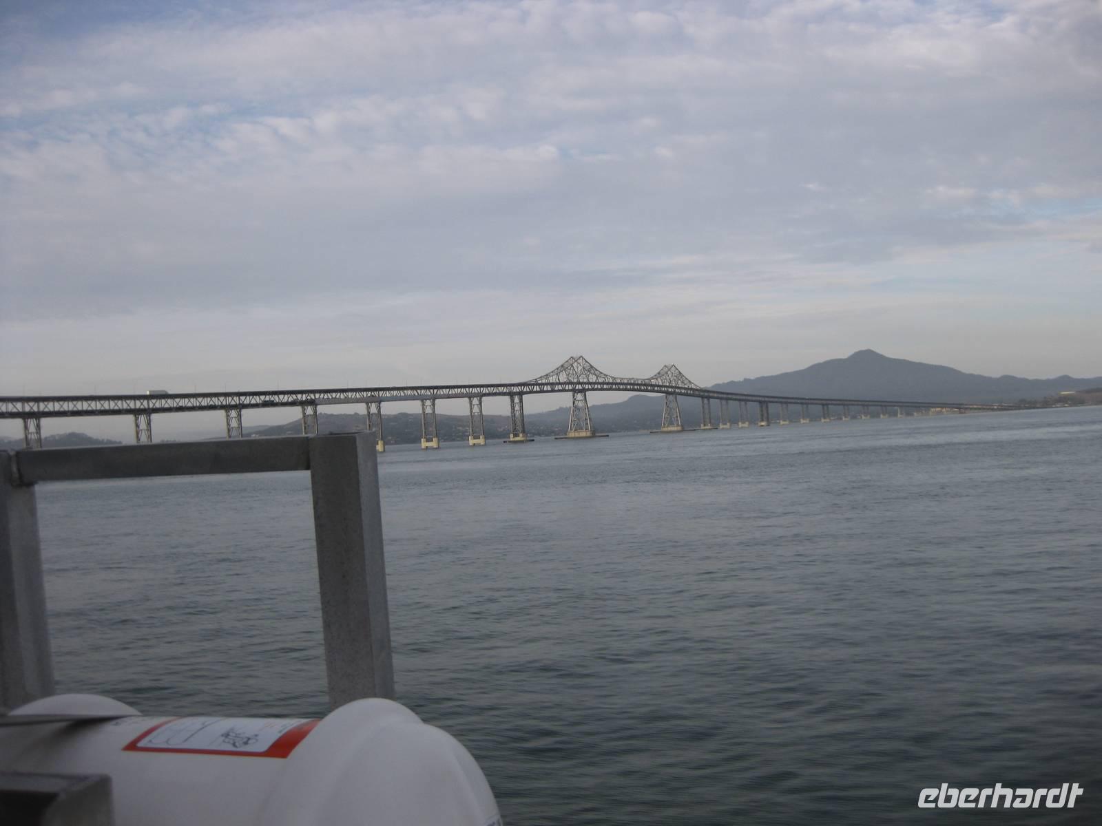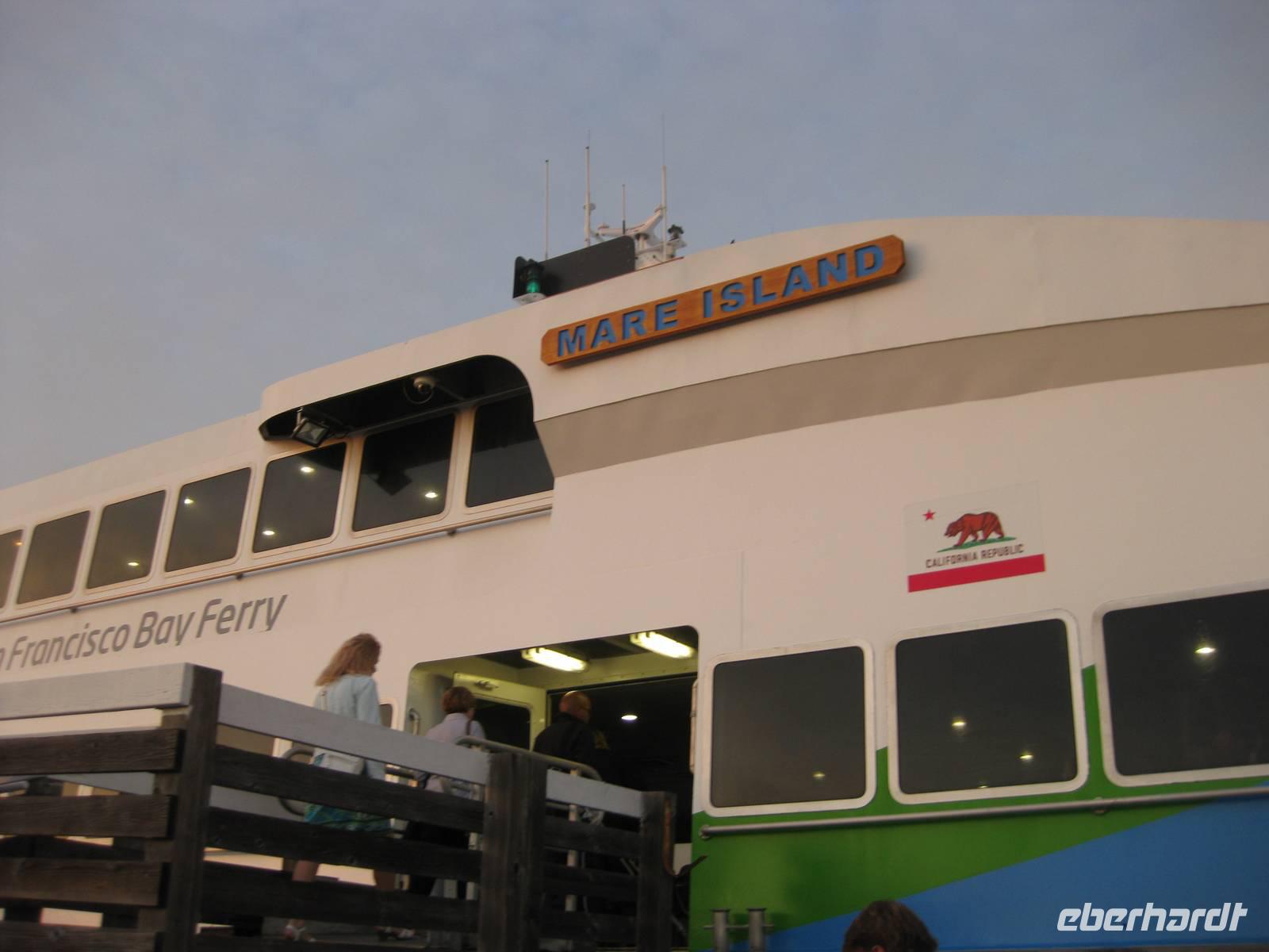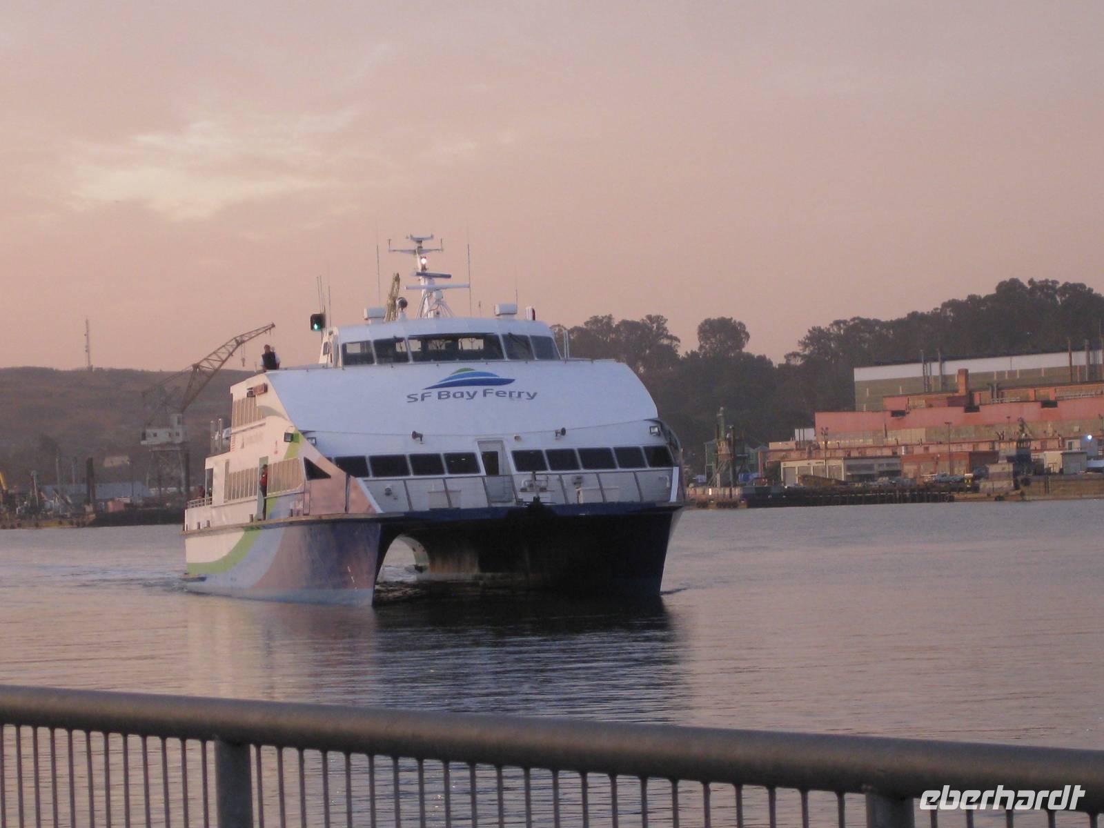 Heute geht es schon zeitig los. Wir können den Sonnenaufgang auf der Fahrt zu Fähre nach San Francisco beobachten. In Vallejo unweit vomHotel ist der Fähranleger. Derrick fährt mit dem Bus und unserem Gepäck auf dem Land nach San Francisco. Dort werden wir ihn am Fährterminal wieder treffen. Wir fahren ca. eine Stunde mit der Fähre und können San Francisco schon etwas vom Wasser aus sehen. Leider hüllt es sich zum Teil in Nebel, so dass wir nicht allzuviel sehen. Wir können die San Francisco-Oakland Bay Bridge sehen, die Golden Gate Bridge leider noch nicht. Die Skyline von San Francisco begrüßt uns.