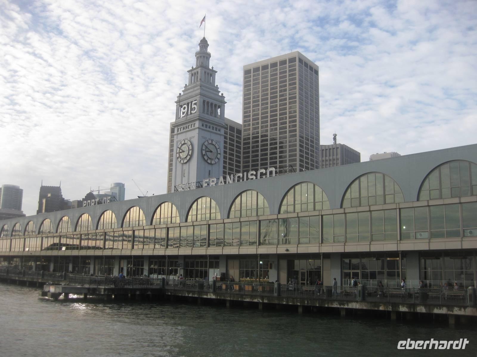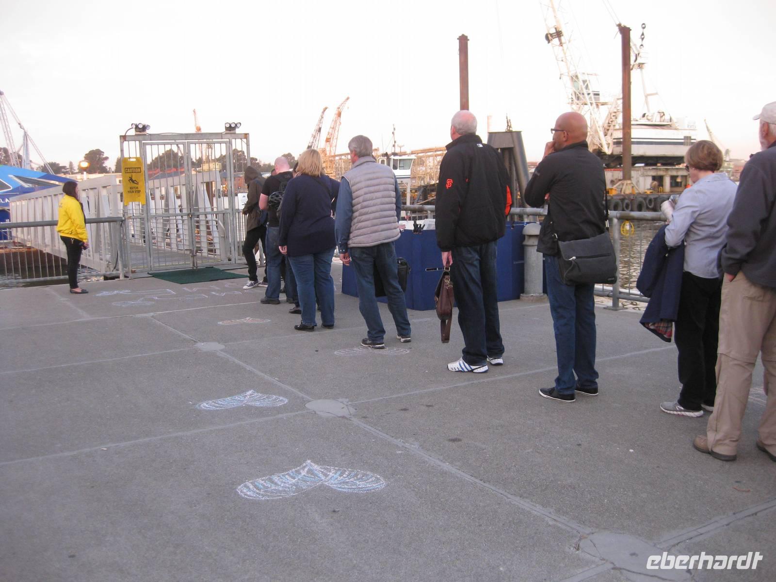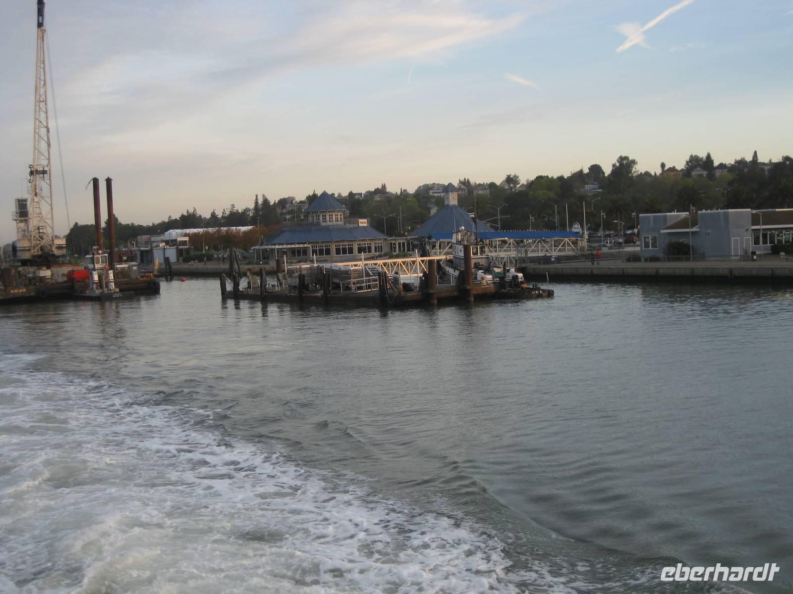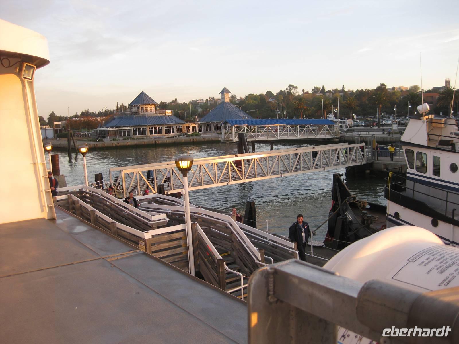 Heute geht es schon zeitig los. Wir können den Sonnenaufgang auf der Fahrt zu Fähre nach San Francisco beobachten. In Vallejo unweit vomHotel ist der Fähranleger. Derrick fährt mit dem Bus und unserem Gepäck auf dem Land nach San Francisco. Dort werden wir ihn am Fährterminal wieder treffen. Wir fahren ca. eine Stunde mit der Fähre und können San Francisco schon etwas vom Wasser aus sehen. Leider hüllt es sich zum Teil in Nebel, so dass wir nicht allzuviel sehen. Wir können die San Francisco-Oakland Bay Bridge sehen, die Golden Gate Bridge leider noch nicht. Die Skyline von San Francisco begrüßt uns.