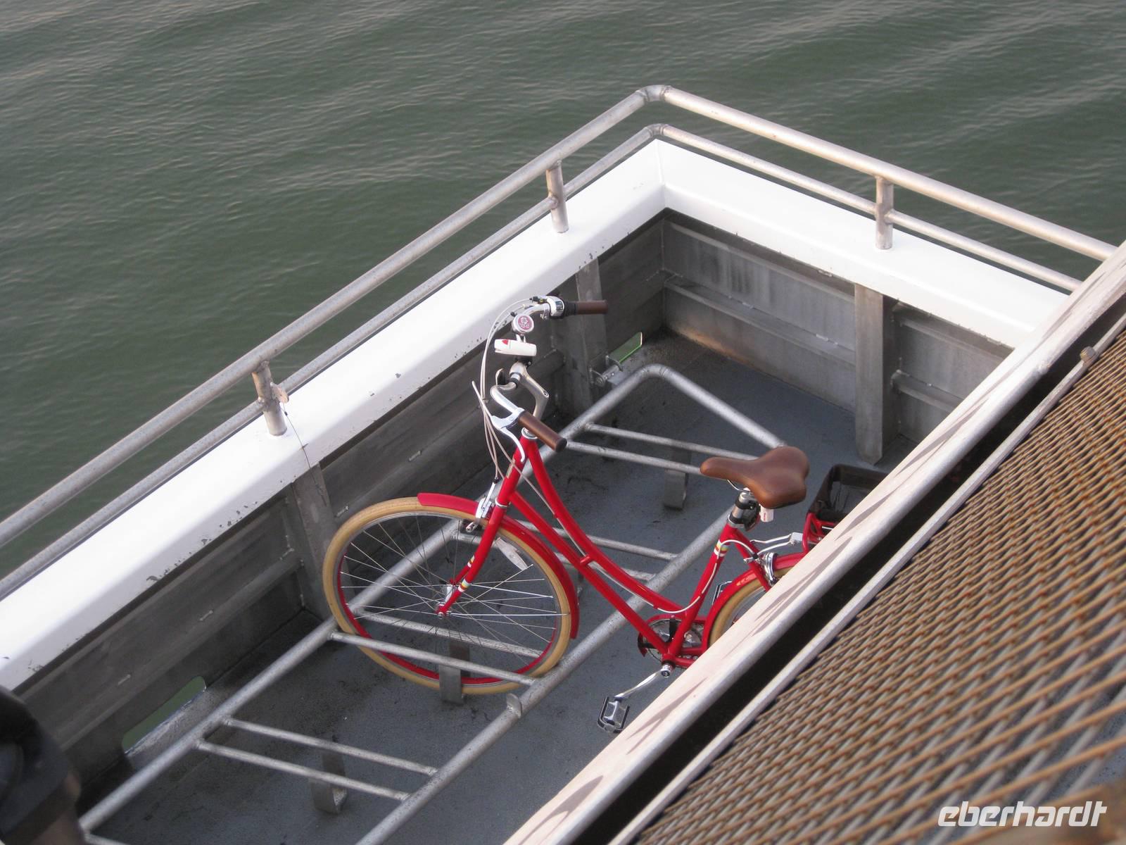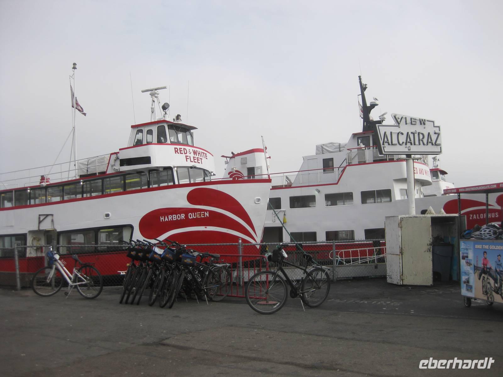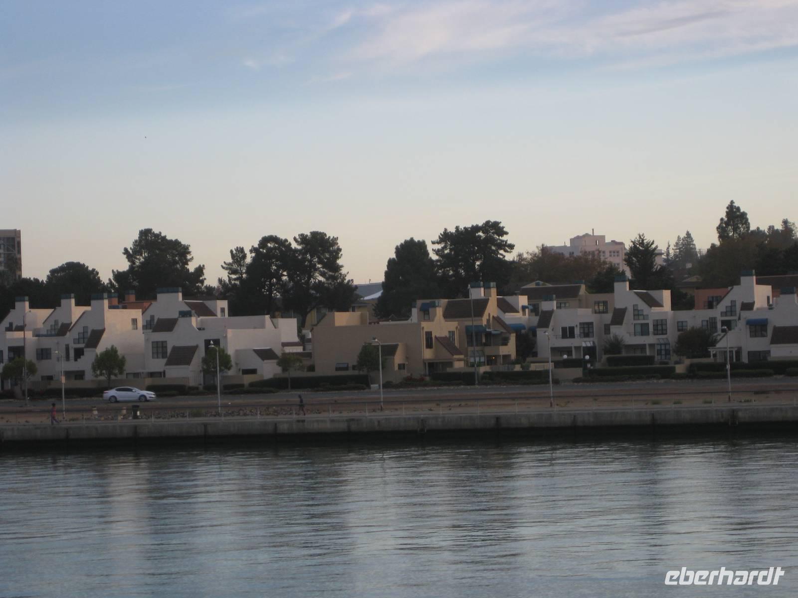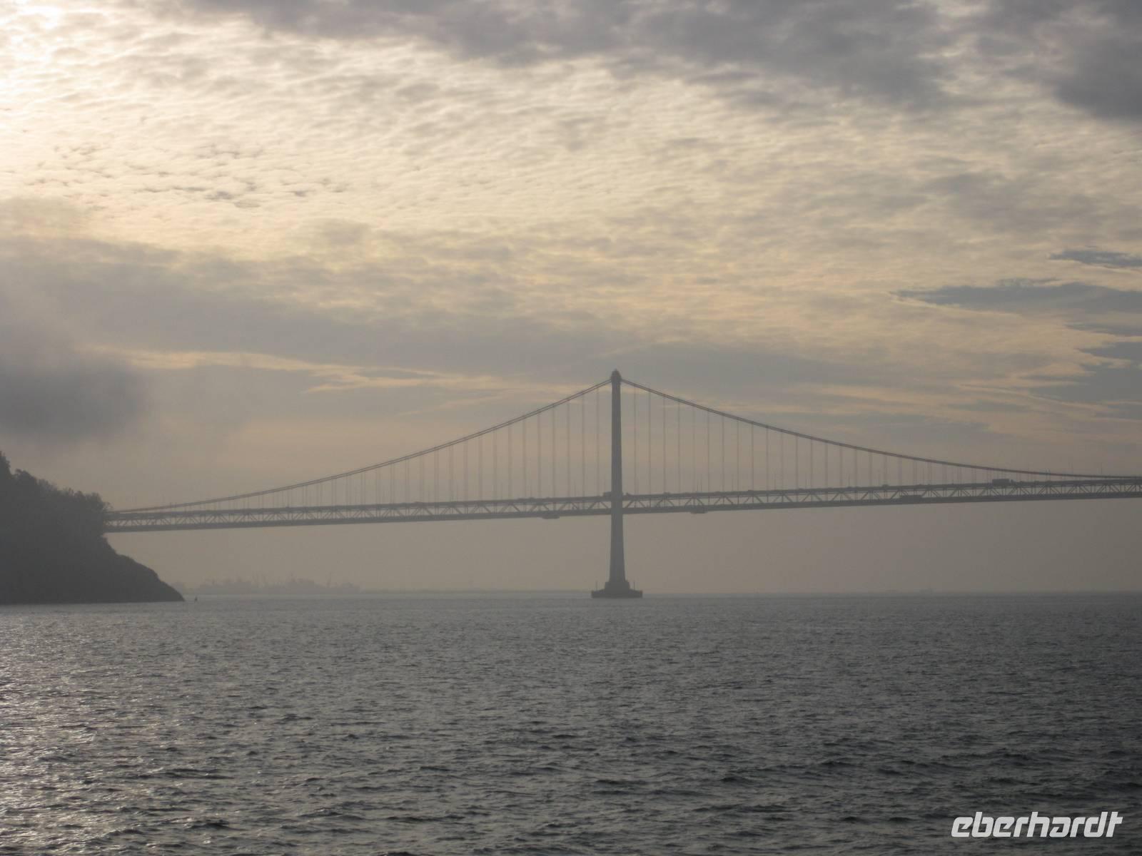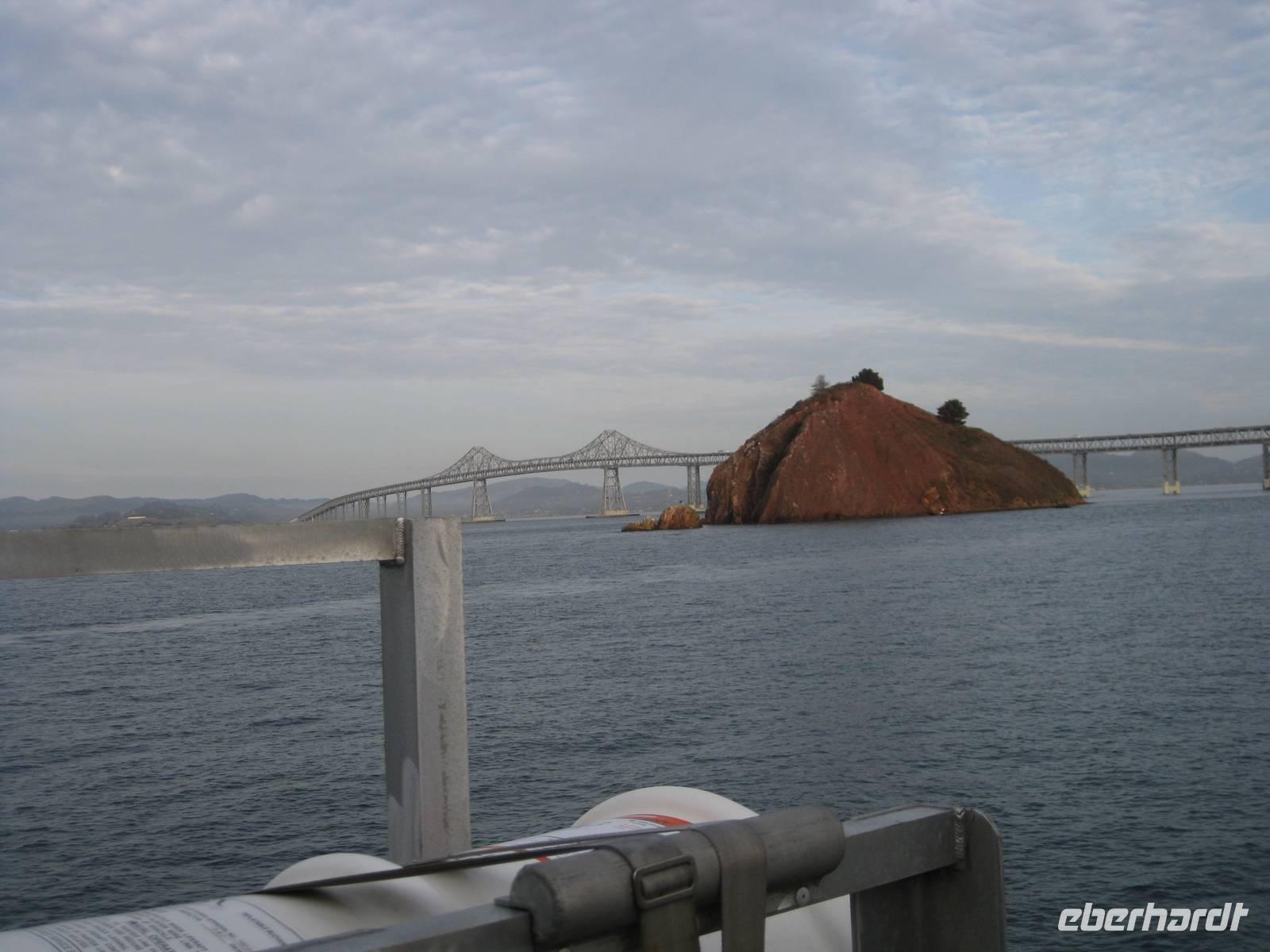 Heute geht es schon zeitig los. Wir können den Sonnenaufgang auf der Fahrt zu Fähre nach San Francisco beobachten. In Vallejo unweit vomHotel ist der Fähranleger. Derrick fährt mit dem Bus und unserem Gepäck auf dem Land nach San Francisco. Dort werden wir ihn am Fährterminal wieder treffen. Wir fahren ca. eine Stunde mit der Fähre und können San Francisco schon etwas vom Wasser aus sehen. Leider hüllt es sich zum Teil in Nebel, so dass wir nicht allzuviel sehen. Wir können die San Francisco-Oakland Bay Bridge sehen, die Golden Gate Bridge leider noch nicht. Die Skyline von San Francisco begrüßt uns.