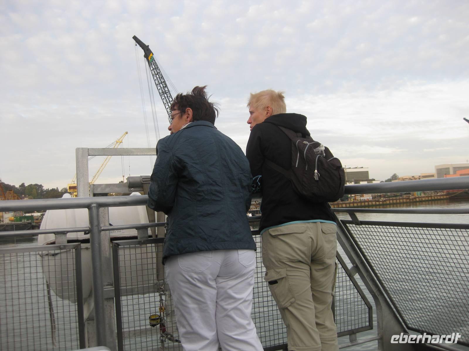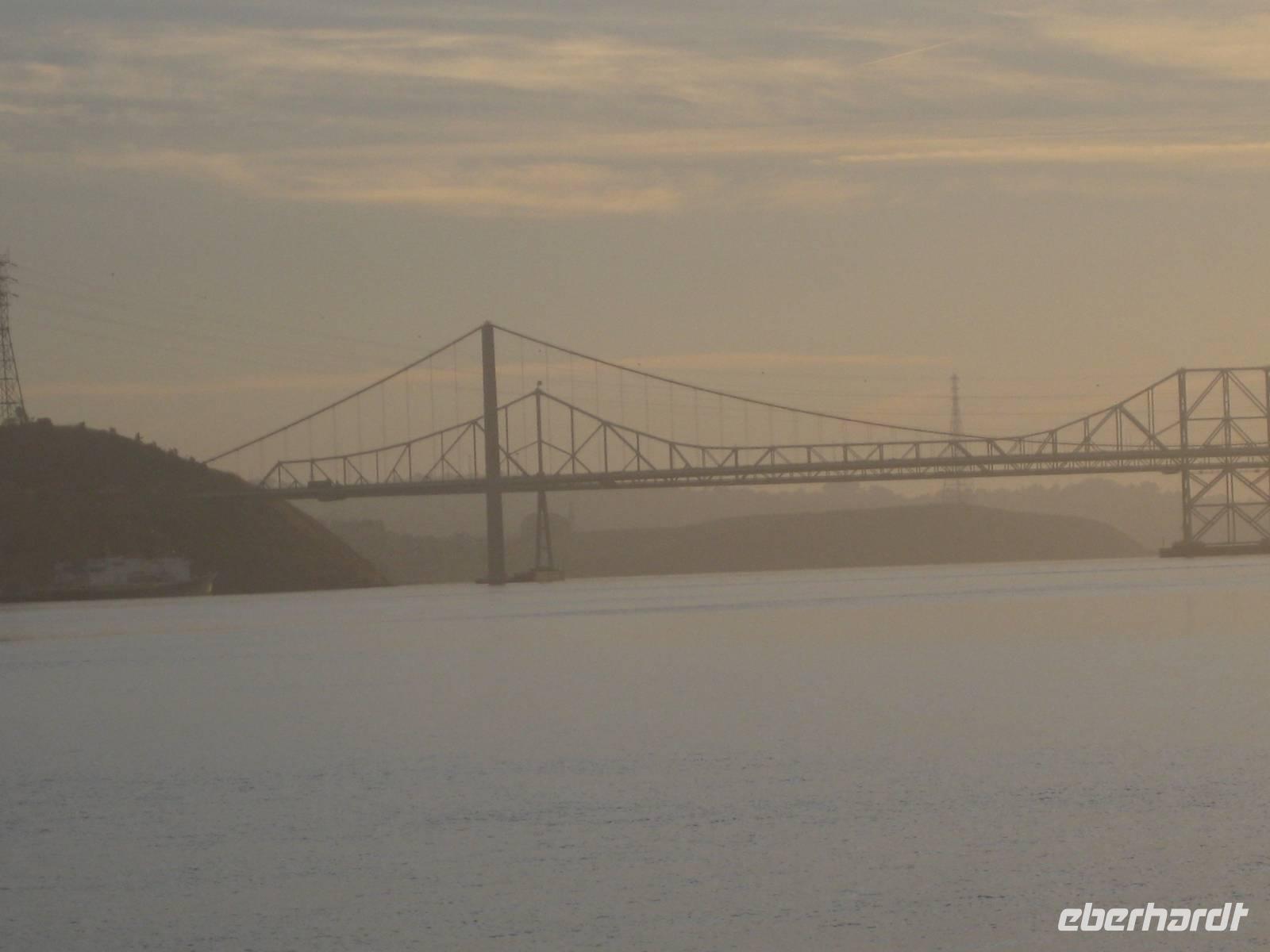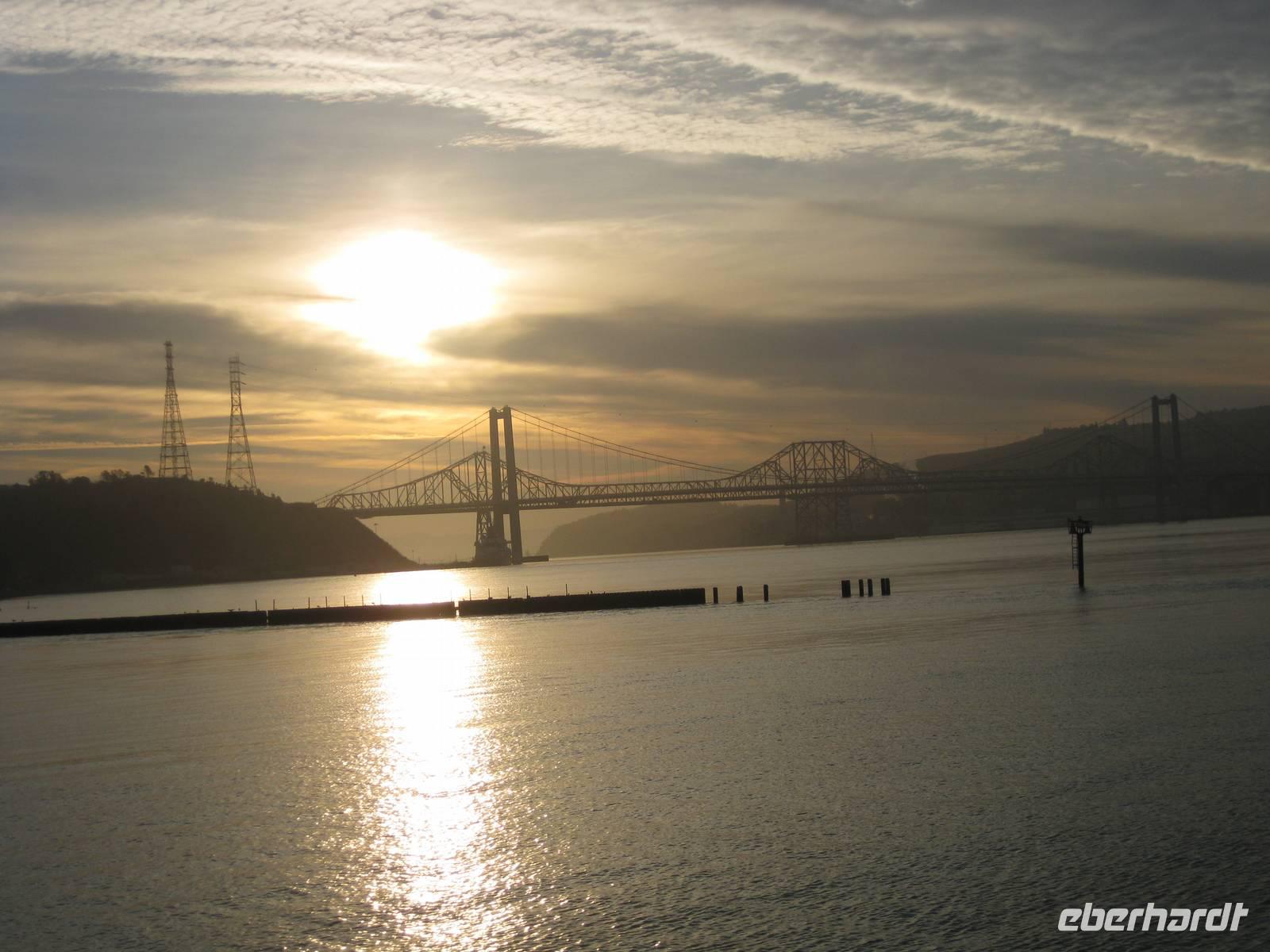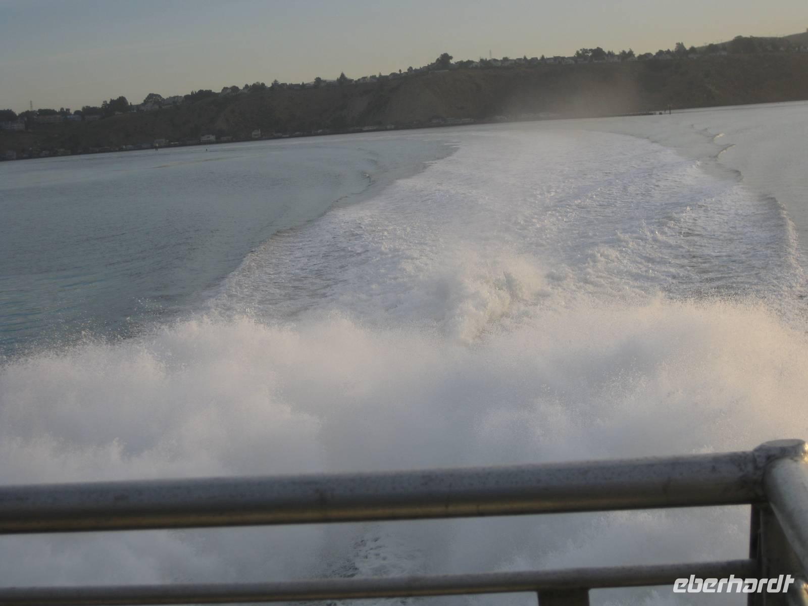 Heute geht es schon zeitig los. Wir können den Sonnenaufgang auf der Fahrt zu Fähre nach San Francisco beobachten. In Vallejo unweit vomHotel ist der Fähranleger. Derrick fährt mit dem Bus und unserem Gepäck auf dem Land nach San Francisco. Dort werden wir ihn am Fährterminal wieder treffen. Wir fahren ca. eine Stunde mit der Fähre und können San Francisco schon etwas vom Wasser aus sehen. Leider hüllt es sich zum Teil in Nebel, so dass wir nicht allzuviel sehen. Wir können die San Francisco-Oakland Bay Bridge sehen, die Golden Gate Bridge leider noch nicht. Die Skyline von San Francisco begrüßt uns.