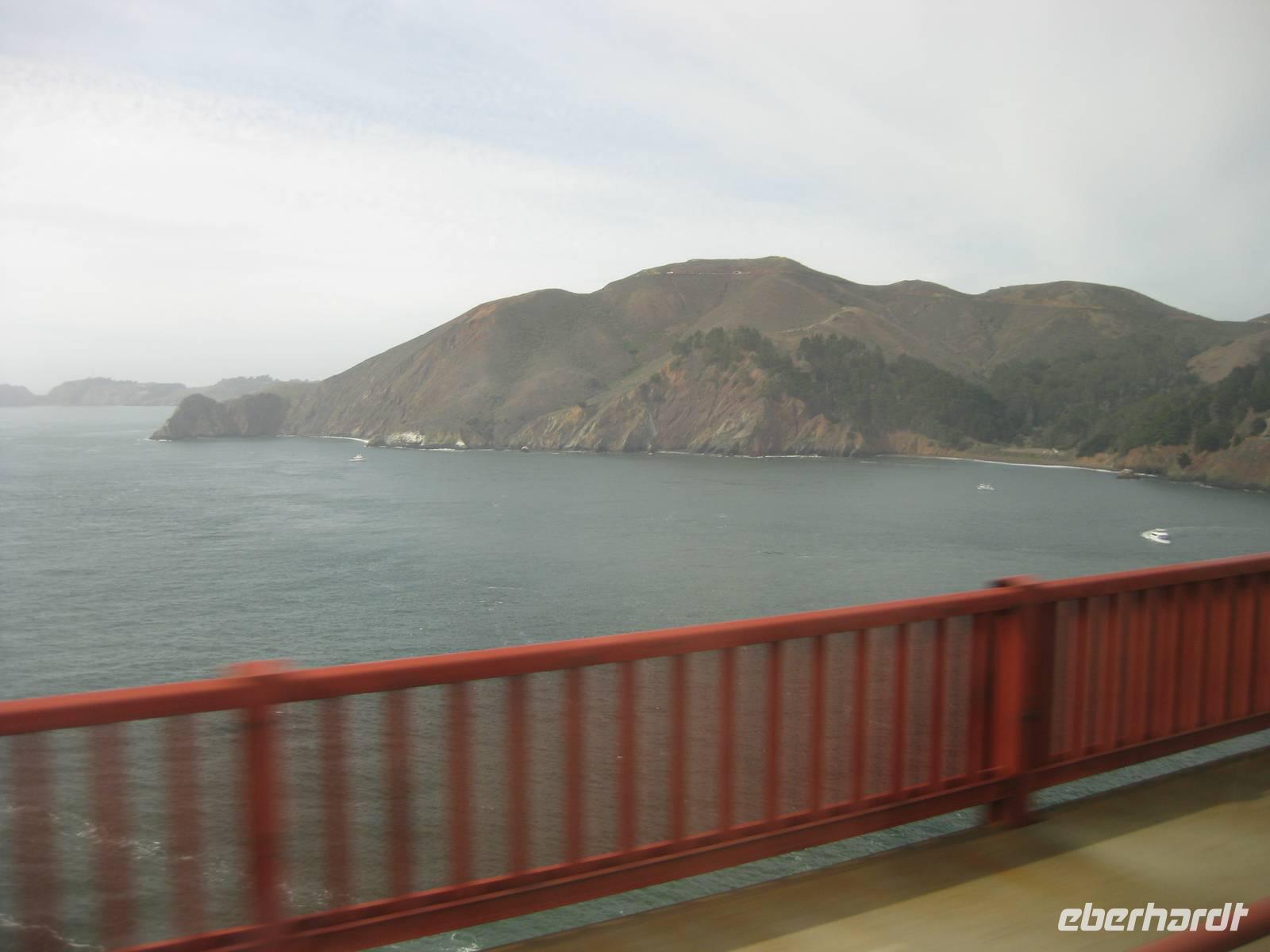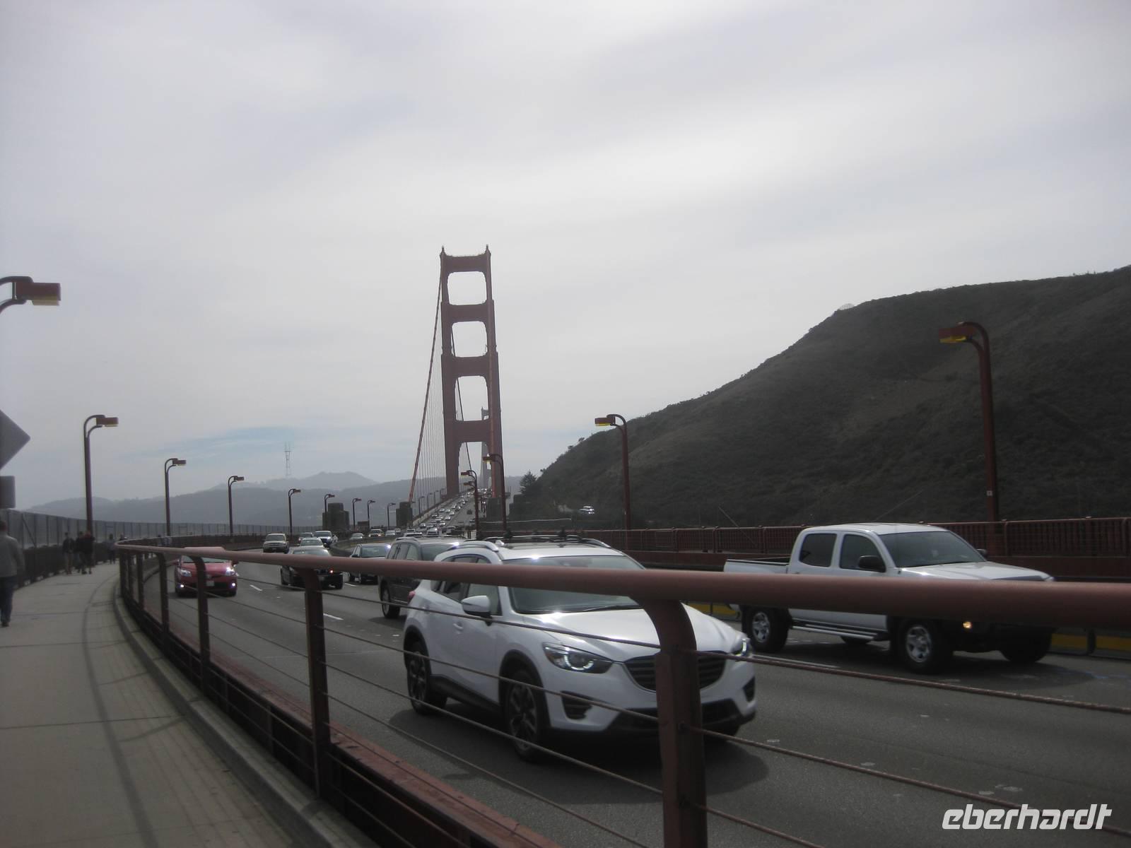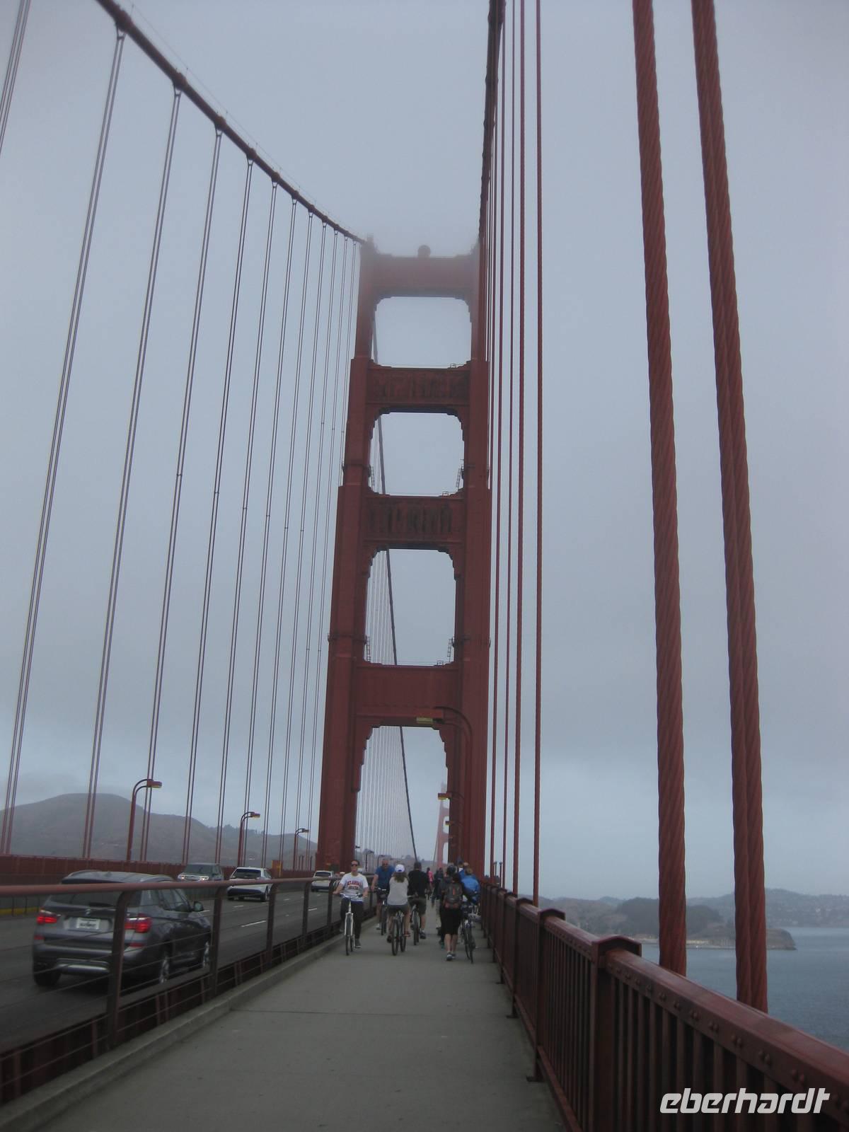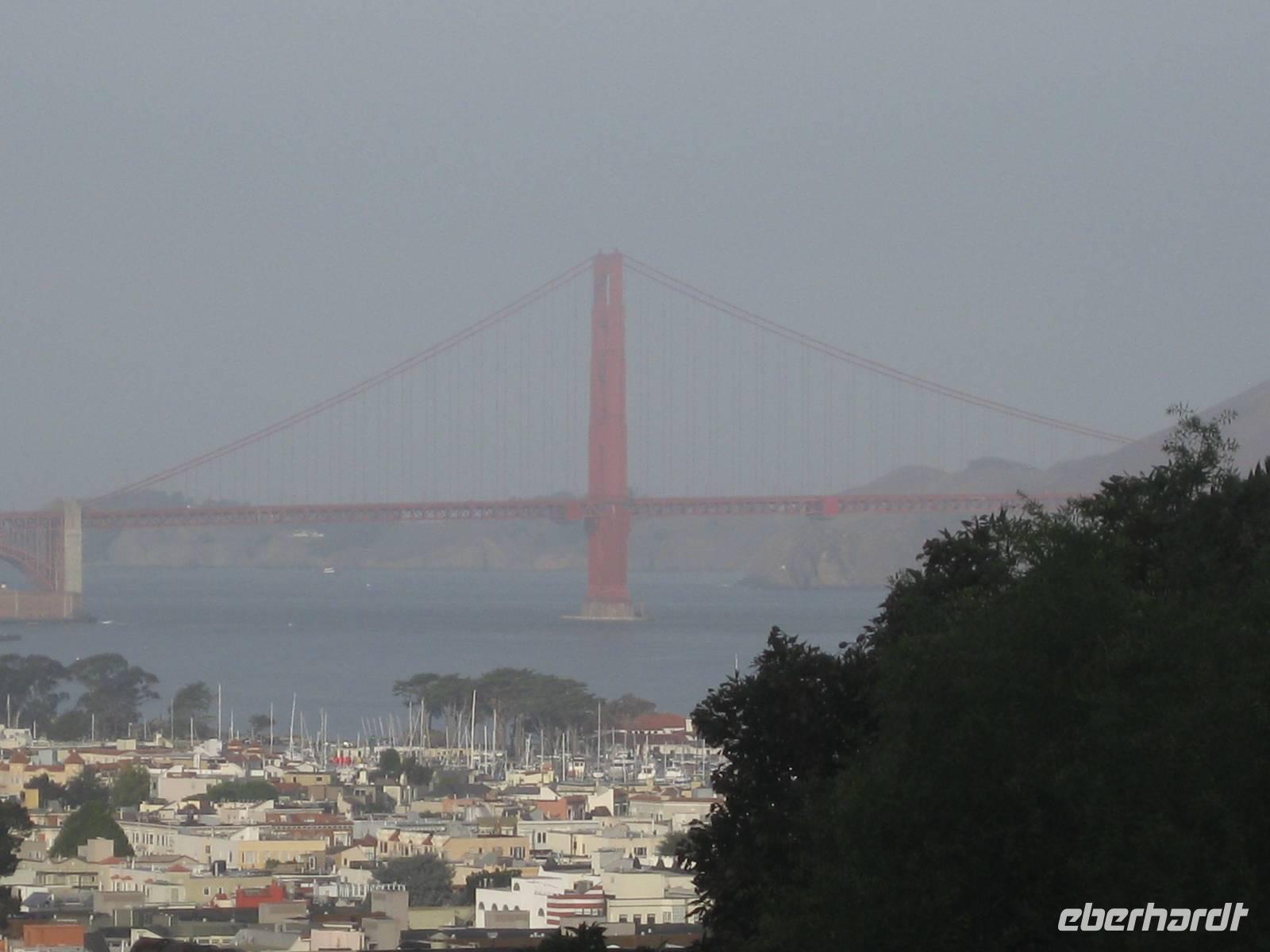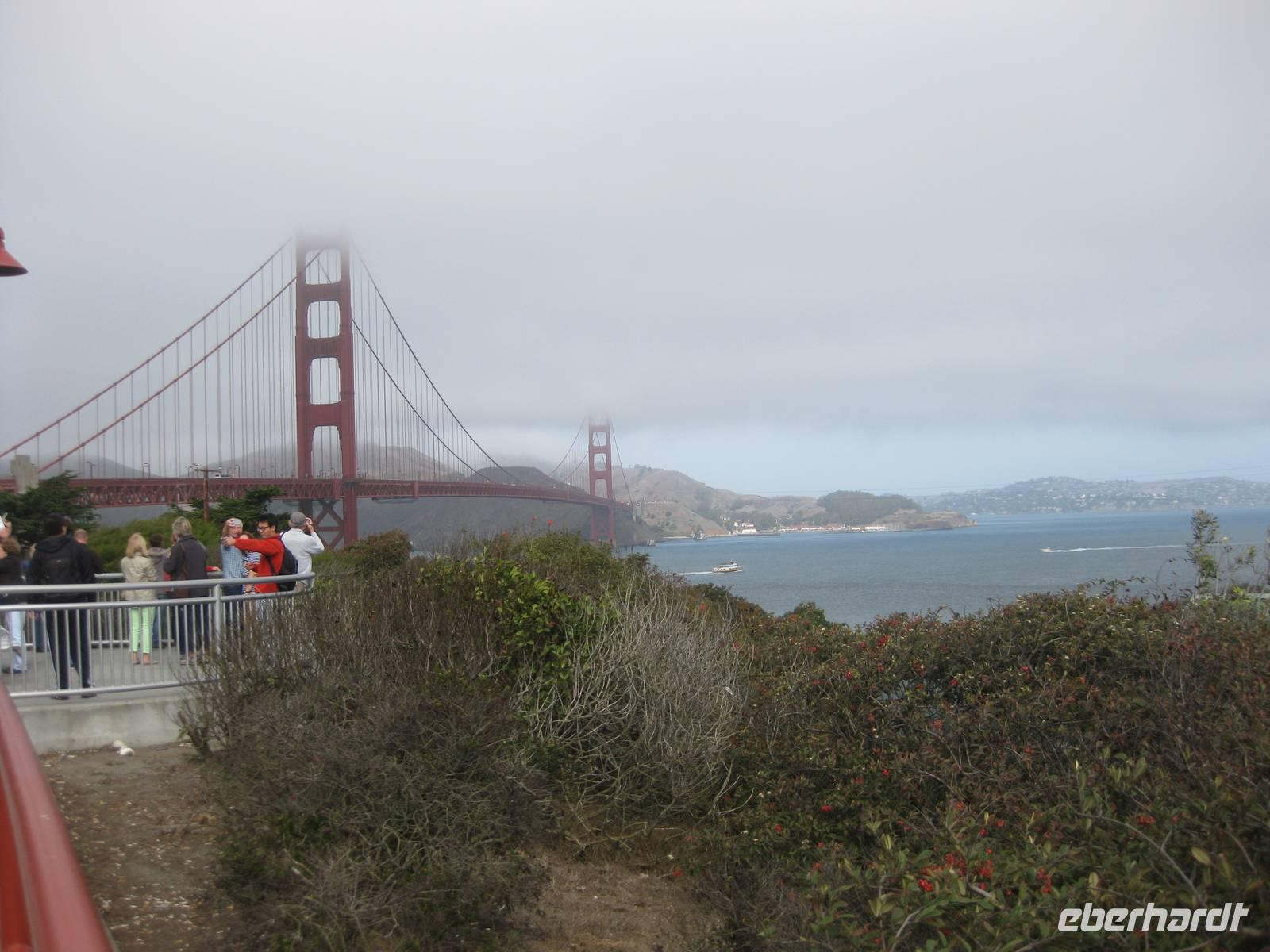 Wenn wir am Fährterminal ankommen ist Derrick mit dem Bus auch schon da. Wir beginnen unsere Stadtrundfahrt am Fährhafen mit den unzähligen Piers. Die Kreuzfahrer legen auch hier an. Leider ist keiner da. Während unserer Stadtrundfahrt sehen wir Chinatown, Union Square, das Civic Center mit City Hall (Rathaus), die für San Francisco typischen Victorianischen Holzhäuser "Painted Ladies", das Hippie-Viertel, .... Von den Twin Peaks aus können wir leider nicht auf die Stadt blicken. Sie hüllt sich noch in Wolken ein. Dann fahren wir am Golden Gate Park entlang und kommen schließlich zur Golden Gate Bridge. Hier muss natürlich erst einmal ein Foto sein. Dann laufen wir ganz gemütlich über die Golden Gate Bridge. Ein Traum geht für viele in Erfüllung! Und zurück fahren wir mit dem Bus über die Brücke. Wir fahren bis in die Stadt zum Union Square. Jetzt haben alle Zeit für die individuelle Erkundung der Stadt oder einen Shoppingbummel oder ....