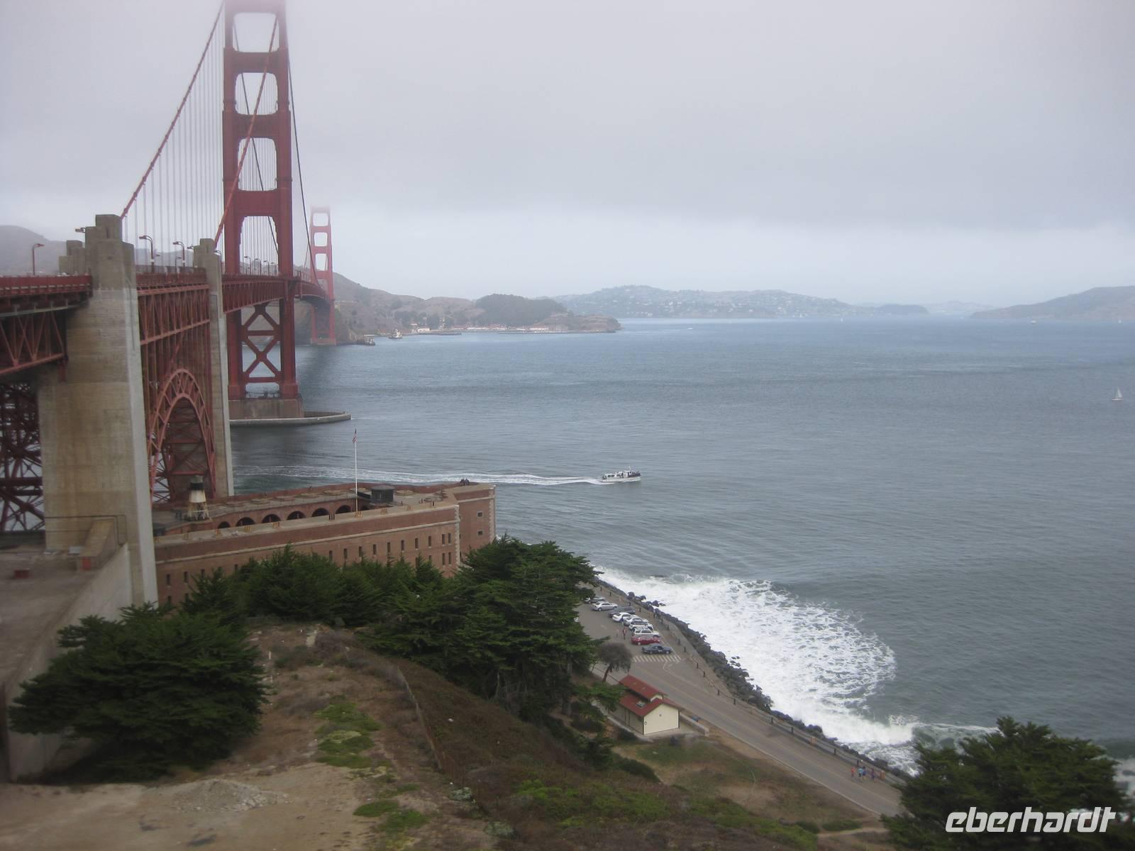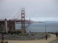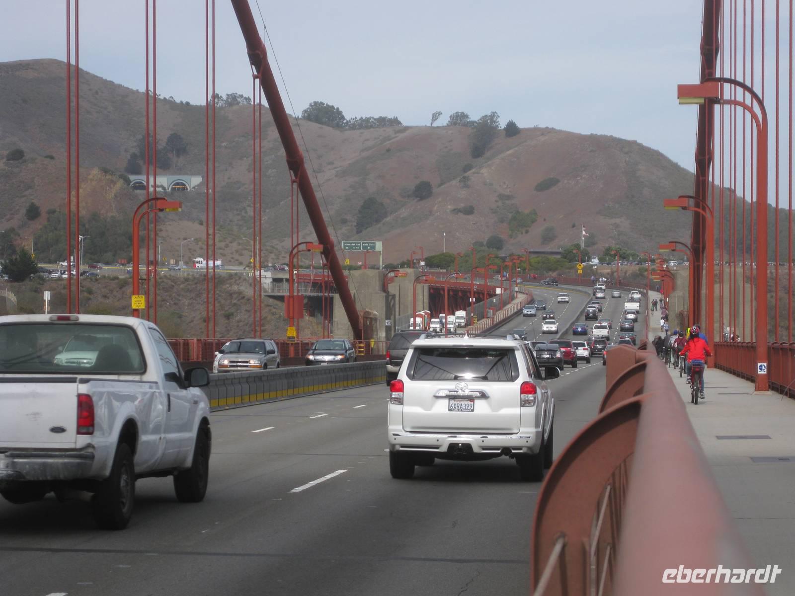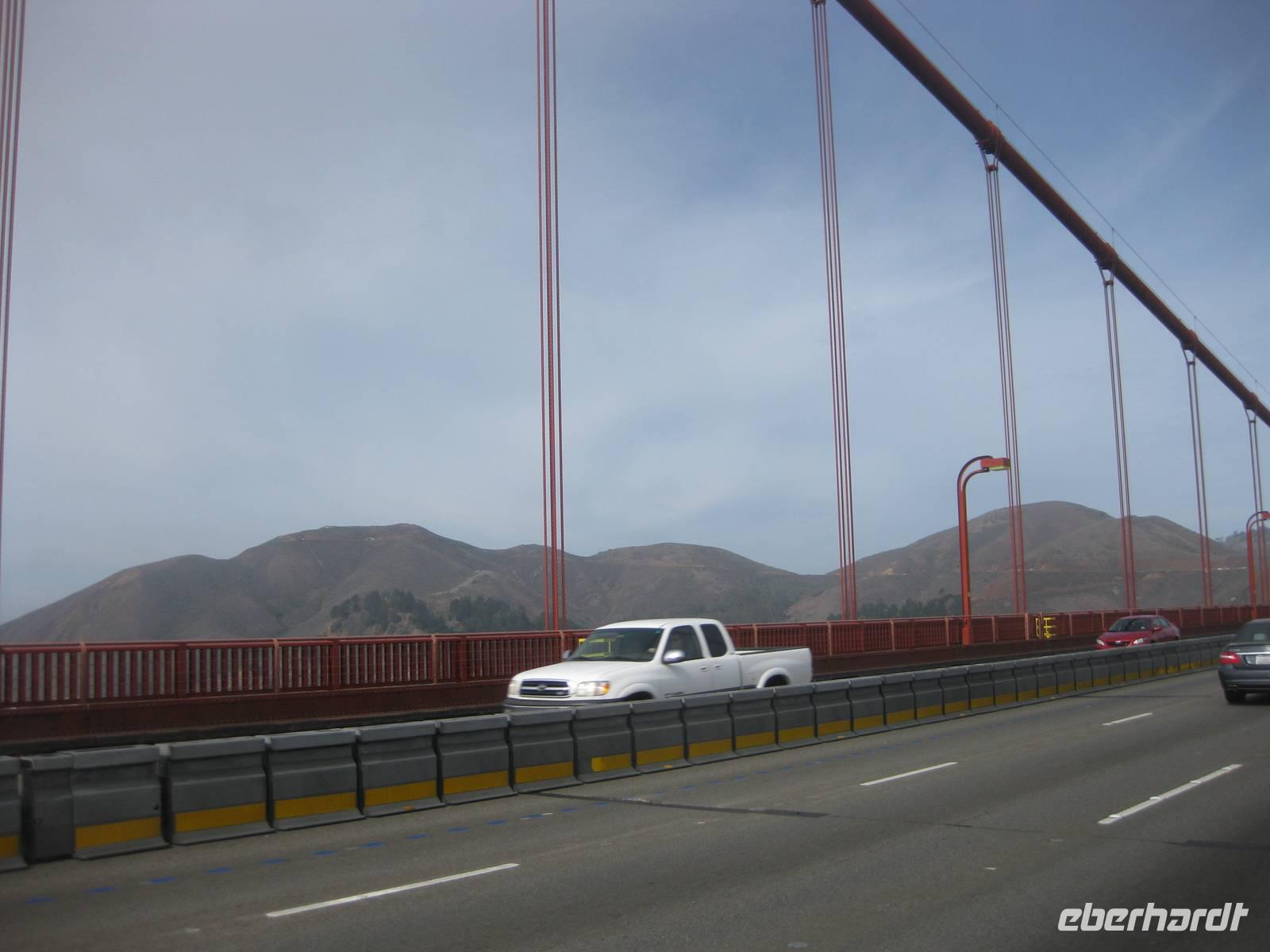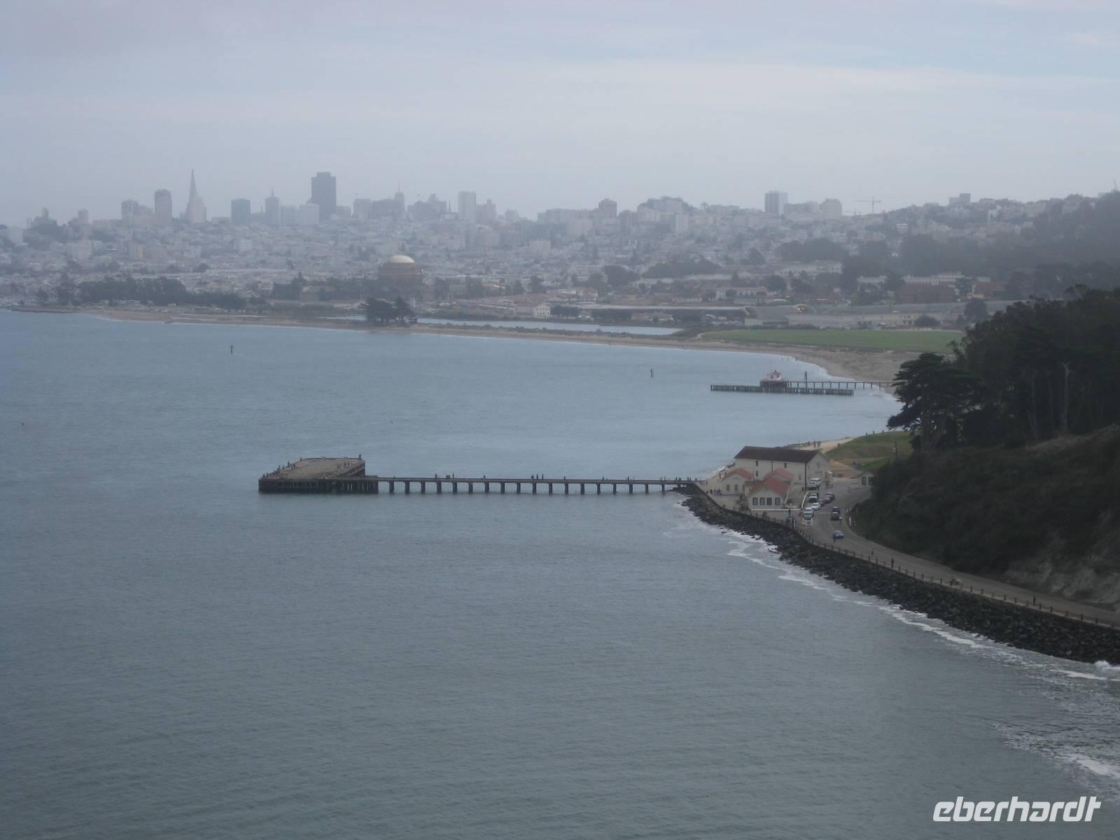 Wenn wir am Fährterminal ankommen ist Derrick mit dem Bus auch schon da. Wir beginnen unsere Stadtrundfahrt am Fährhafen mit den unzähligen Piers. Die Kreuzfahrer legen auch hier an. Leider ist keiner da. Während unserer Stadtrundfahrt sehen wir Chinatown, Union Square, das Civic Center mit City Hall (Rathaus), die für San Francisco typischen Victorianischen Holzhäuser "Painted Ladies", das Hippie-Viertel, .... Von den Twin Peaks aus können wir leider nicht auf die Stadt blicken. Sie hüllt sich noch in Wolken ein. Dann fahren wir am Golden Gate Park entlang und kommen schließlich zur Golden Gate Bridge. Hier muss natürlich erst einmal ein Foto sein. Dann laufen wir ganz gemütlich über die Golden Gate Bridge. Ein Traum geht für viele in Erfüllung! Und zurück fahren wir mit dem Bus über die Brücke. Wir fahren bis in die Stadt zum Union Square. Jetzt haben alle Zeit für die individuelle Erkundung der Stadt oder einen Shoppingbummel oder ....