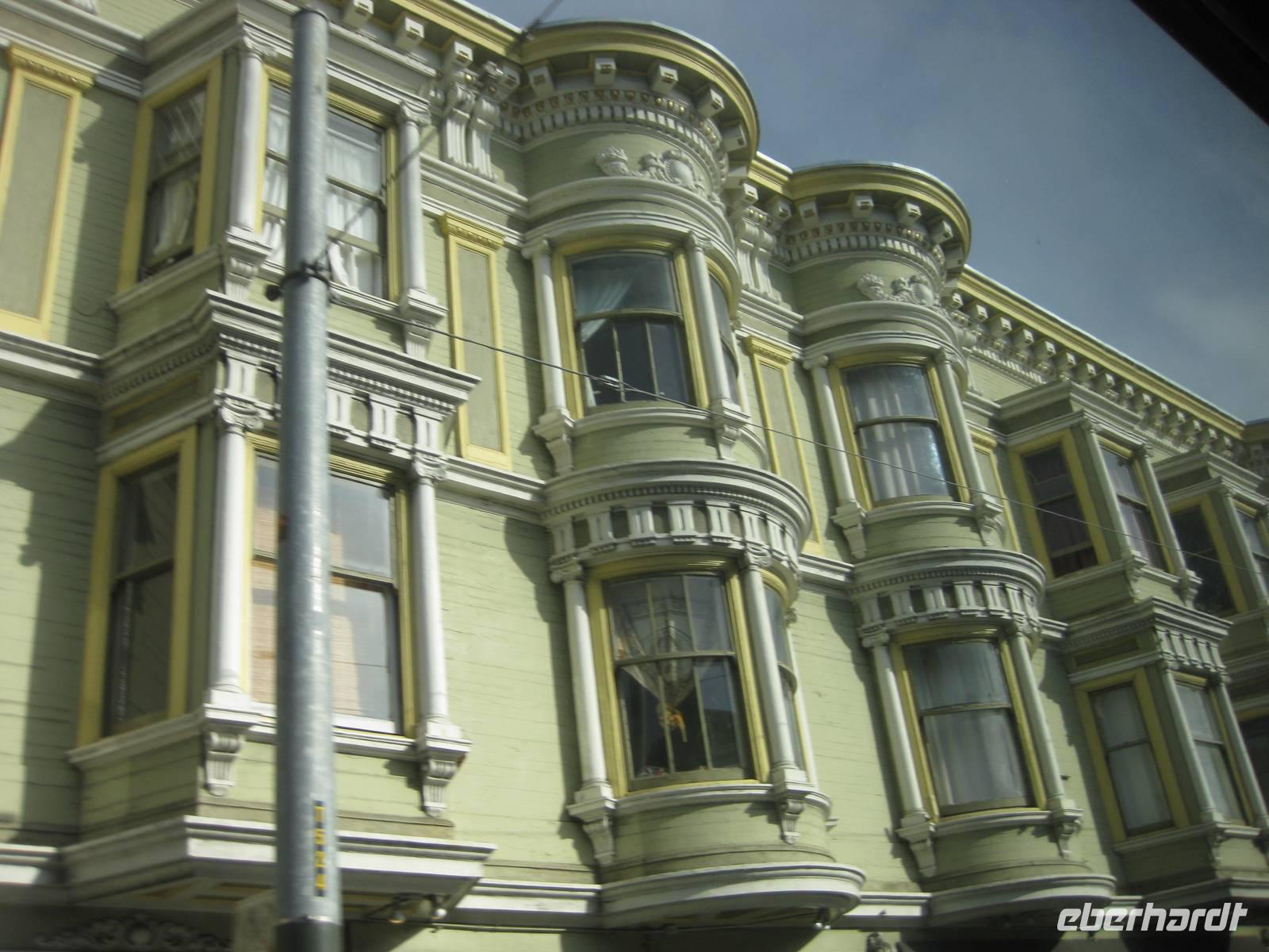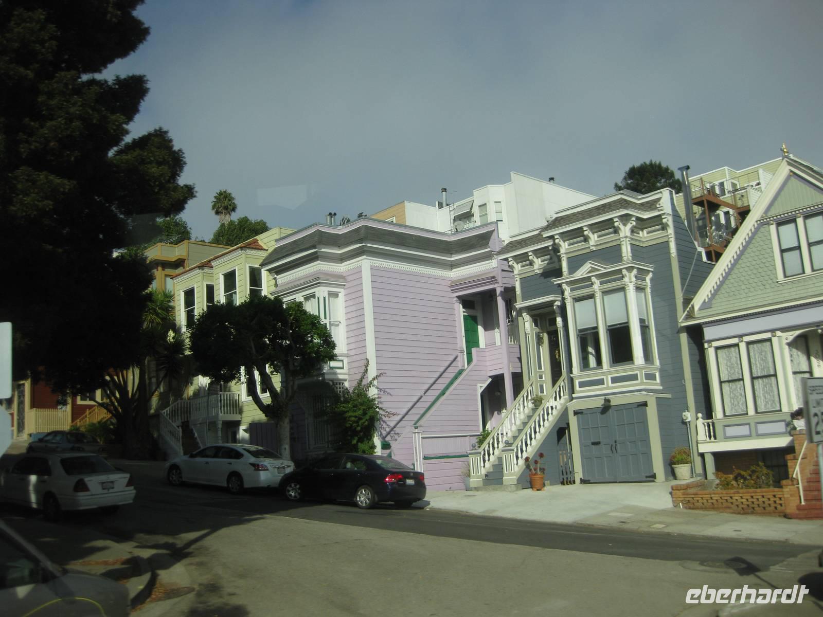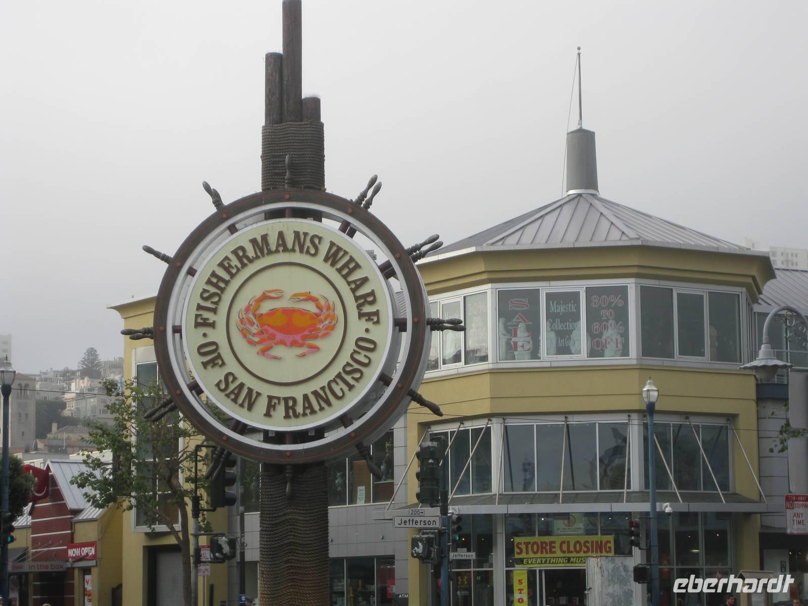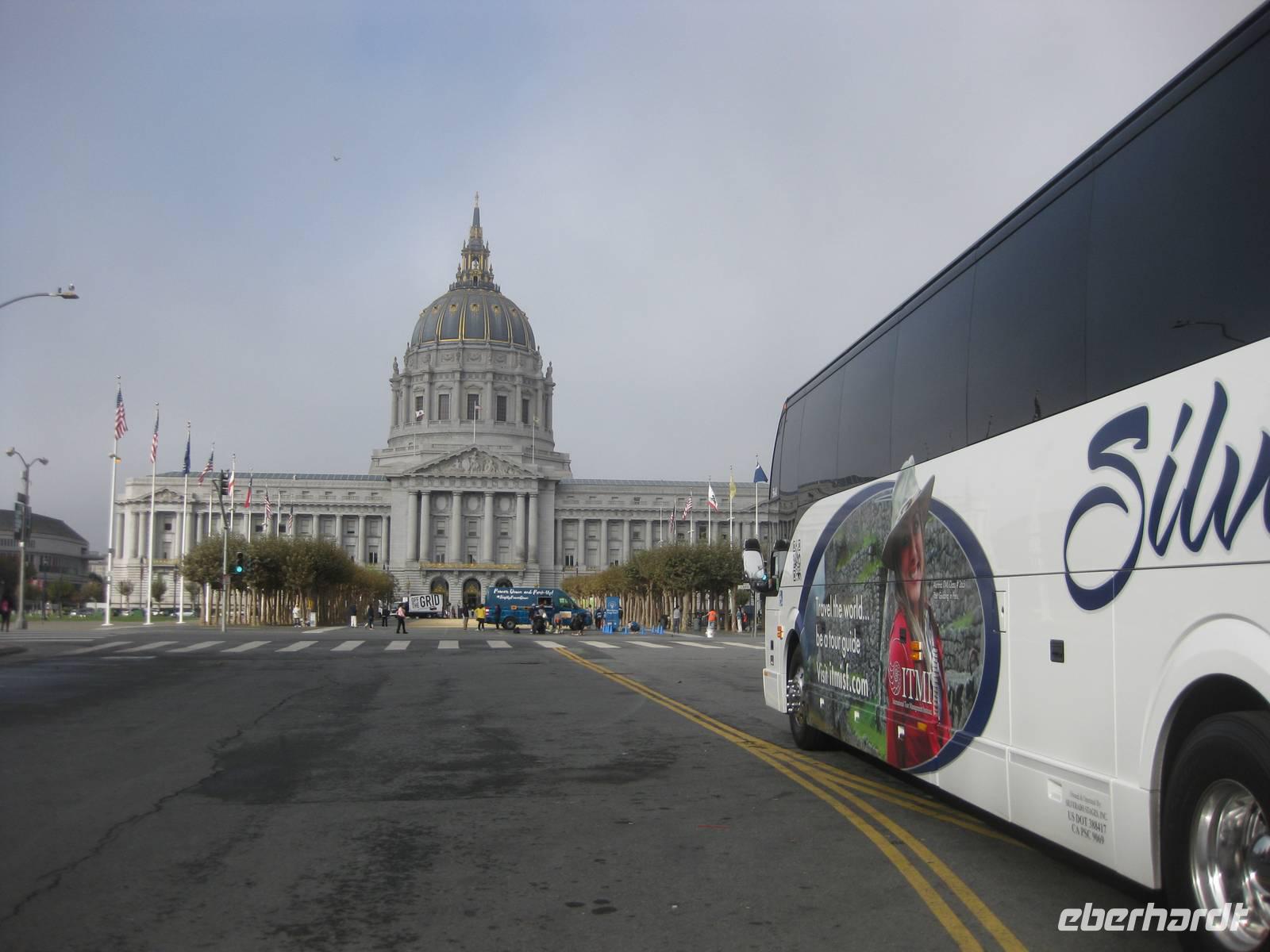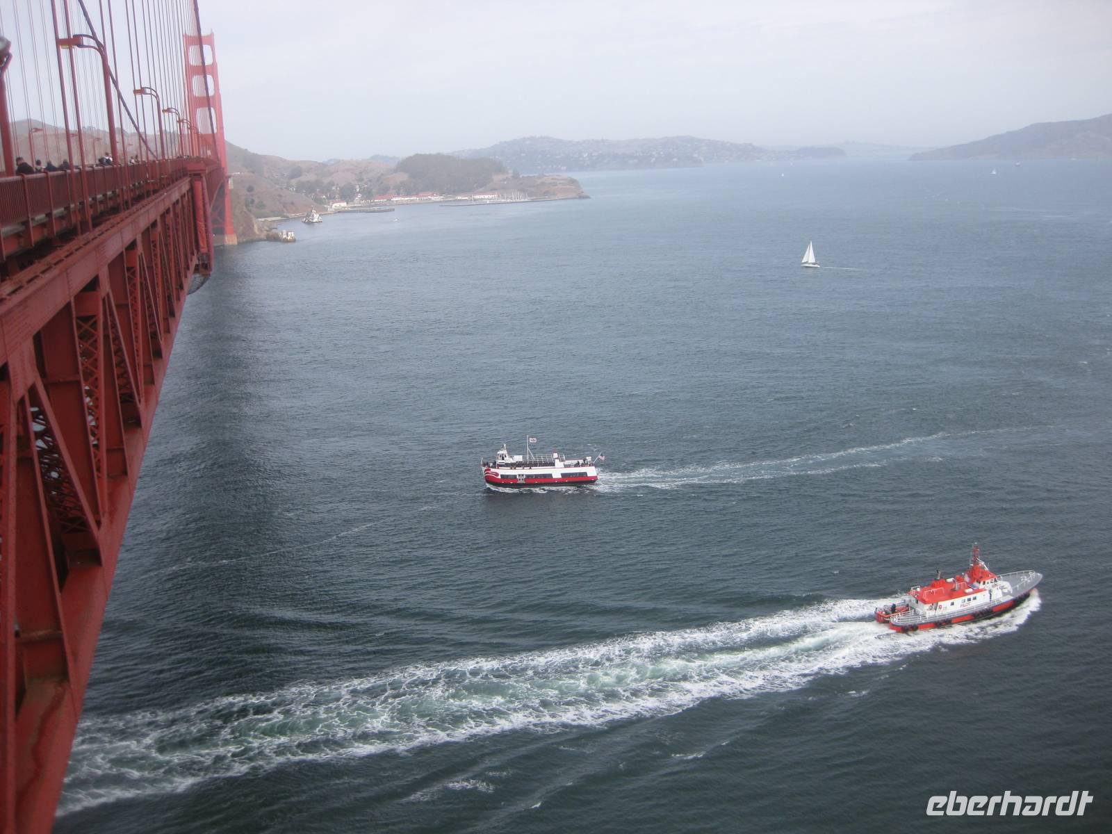 Wenn wir am Fährterminal ankommen ist Derrick mit dem Bus auch schon da. Wir beginnen unsere Stadtrundfahrt am Fährhafen mit den unzähligen Piers. Die Kreuzfahrer legen auch hier an. Leider ist keiner da. Während unserer Stadtrundfahrt sehen wir Chinatown, Union Square, das Civic Center mit City Hall (Rathaus), die für San Francisco typischen Victorianischen Holzhäuser "Painted Ladies", das Hippie-Viertel, .... Von den Twin Peaks aus können wir leider nicht auf die Stadt blicken. Sie hüllt sich noch in Wolken ein. Dann fahren wir am Golden Gate Park entlang und kommen schließlich zur Golden Gate Bridge. Hier muss natürlich erst einmal ein Foto sein. Dann laufen wir ganz gemütlich über die Golden Gate Bridge. Ein Traum geht für viele in Erfüllung! Und zurück fahren wir mit dem Bus über die Brücke. Wir fahren bis in die Stadt zum Union Square. Jetzt haben alle Zeit für die individuelle Erkundung der Stadt oder einen Shoppingbummel oder ....