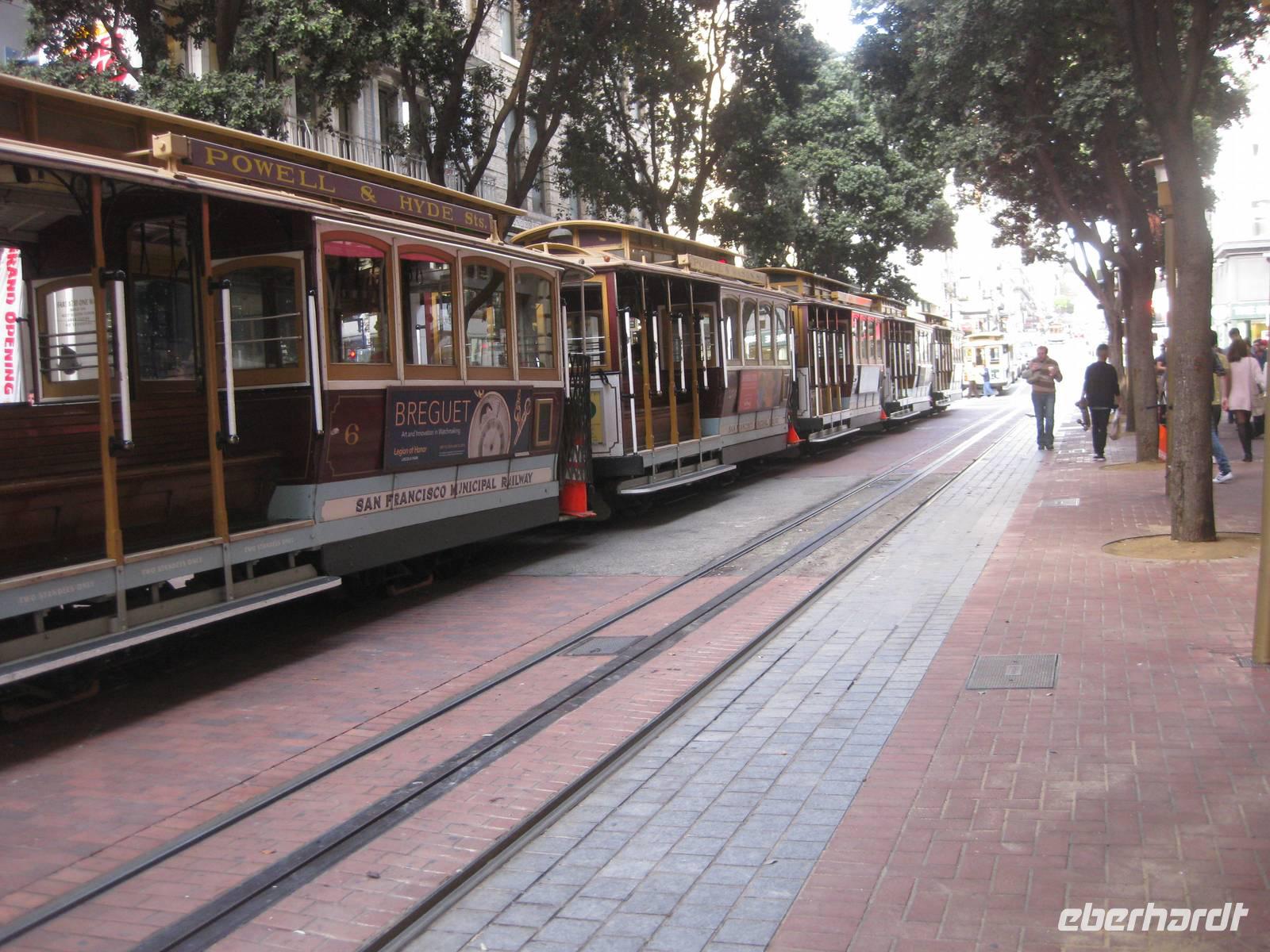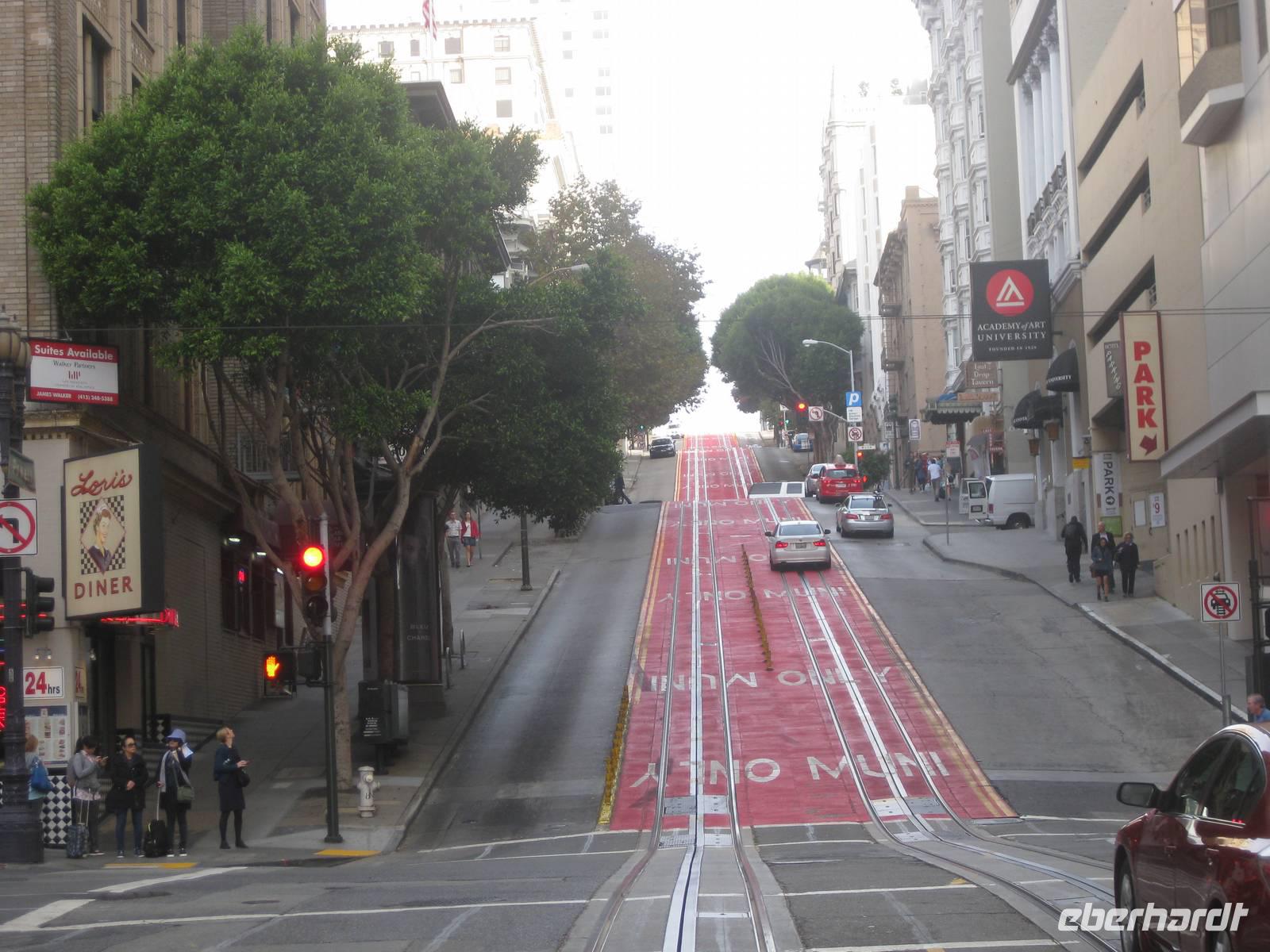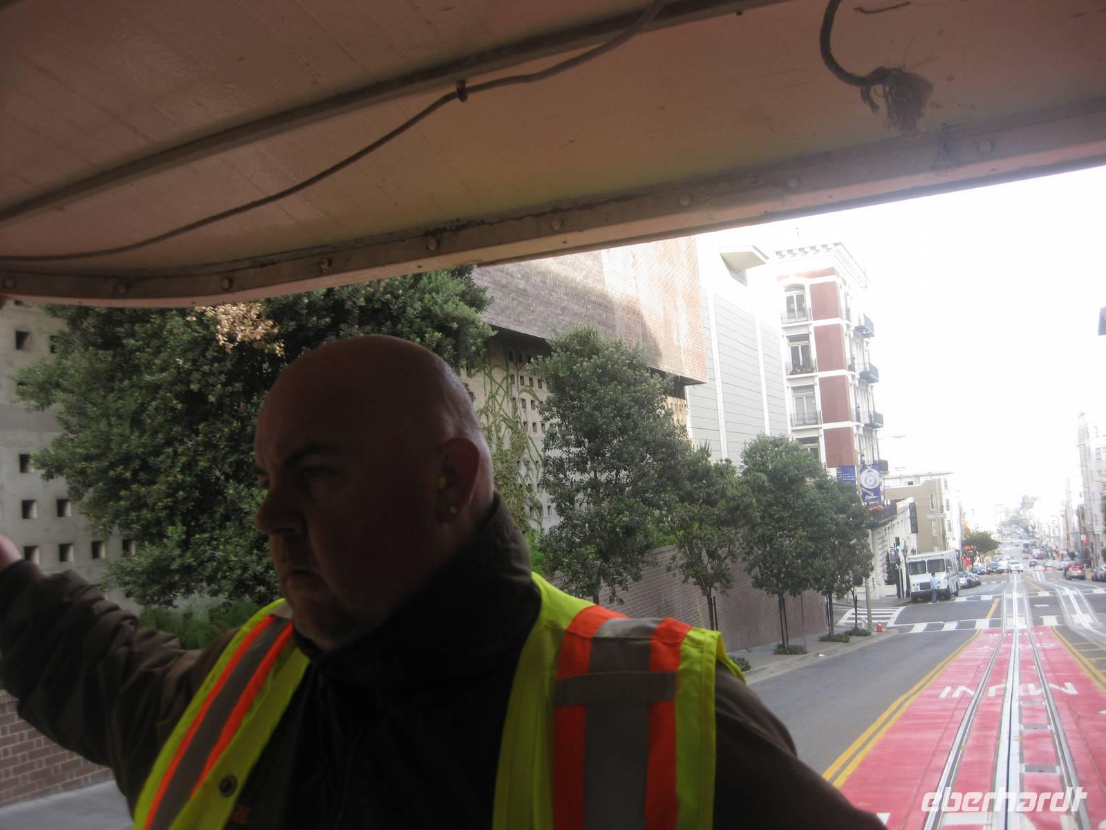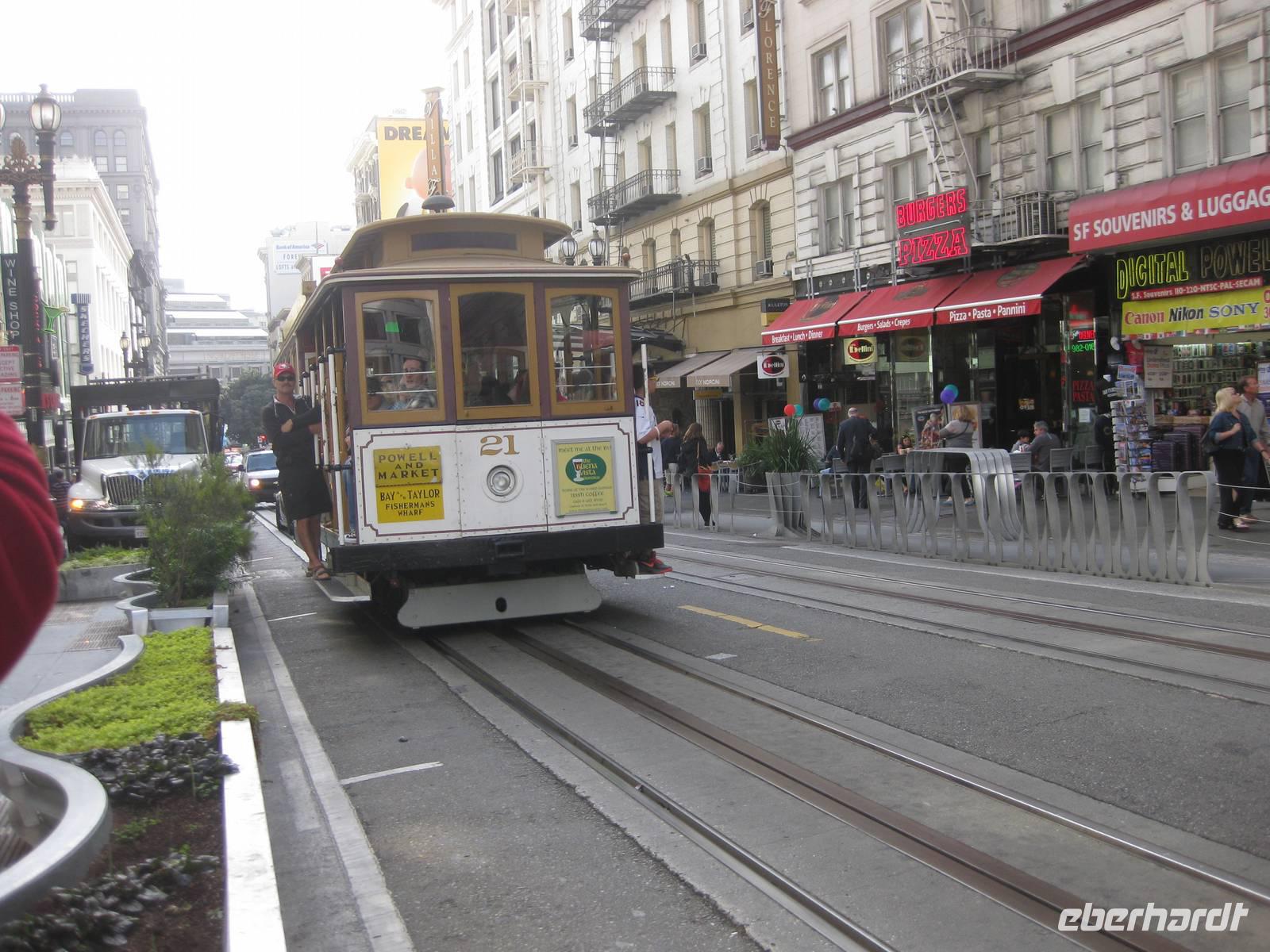 Wir haben noch etwas Zeit am Vormittag. Diese nutzen wir noch für eine Fahrt mit der Cable Car. Wir laufen vom Hotel bis zur Lombard Street, steigen dort in die Cable Car und fahren bis zur Union Square mit. Und von dort laufen wir wieder zum Hotel zurück. Alle kommen mit. Ein schöner Abschluss.