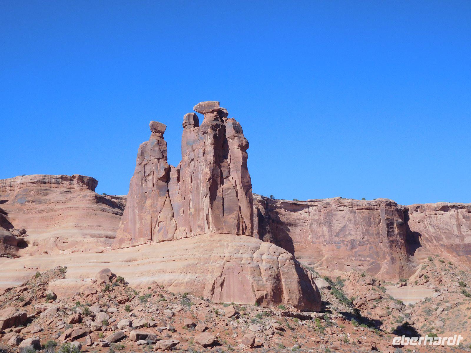 Unsere heutige Fahrt führte uns in den ebenfalls gewaltigen Arches Nationalpark, der ebenfalls für ganz besondere Gesteinsformen bekannt ist. Berühmt ist dieser Nationalpark für seine riesigen Bögen, die die Zeit in das Gestein geformt hat. Dort bewunderten wir Formen wie die Drei Schwestern, den Balancierten Stein (Balanced Rock) und fuhren auch zu zwei Bögen, die wie eine Brille angeordnet ist. Dort verweilten wir ein wenig und erkundeten nicht nur die Gesteinsformationen, sondern auch die weitläufige Landschaft des Nationalparks, die sich scheinbar endlos um uns herum ausbreitete.